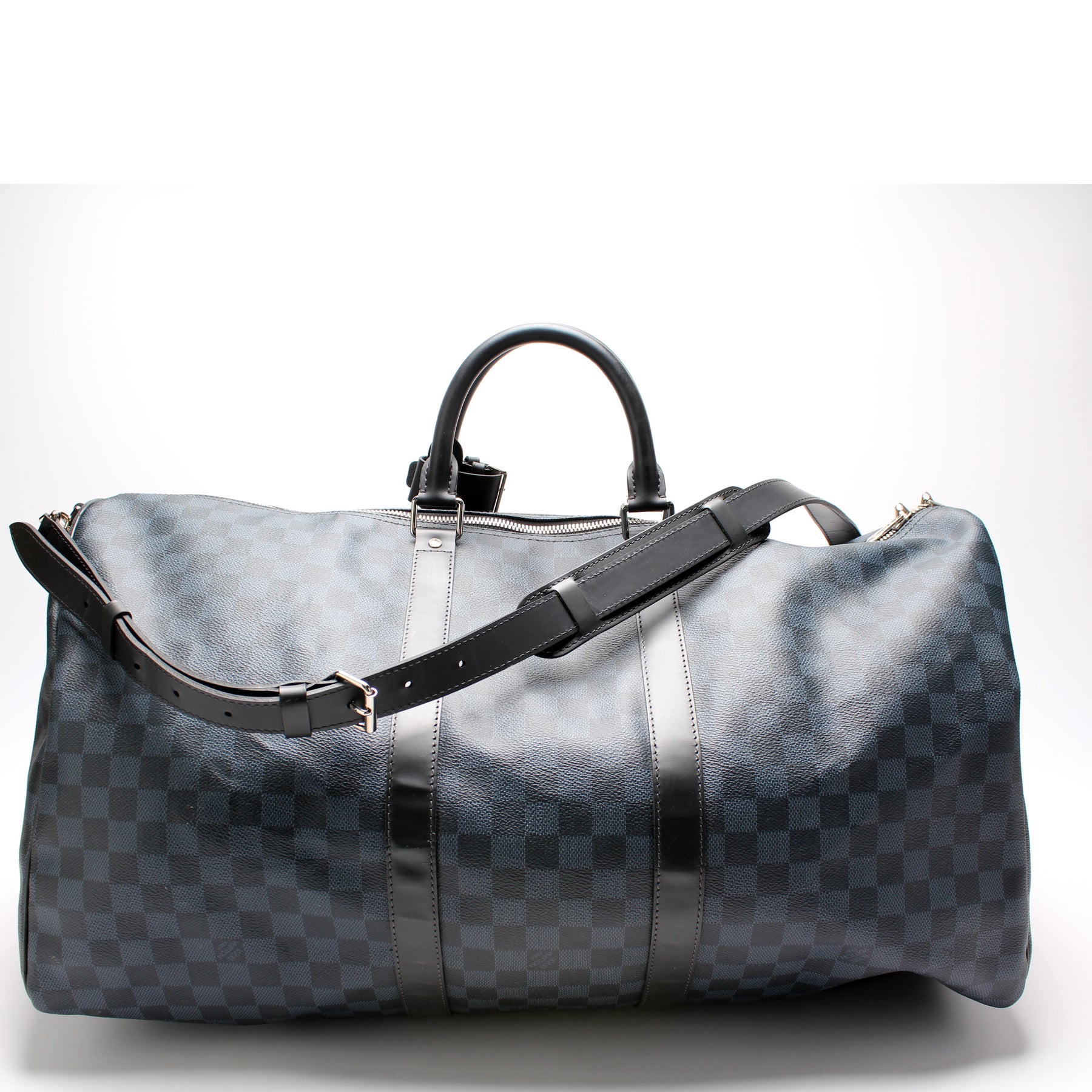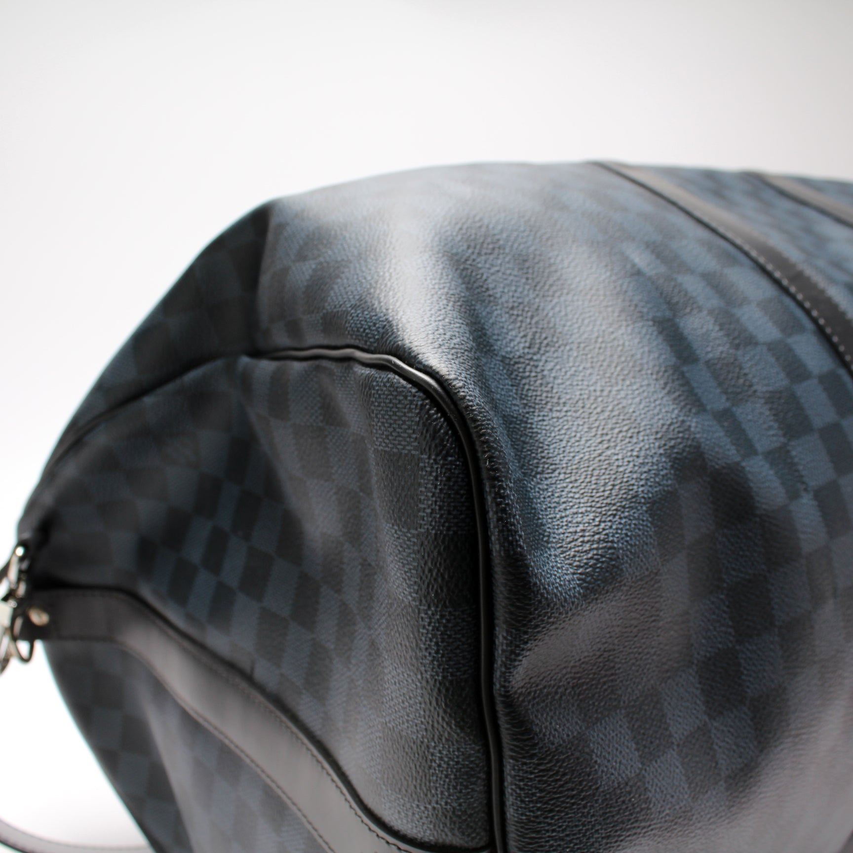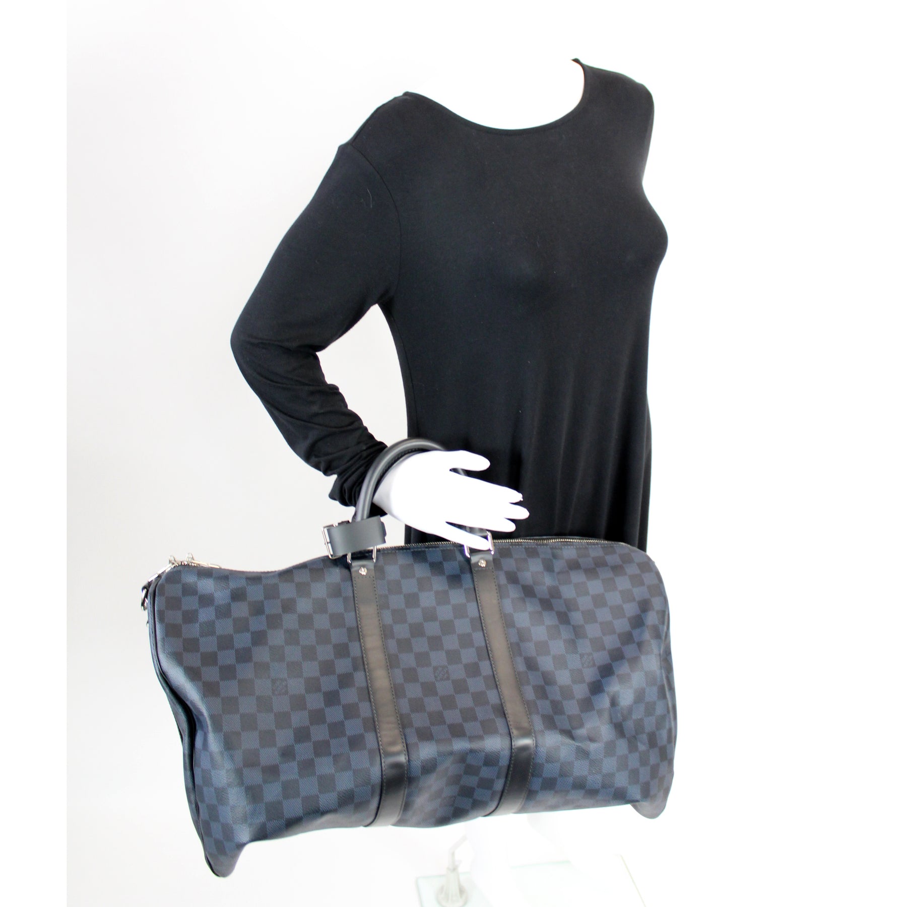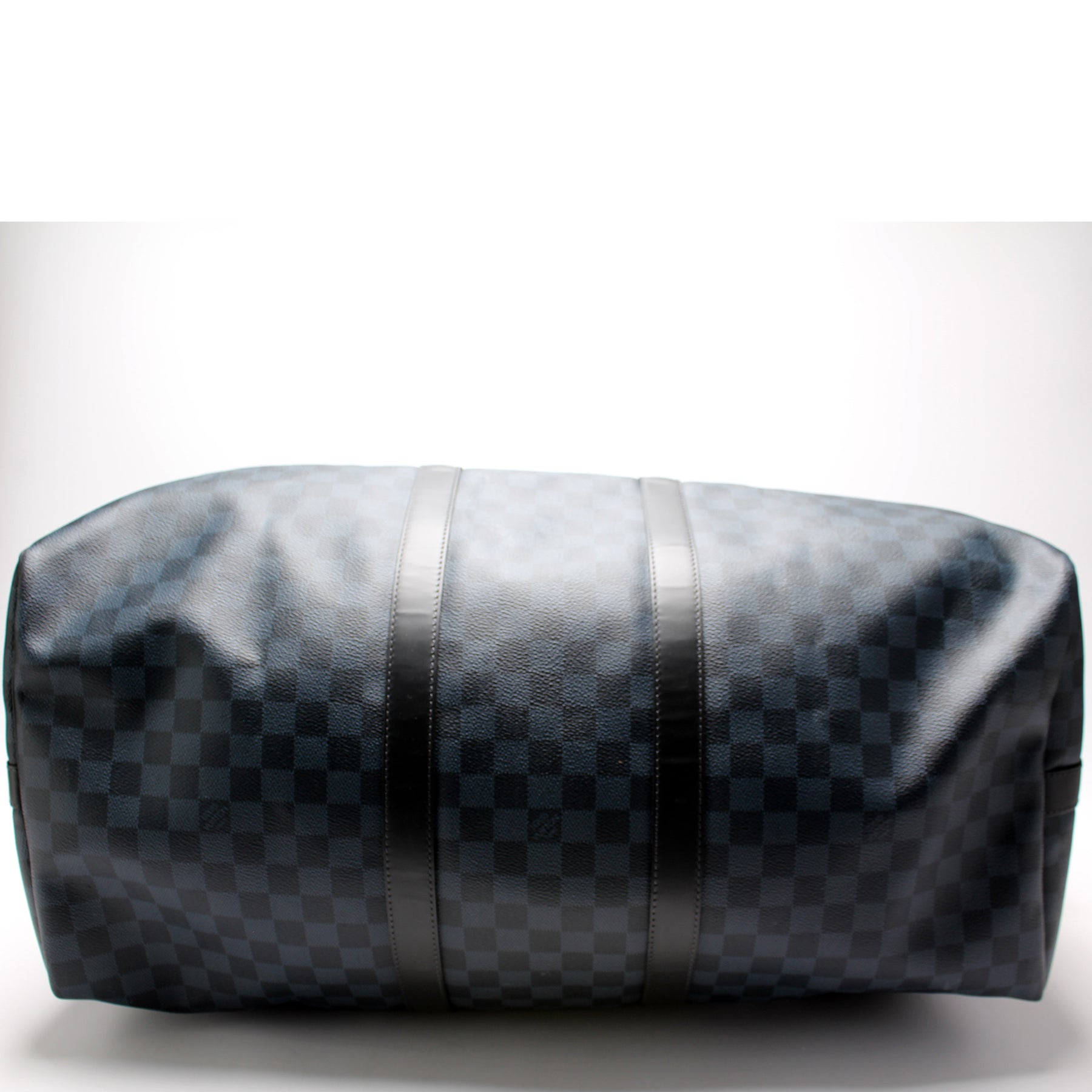 This pre-owned Louis Vuitton Keepall 55 Bandouliere is guaranteed 100% authentic. The exterior is in the classic Louis Vuitton Damier Cobalt coated canvas.