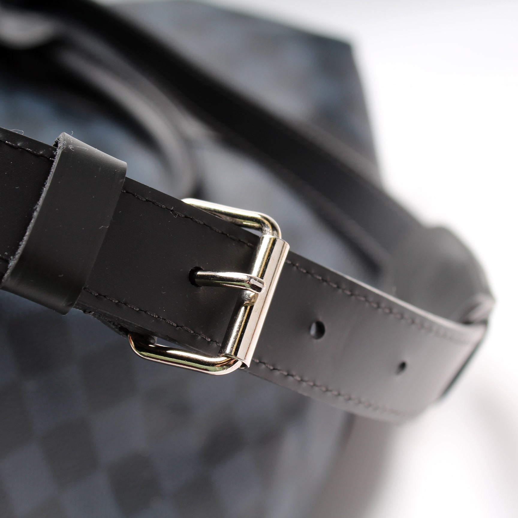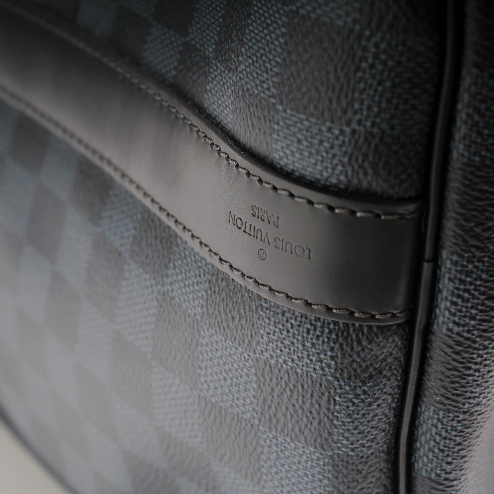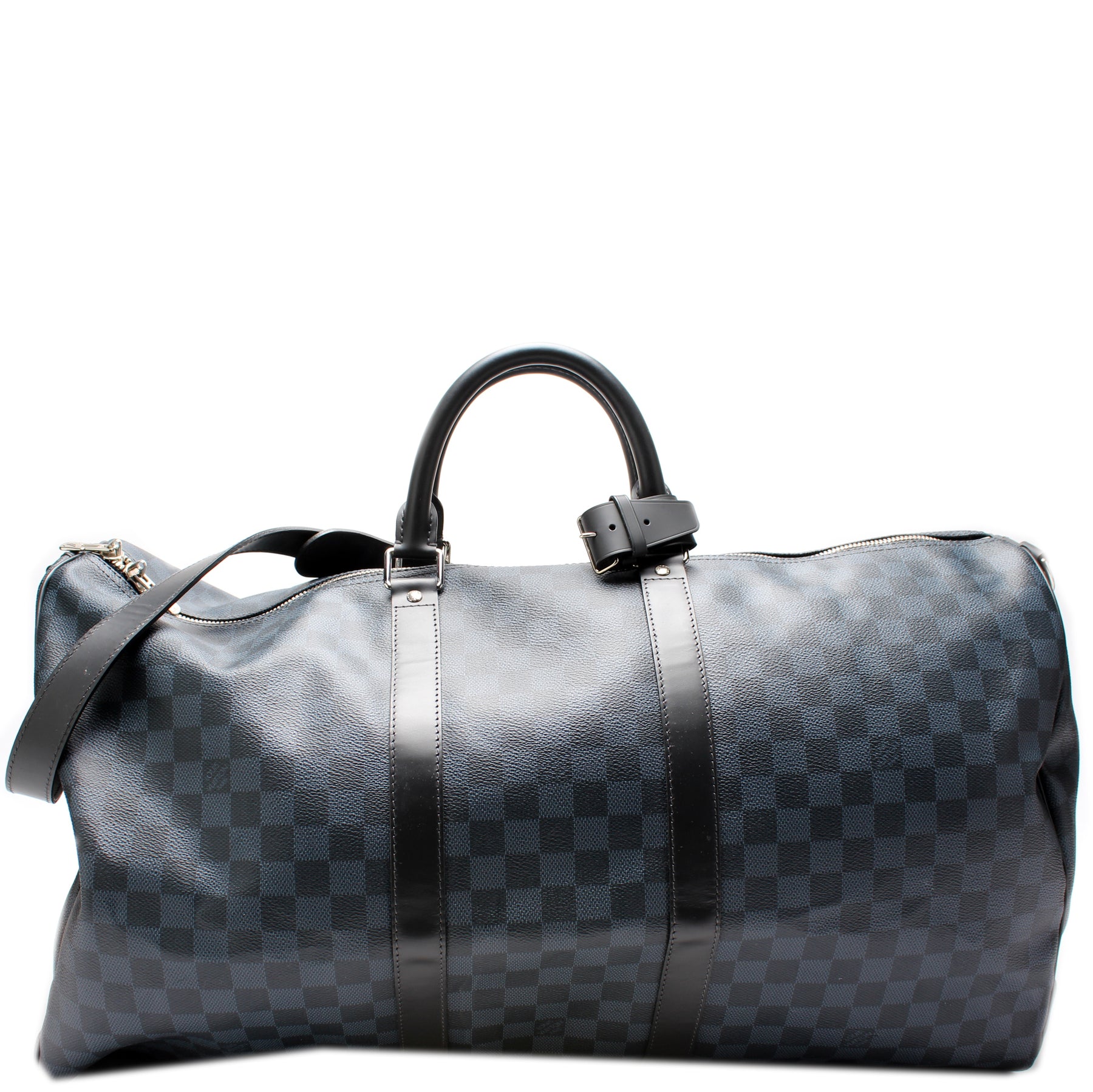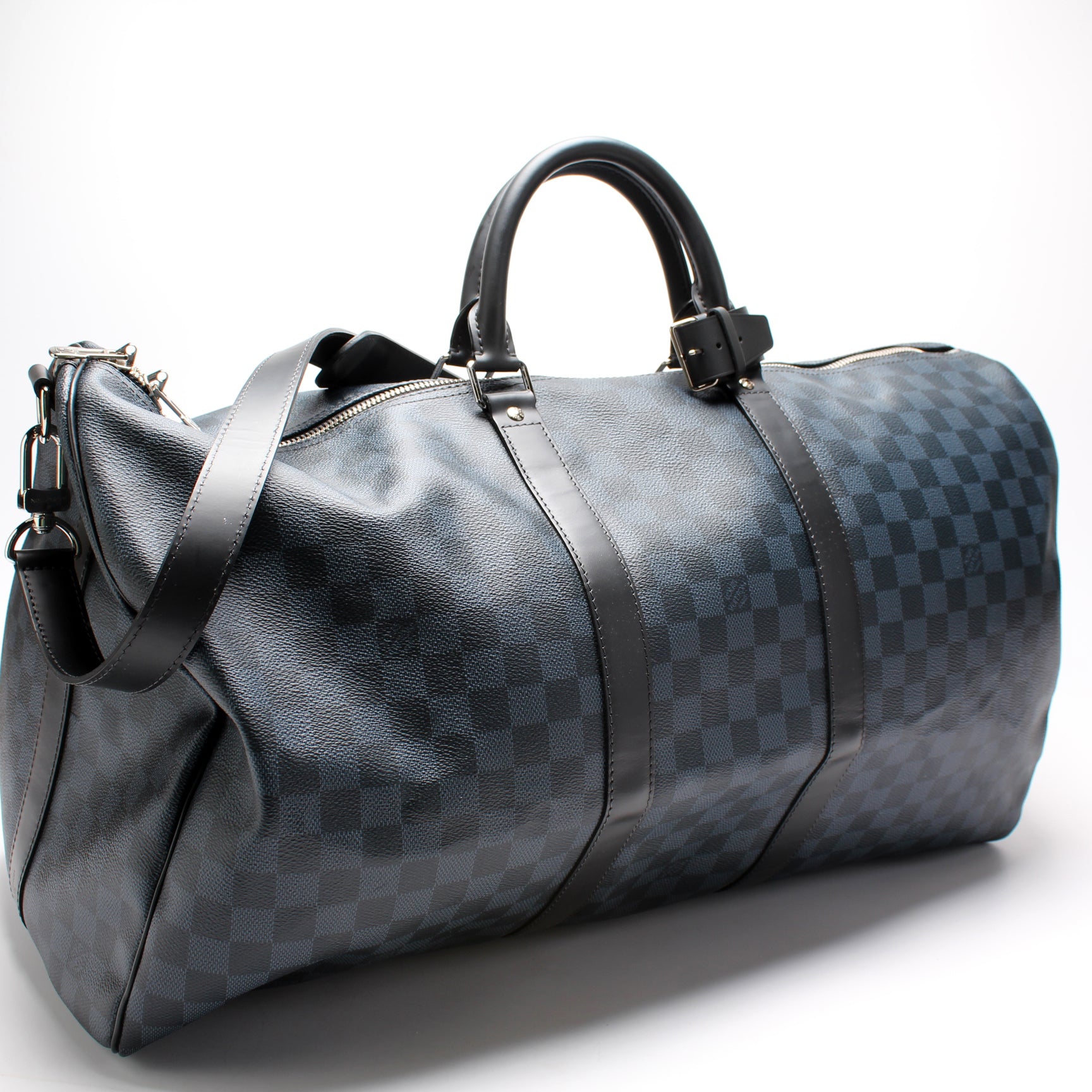 This pre-owned Louis Vuitton Keepall 55 Bandouliere is guaranteed 100% authentic. The exterior is in the classic Louis Vuitton Damier Cobalt coated canvas.