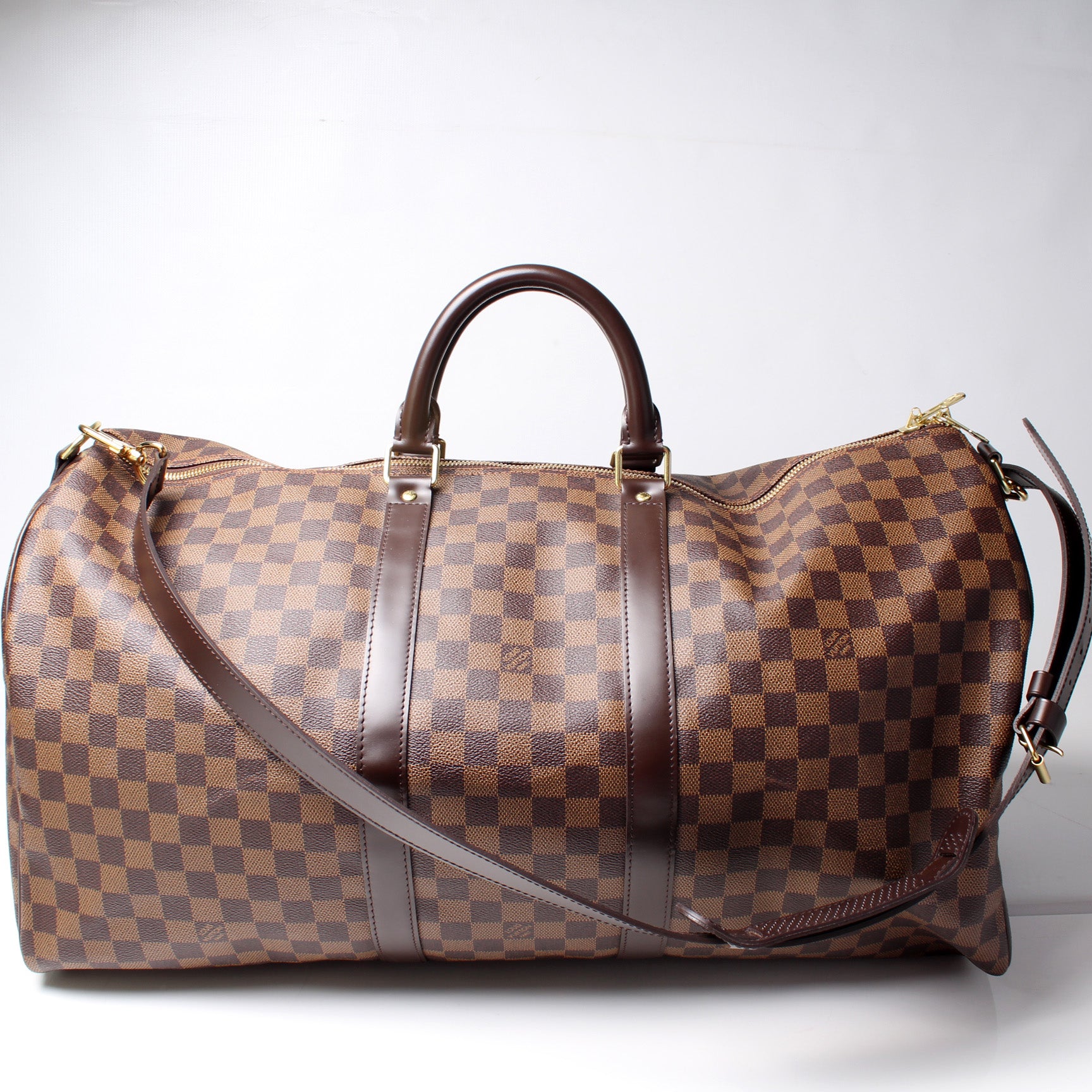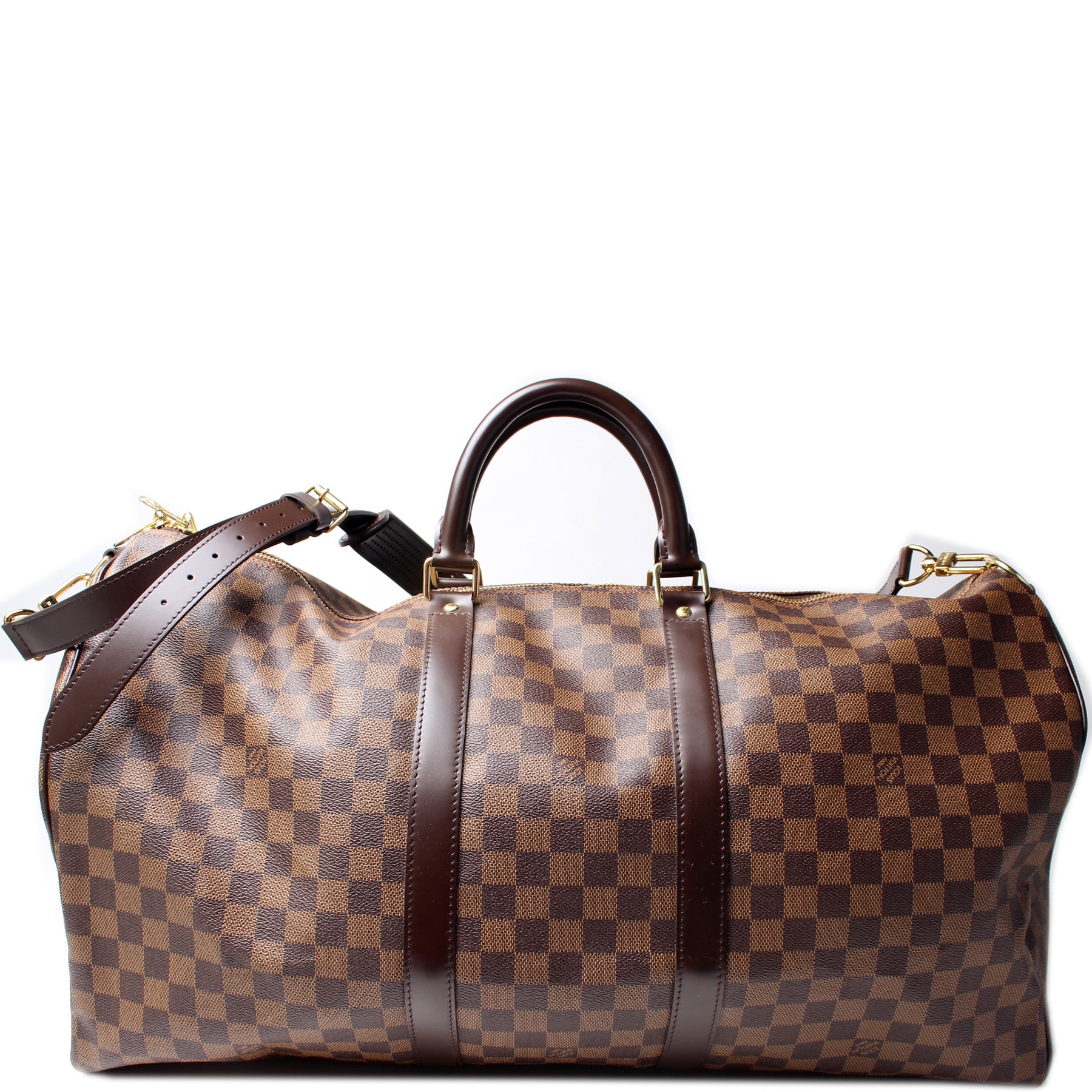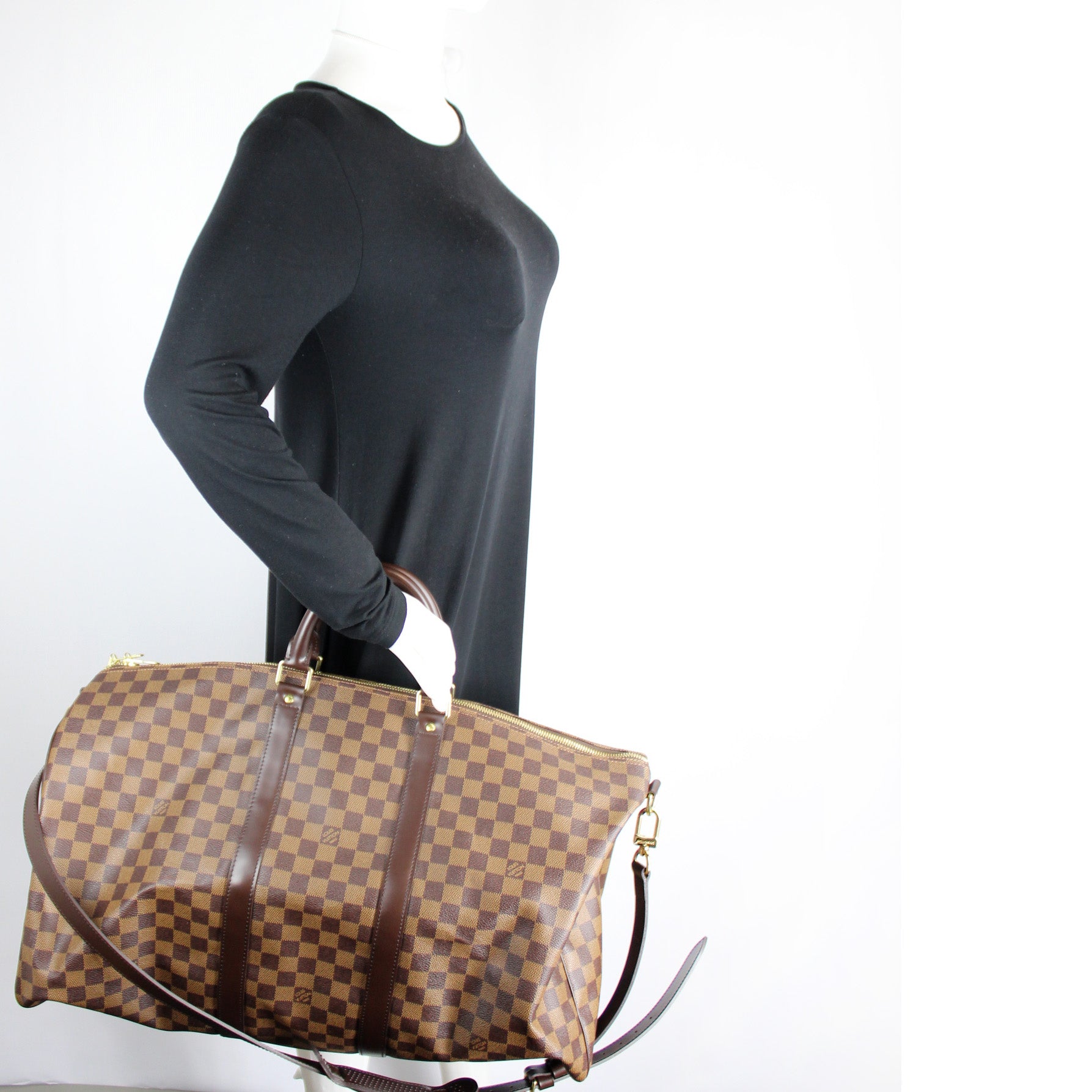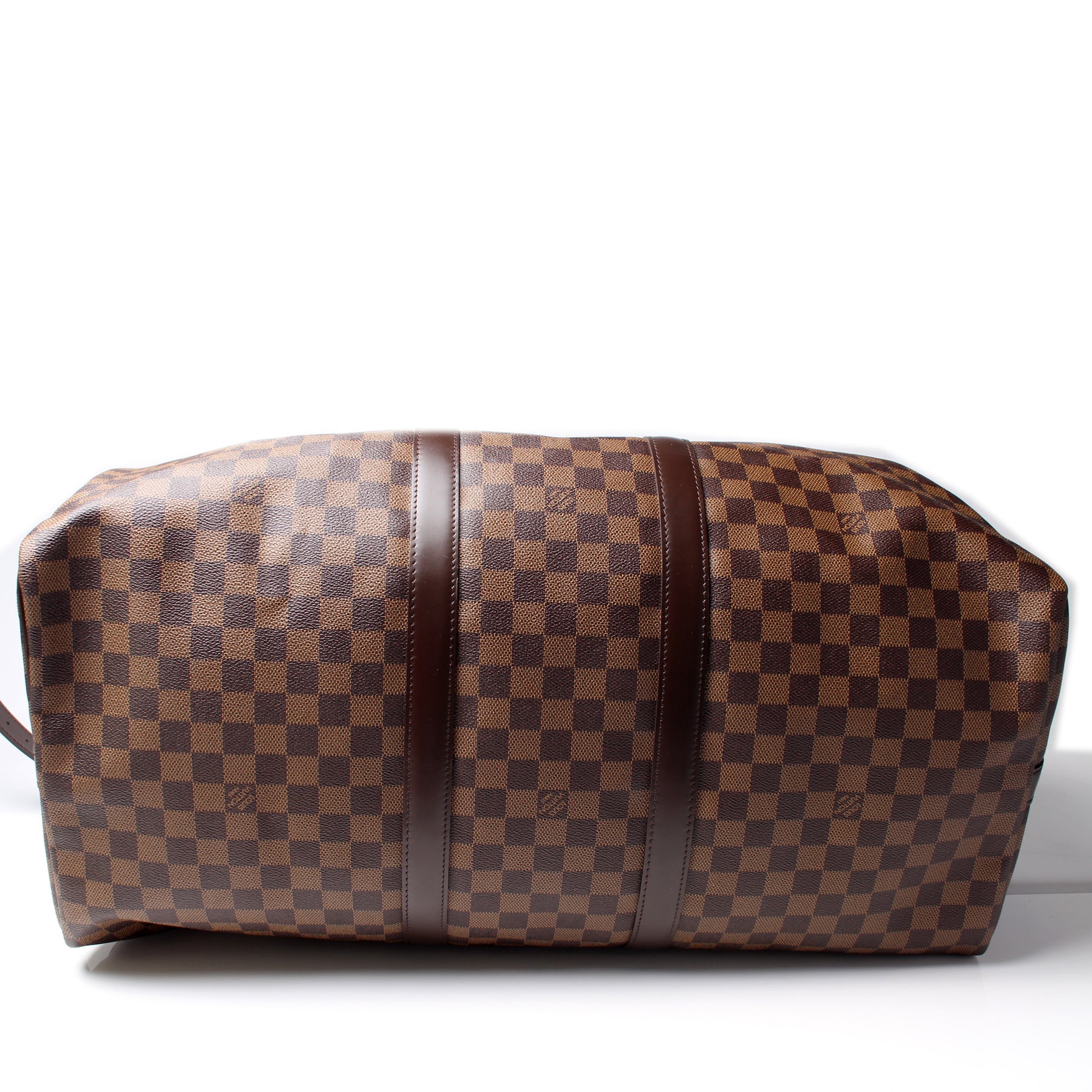 This pre-owned Louis Vuitton Keepall 55 Bandouliere is guaranteed 100% authentic. The exterior is in the classic Damier Ebene coated canvas.
