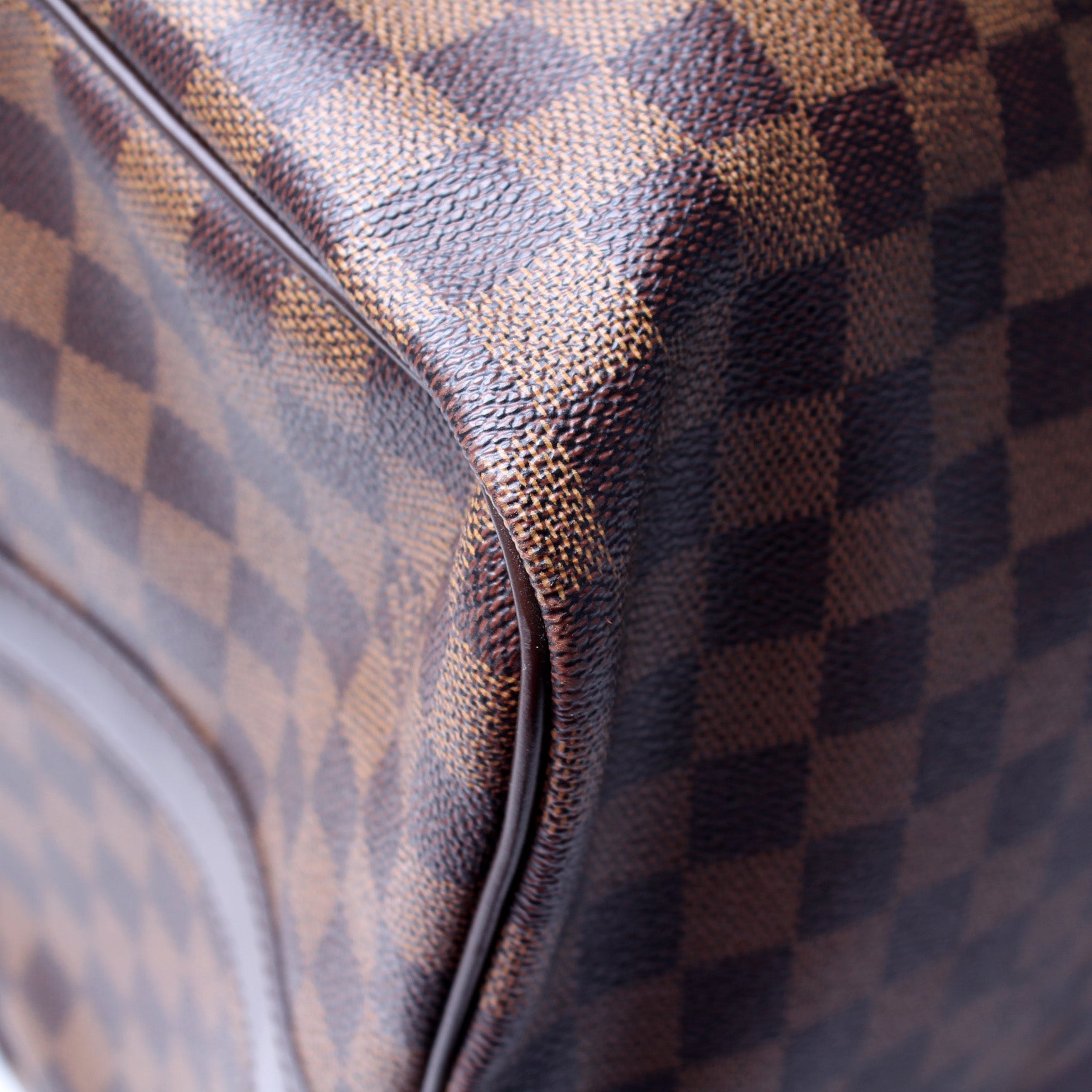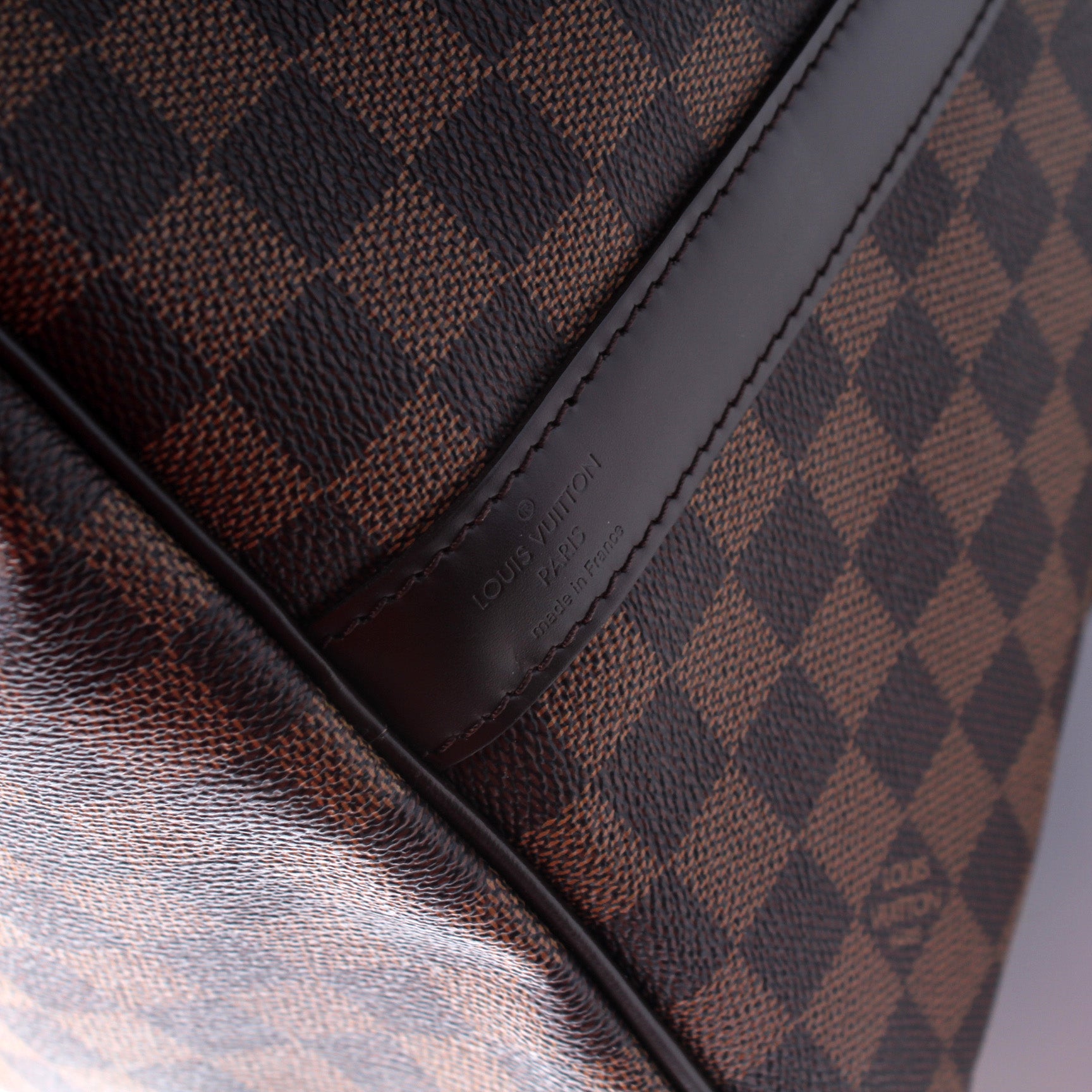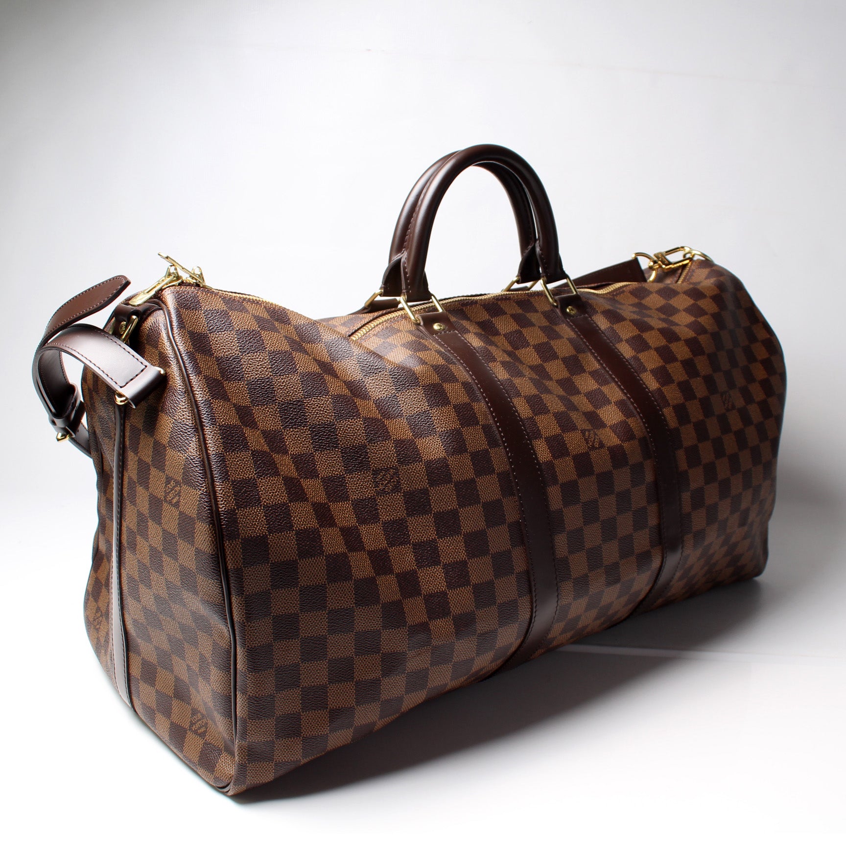 This pre-owned Louis Vuitton Keepall 55 Bandouliere is guaranteed 100% authentic. The exterior is in the classic Damier Ebene coated canvas.