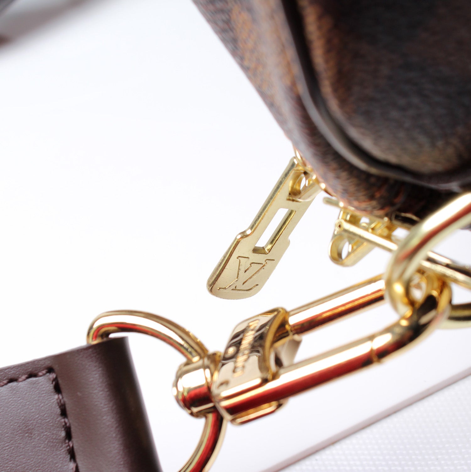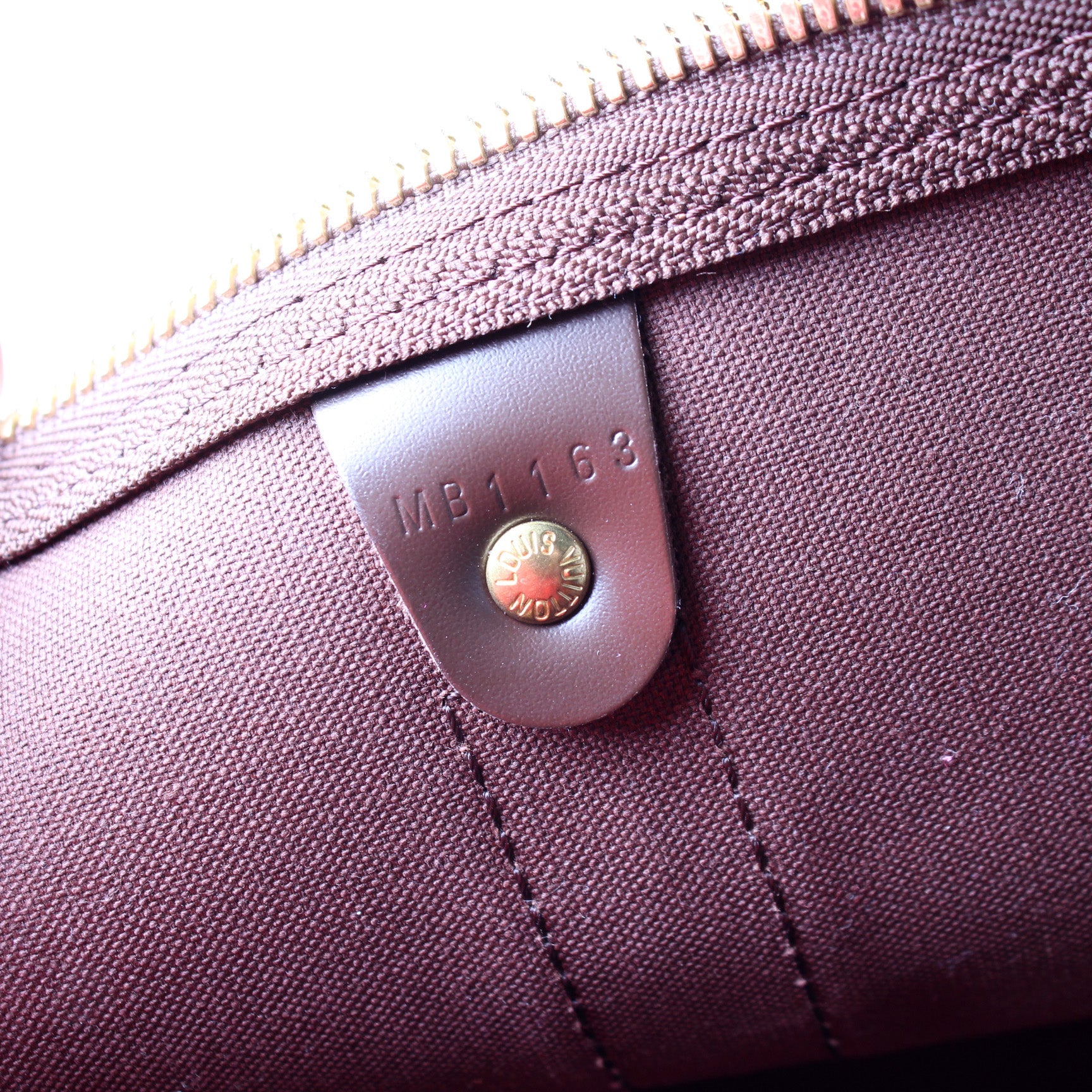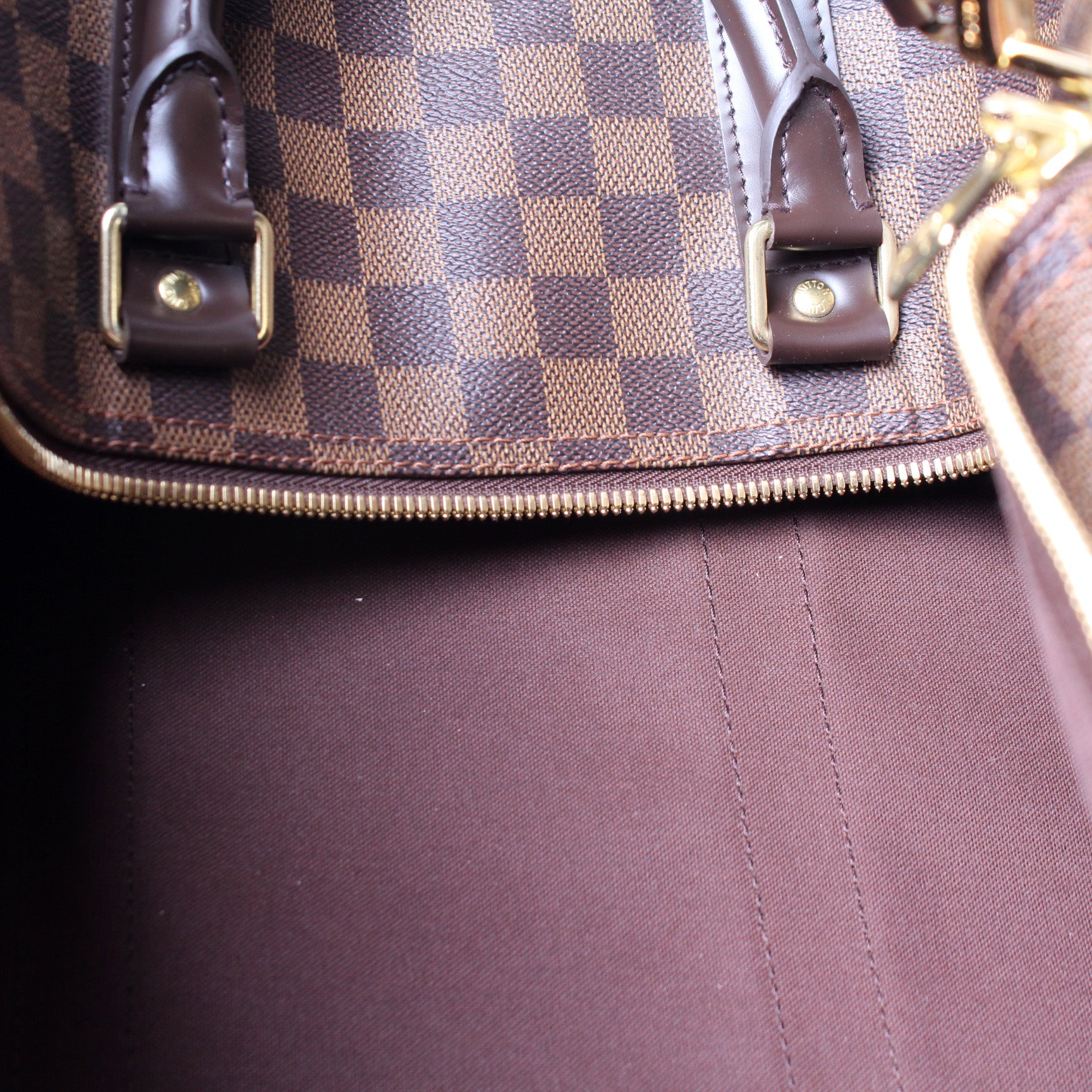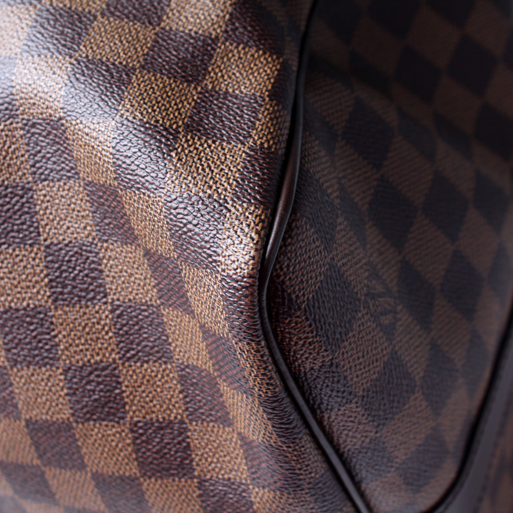 This pre-owned Louis Vuitton Keepall 55 Bandouliere is guaranteed 100% authentic. The exterior is in the classic Damier Ebene coated canvas.