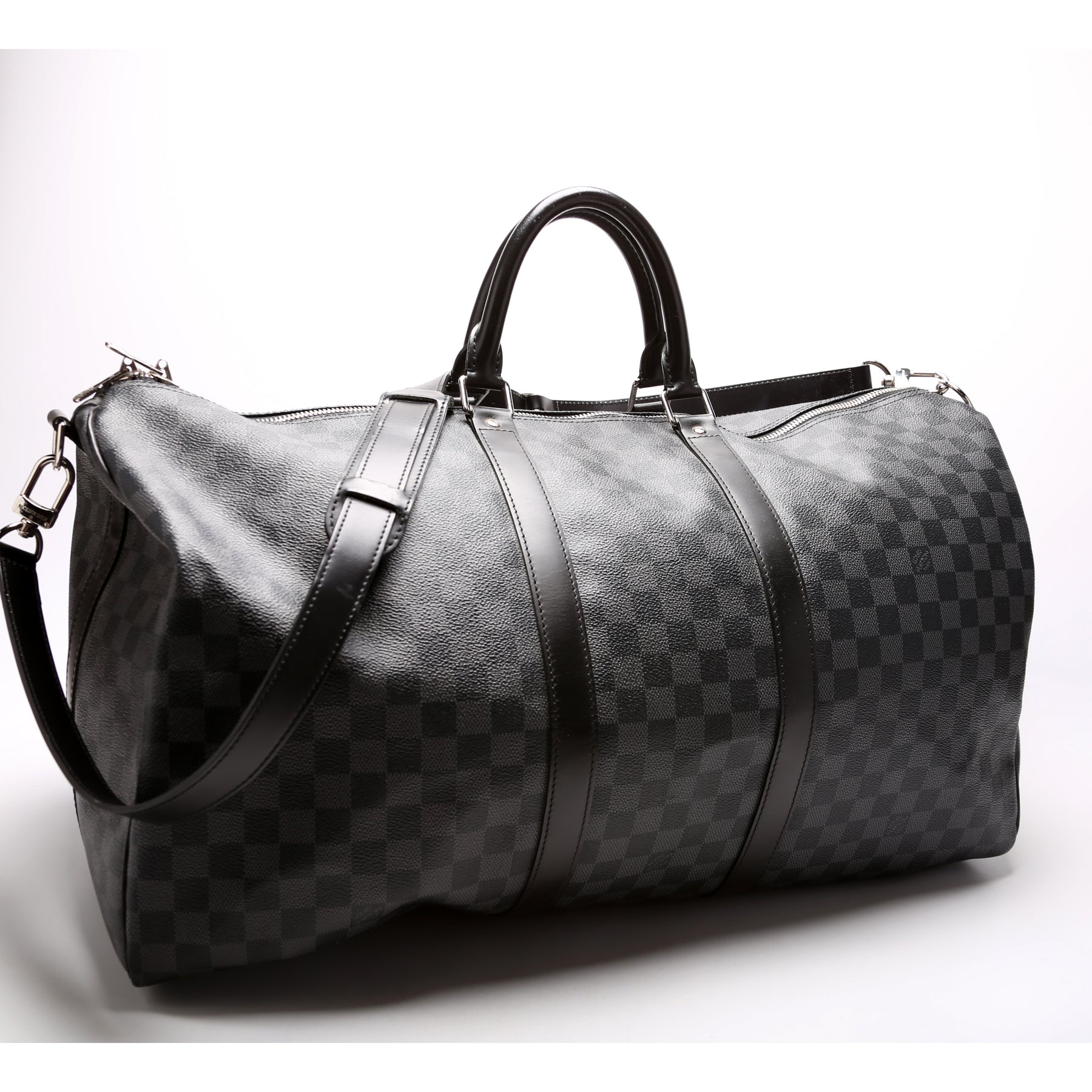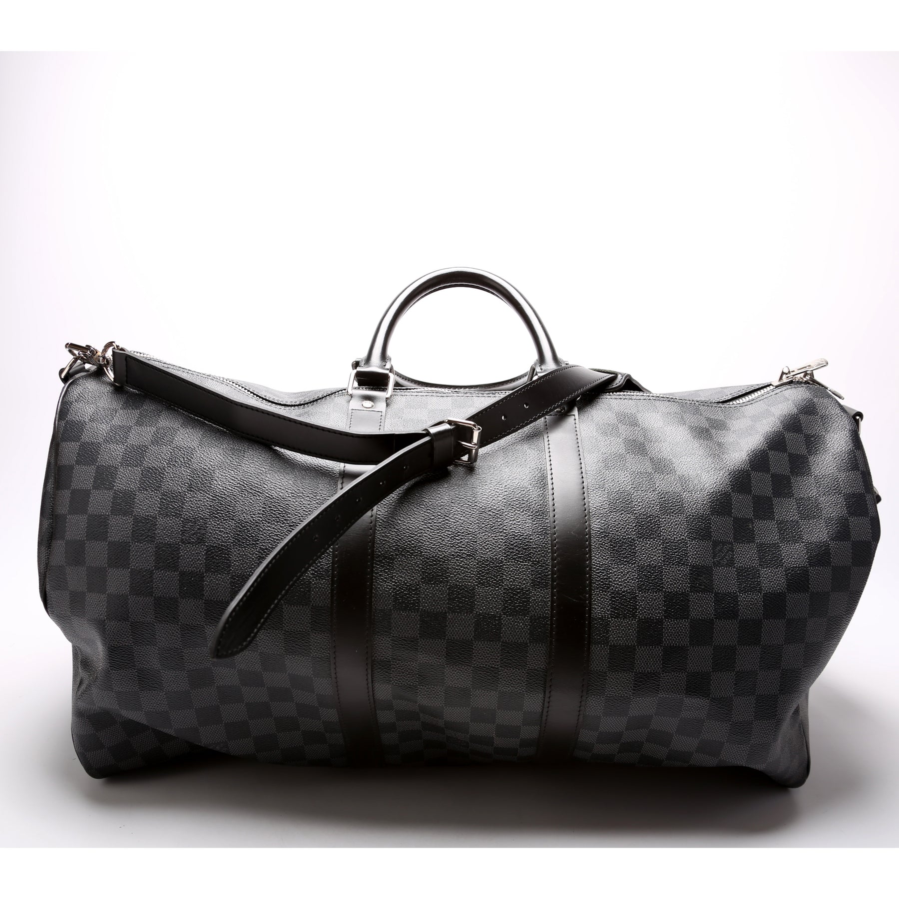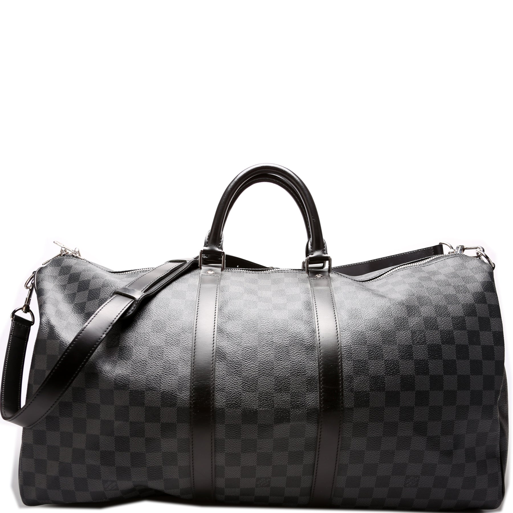 This pre-owned Louis Vuitton Keepall 55 Bandouliere is guaranteed 100% authentic. The exterior is in the classic Damier Graphite coated canvas.
