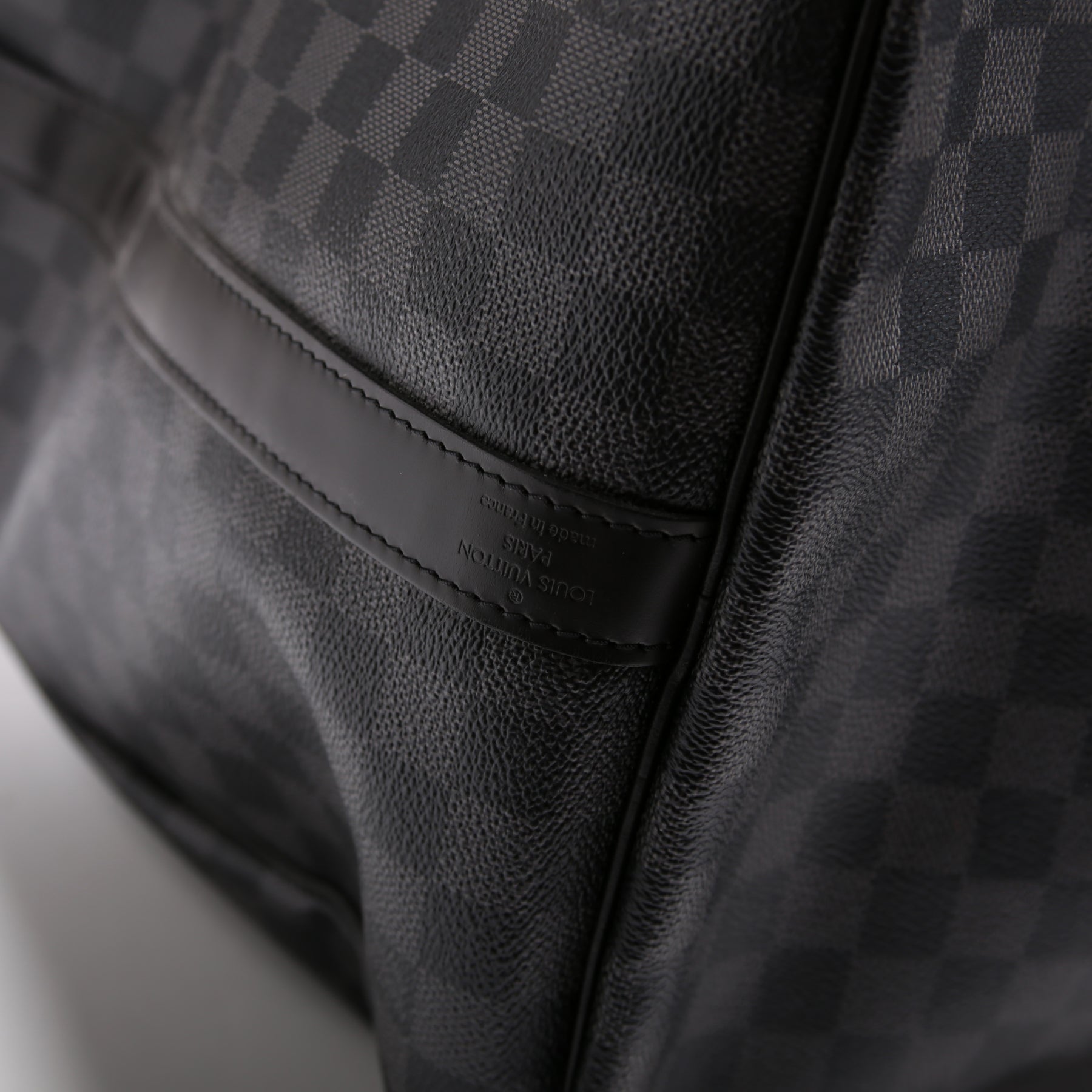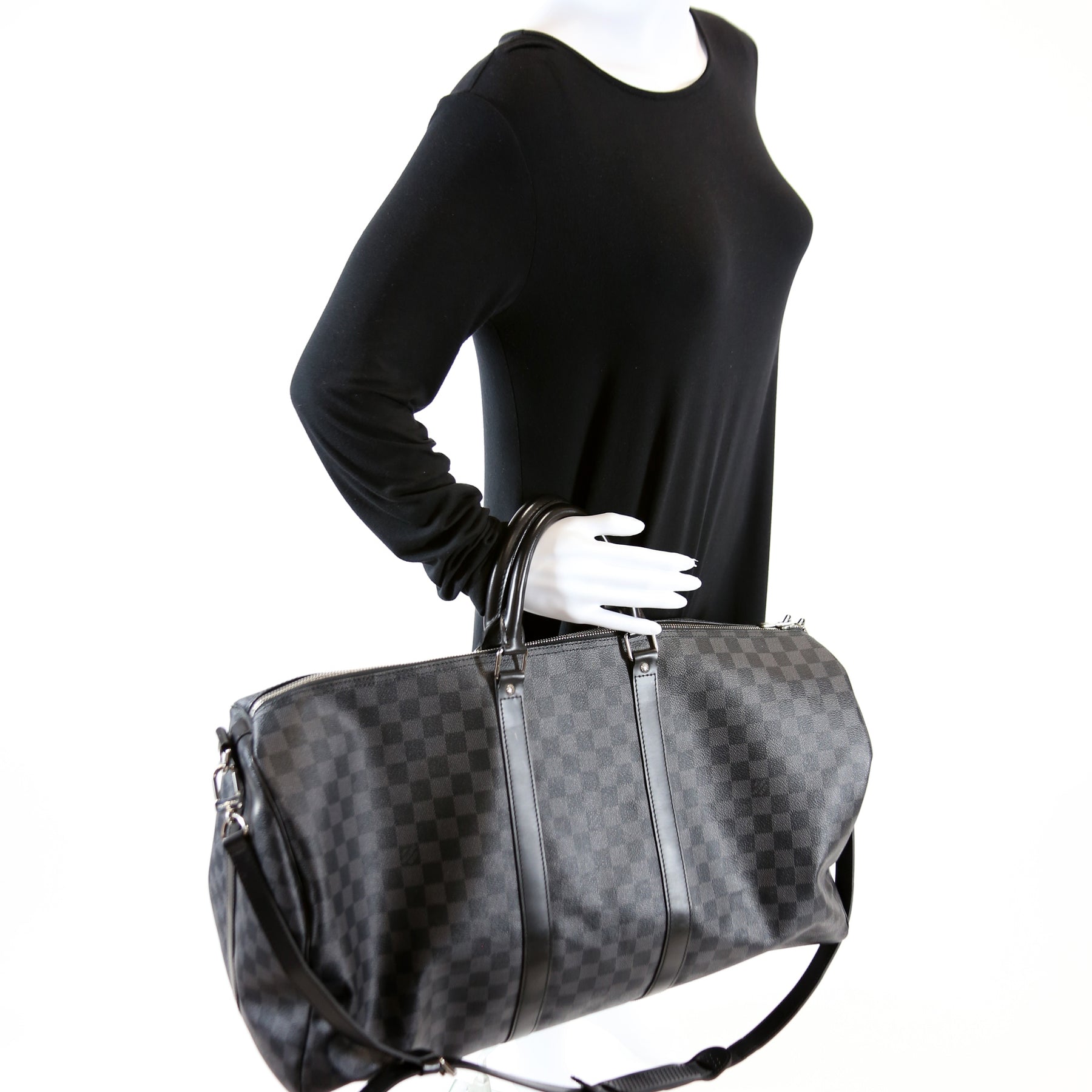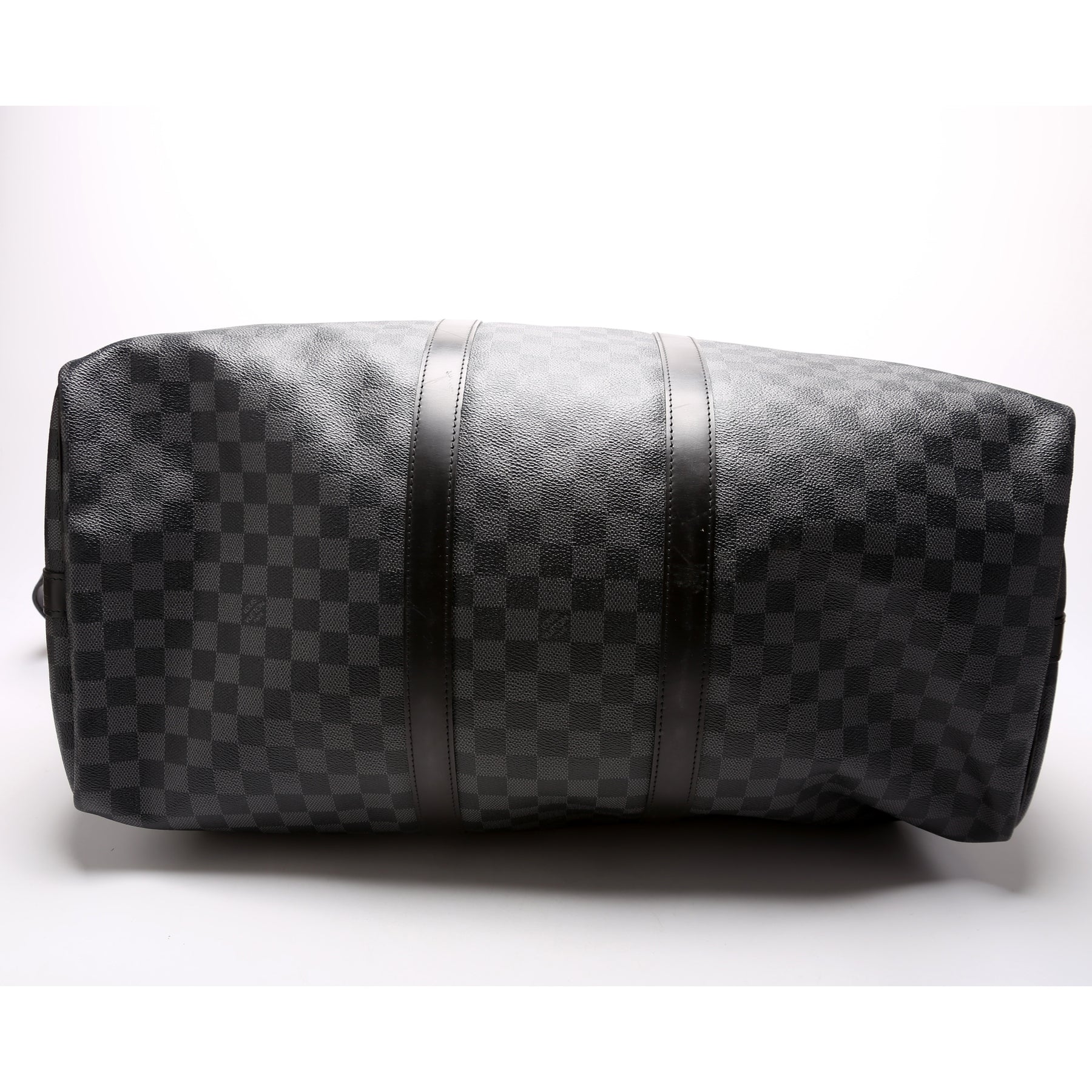 This pre-owned Louis Vuitton Keepall 55 Bandouliere is guaranteed 100% authentic. The exterior is in the classic Damier Graphite coated canvas.