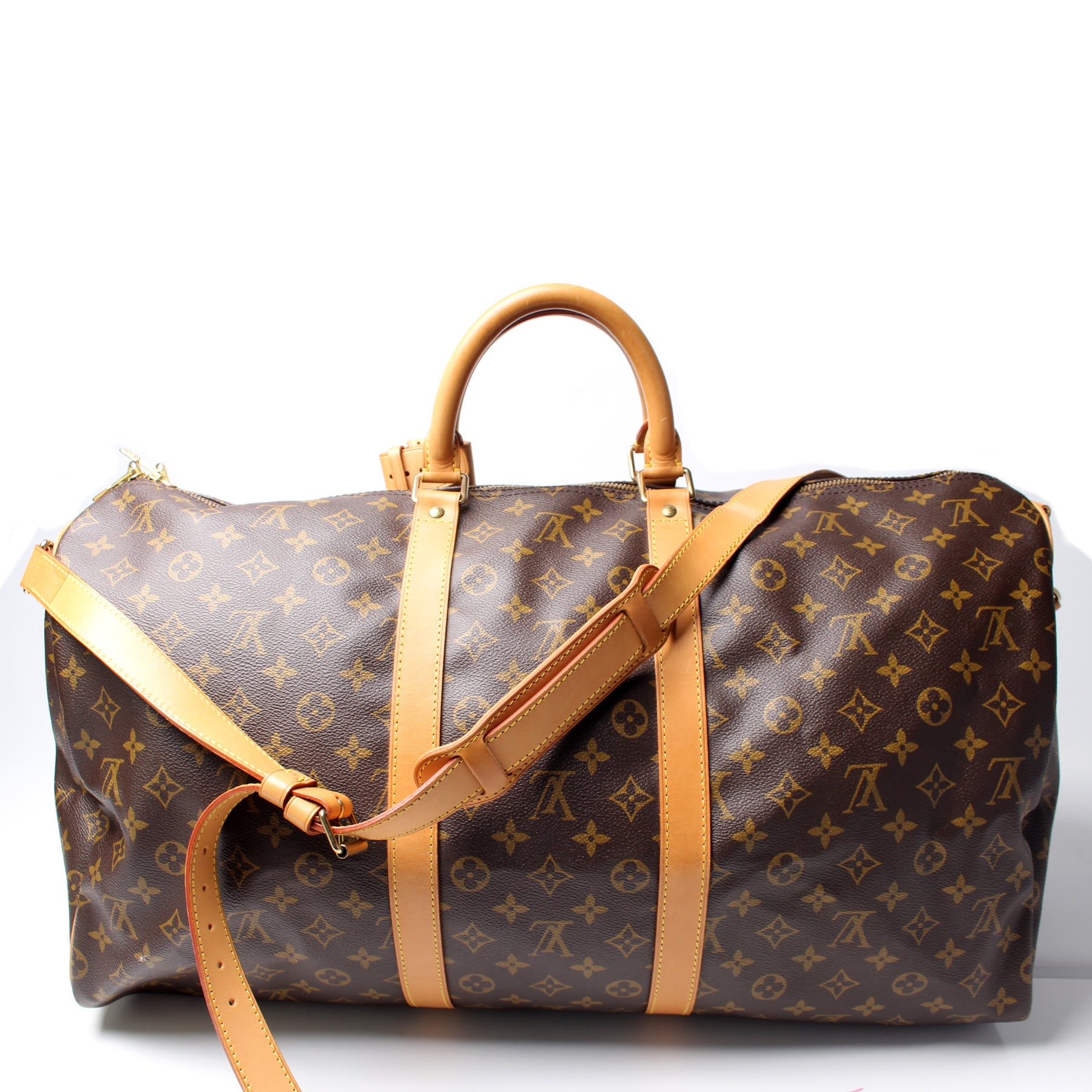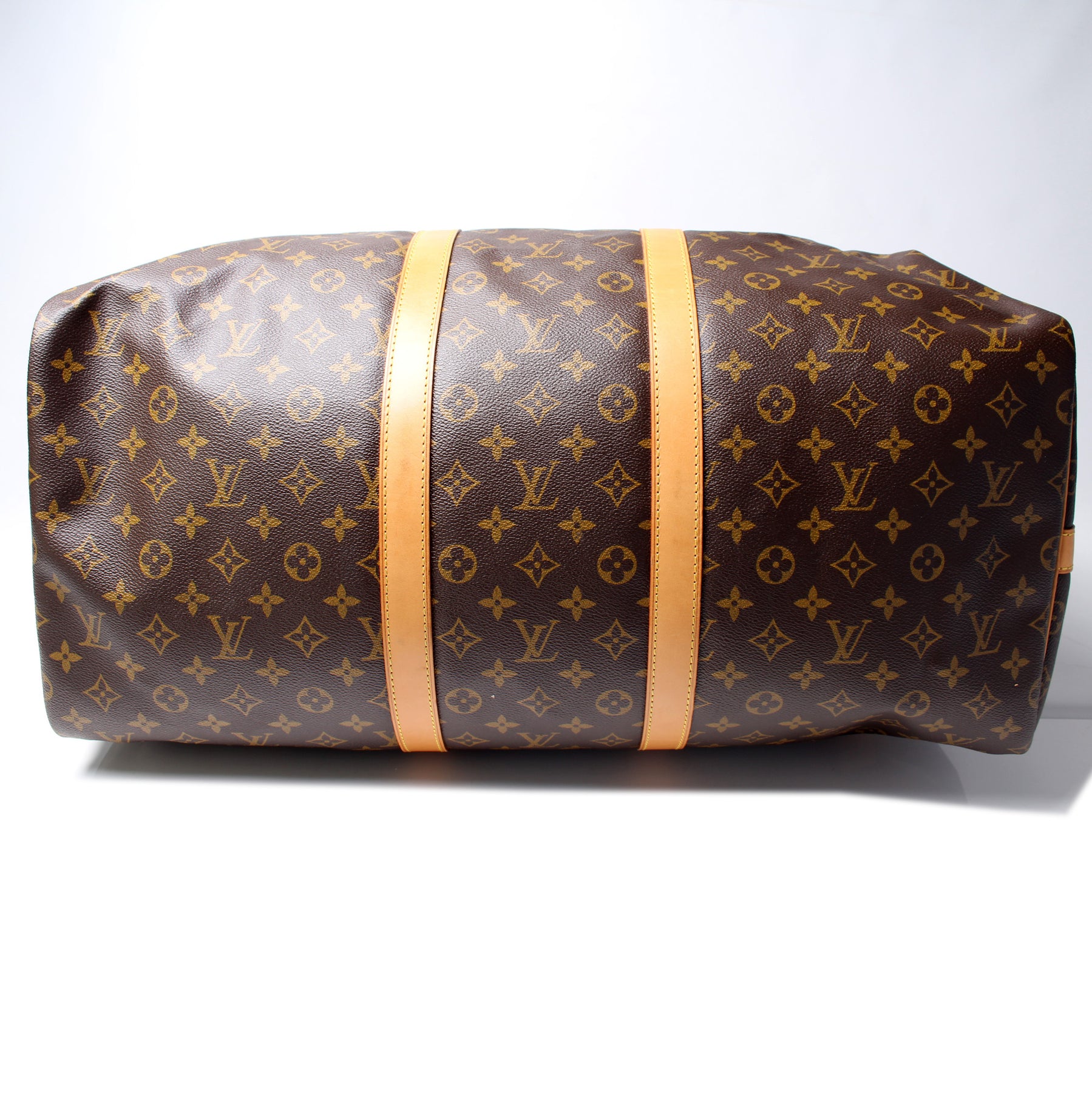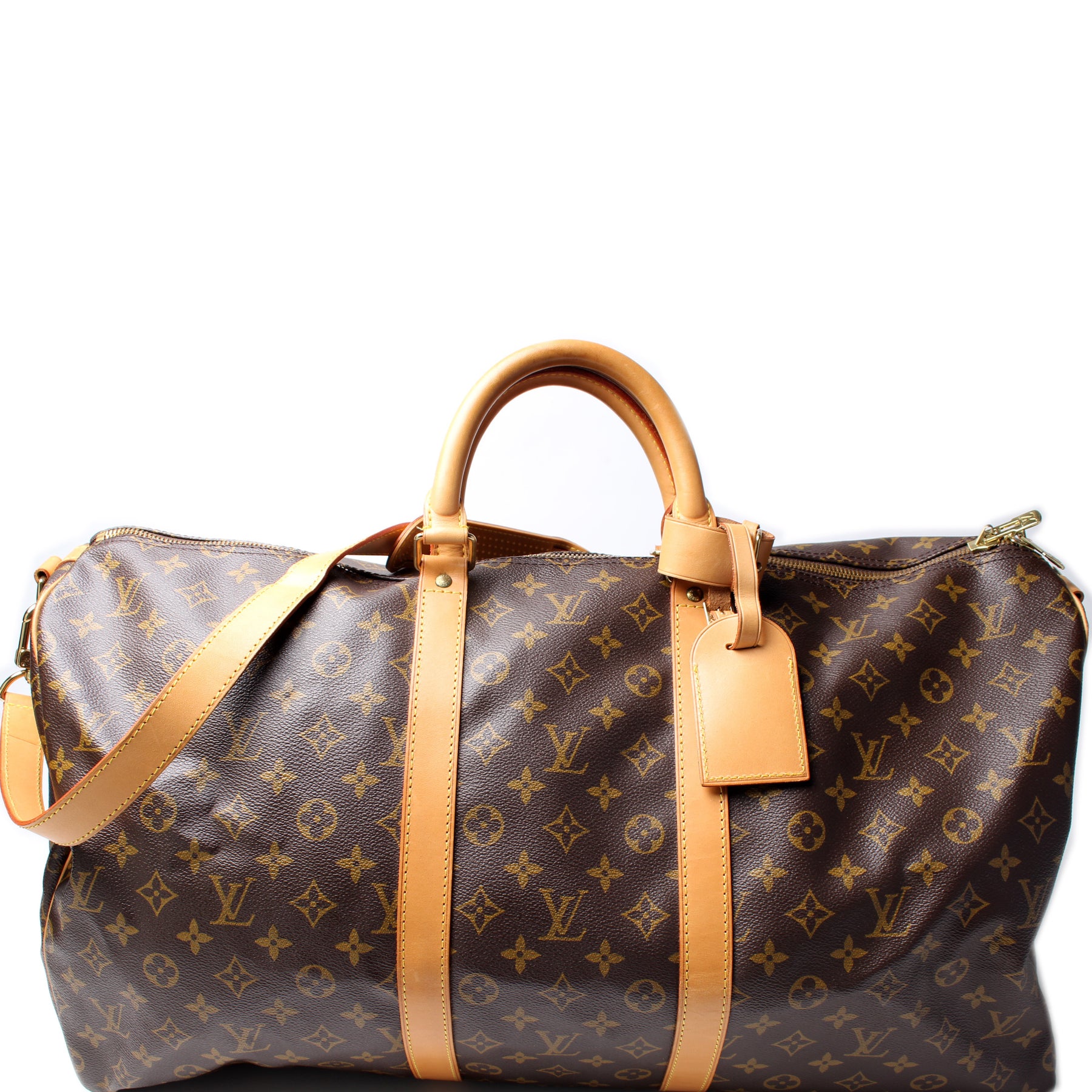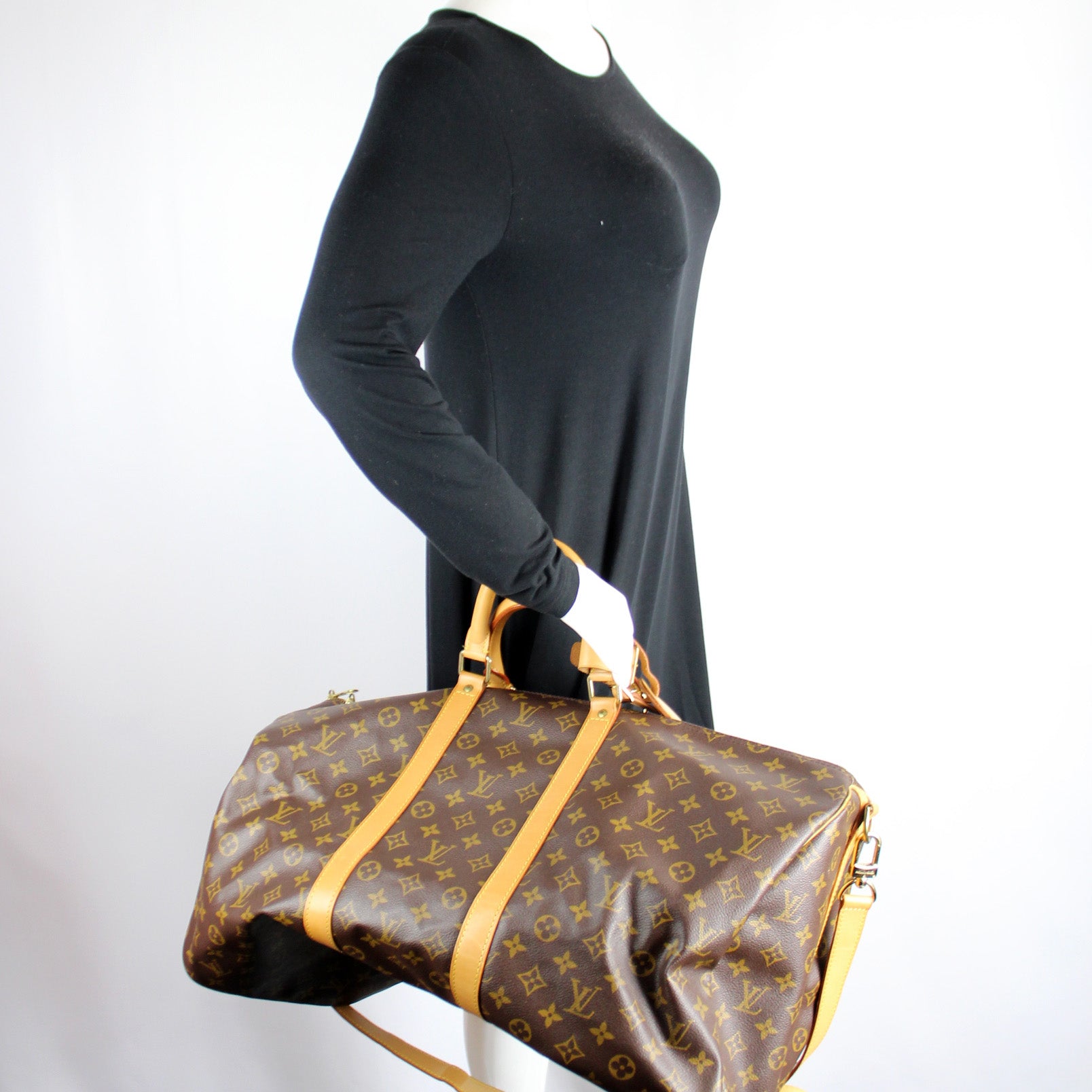 This pre-owned Louis Vuitton Keepall 55 Bandouliere is guaranteed 100% authentic. The exterior is in the classic Monogram coated canvas.