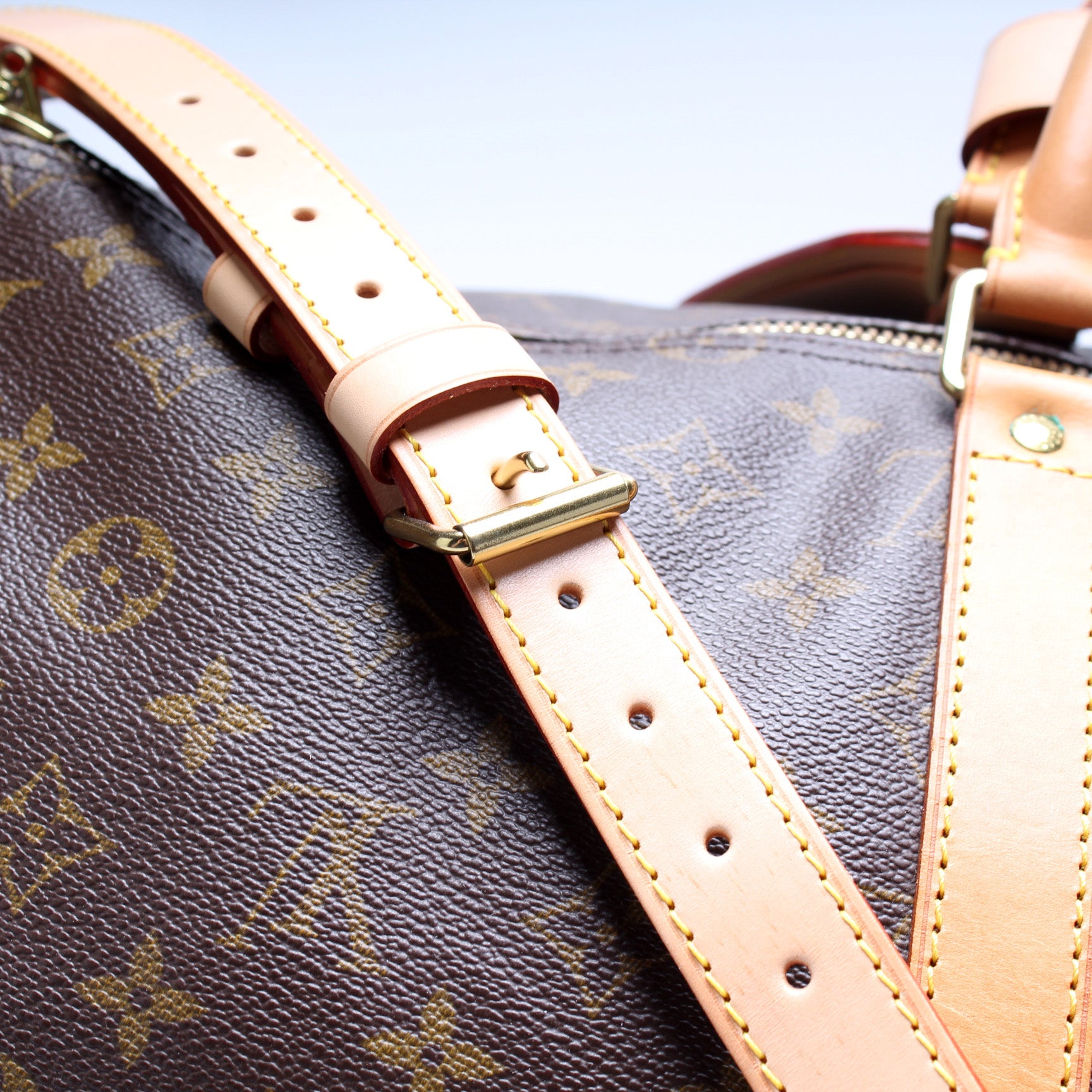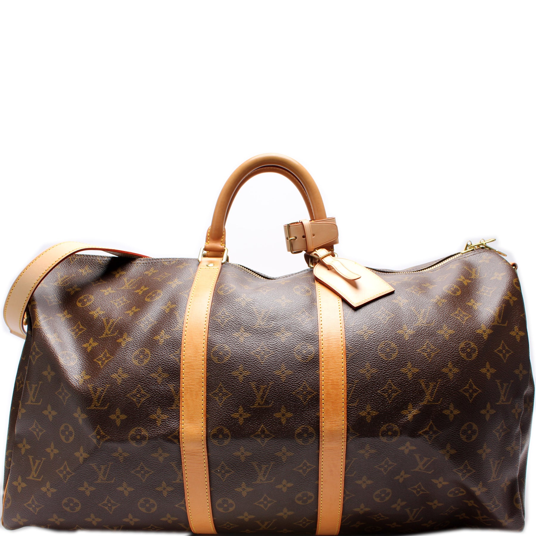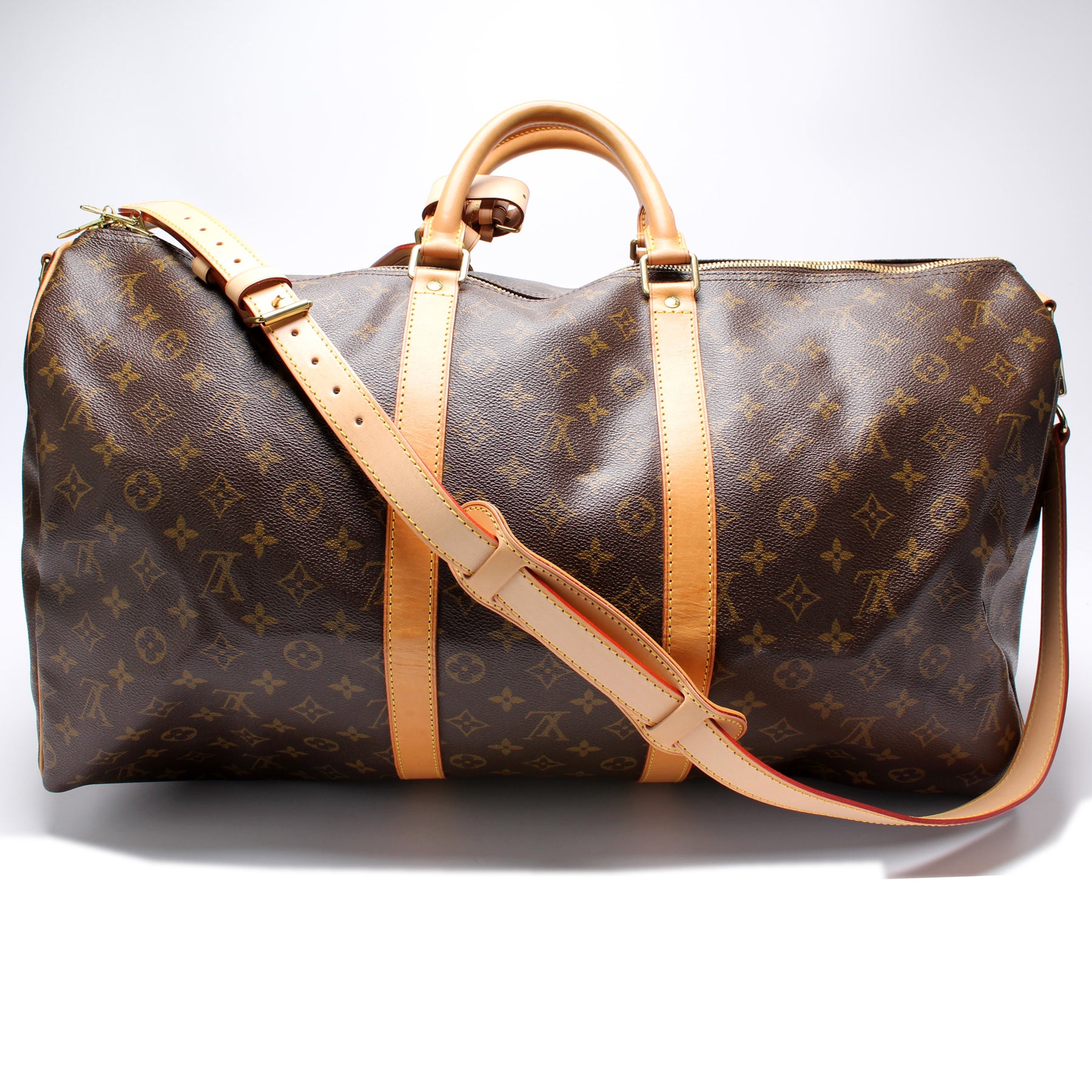 This pre-owned Louis Vuitton Keepall 55 Bandouliere is guaranteed 100% authentic. The exterior is in the classic Louis Vuitton Monogram coated canvas.