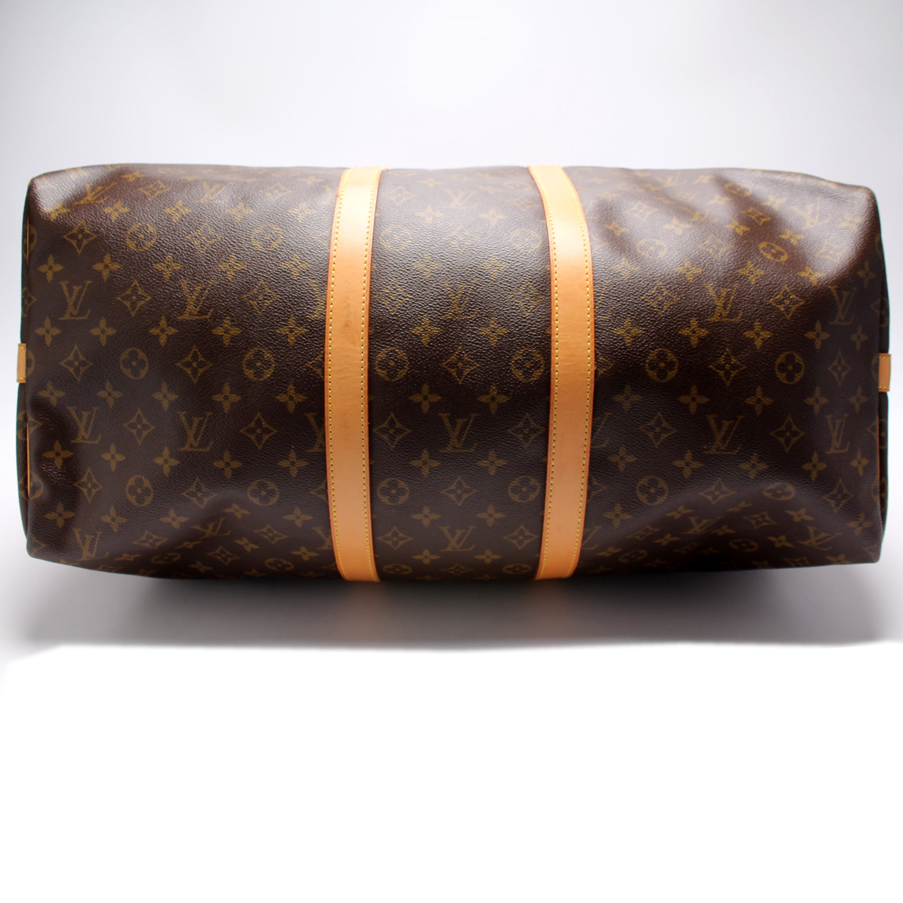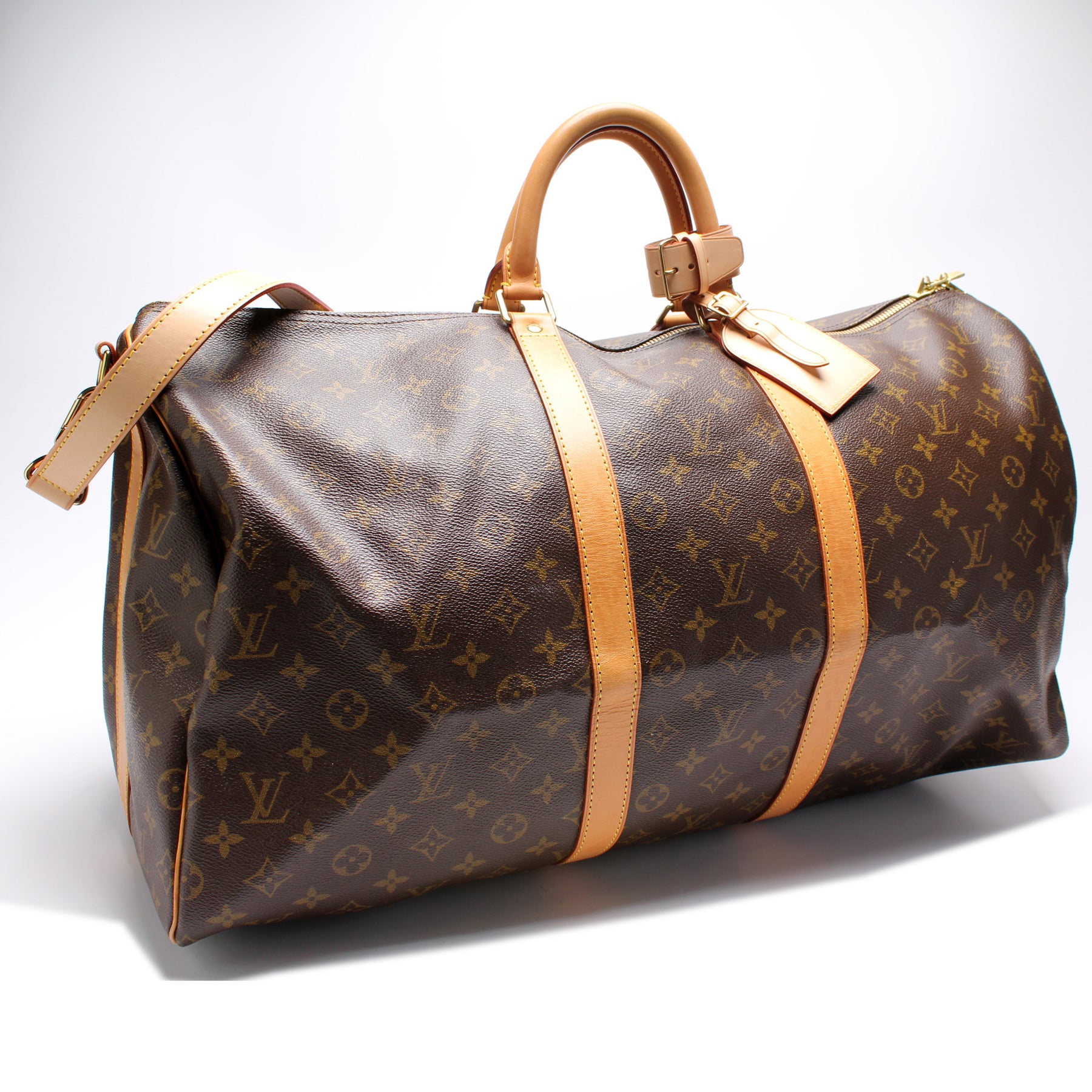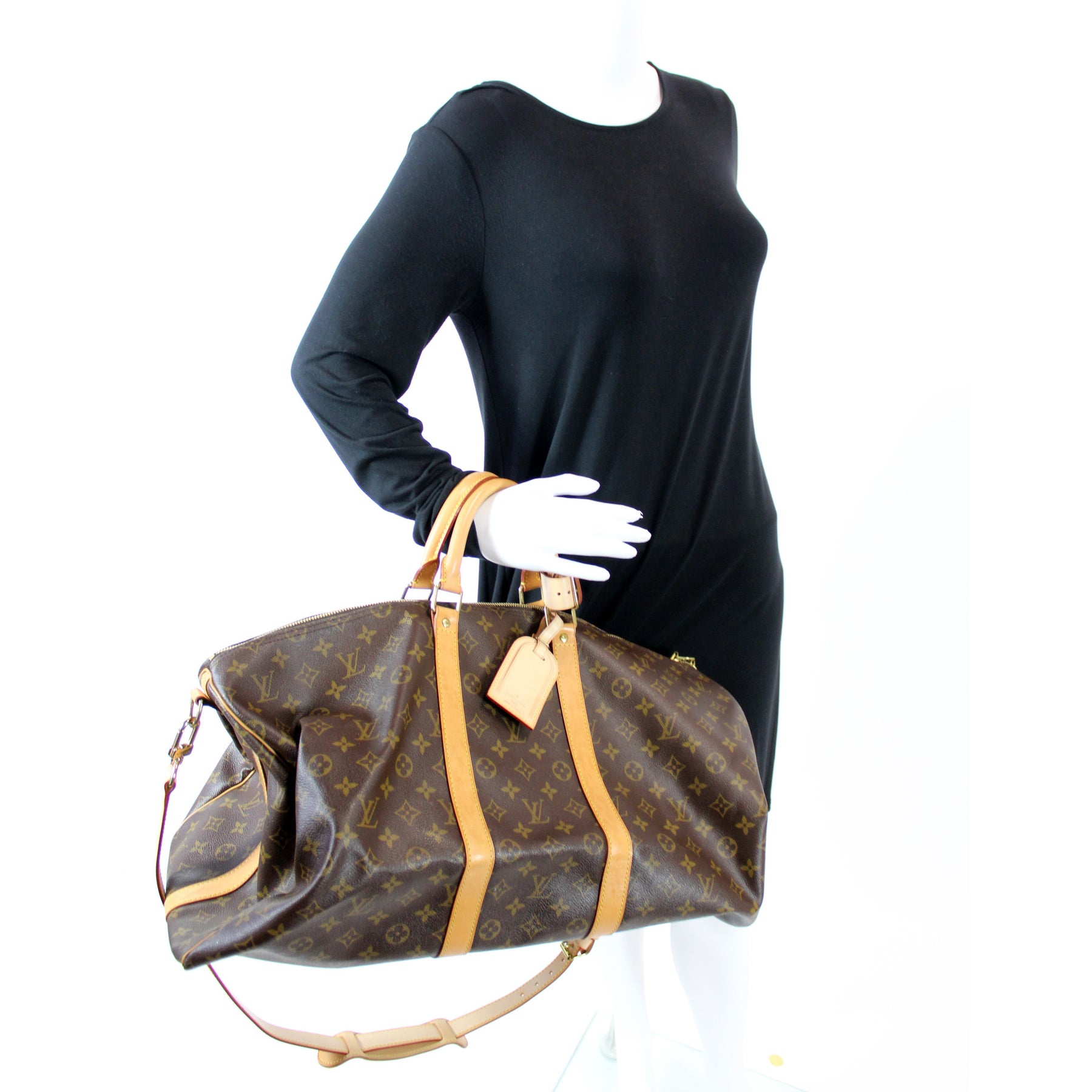 This pre-owned Louis Vuitton Keepall 55 Bandouliere is guaranteed 100% authentic. The exterior is in the classic Louis Vuitton Monogram coated canvas.