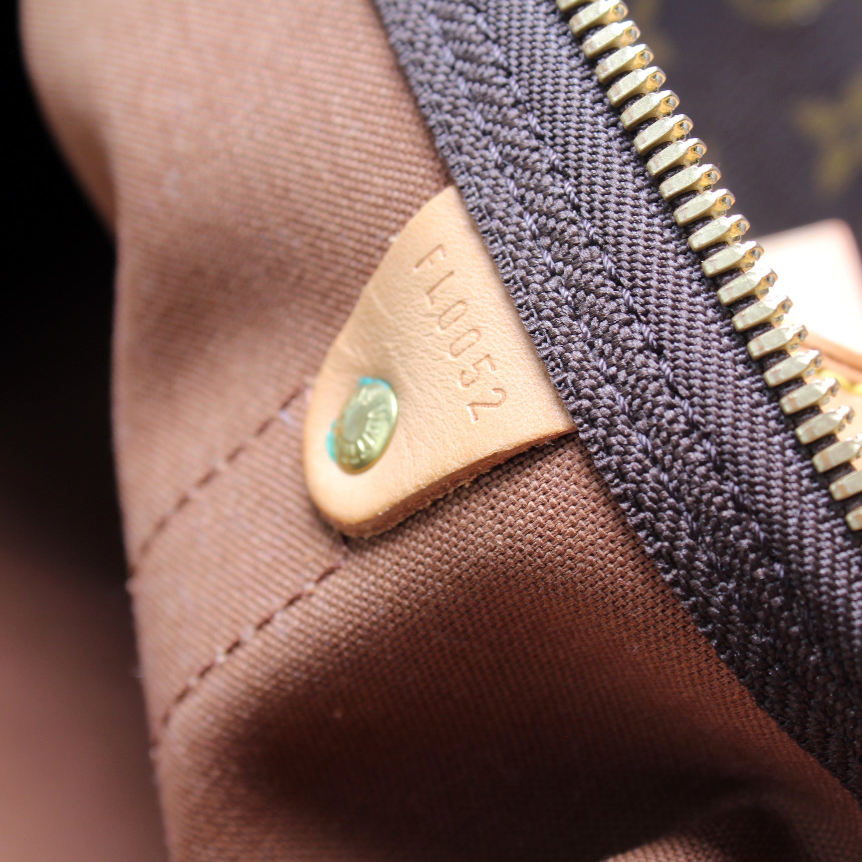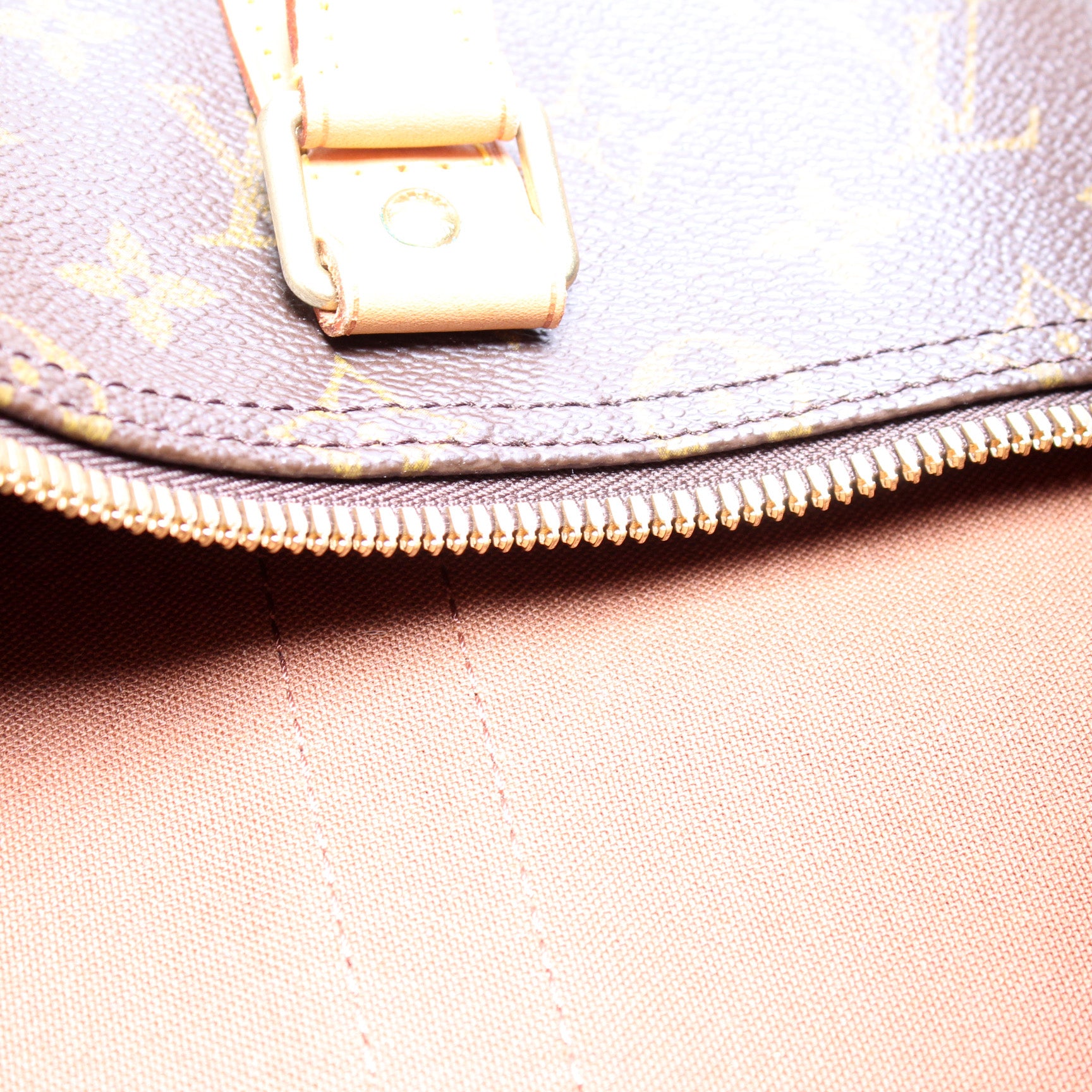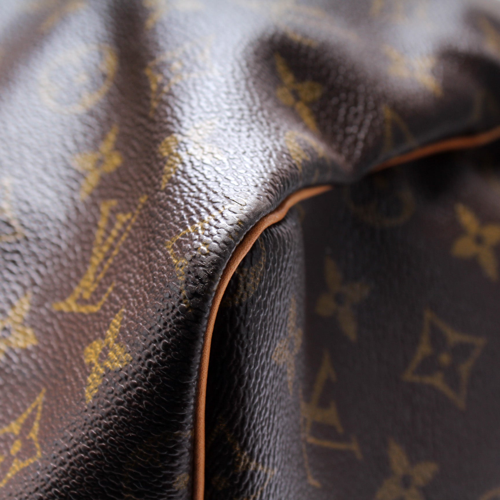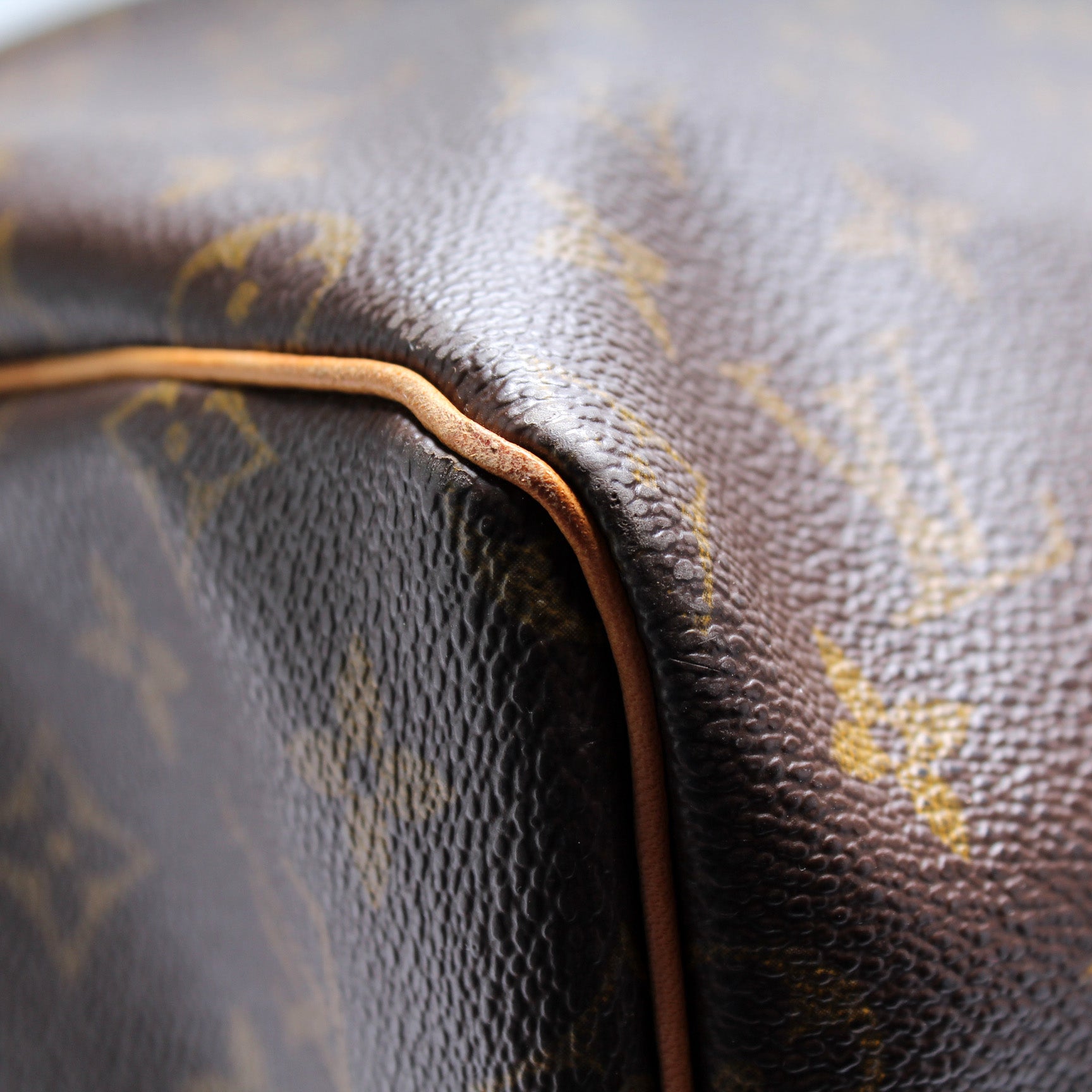 Exterior: The exterior coated canvas is free of any rips or cracks. The leather trim shows minor discoloration.