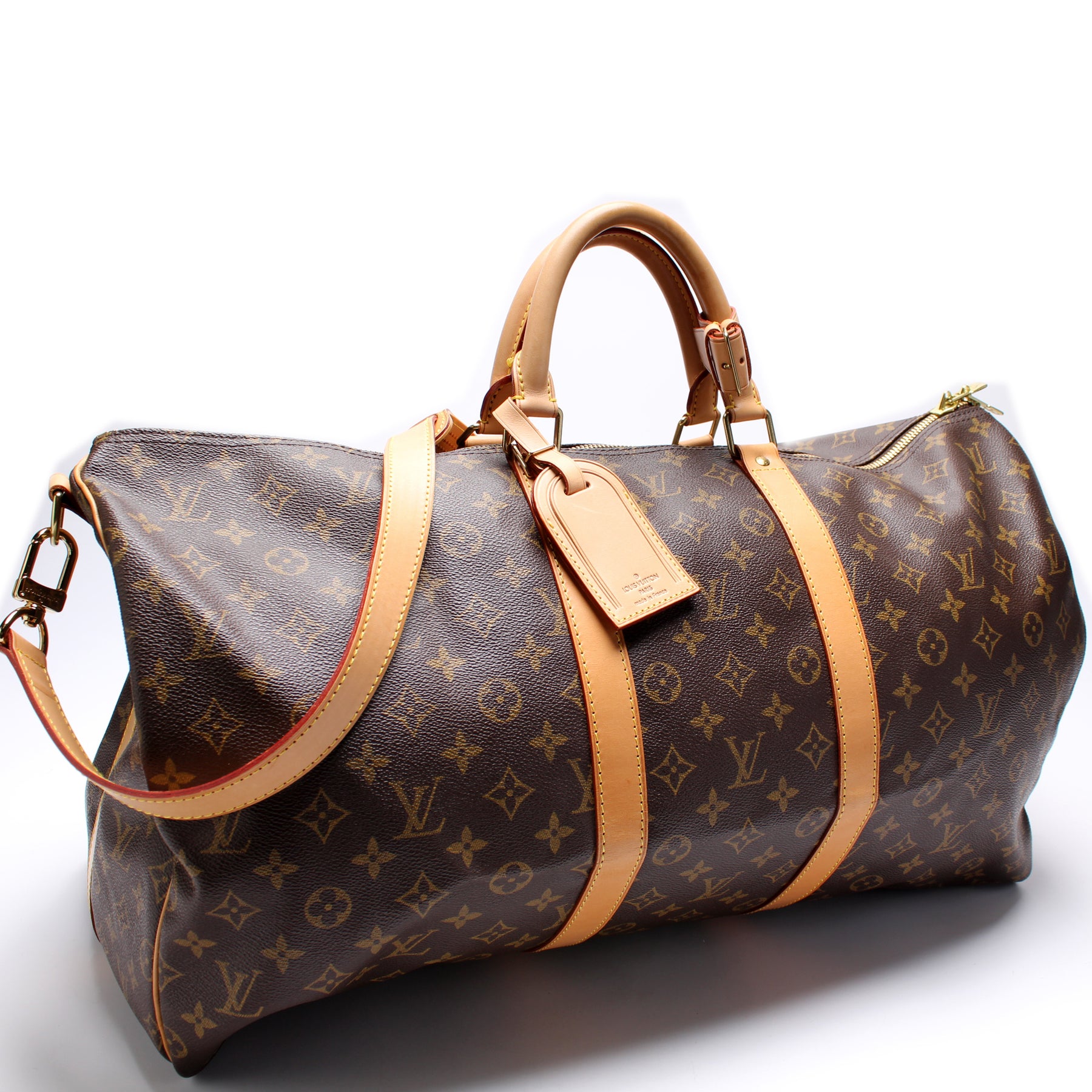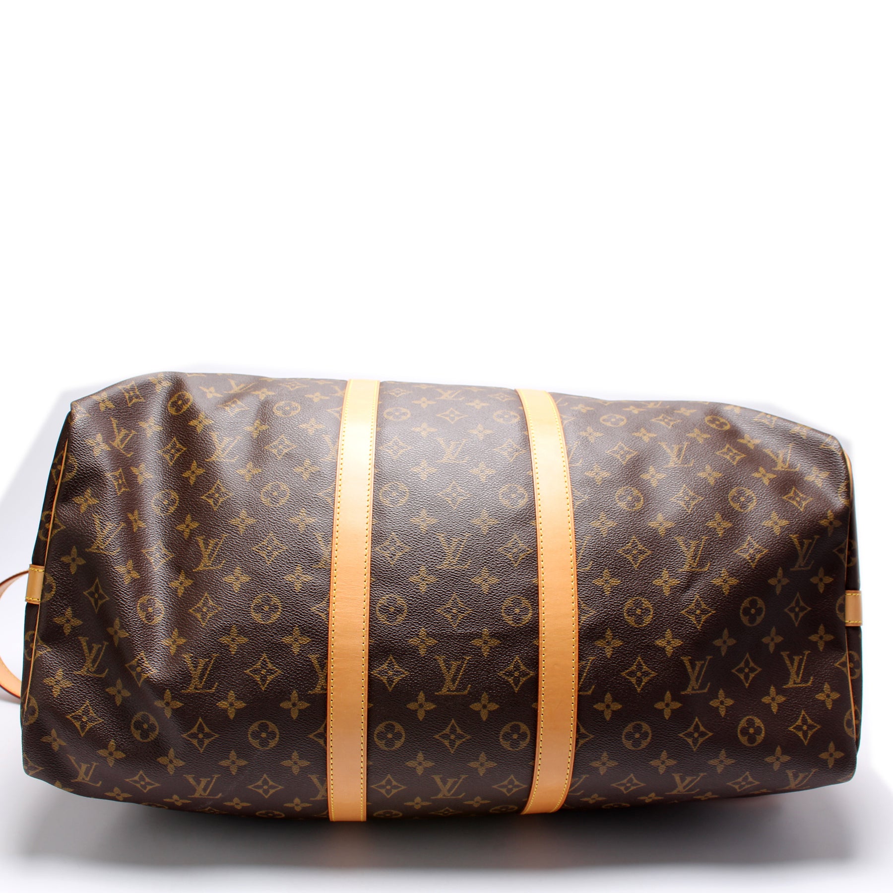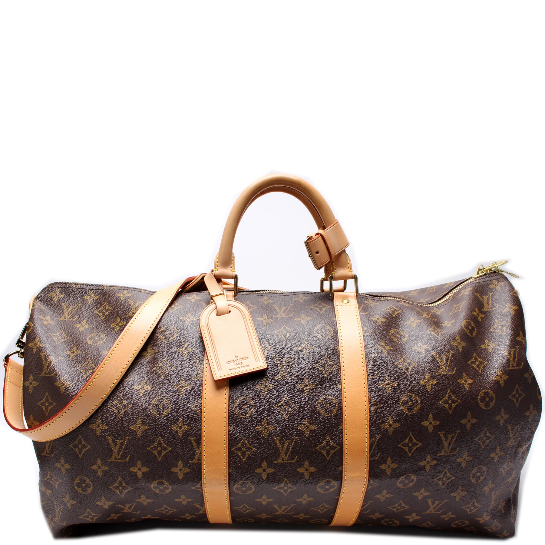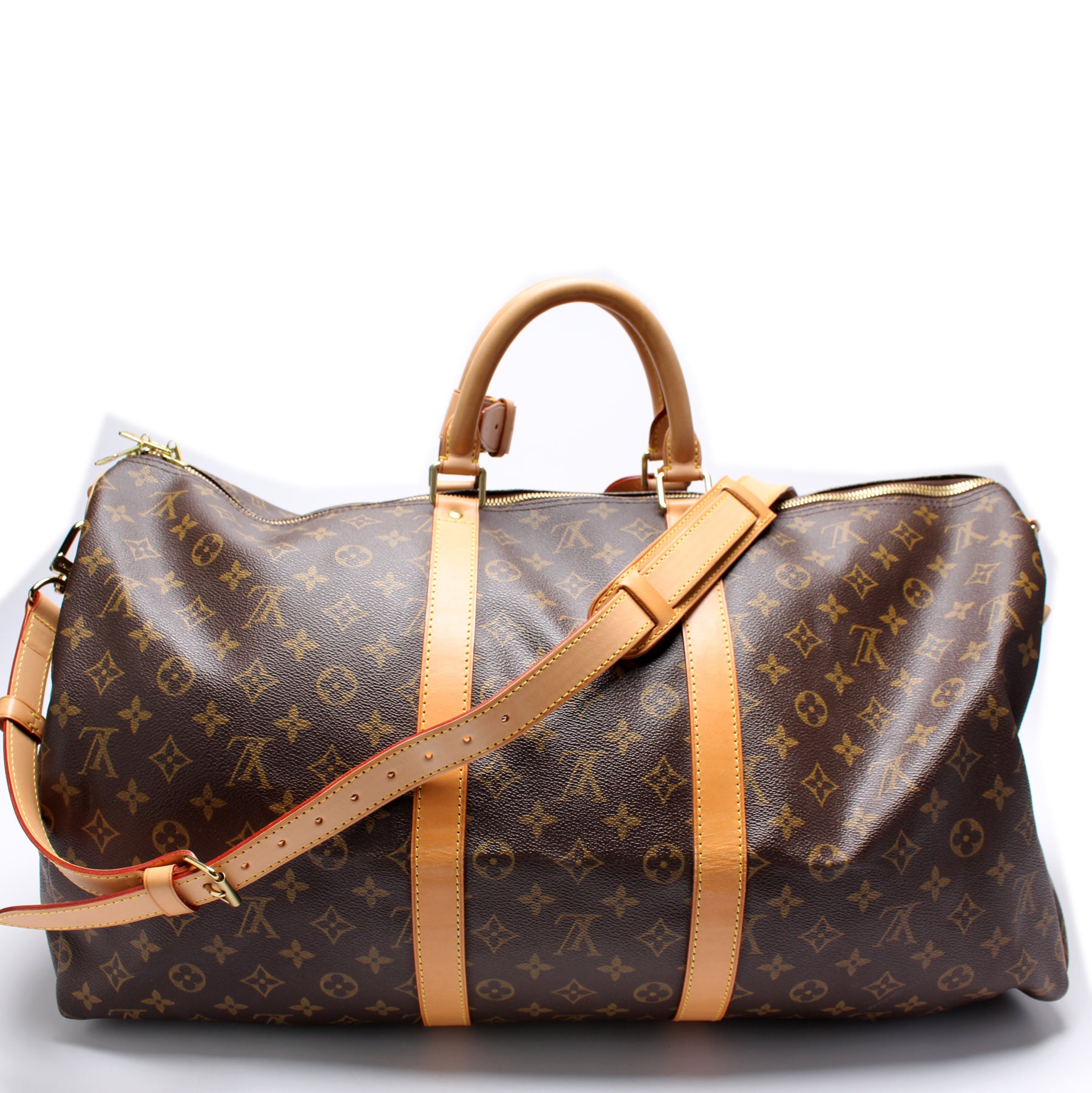 This pre-owned Louis Vuitton Keepall 55 Bandouliere is guaranteed 100% authentic. The exterior is in the classic Louis Vuitton Monogram coated canvas.