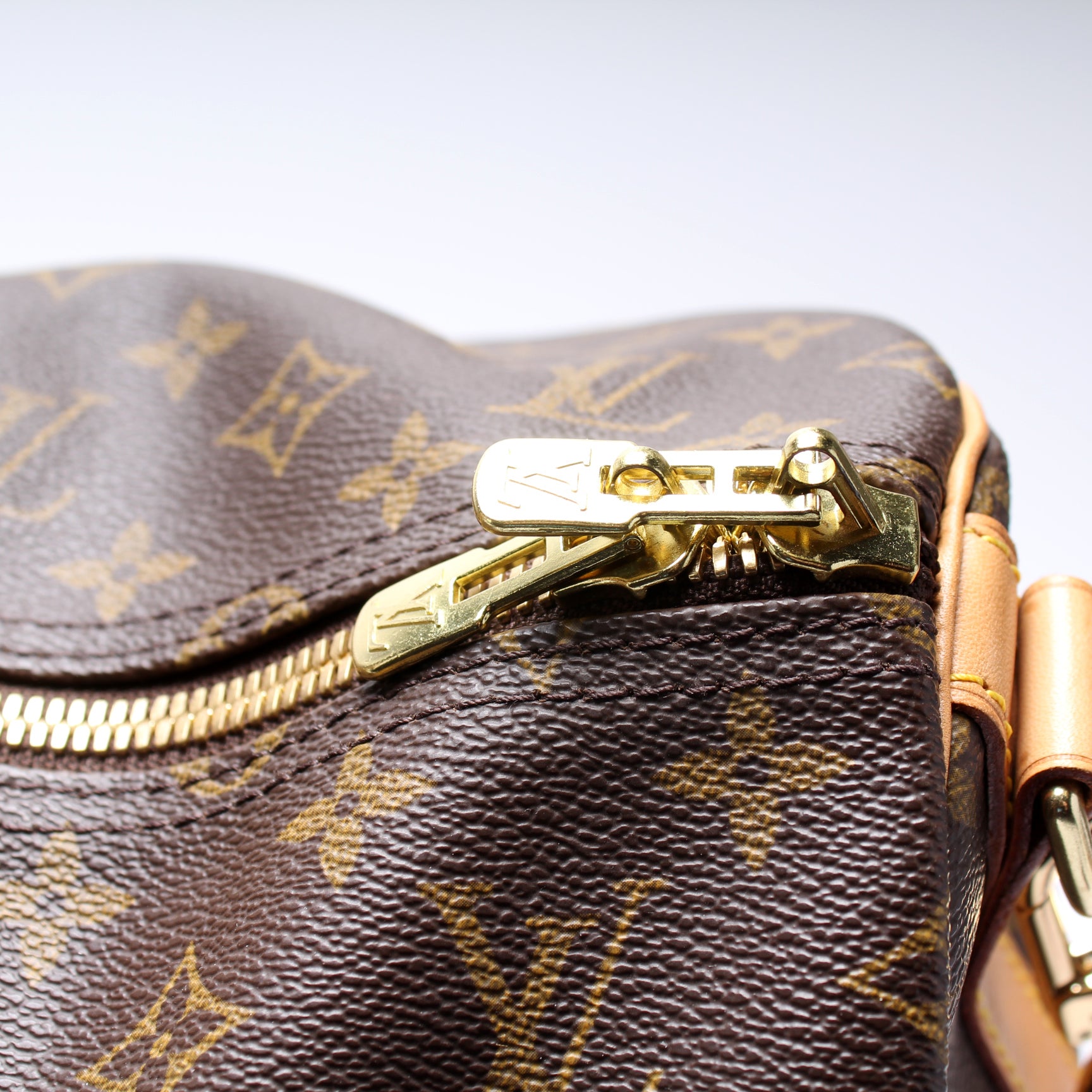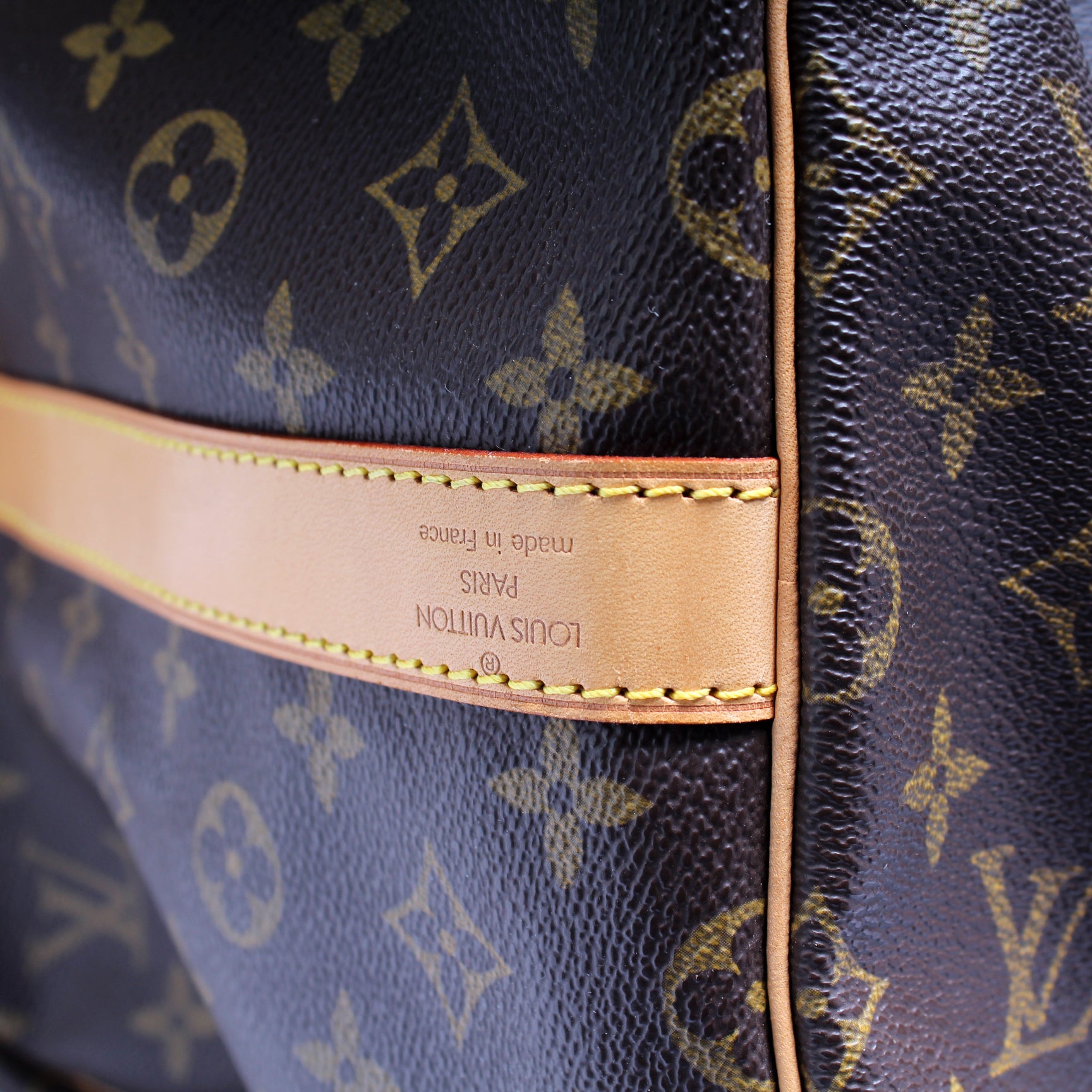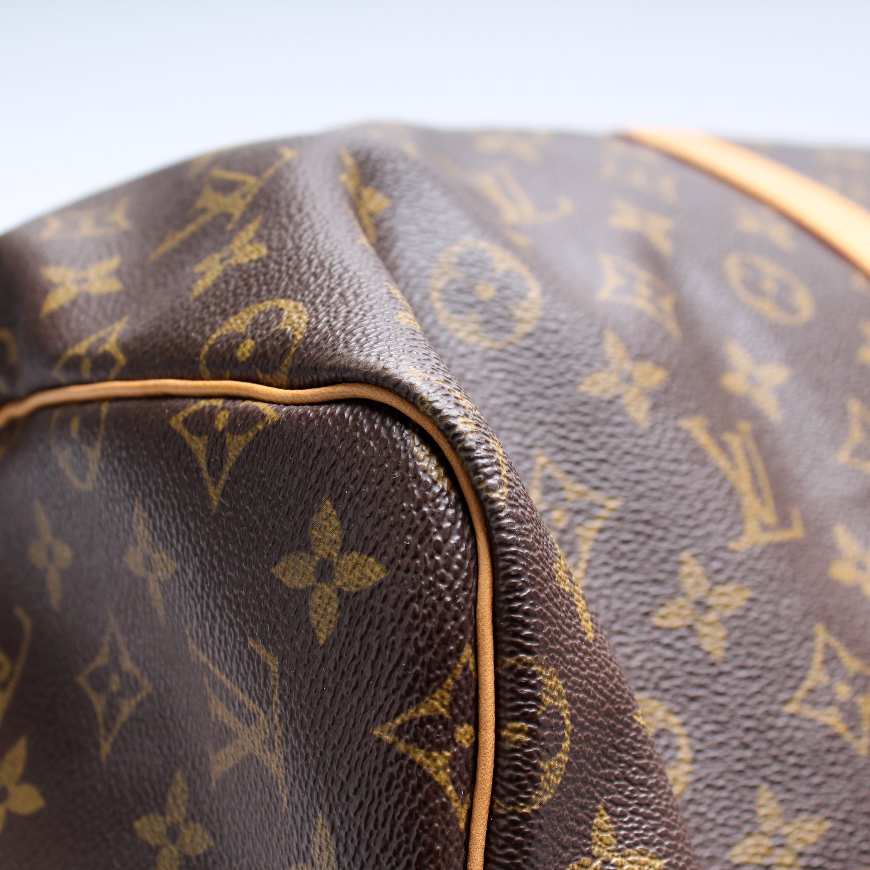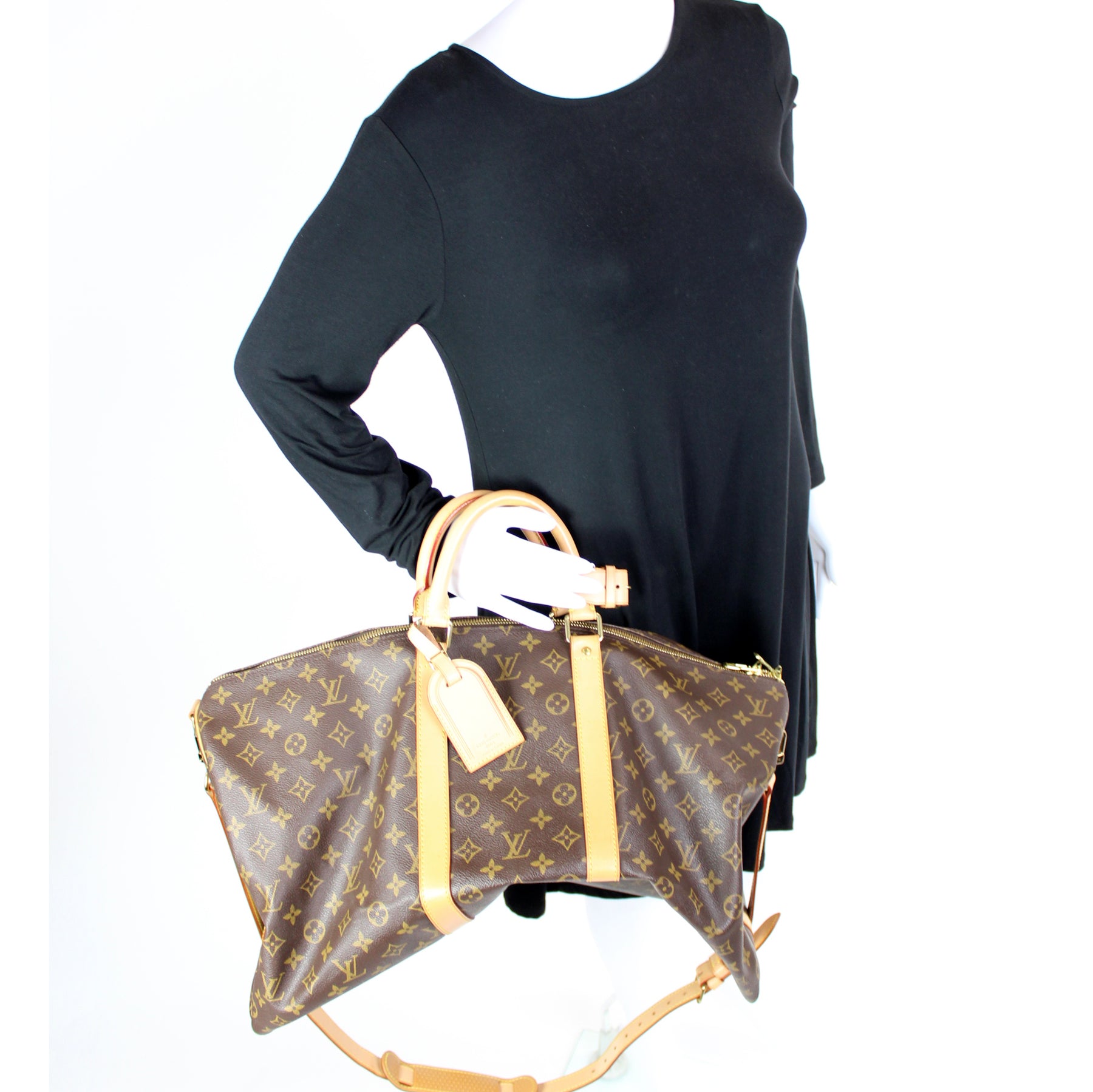 This pre-owned Louis Vuitton Keepall 55 Bandouliere is guaranteed 100% authentic. The exterior is in the classic Louis Vuitton Monogram coated canvas.