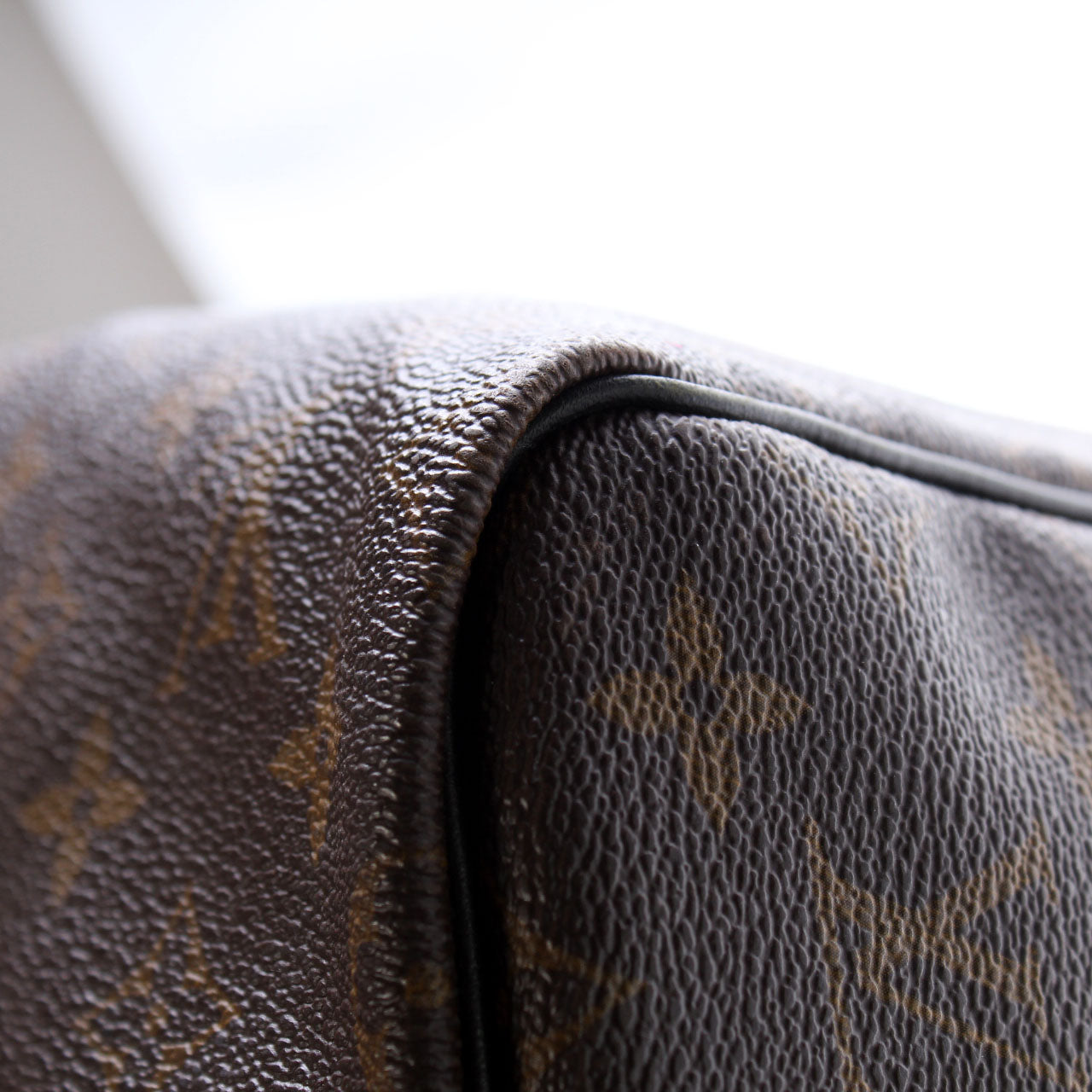 This pre-owned Louis Vuitton Keepall 55 Macassar is guaranteed 100% authentic. The exterior is in the classic Louis Vuitton Monogram coated canvas.