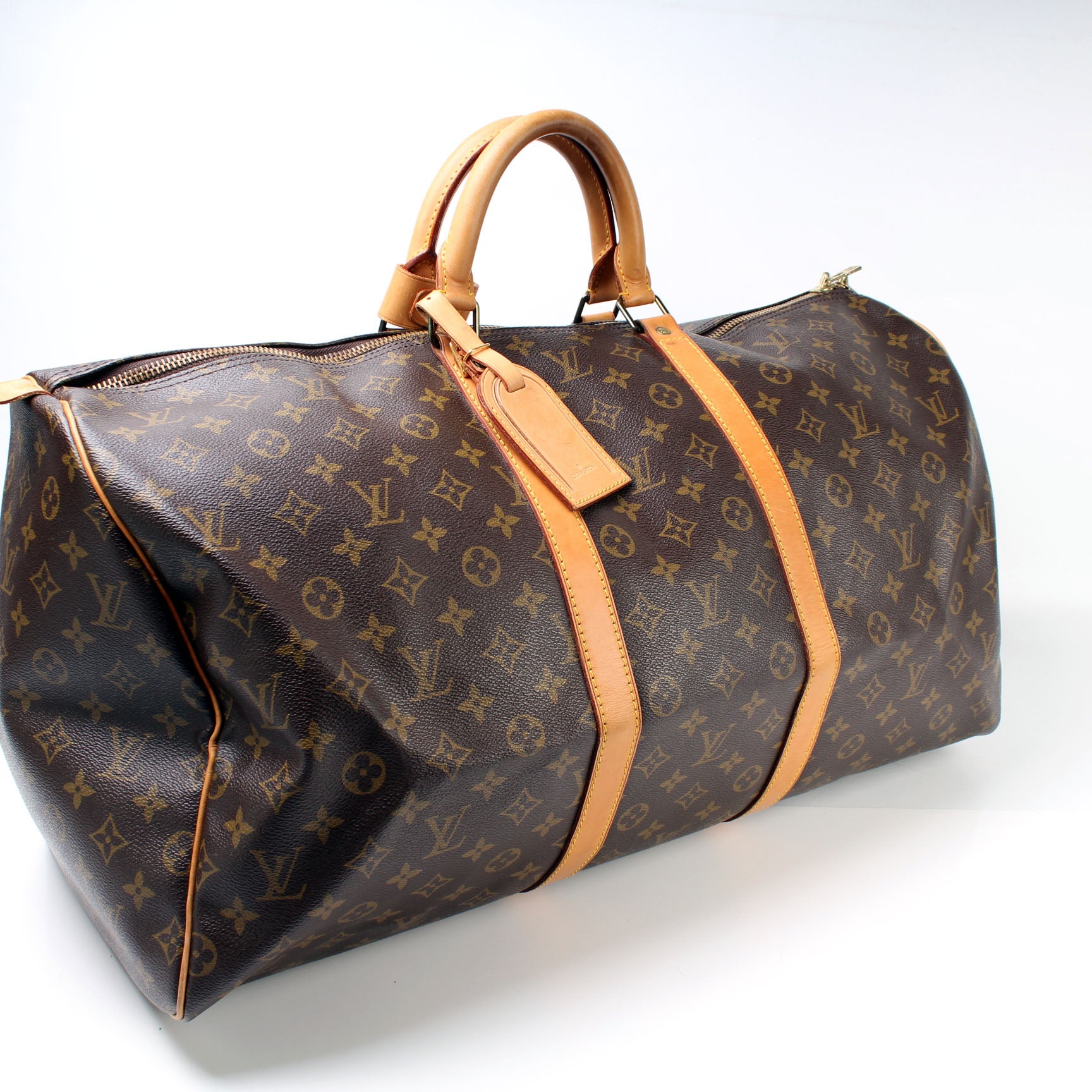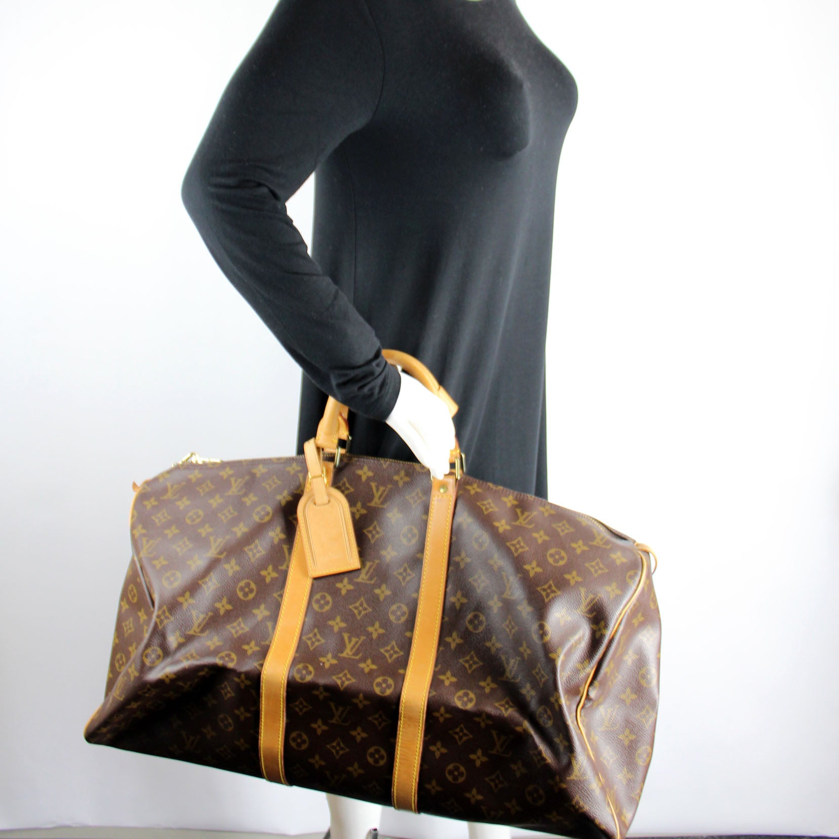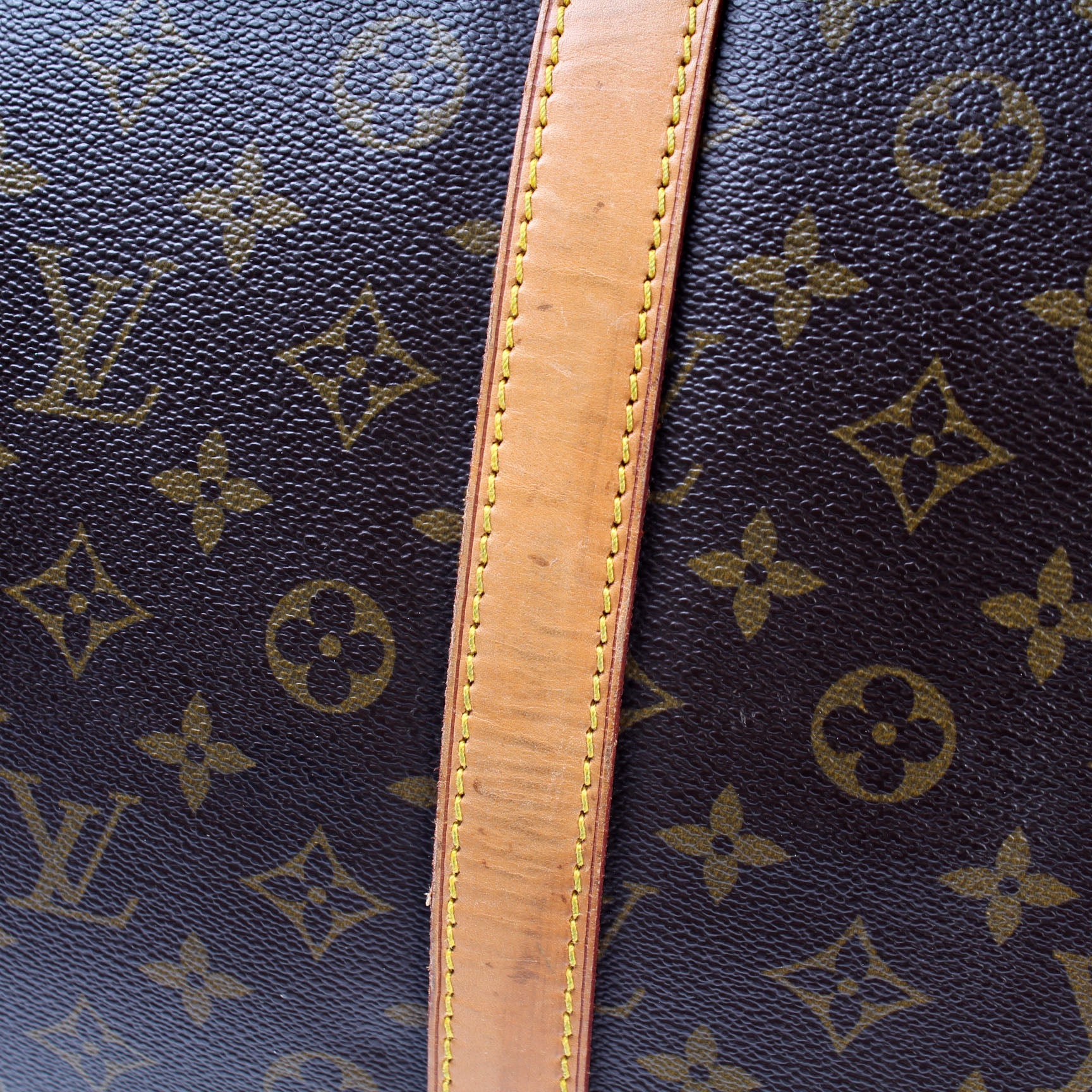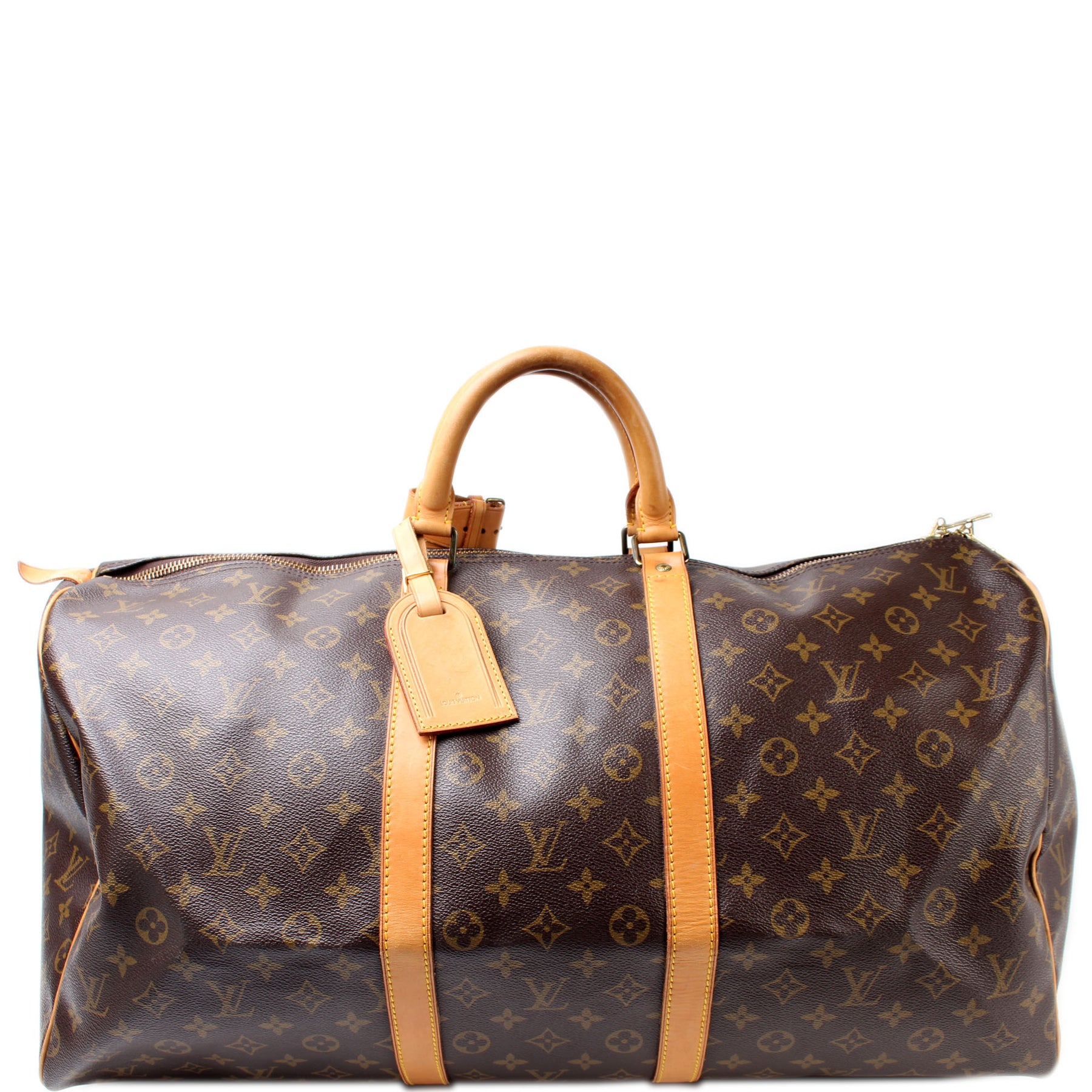 This pre-owned Louis Vuitton Keepall 55 is guaranteed 100% authentic. The exterior is in the classic Louis Vuitton Monogram coated canvas.