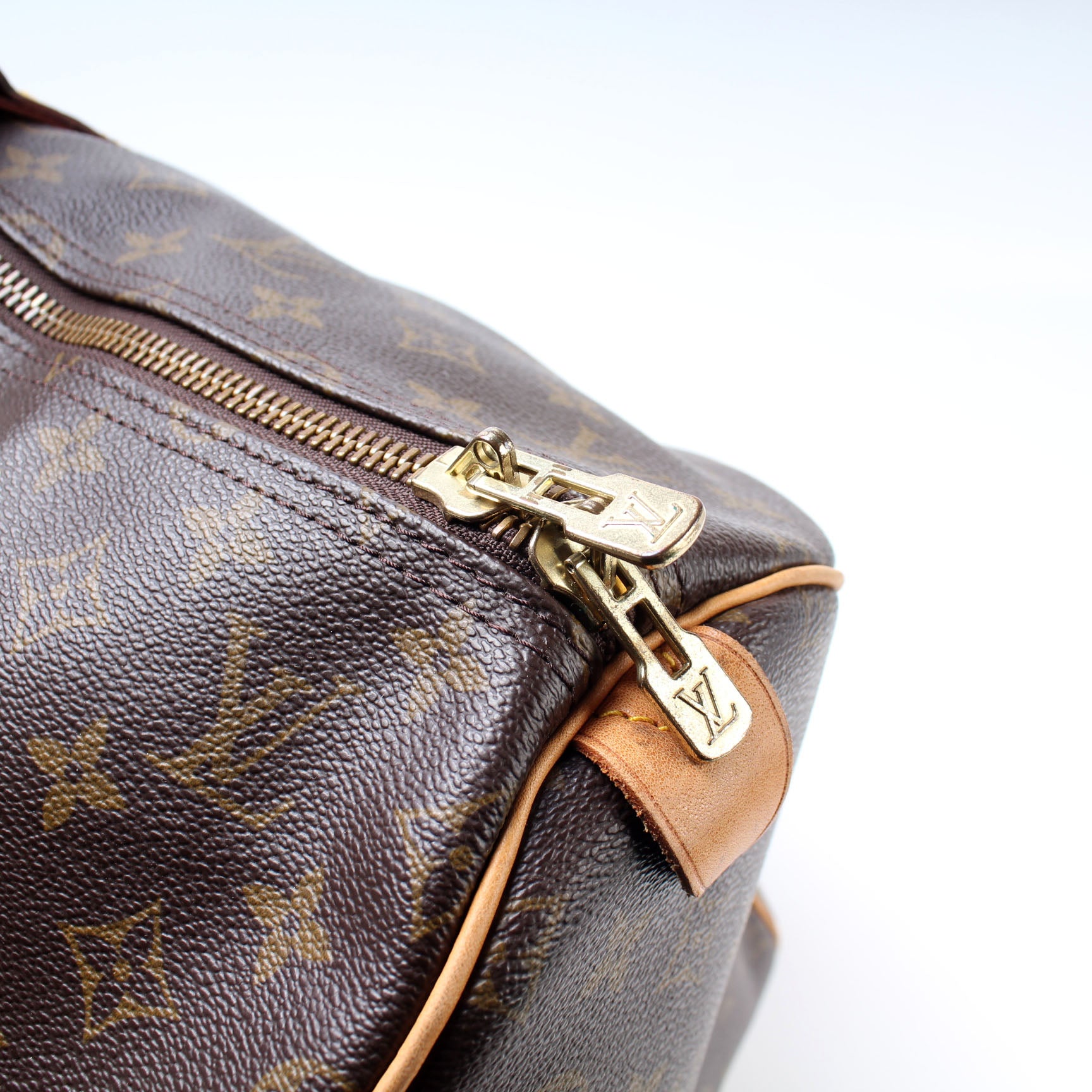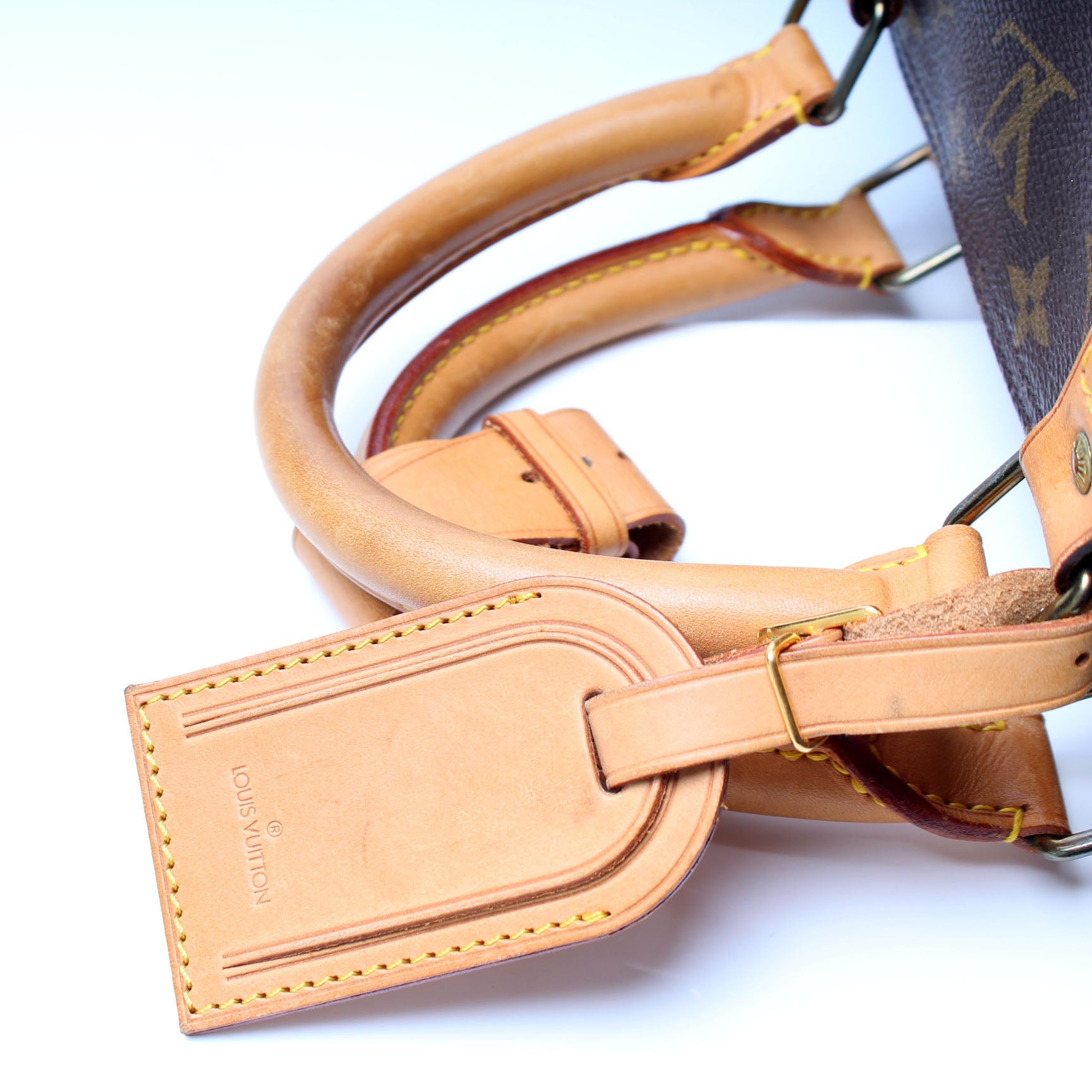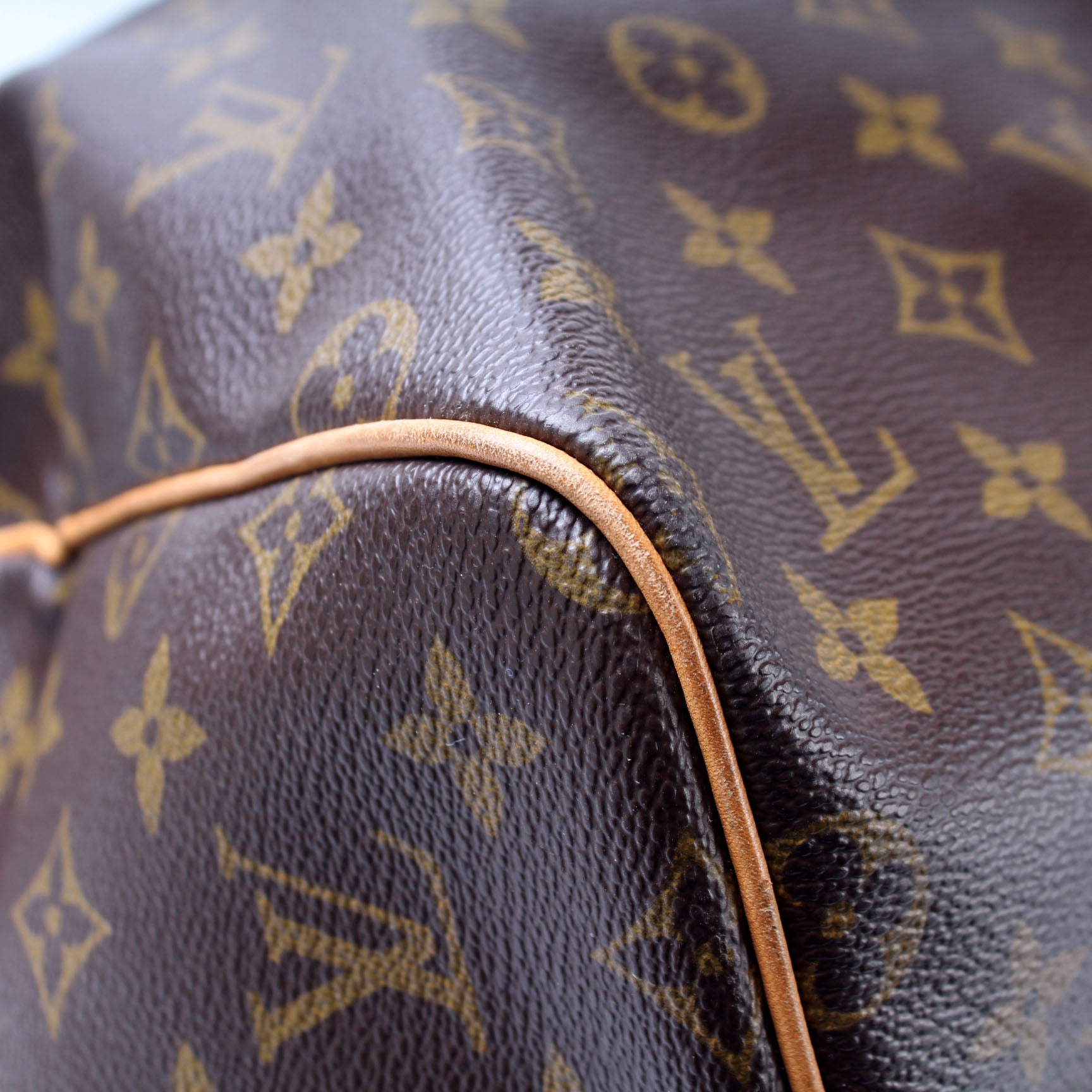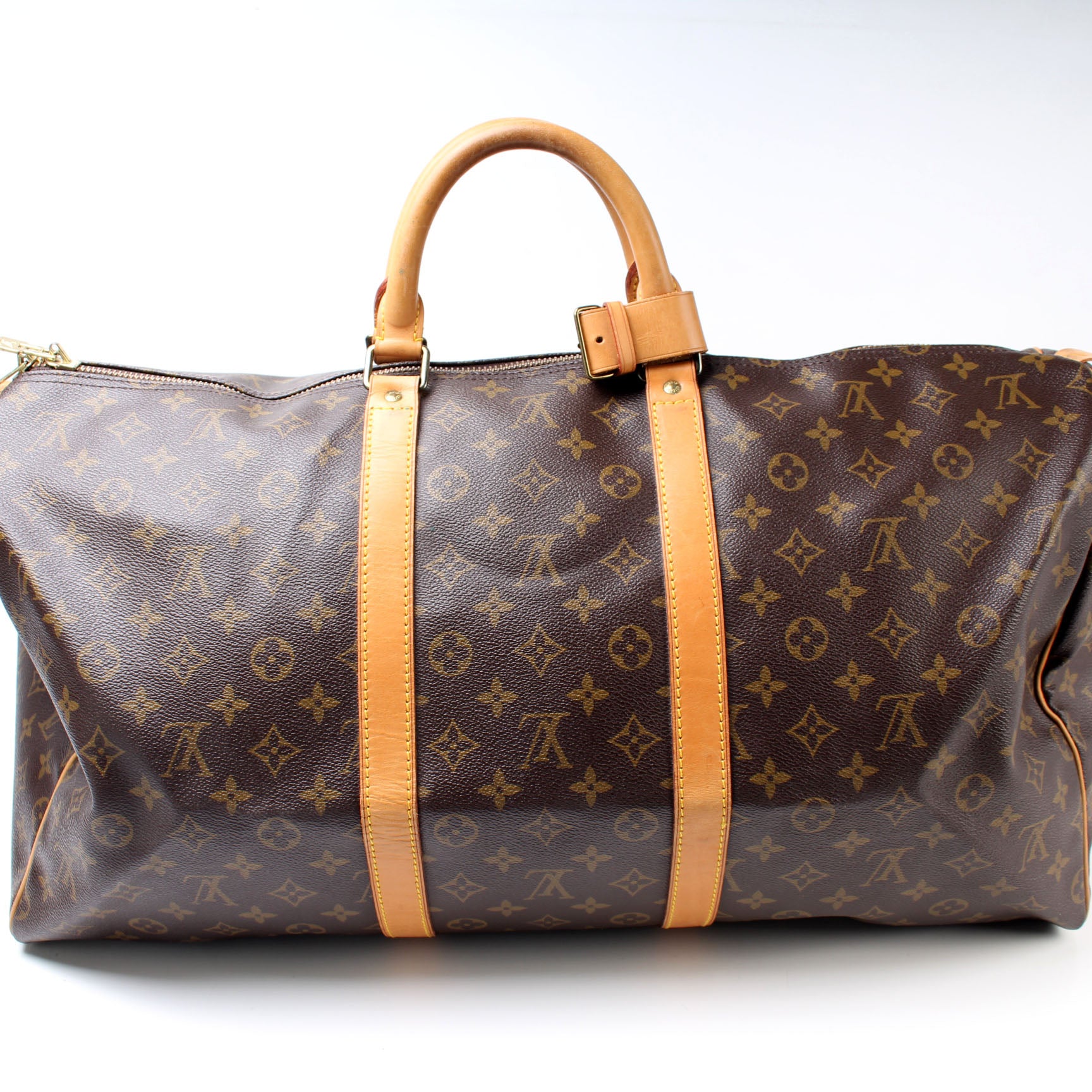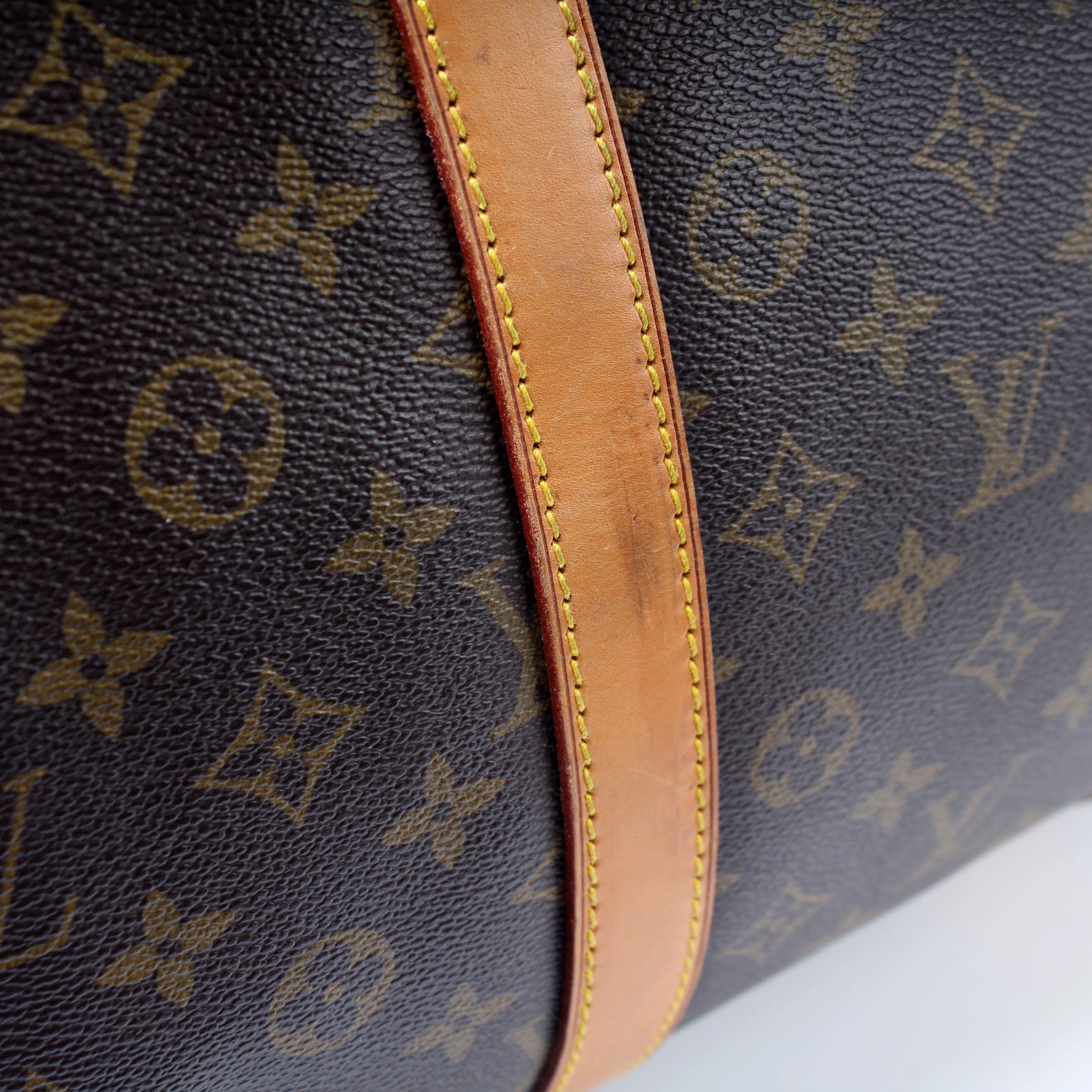 This pre-owned Louis Vuitton Keepall 55 is guaranteed 100% authentic. The exterior is in the classic Louis Vuitton Monogram coated canvas.
