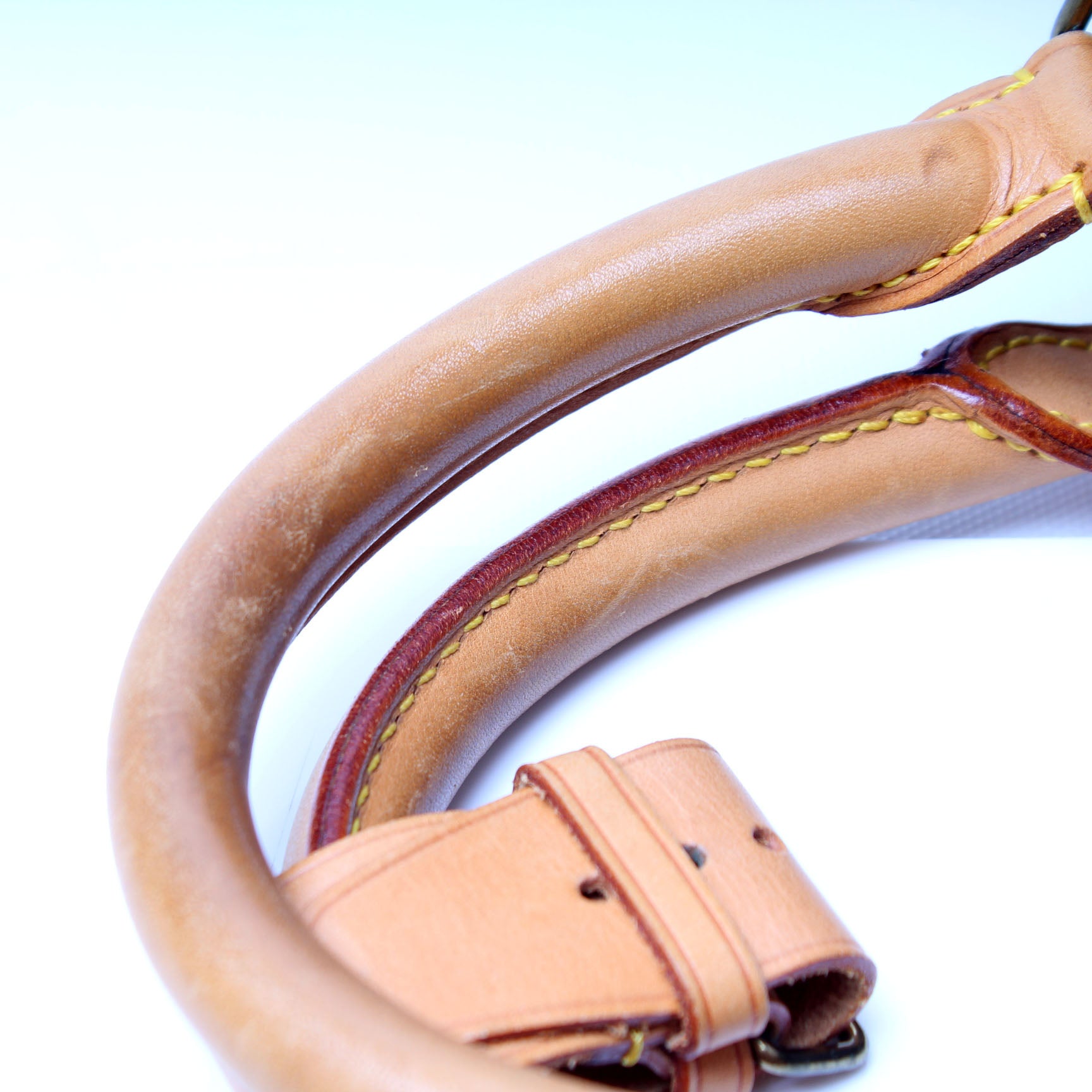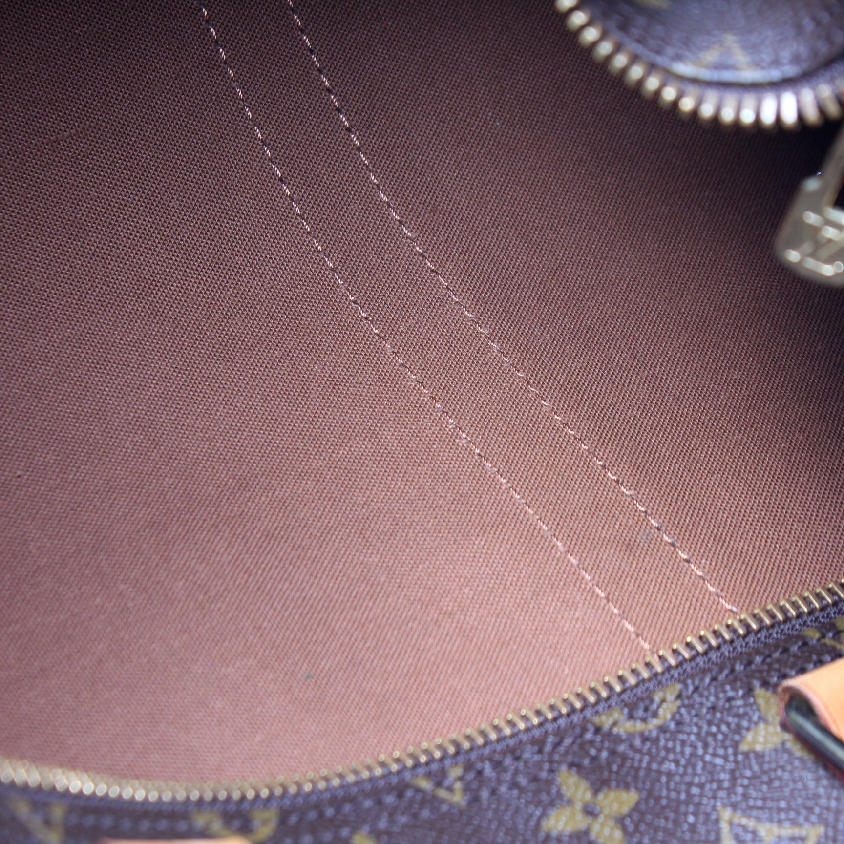 Exterior: The exterior Monogram coated canvas is free of any rips or cracks. The corners and leather details show minor wear and water stains.