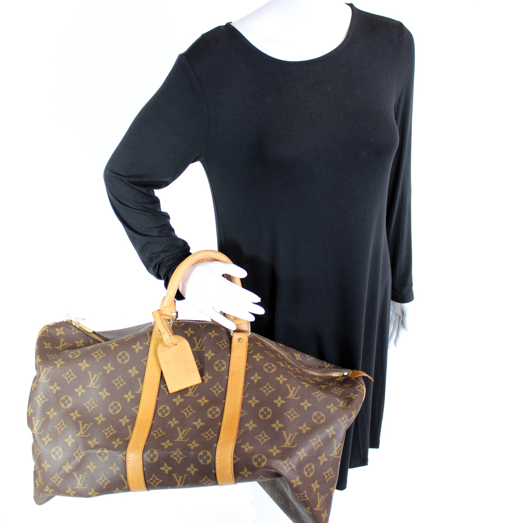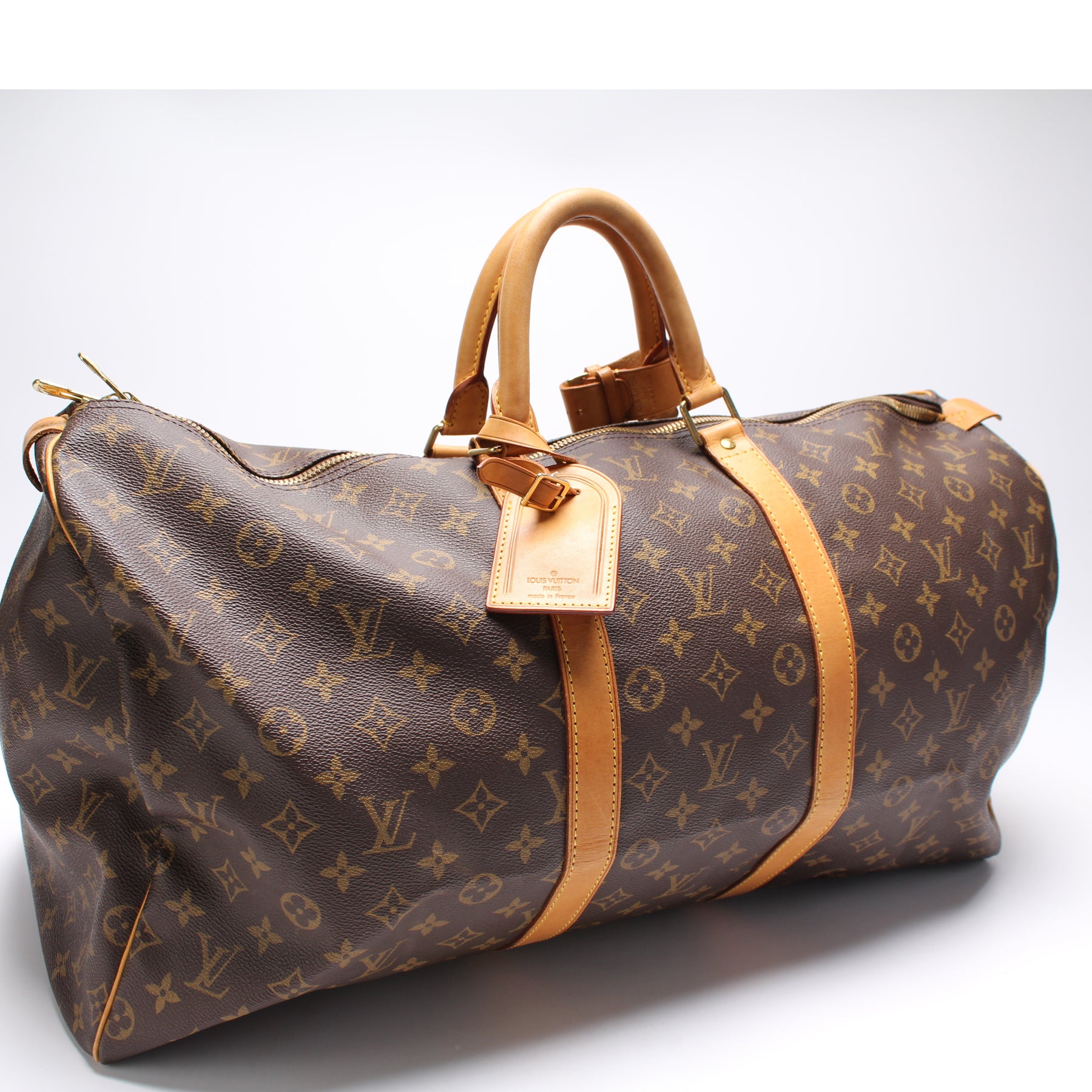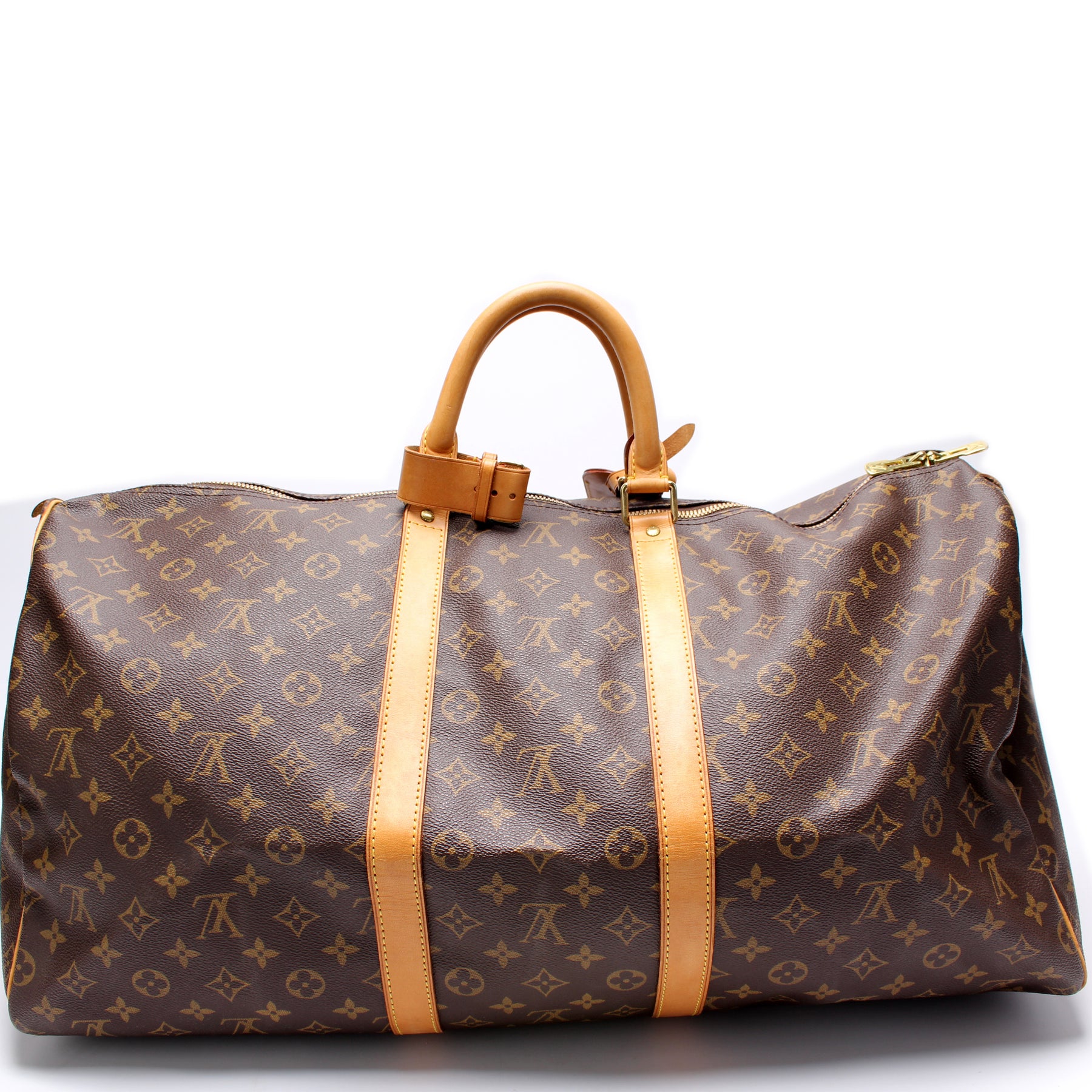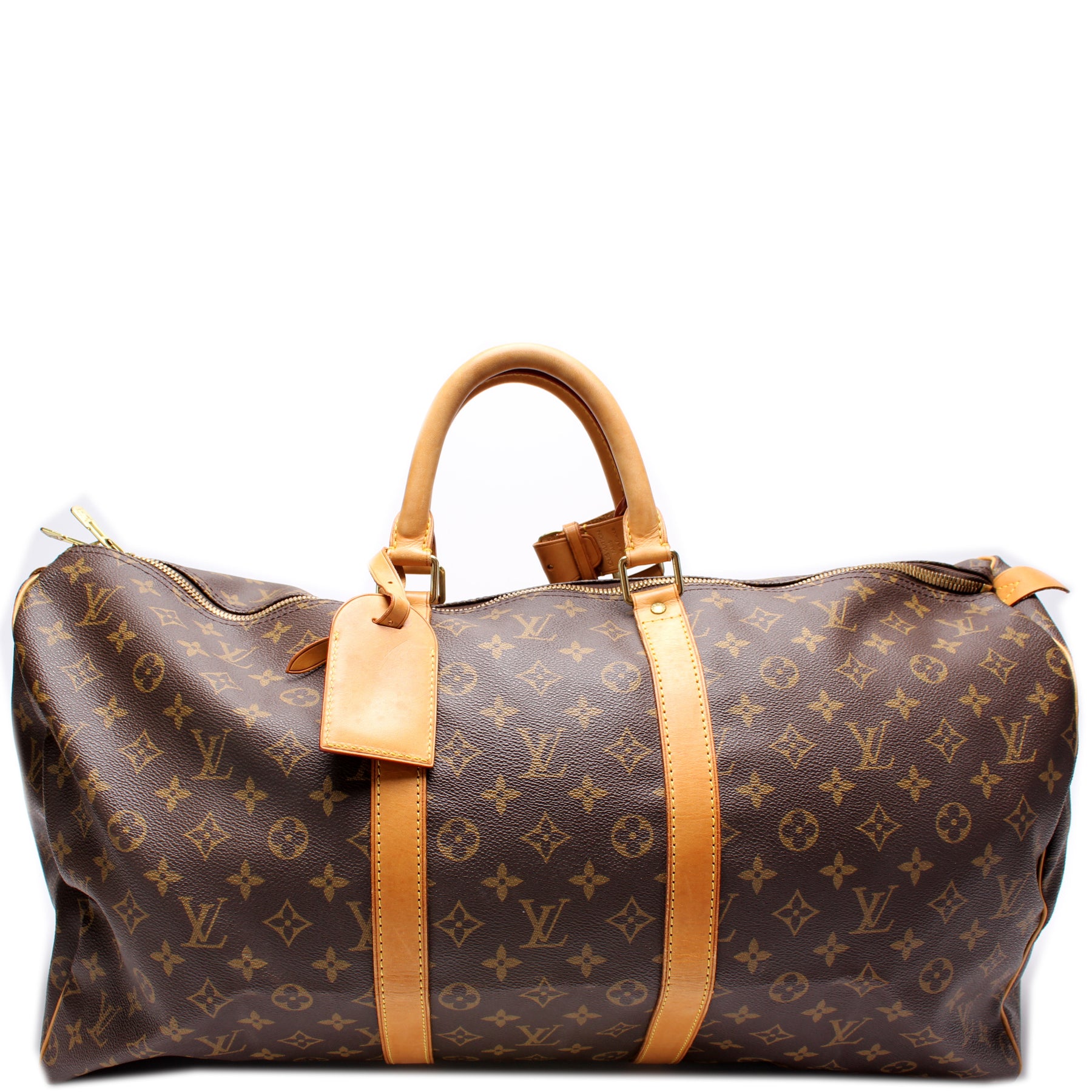 This pre-owned Louis Vuitton Keepall 55 is guaranteed 100% authentic. The exterior is in the classic Louis Vuitton Monogram coated canvas.
