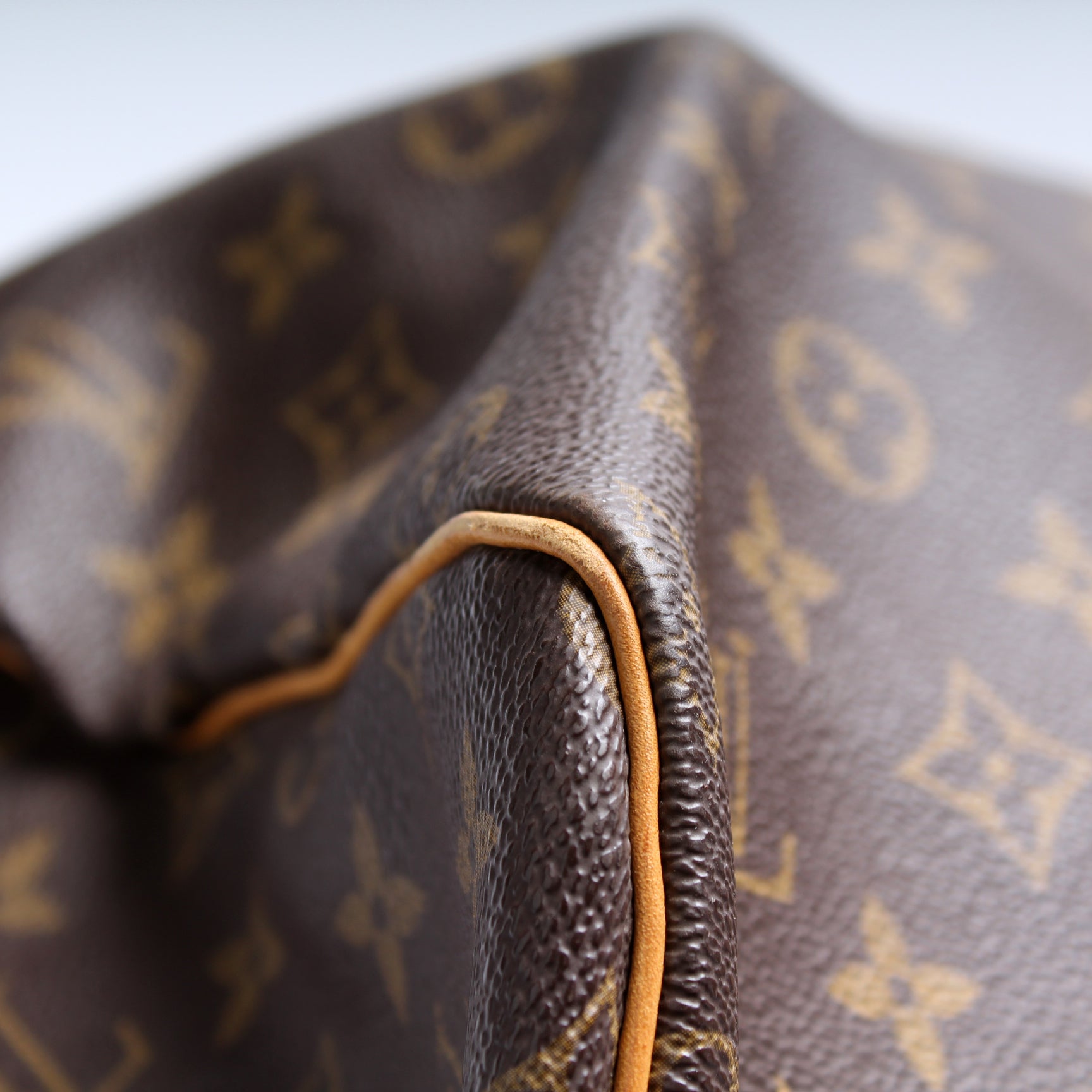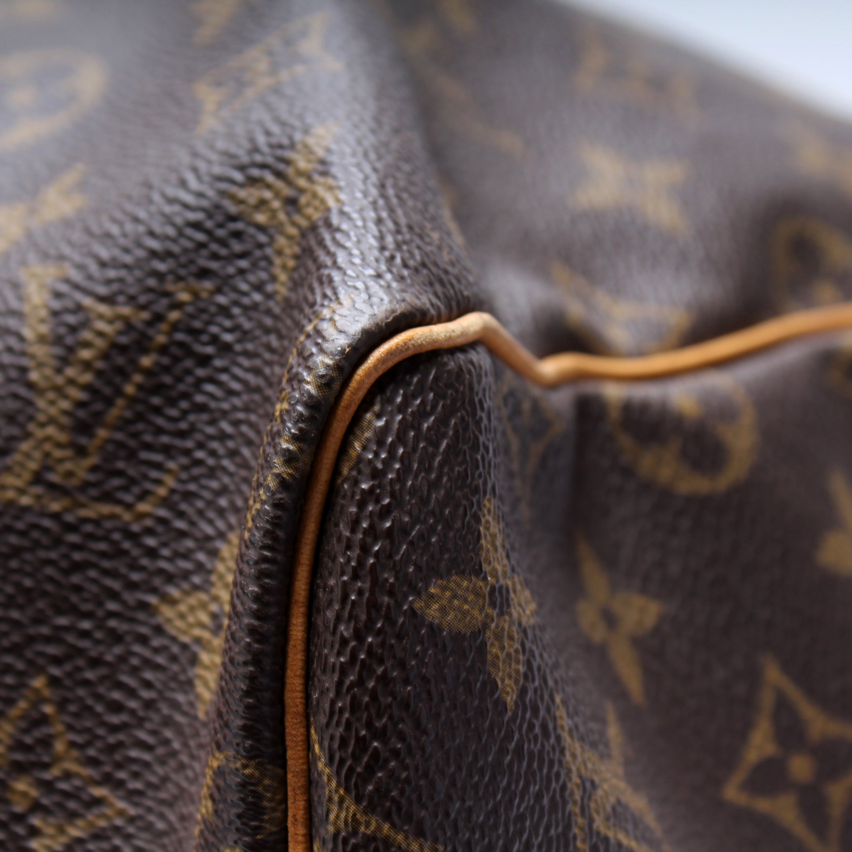 Exterior: The exterior Monogram coated canvas is free of any rips or cracks. The corners and leather details show wear and discoloration.