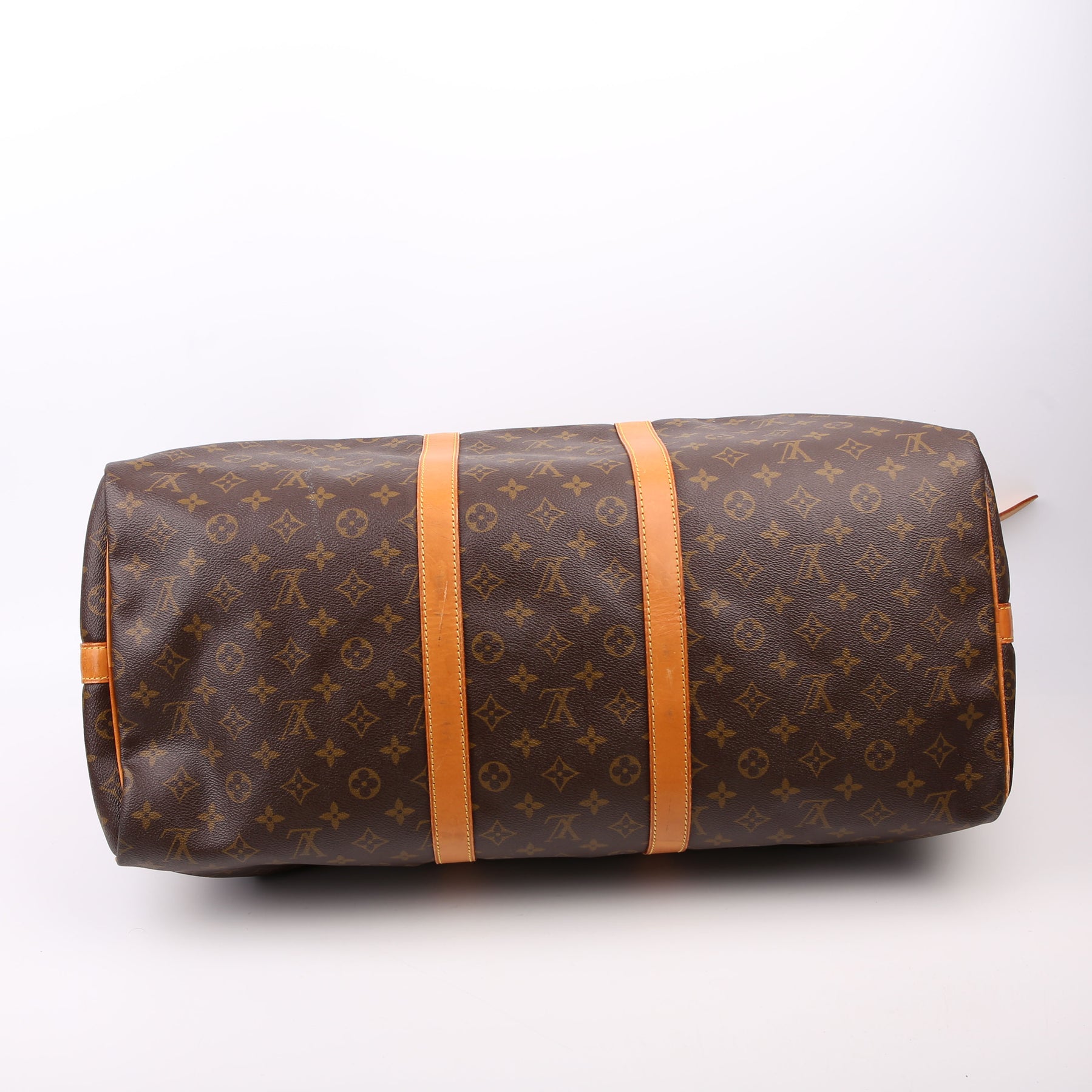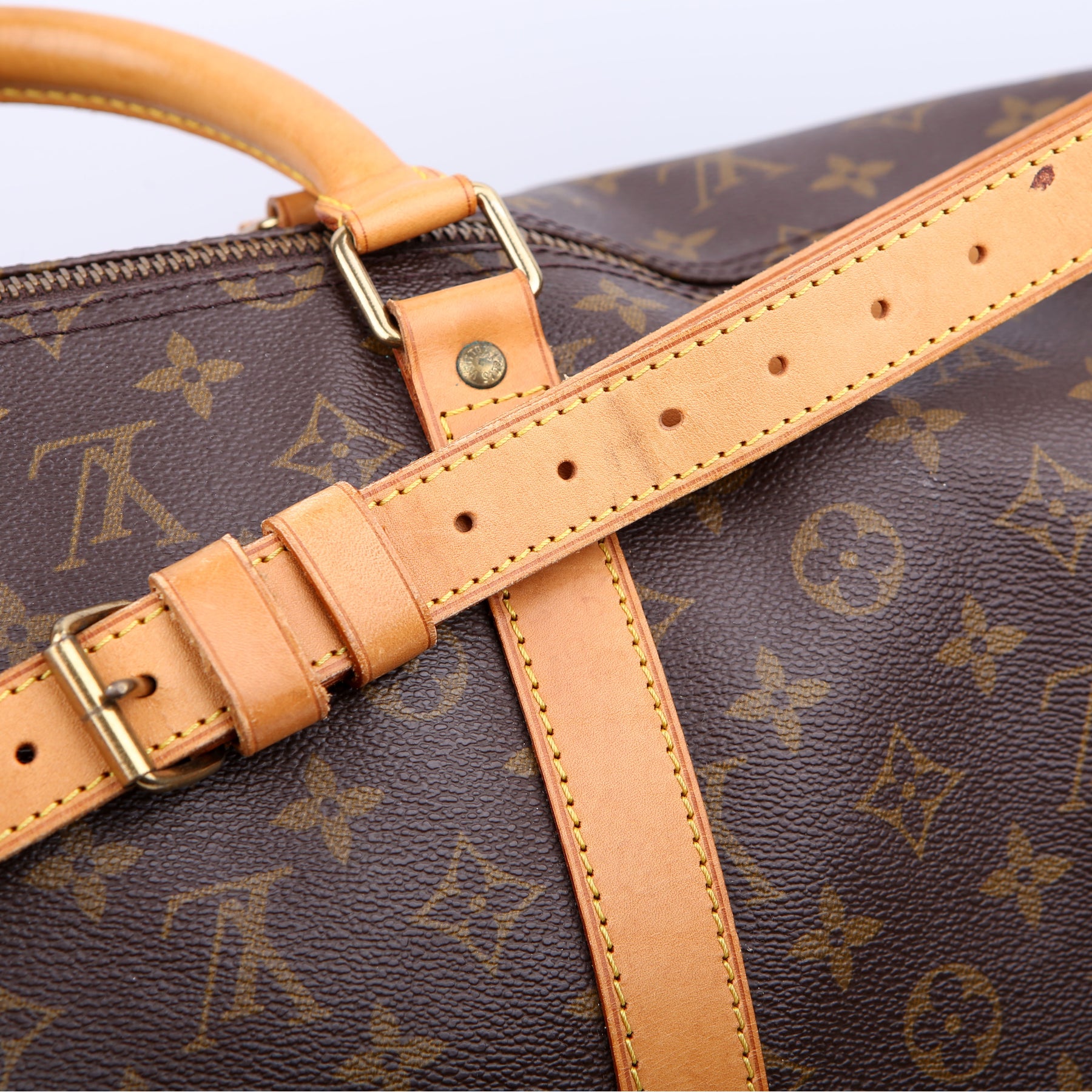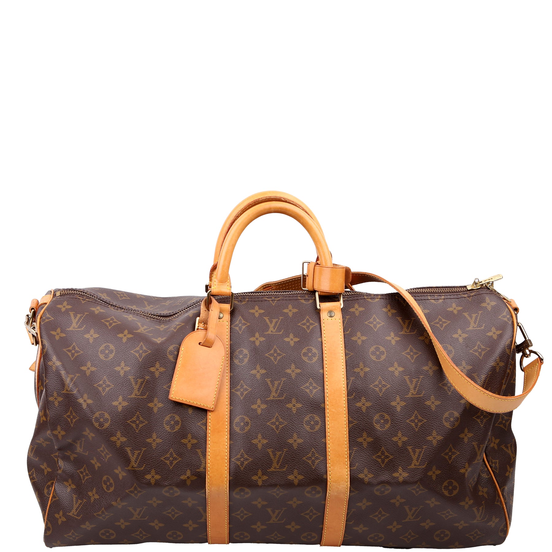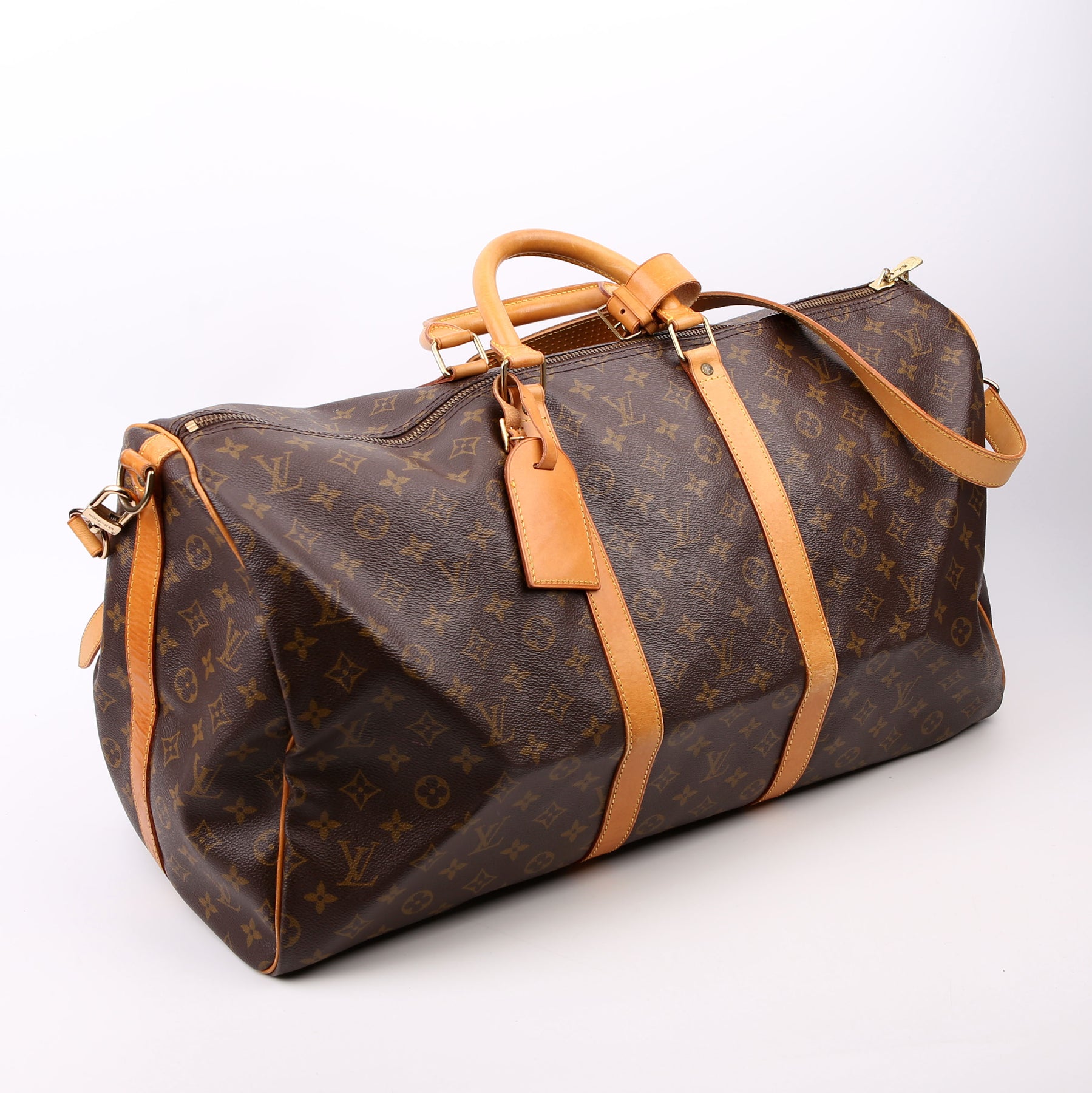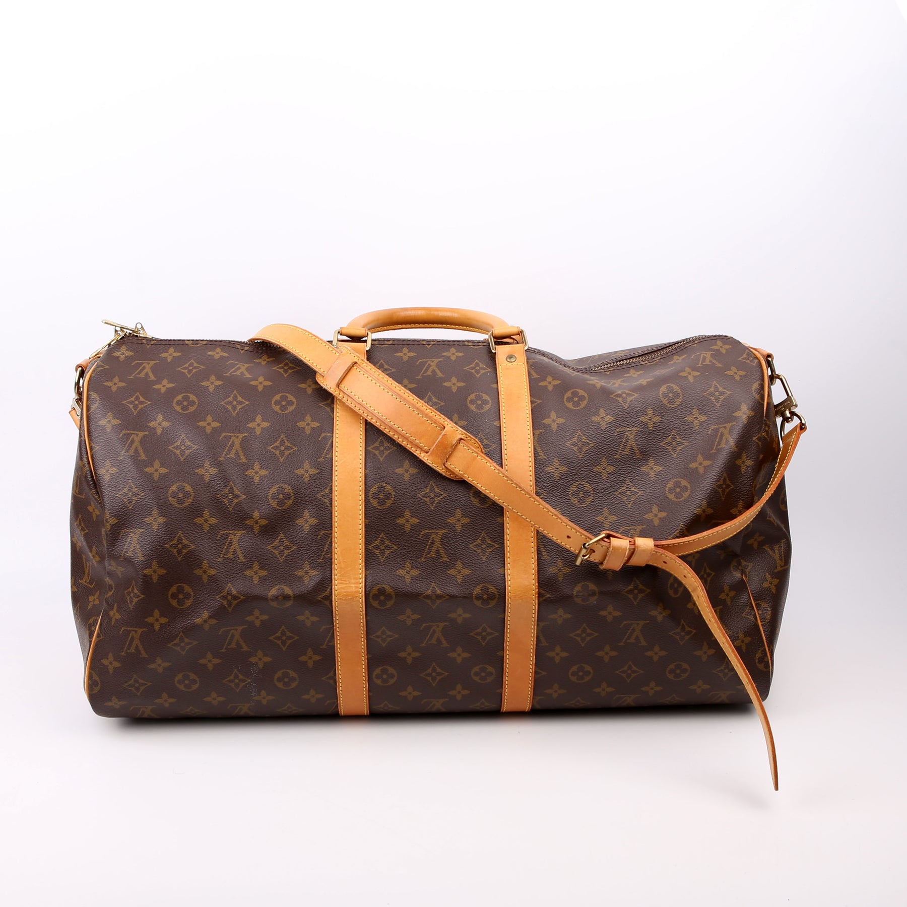 This pre-owned Louis Vuitton Keepall 55 Bandouliere is guaranteed 100% authentic. The exterior is in the classic Louis Vuitton Monogram coated canvas.