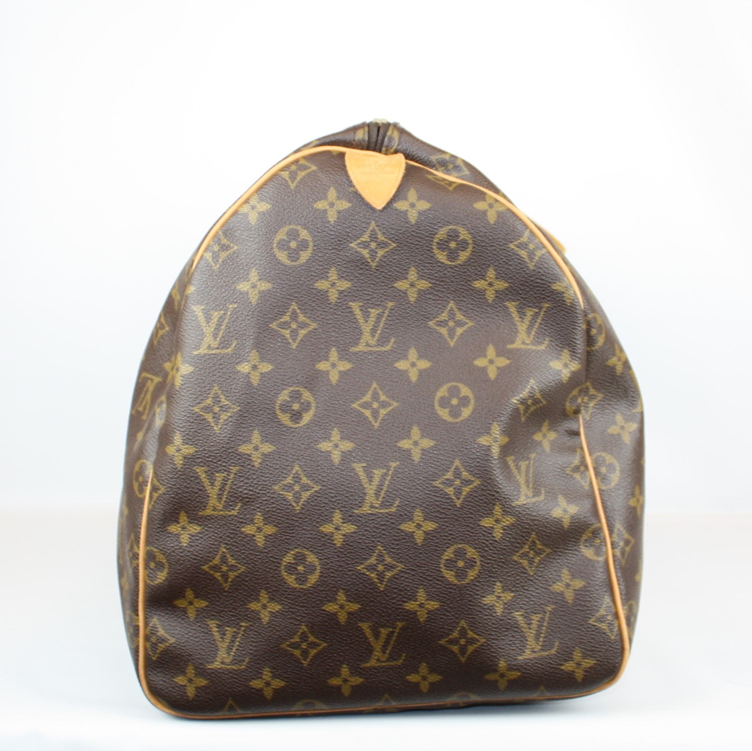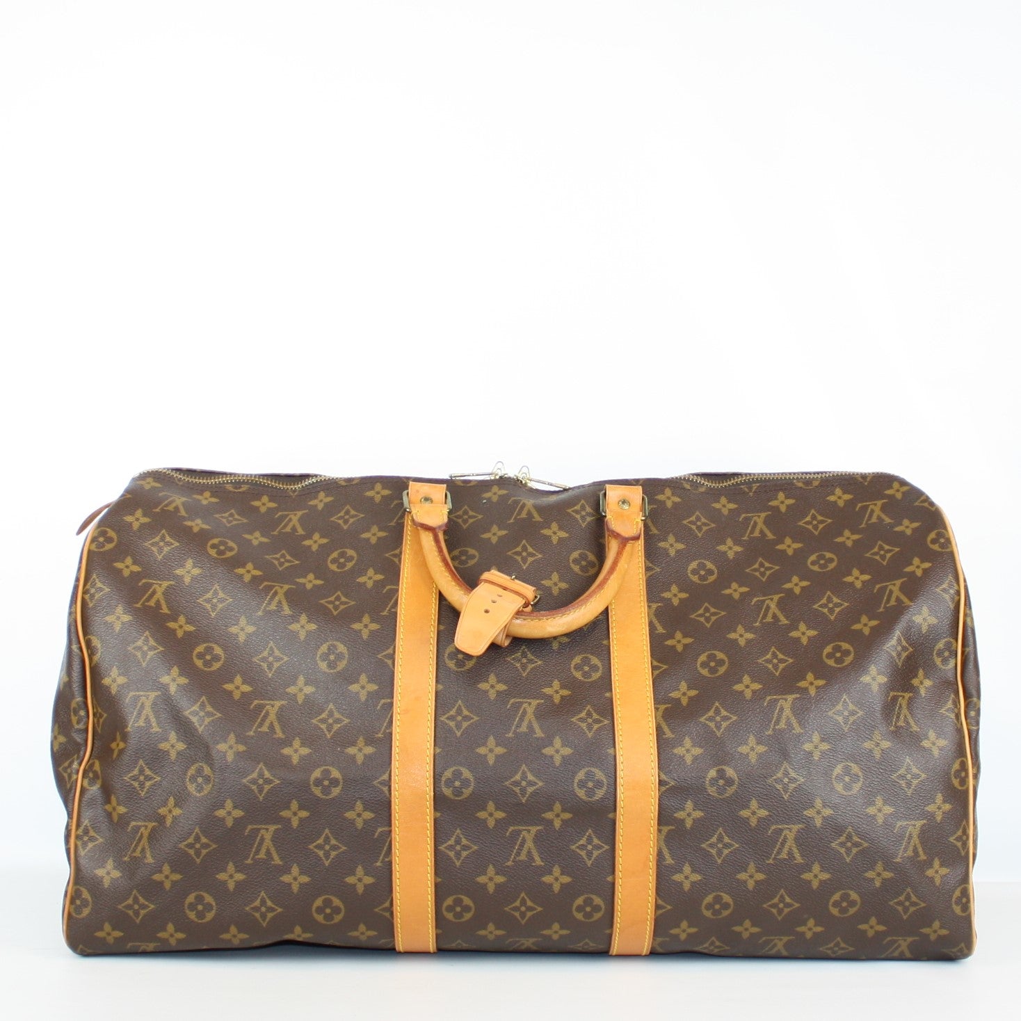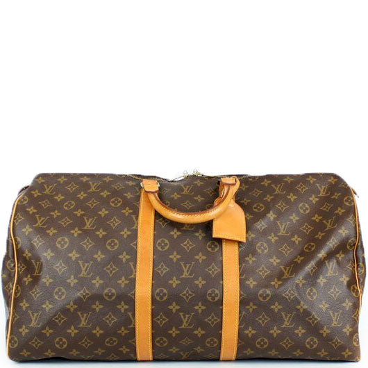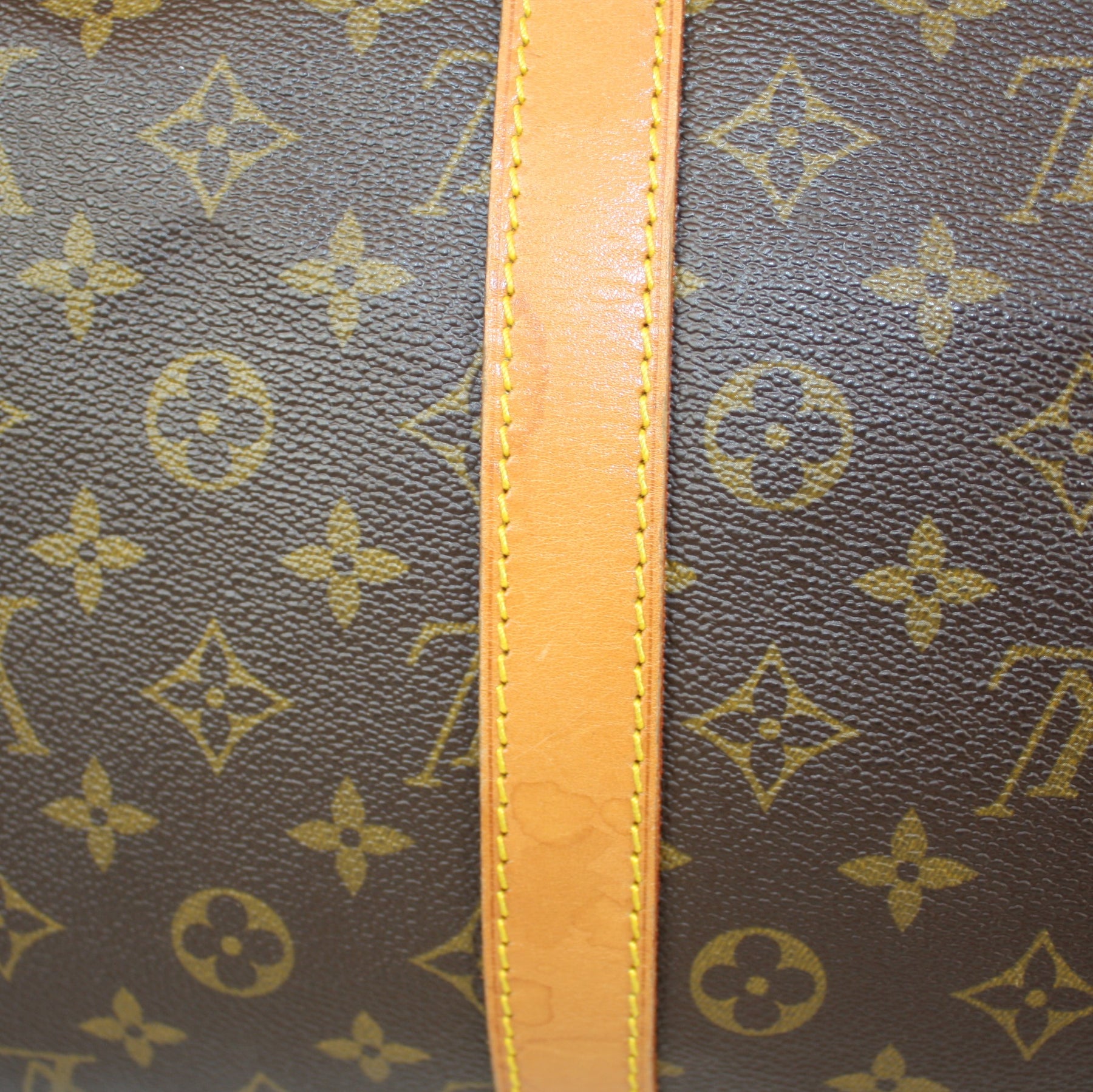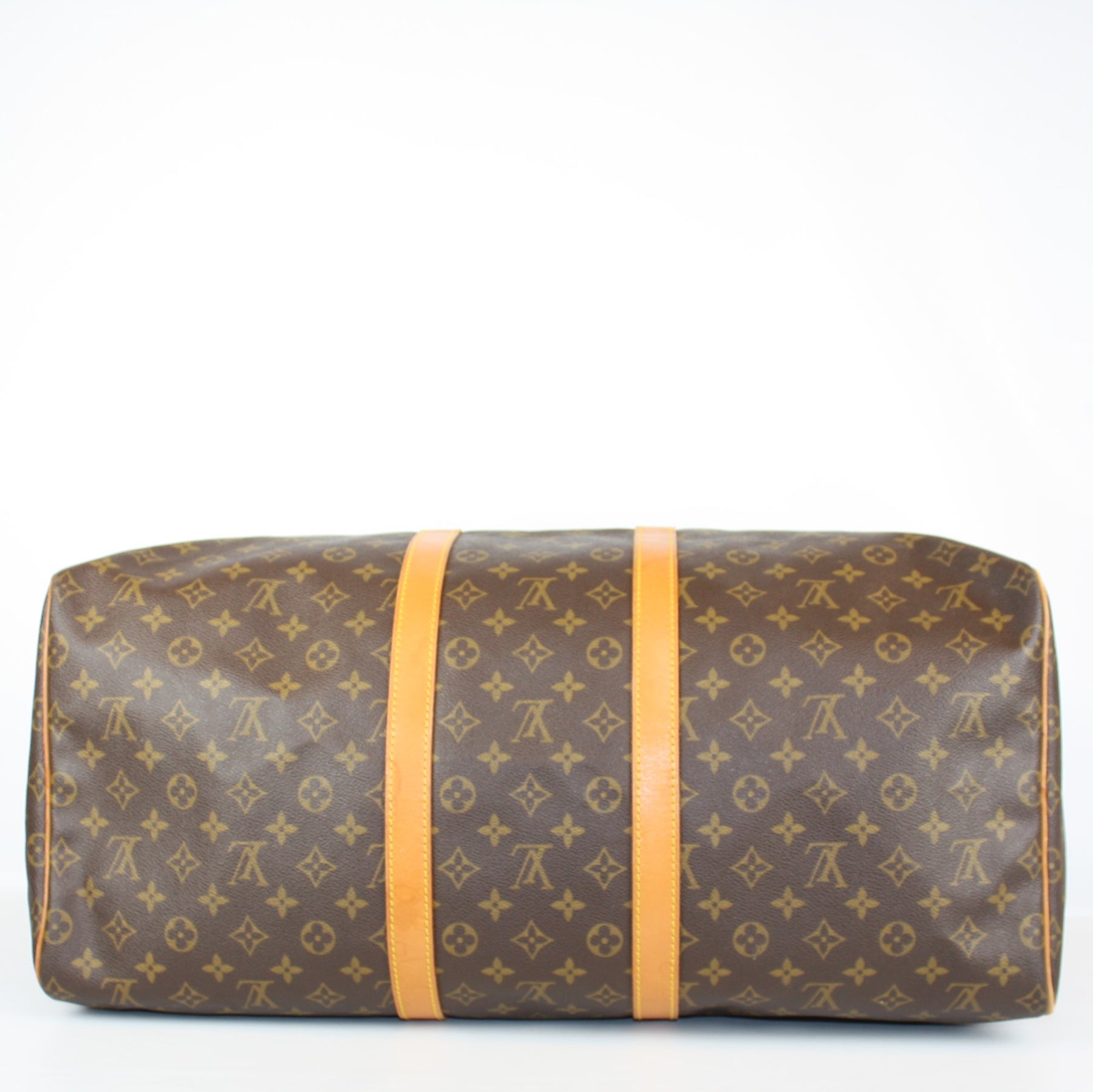 This pre-owned Louis Vuitton Keepall 55 is guaranteed 100% authentic. The exterior is in the classic Louis Vuitton Monogram coated canvas.