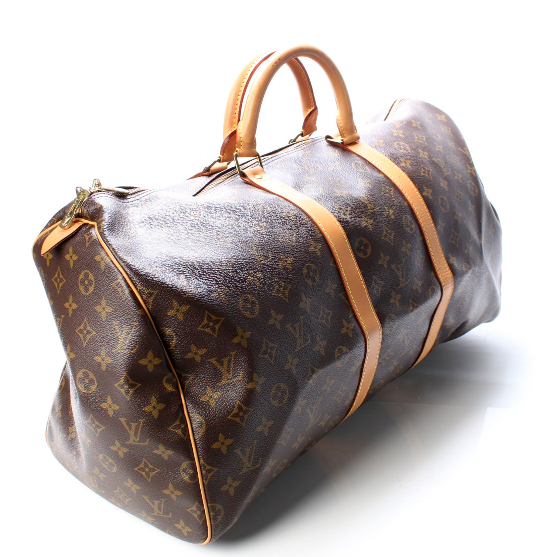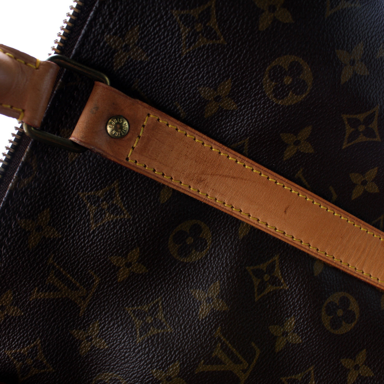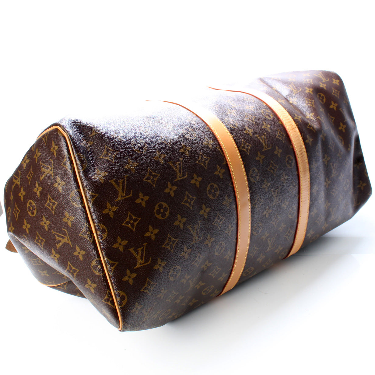 This pre-owned Louis Vuitton Keepall 55 is guaranteed 100% authentic. The exterior is in the classic Louis Vuitton Monogram coated canvas.