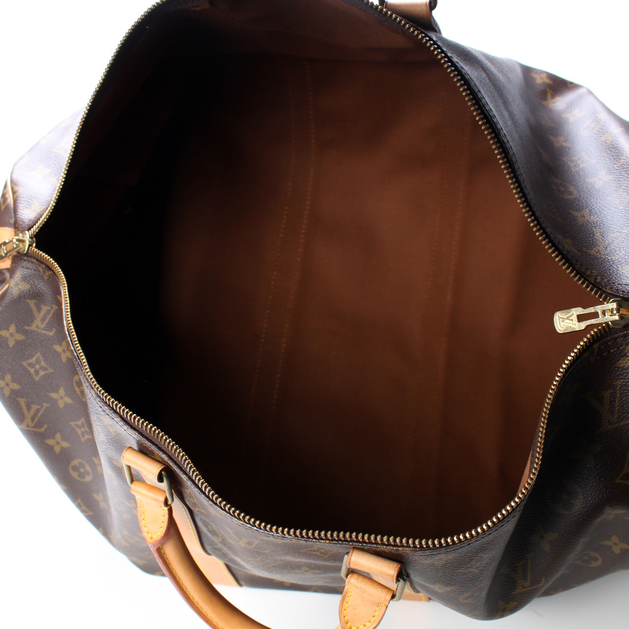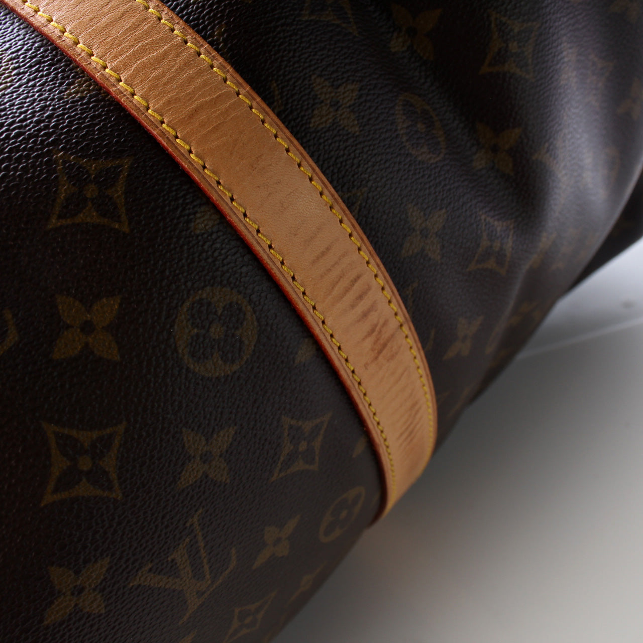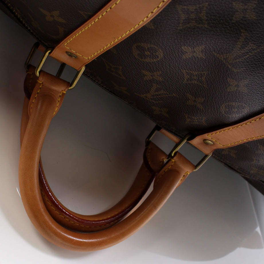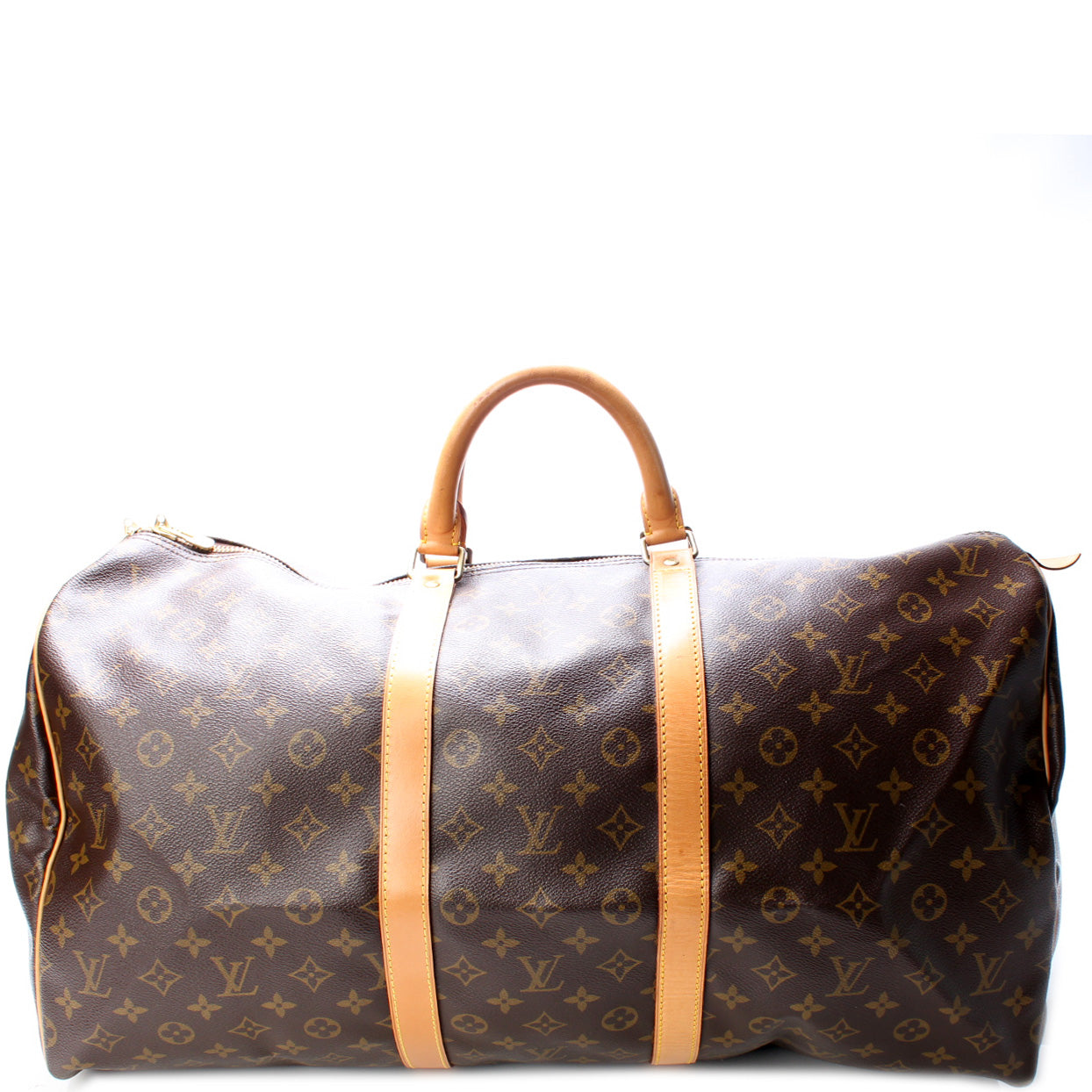 This pre-owned Louis Vuitton Keepall 55 is guaranteed 100% authentic. The exterior is in the classic Louis Vuitton Monogram coated canvas.