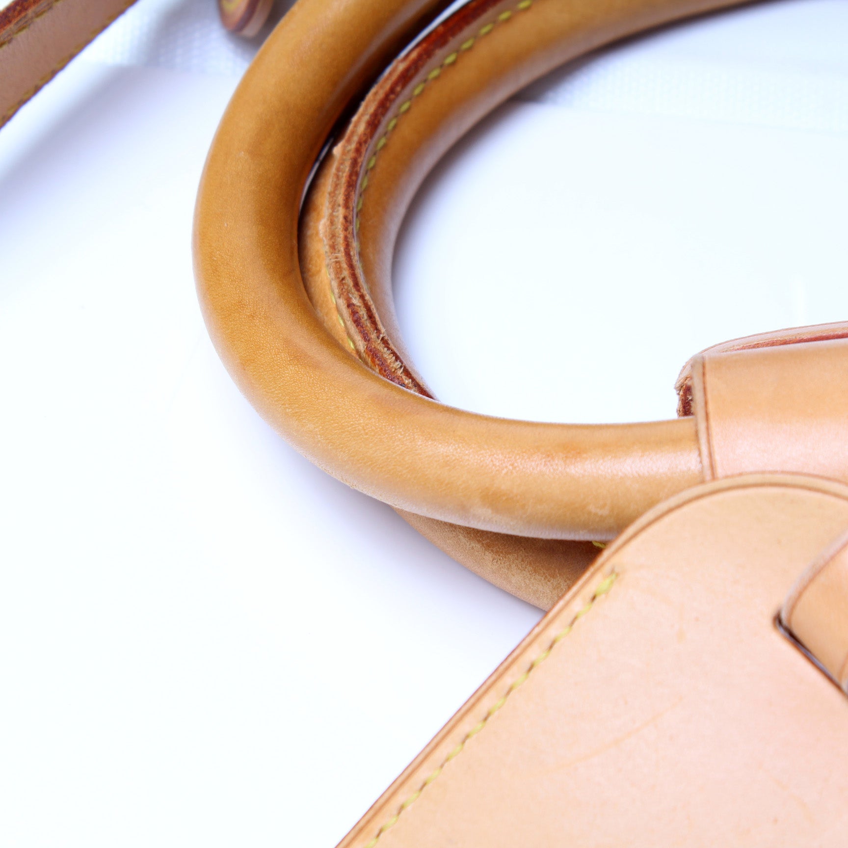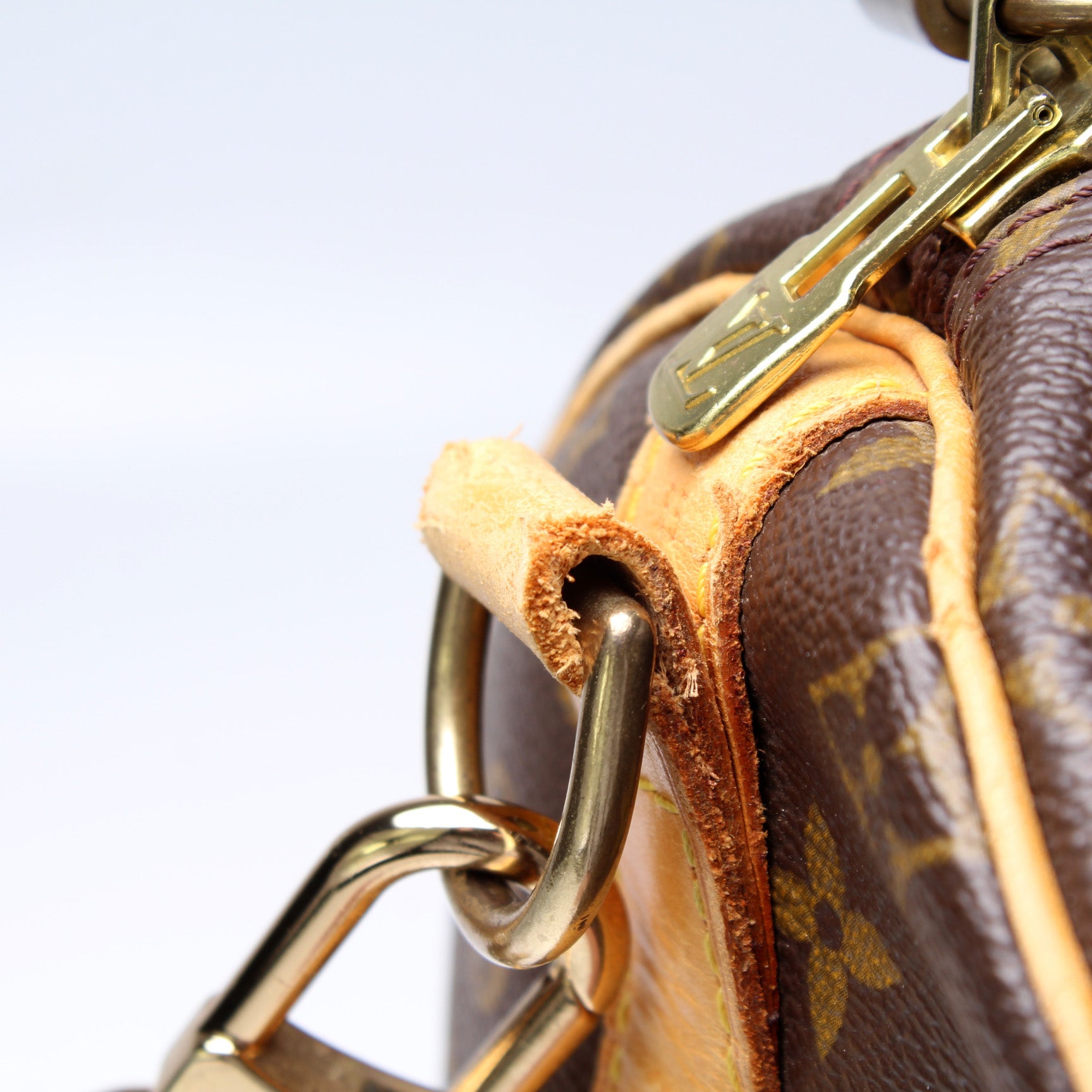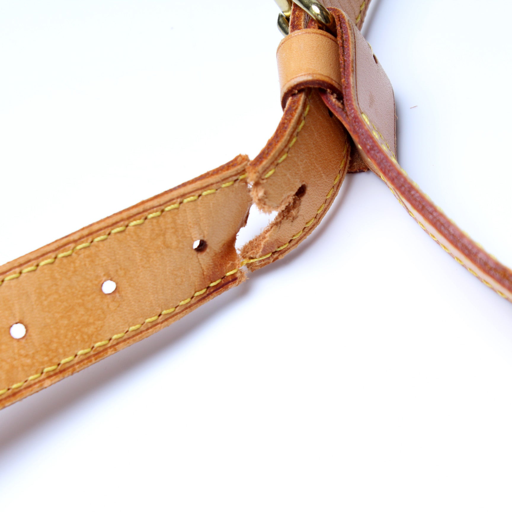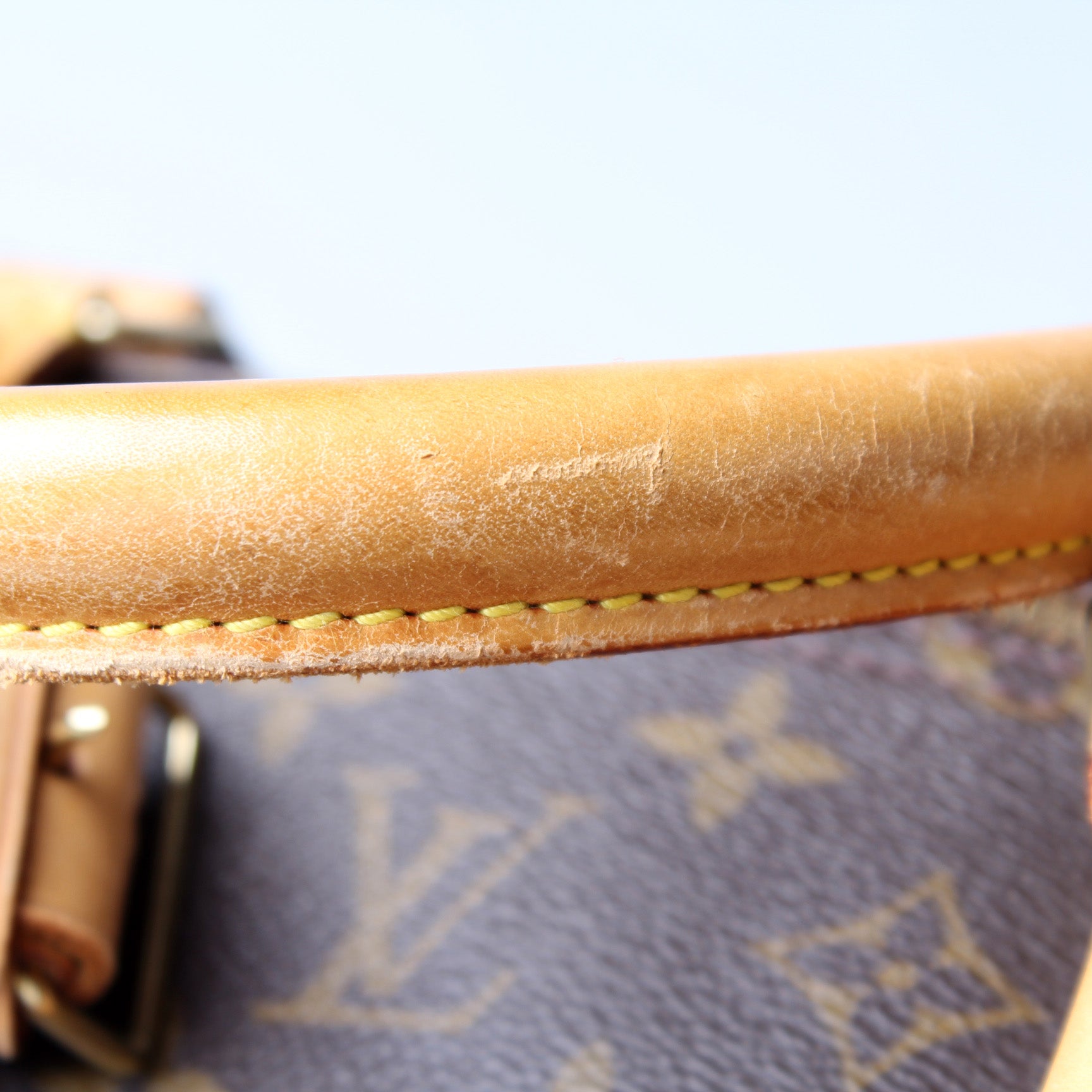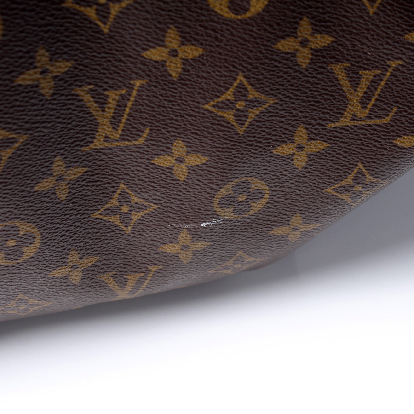 Exterior: The monogram canvas leather is free of rips or tears. The corners show signs of wear as pictured. There are a few cracks throughout the leather detail. The exterior leather has some discoloration and water marks as pictured.