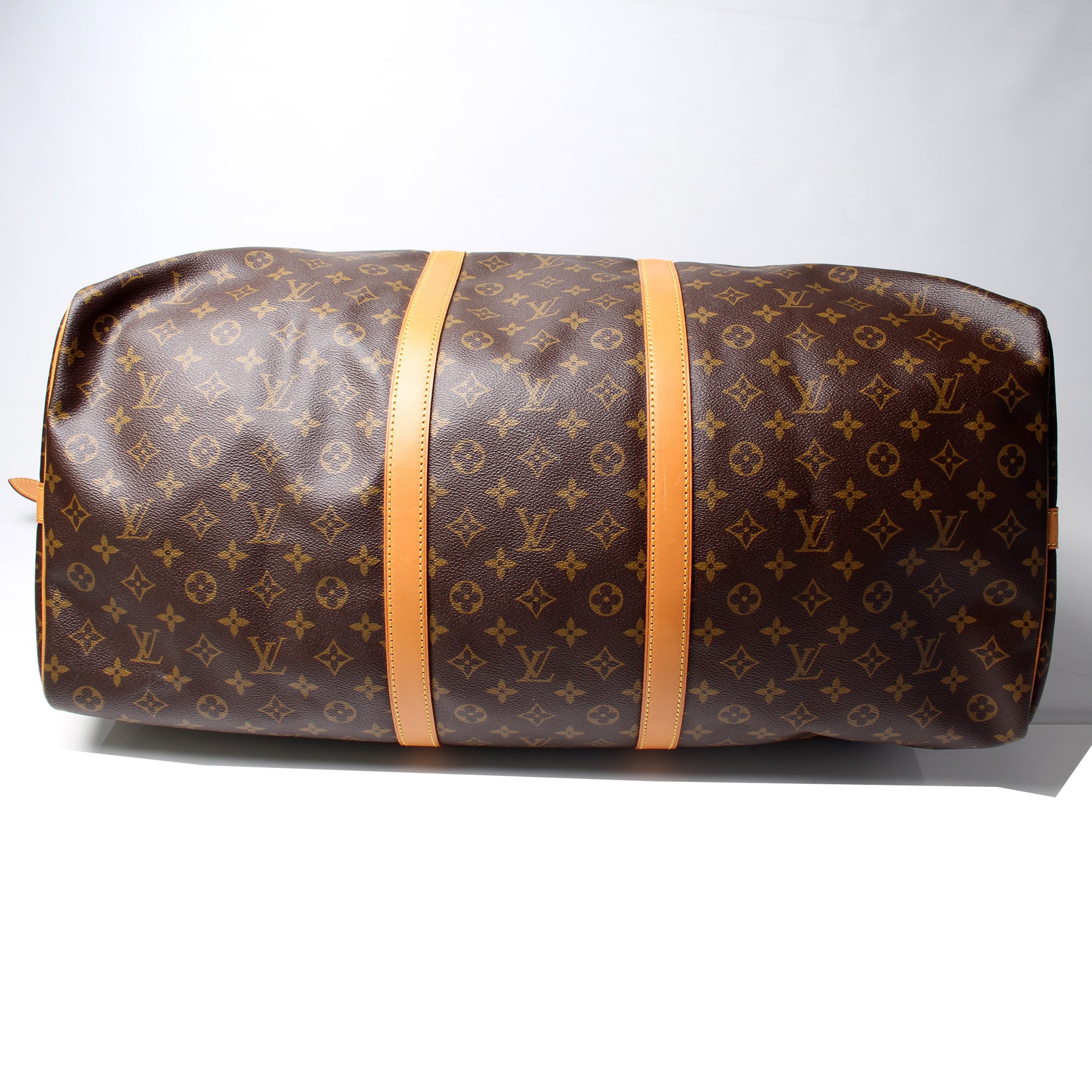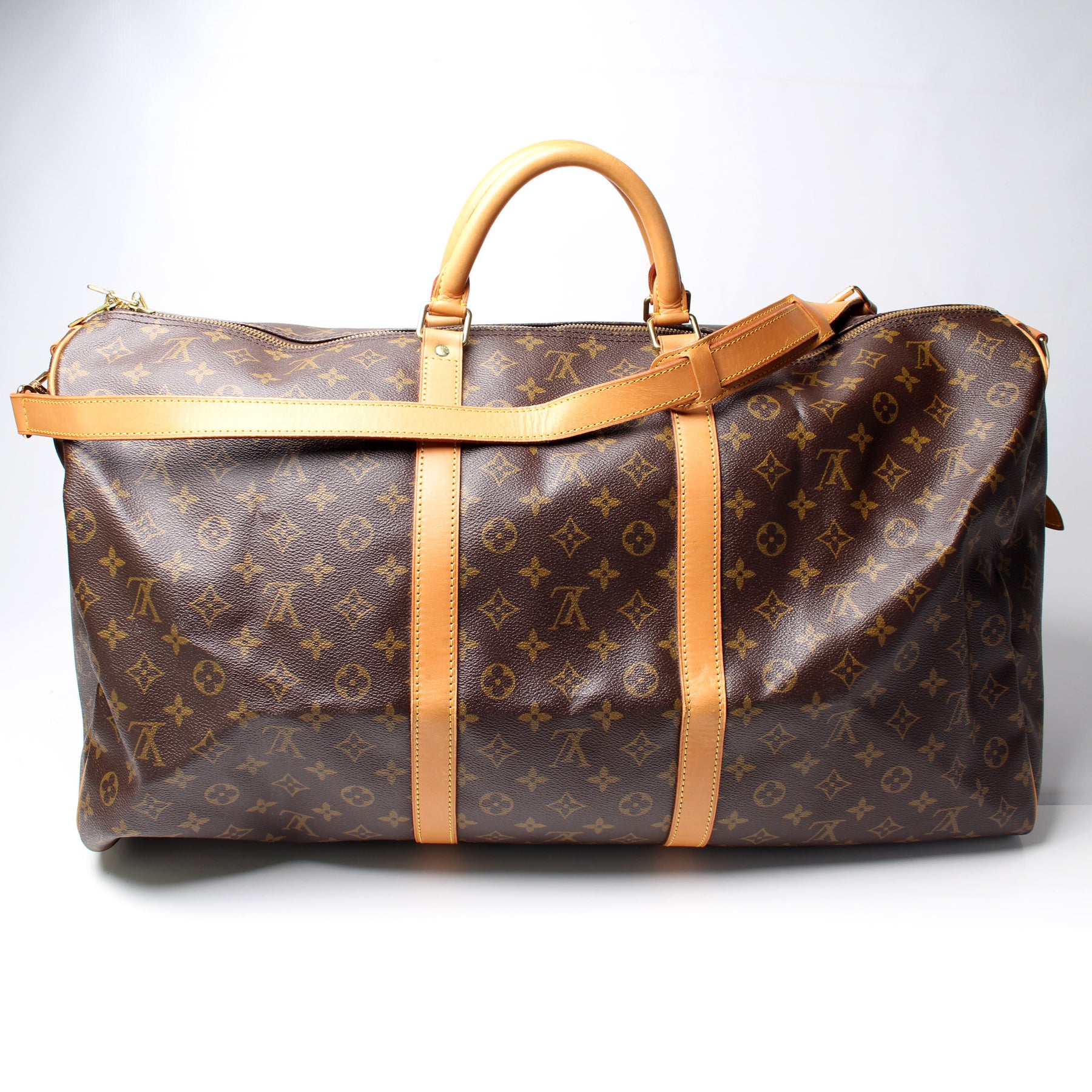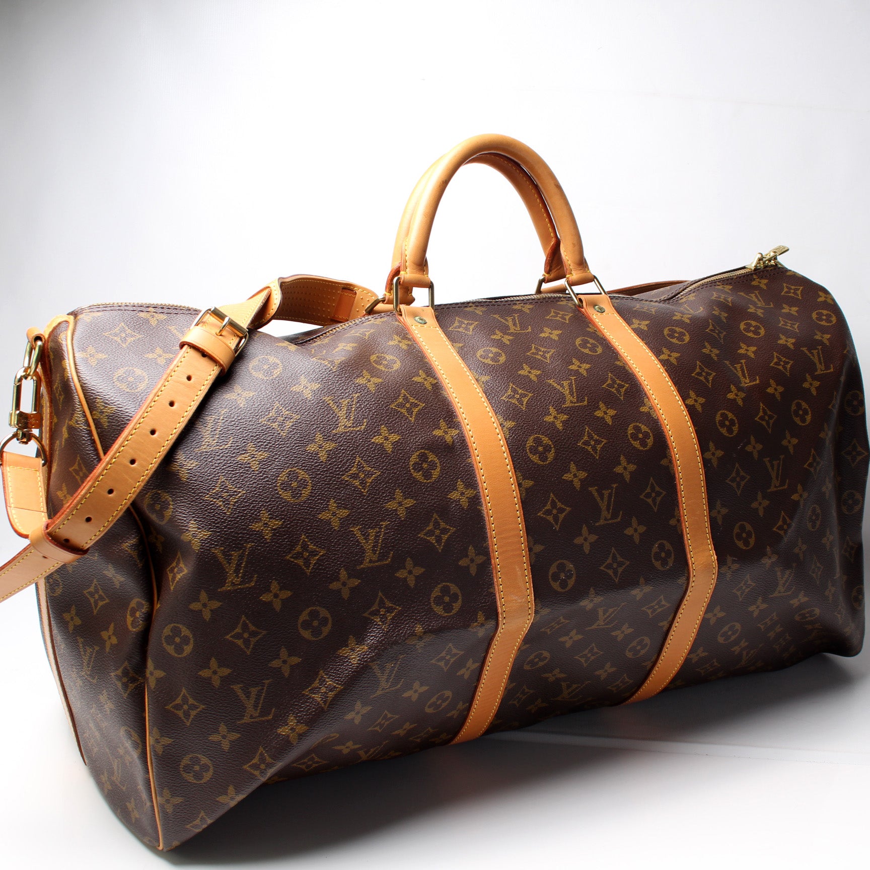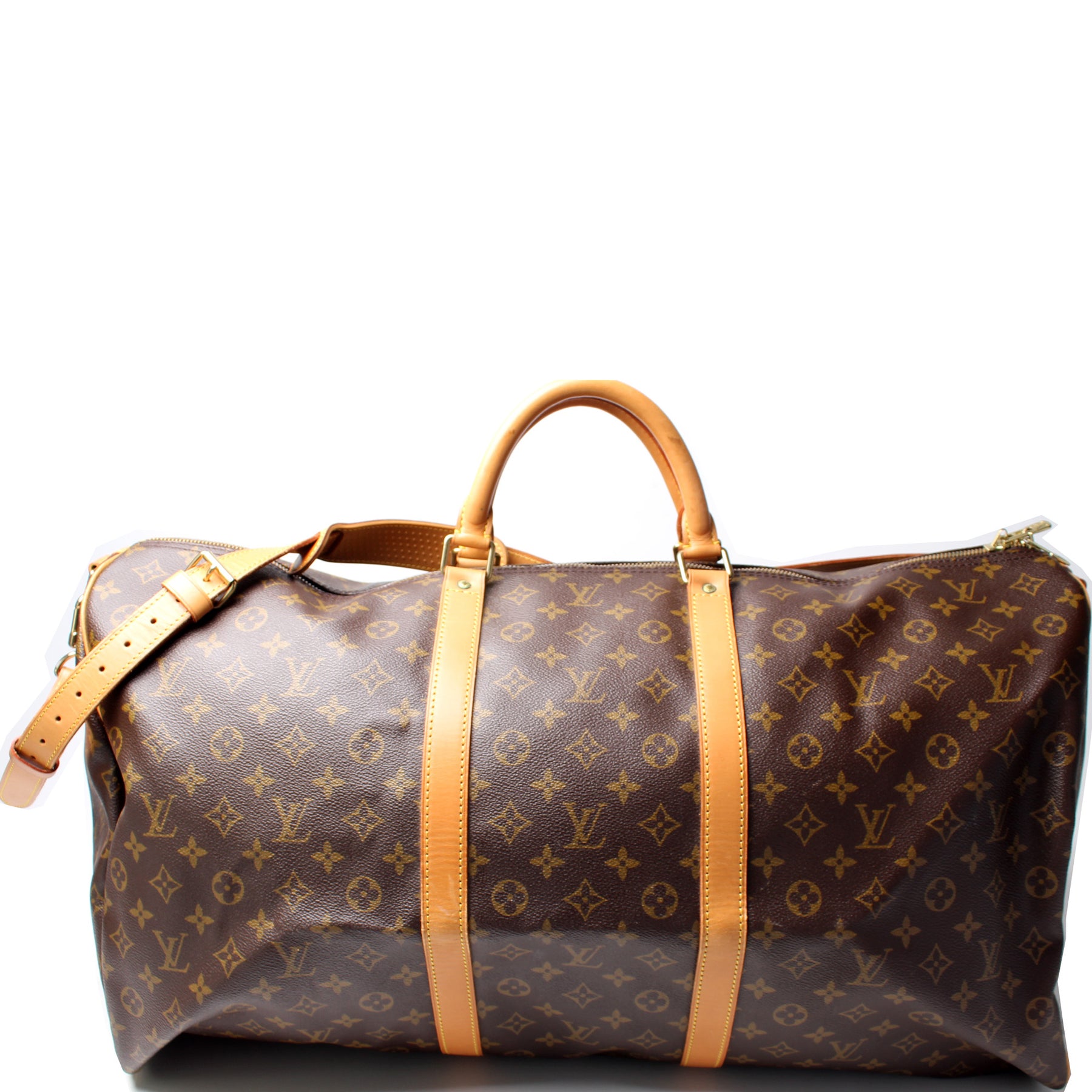 This pre-owned Louis Vuitton Keepall 60 Bandouliere is guaranteed 100% authentic. The exterior is in the classic Louis Vuitton Monogram coated canvas.