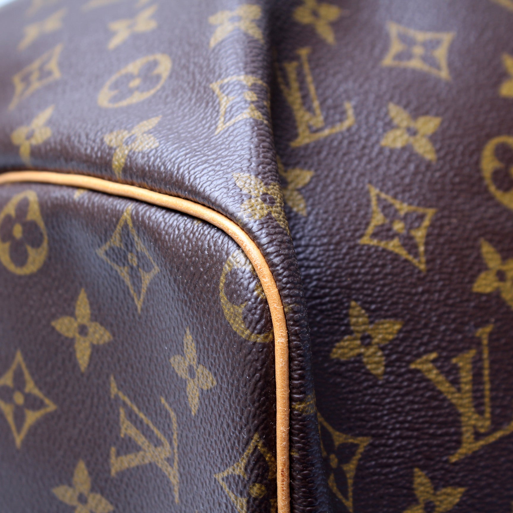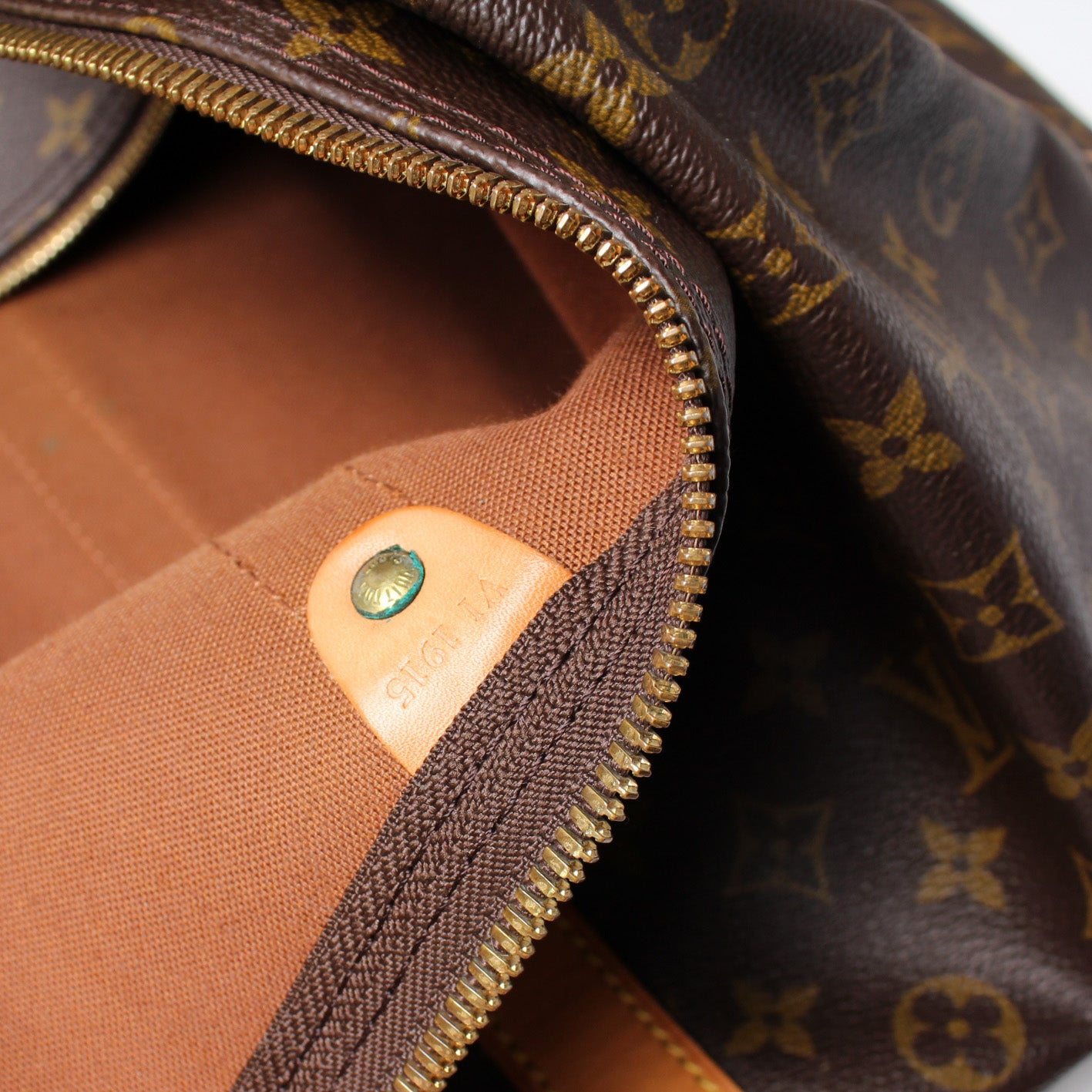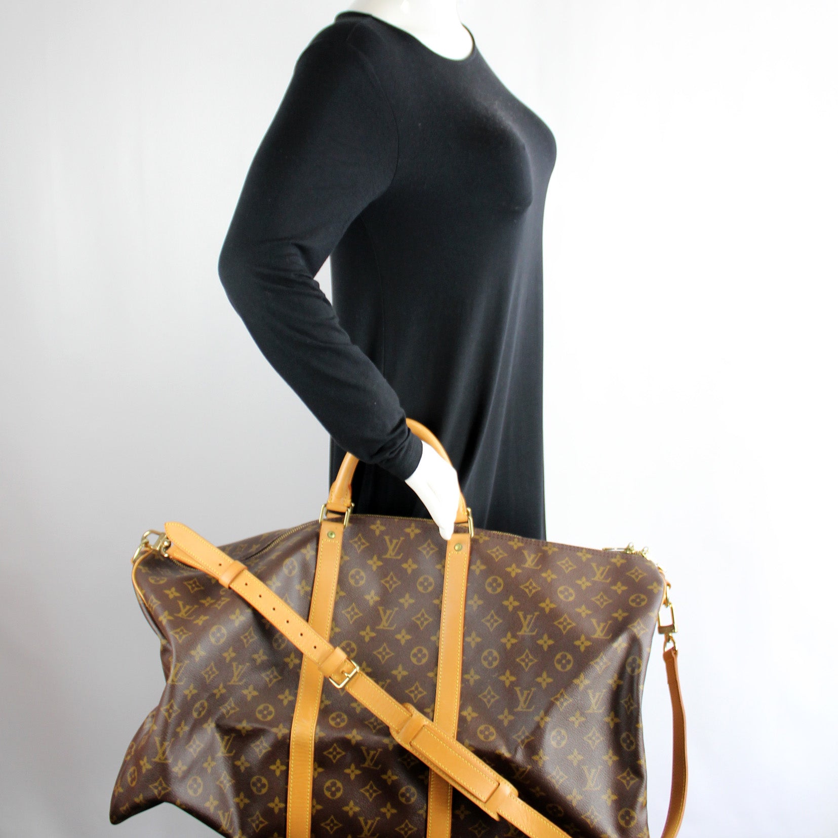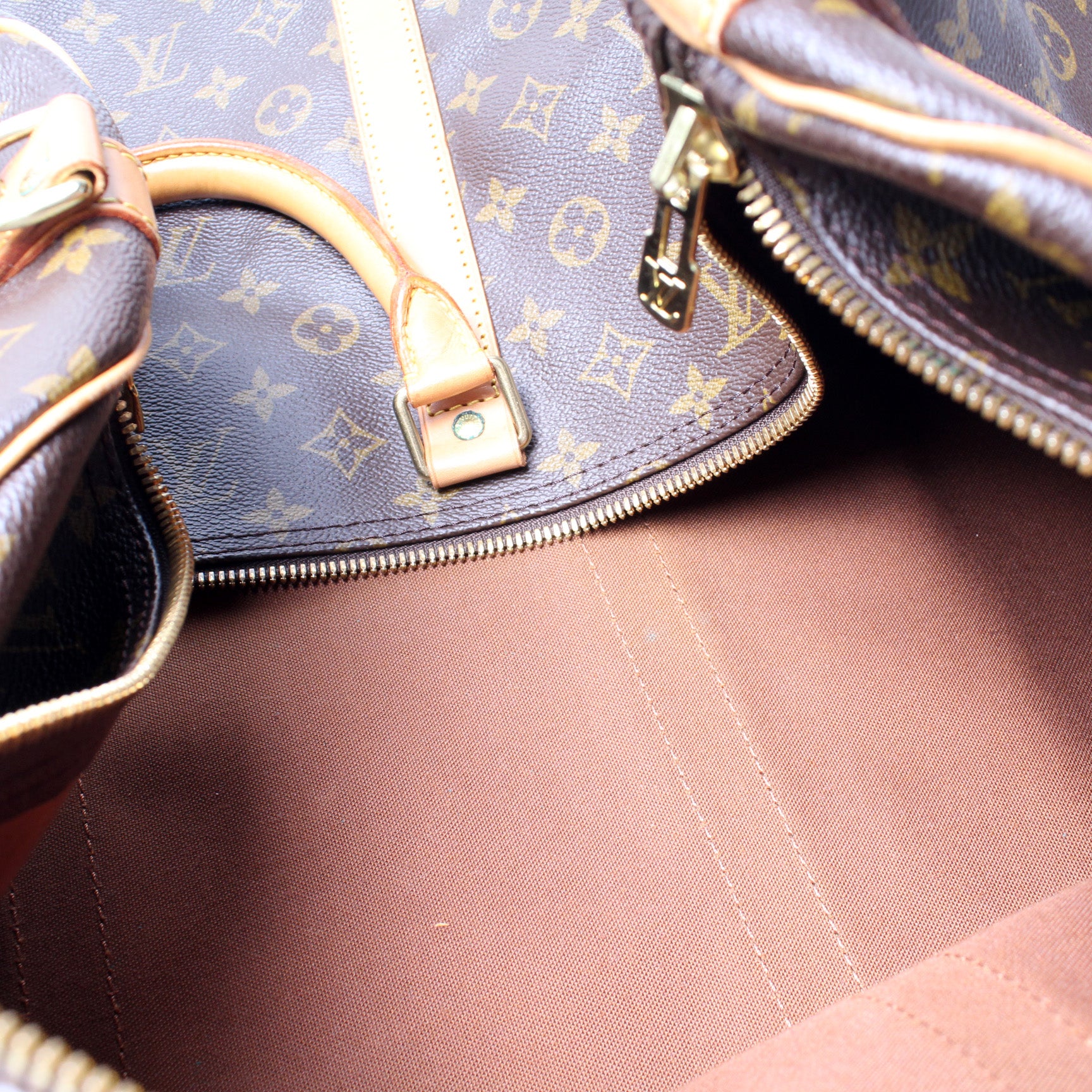 This pre-owned Louis Vuitton Keepall 60 Bandouliere is guaranteed 100% authentic. The exterior is in the classic Louis Vuitton Monogram coated canvas.