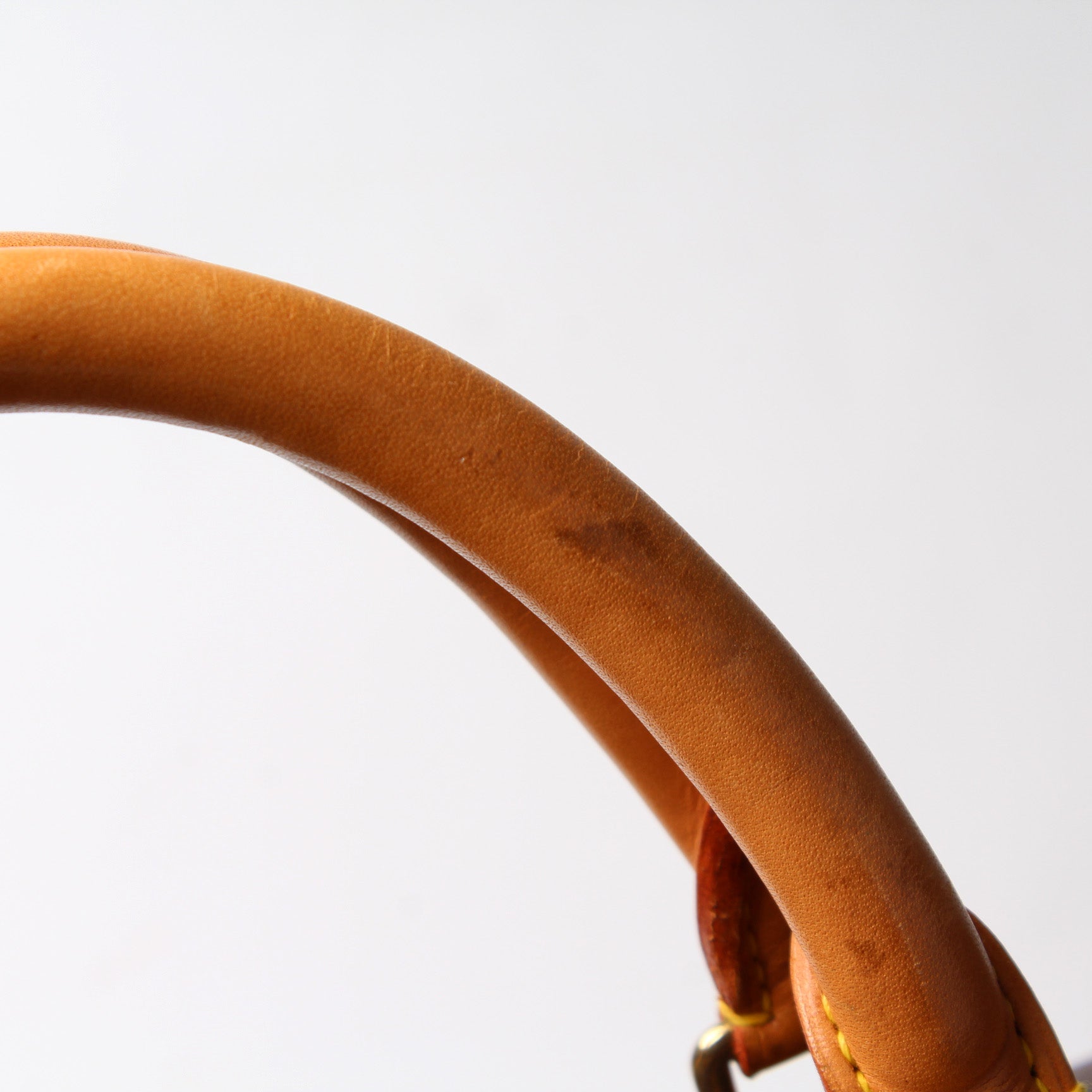 Exterior: The exterior Monogram coated canvas is free of any rips or cracks. There is wear and discoloration on the leather trim and corners.