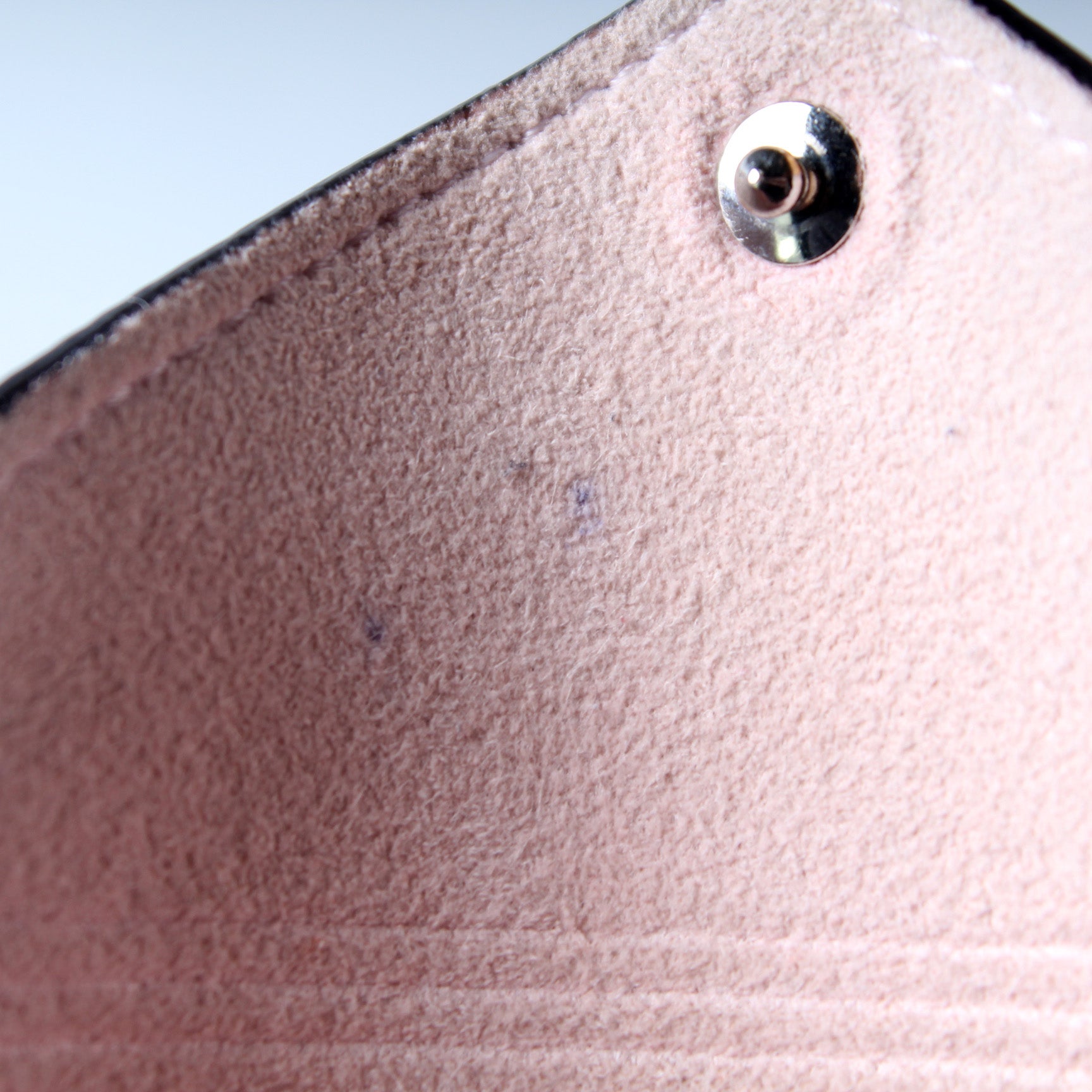 Exterior: The exterior is free of any rips or cracks. The pink pouch has minor wear where the button closure is.