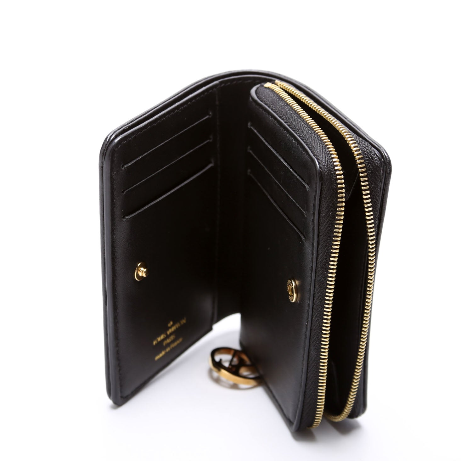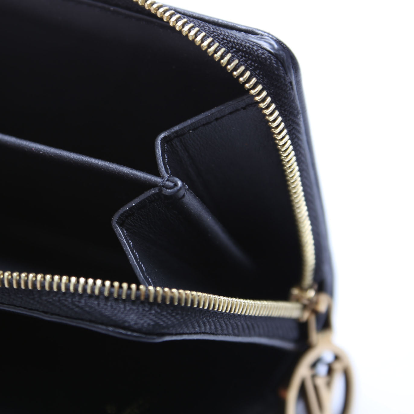 Interior: The interior shows light wear and scuffs. The interior features eight card slots, one bill slot, and one zip closure coin pouch.