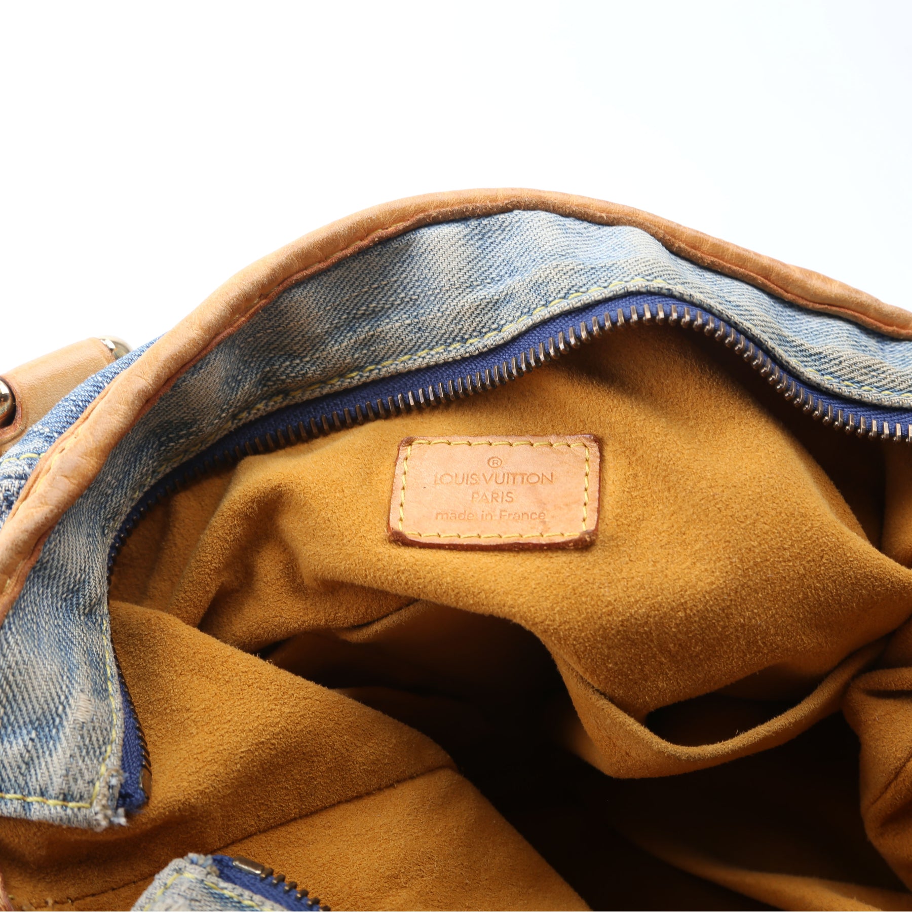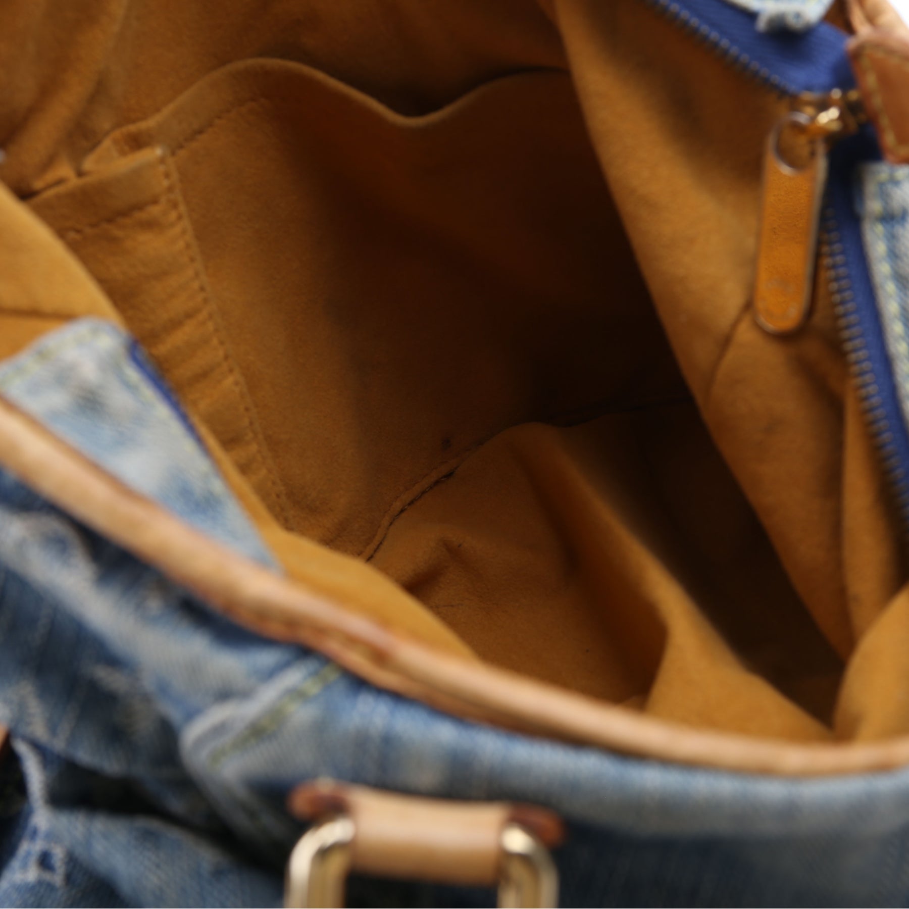 Exterior: The exterior denim has wear and discoloration to the corners. The leather trim has major discoloration and wear. The leather trim around the opening of the bag has holes as pictured.