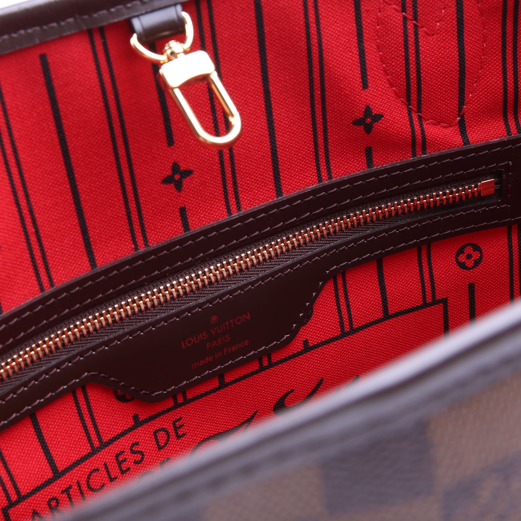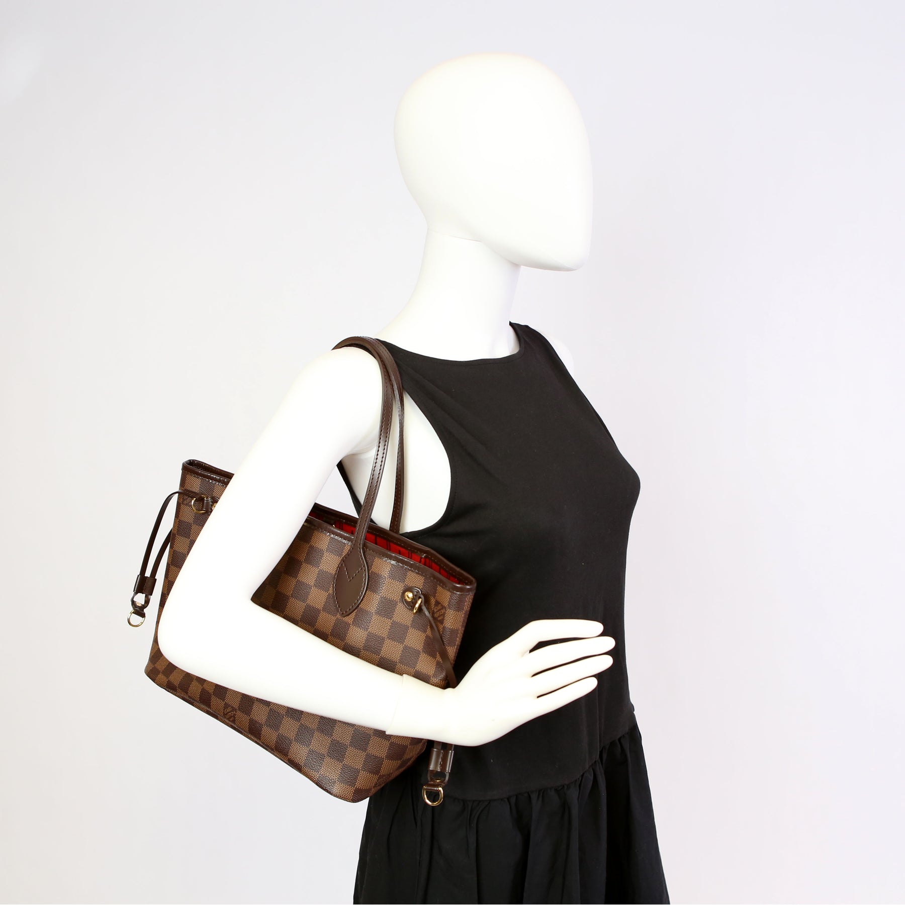 This pre-owned Louis Vuitton Neverfull PM is guaranteed 100% authentic. The exterior is in the classic Louis Vuitton Damier Ebene coated canvas.