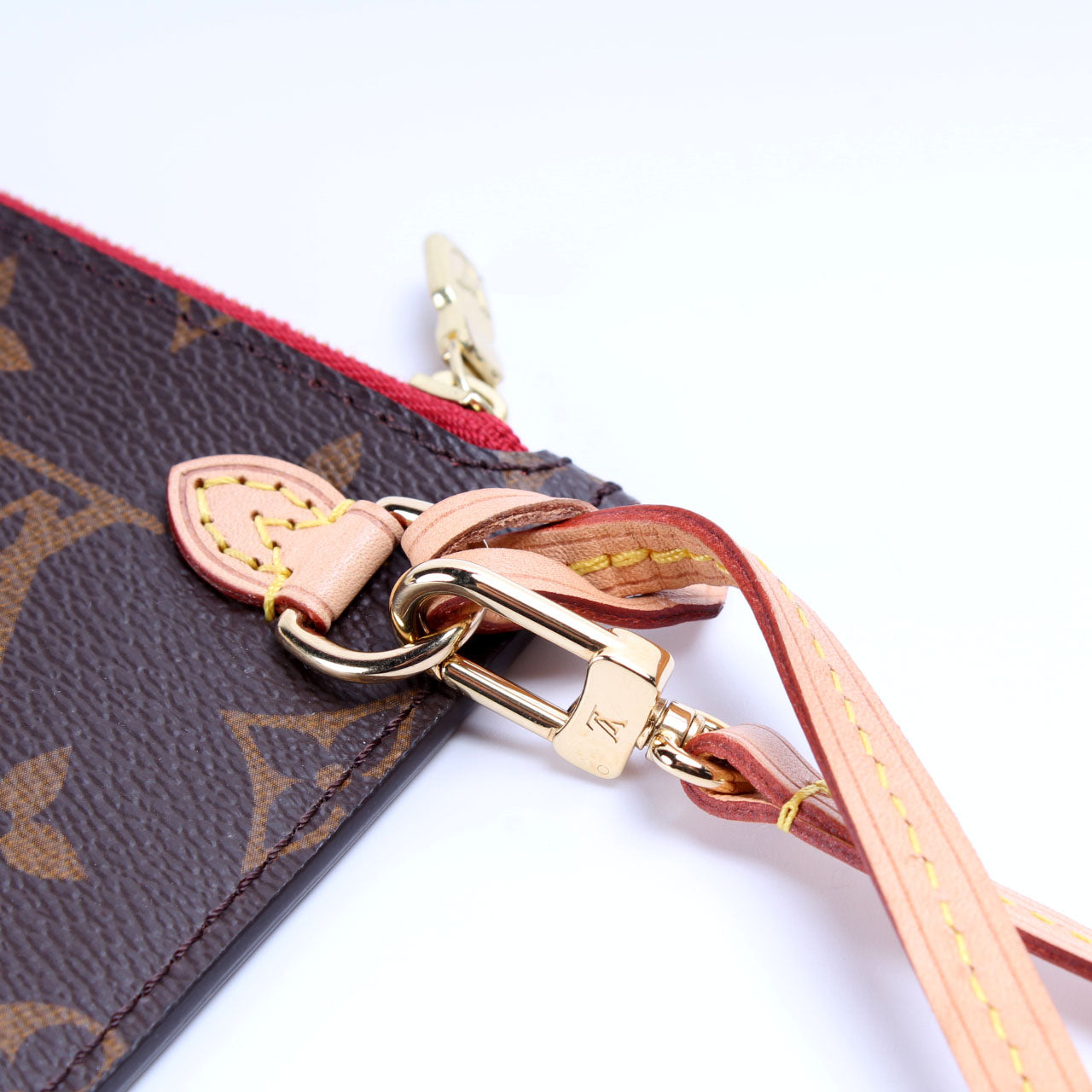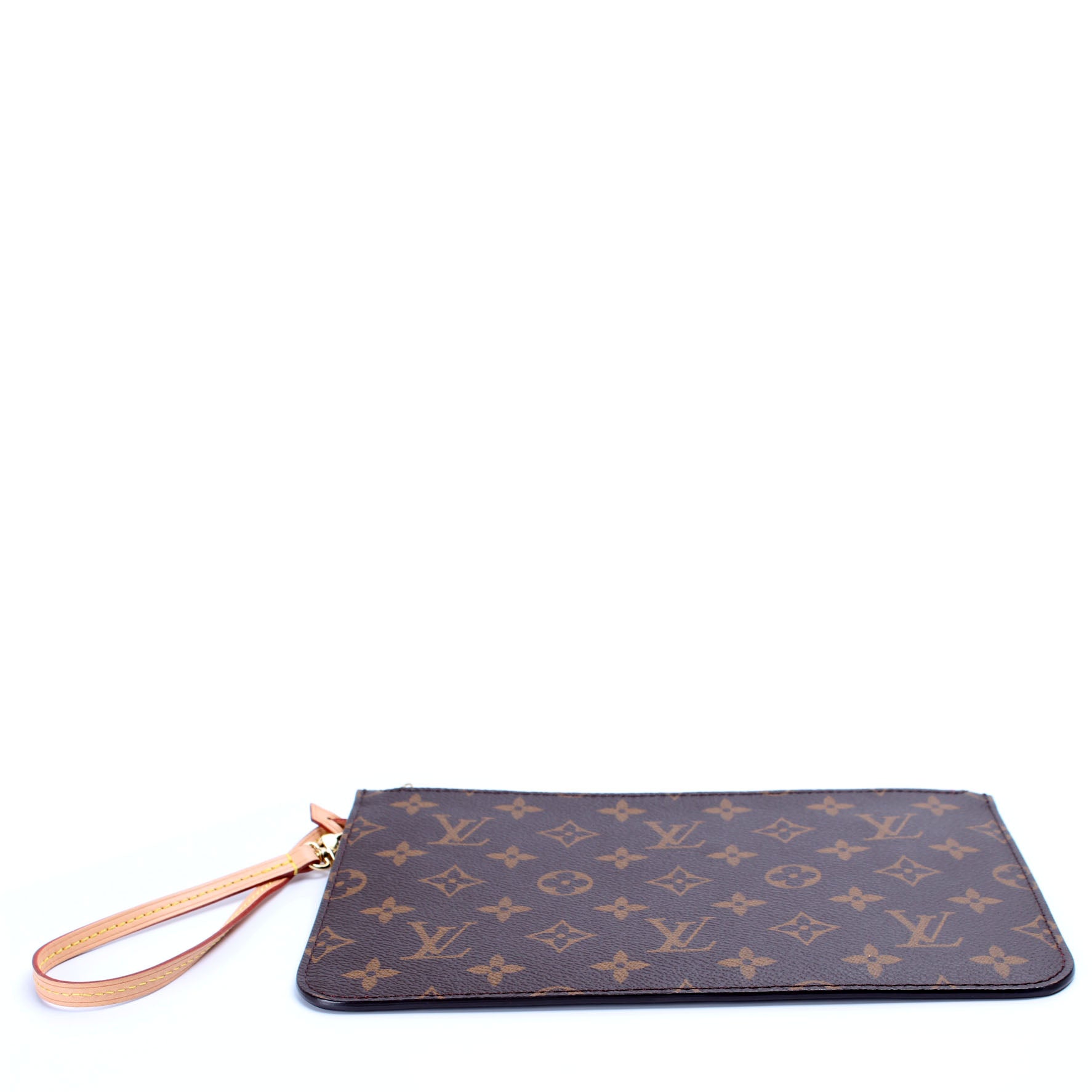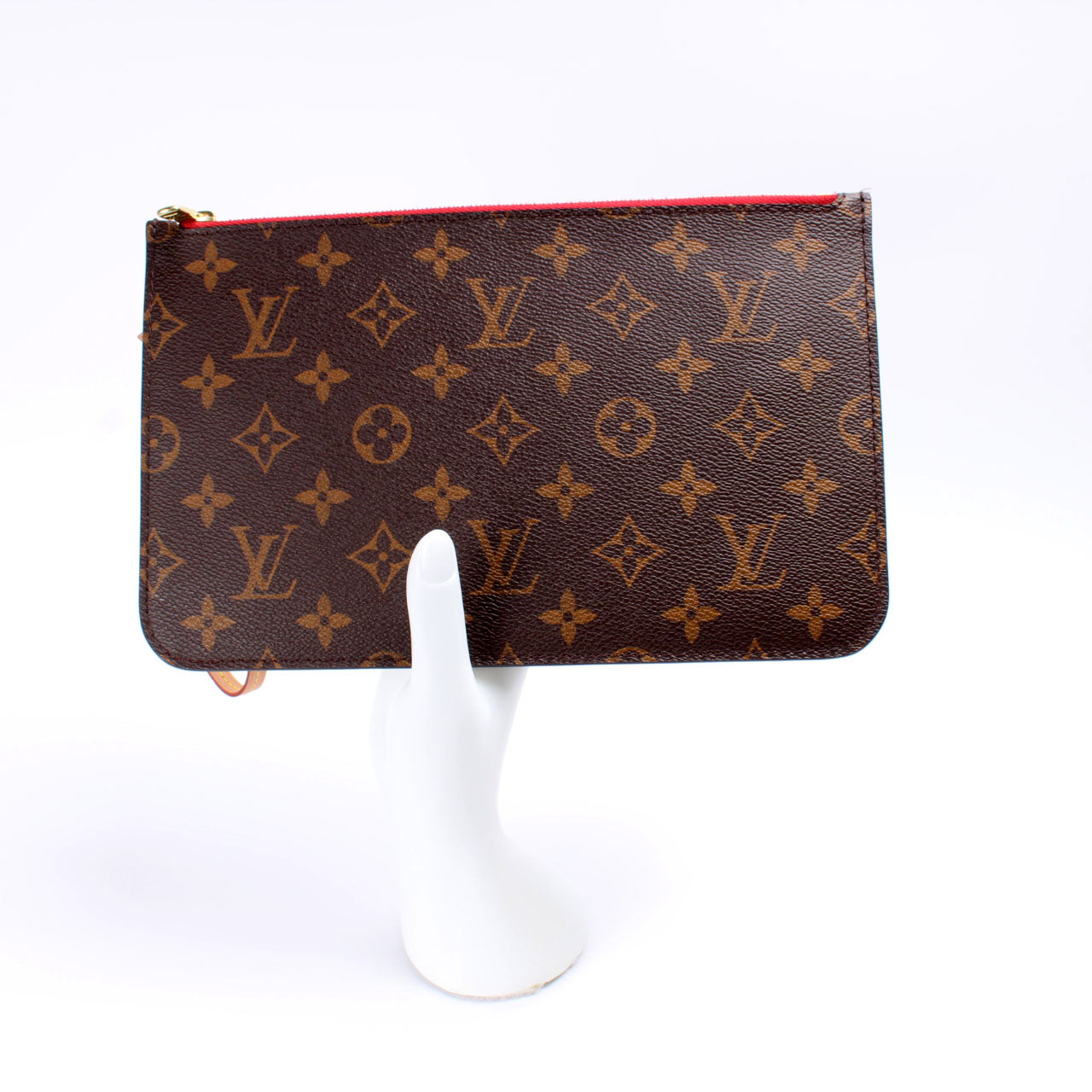 This pre-owned Louis Vuitton Neverfull Pochette is guaranteed 100% authentic. The exterior is in the classic Louis Vuitton Monogram coated canvas.