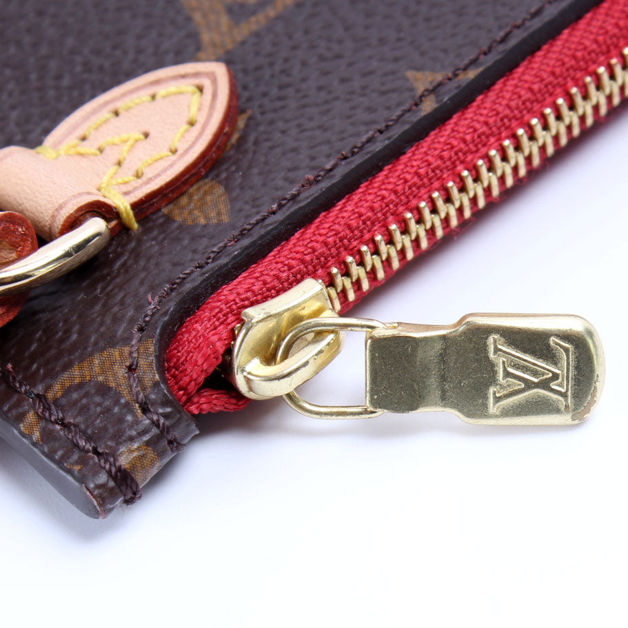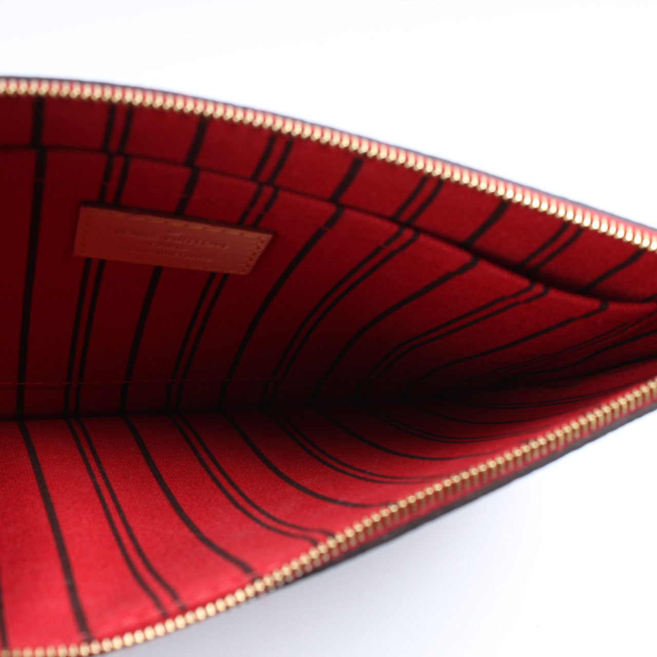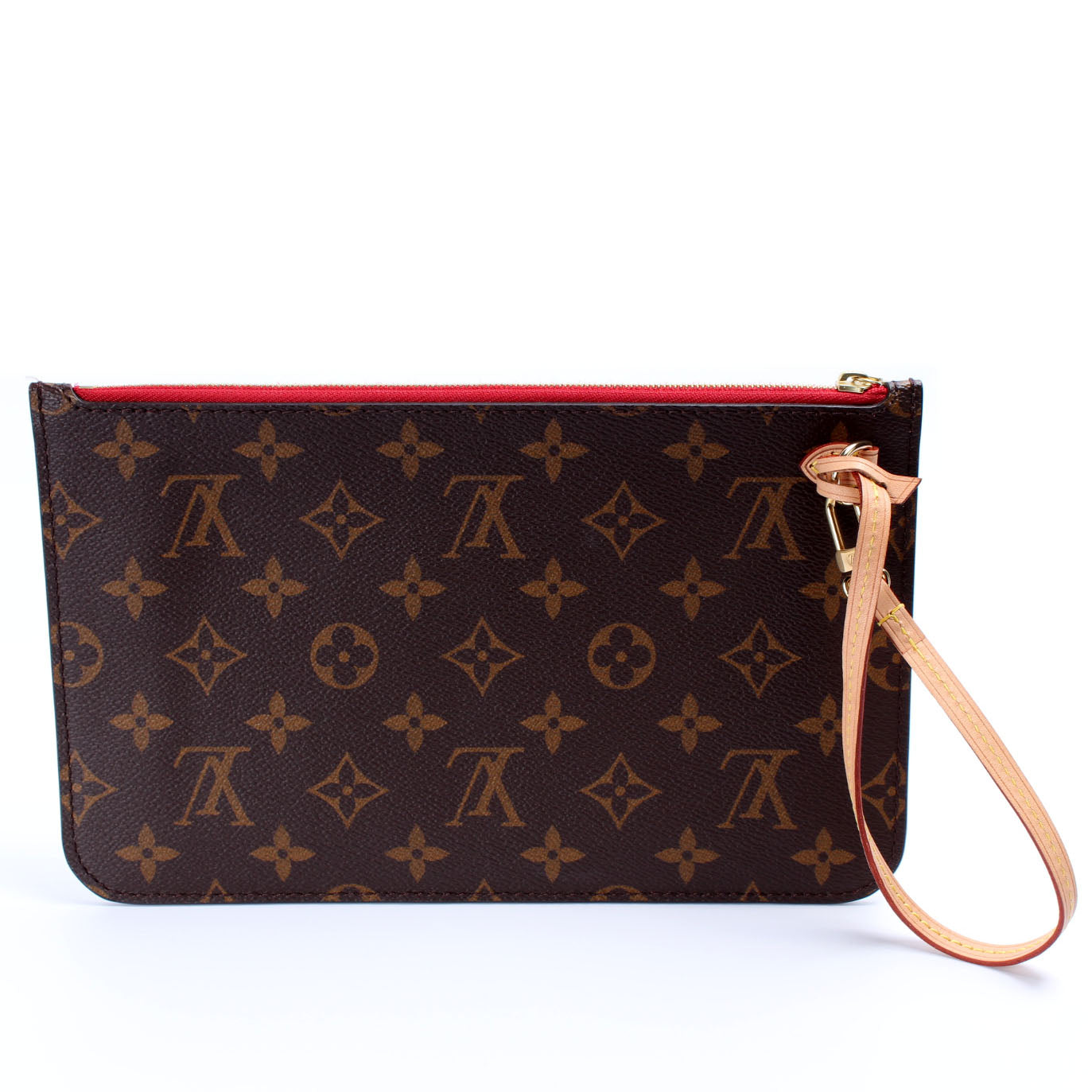 This pre-owned Louis Vuitton Neverfull Pochette is guaranteed 100% authentic. The exterior is in the classic Louis Vuitton Monogram coated canvas.