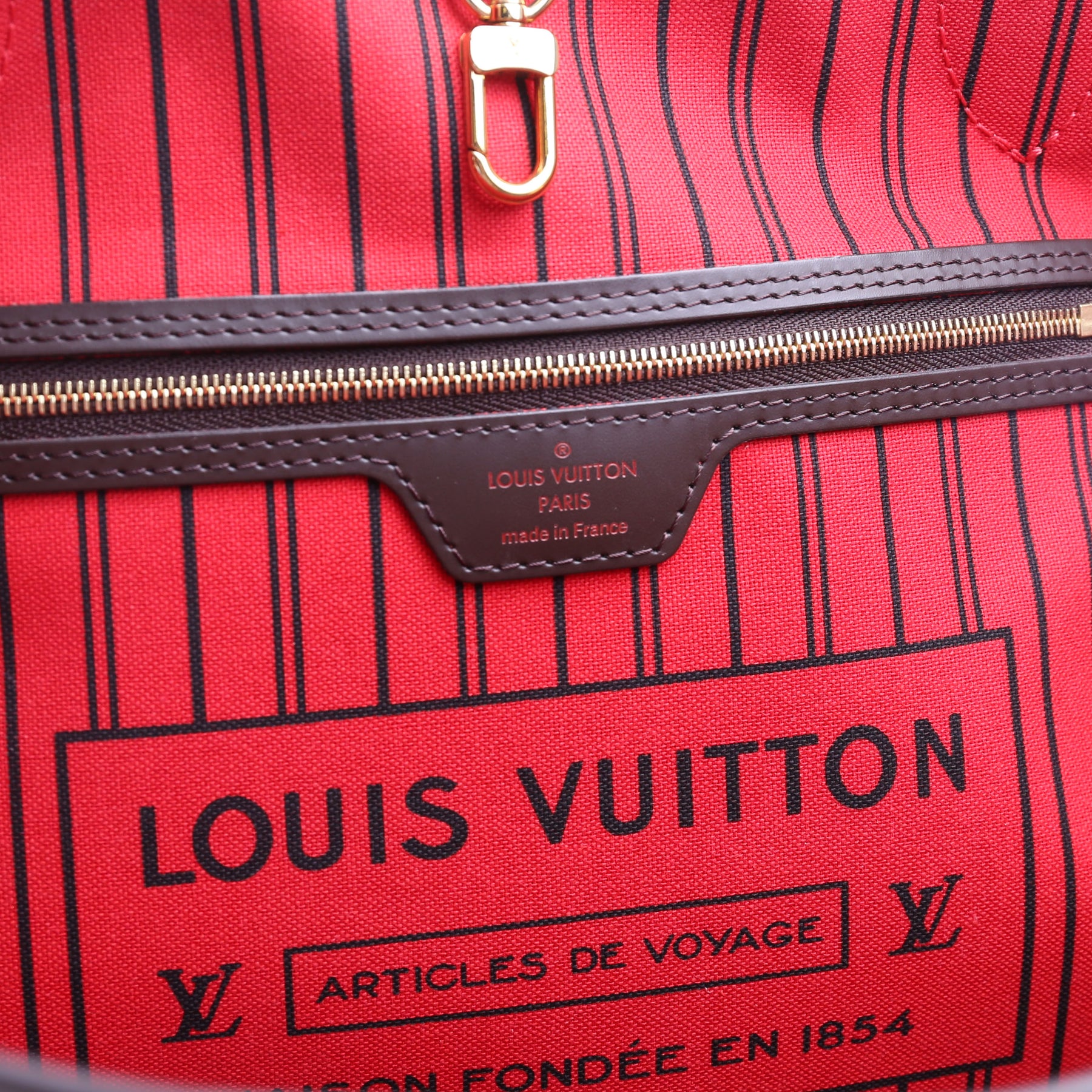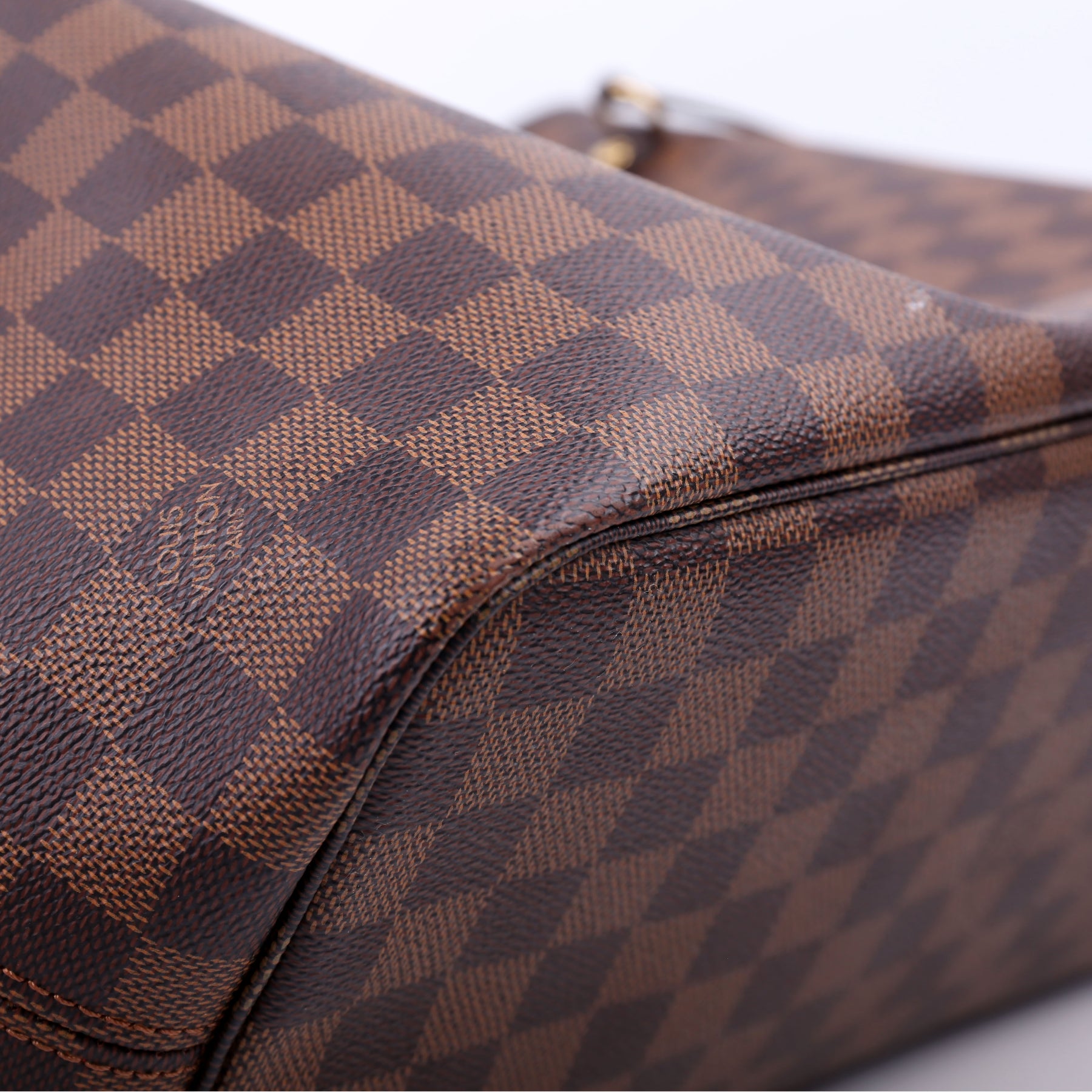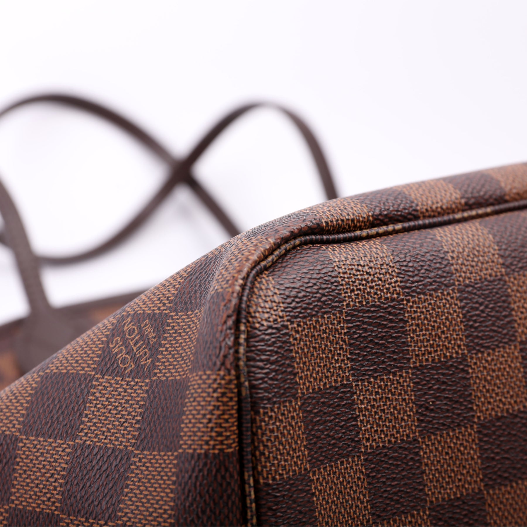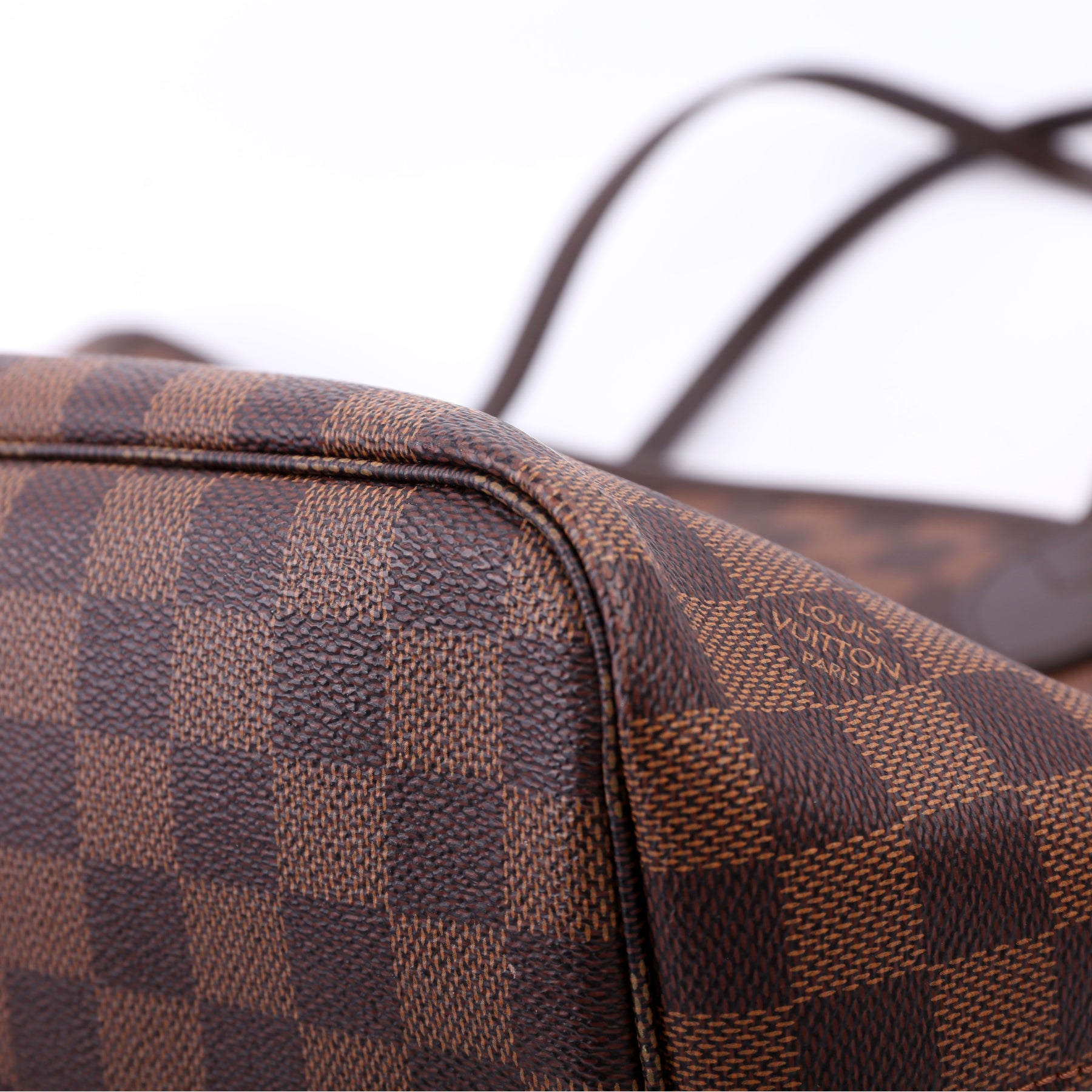 This pre-owned Louis Vuitton Neverfull MM is guaranteed 100% authentic. The exterior is in the classic Louis Vuitton Damier Ebene coated canvas.