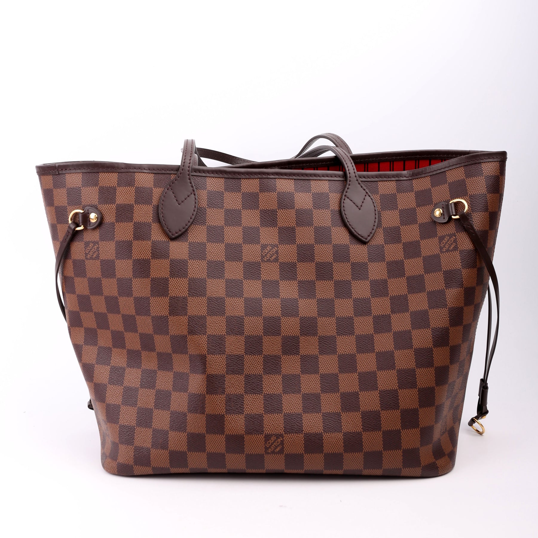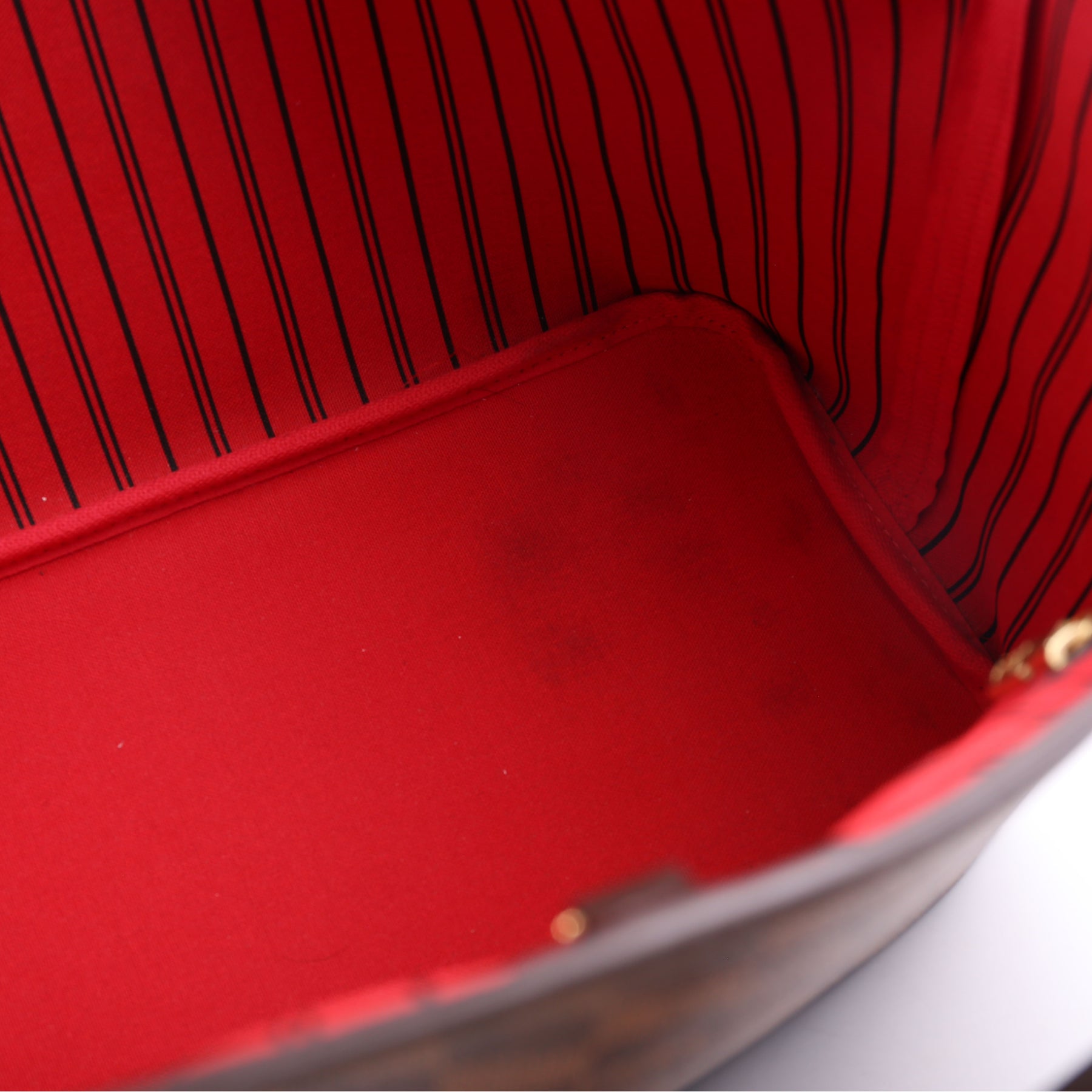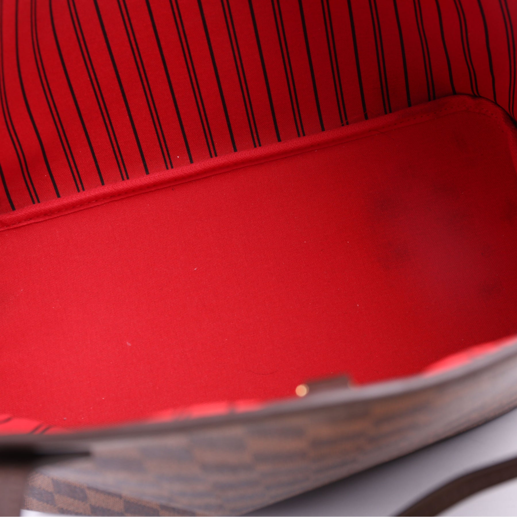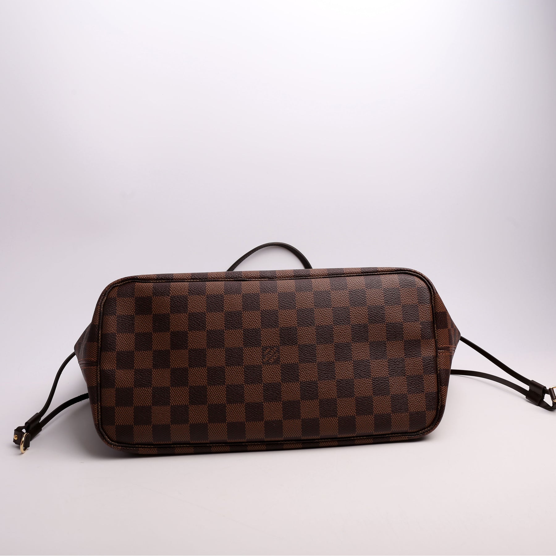 This pre-owned Louis Vuitton Neverfull MM is guaranteed 100% authentic. The exterior is in the classic Louis Vuitton Damier Ebene coated canvas.