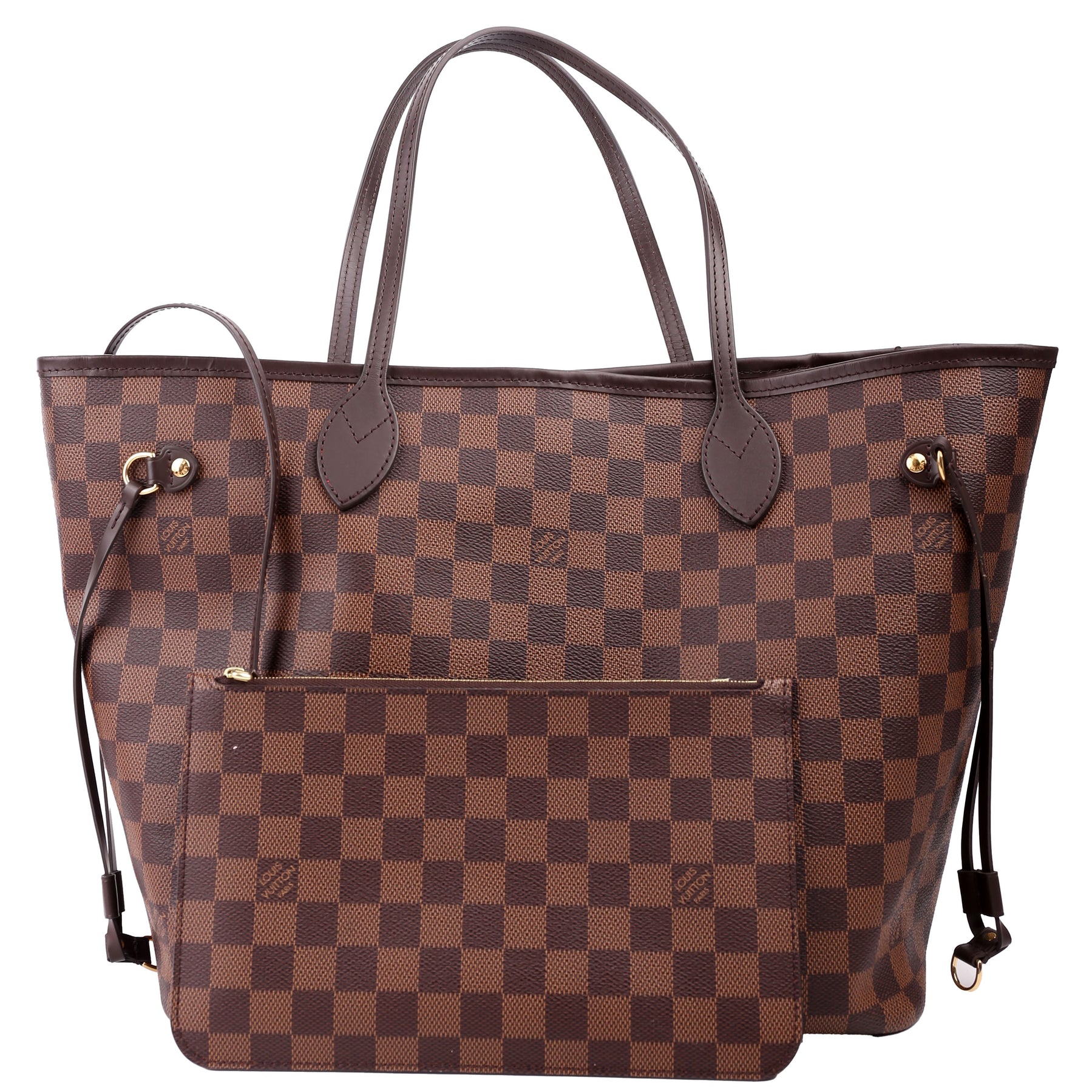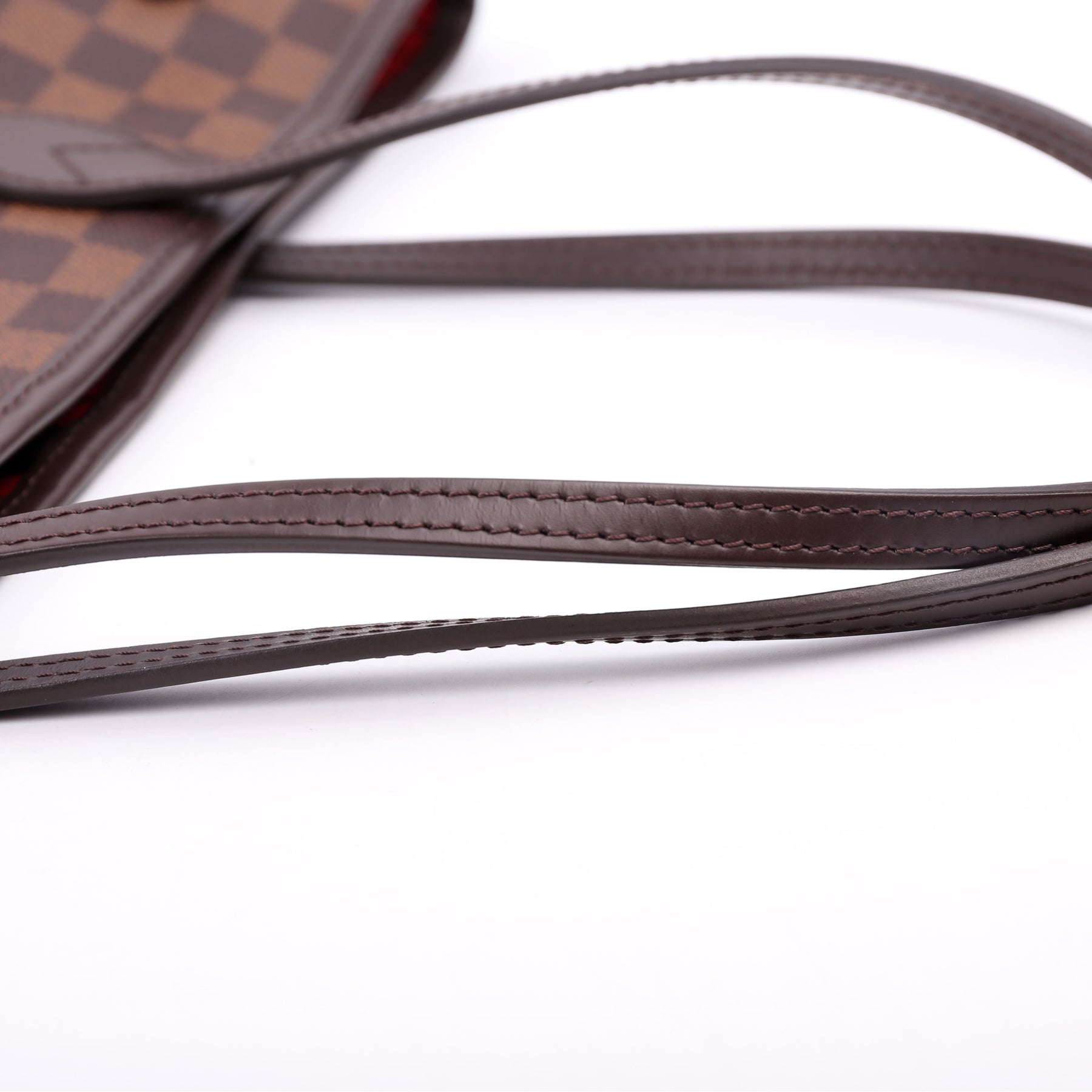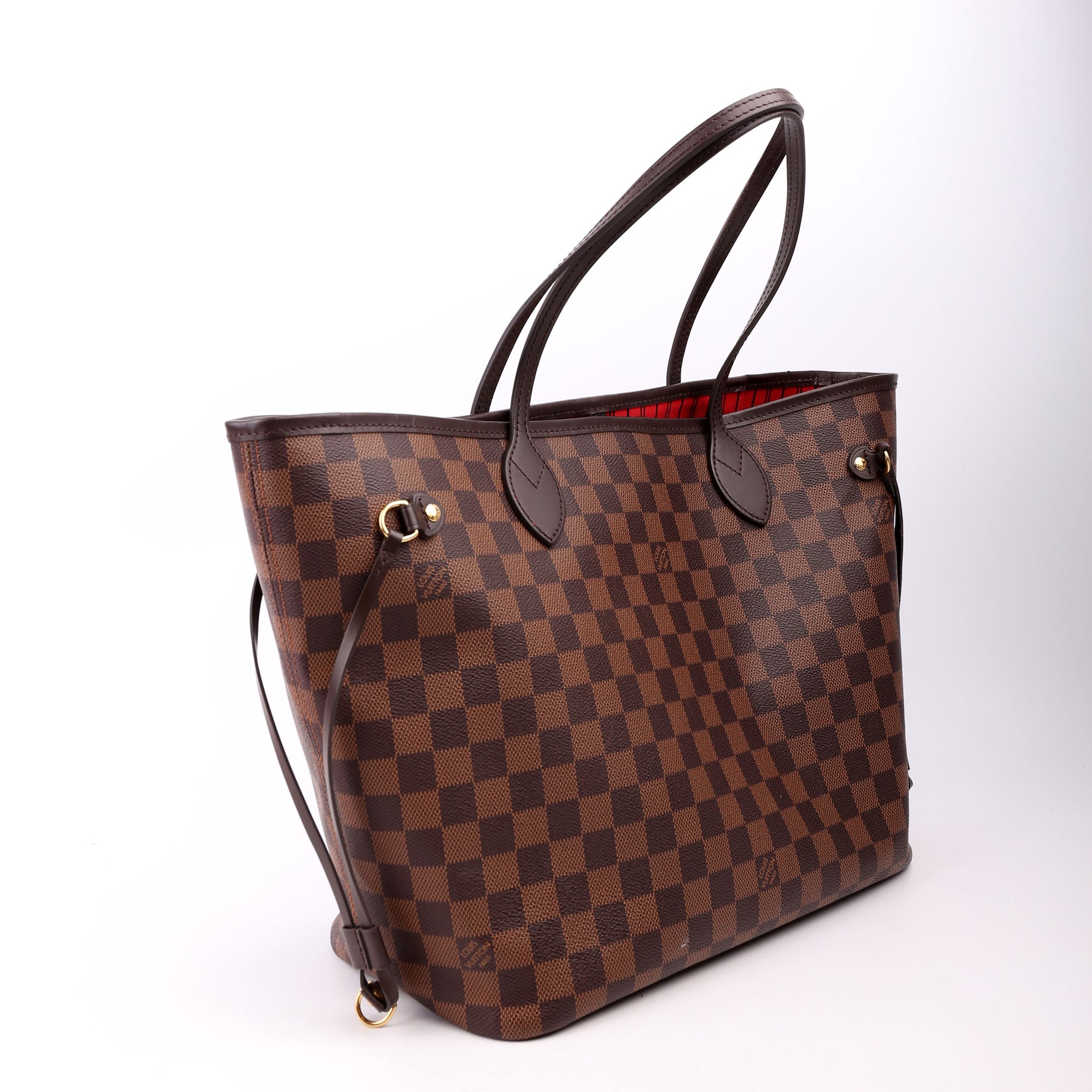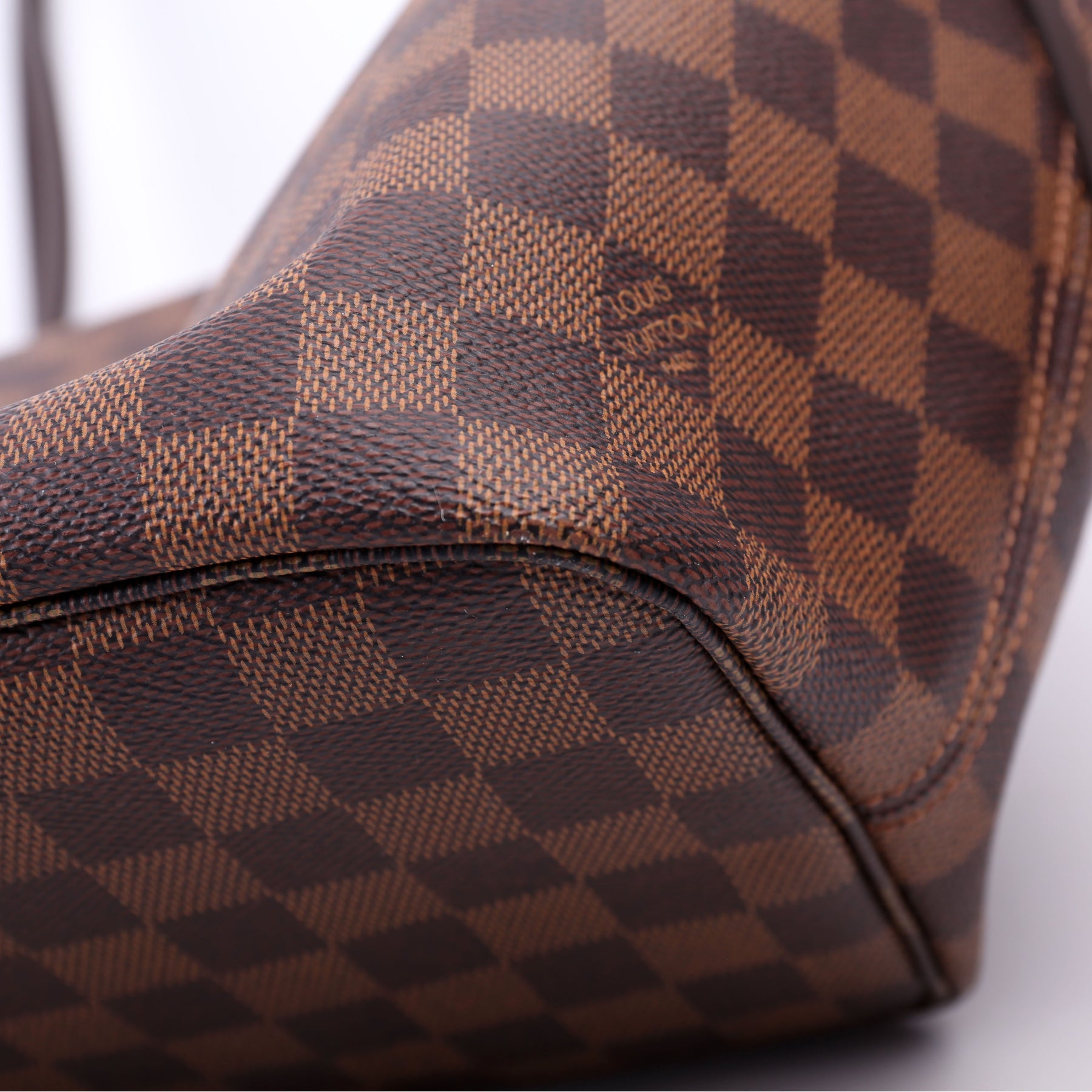 This pre-owned Louis Vuitton Neverfull MM is guaranteed 100% authentic. The exterior is in the classic Louis Vuitton Damier Ebene coated canvas.