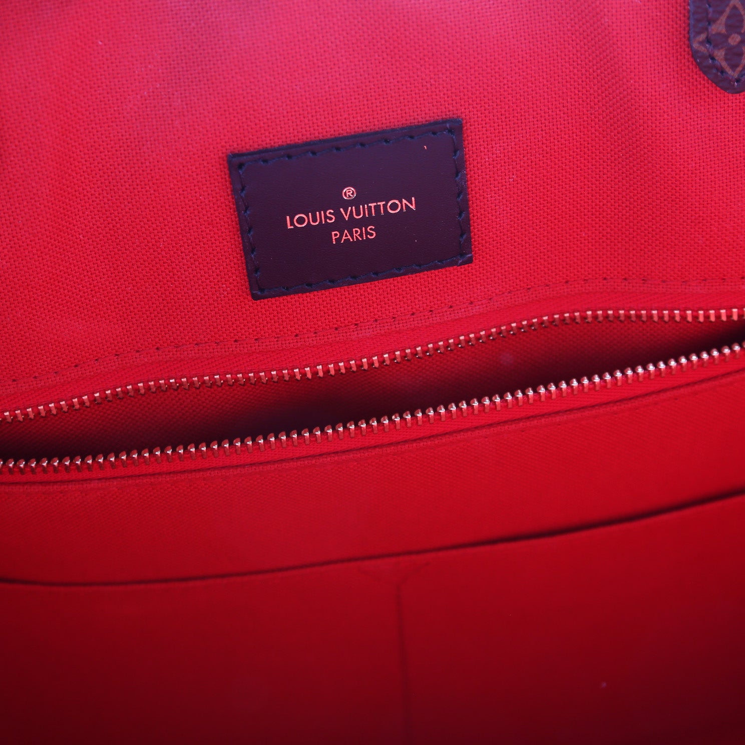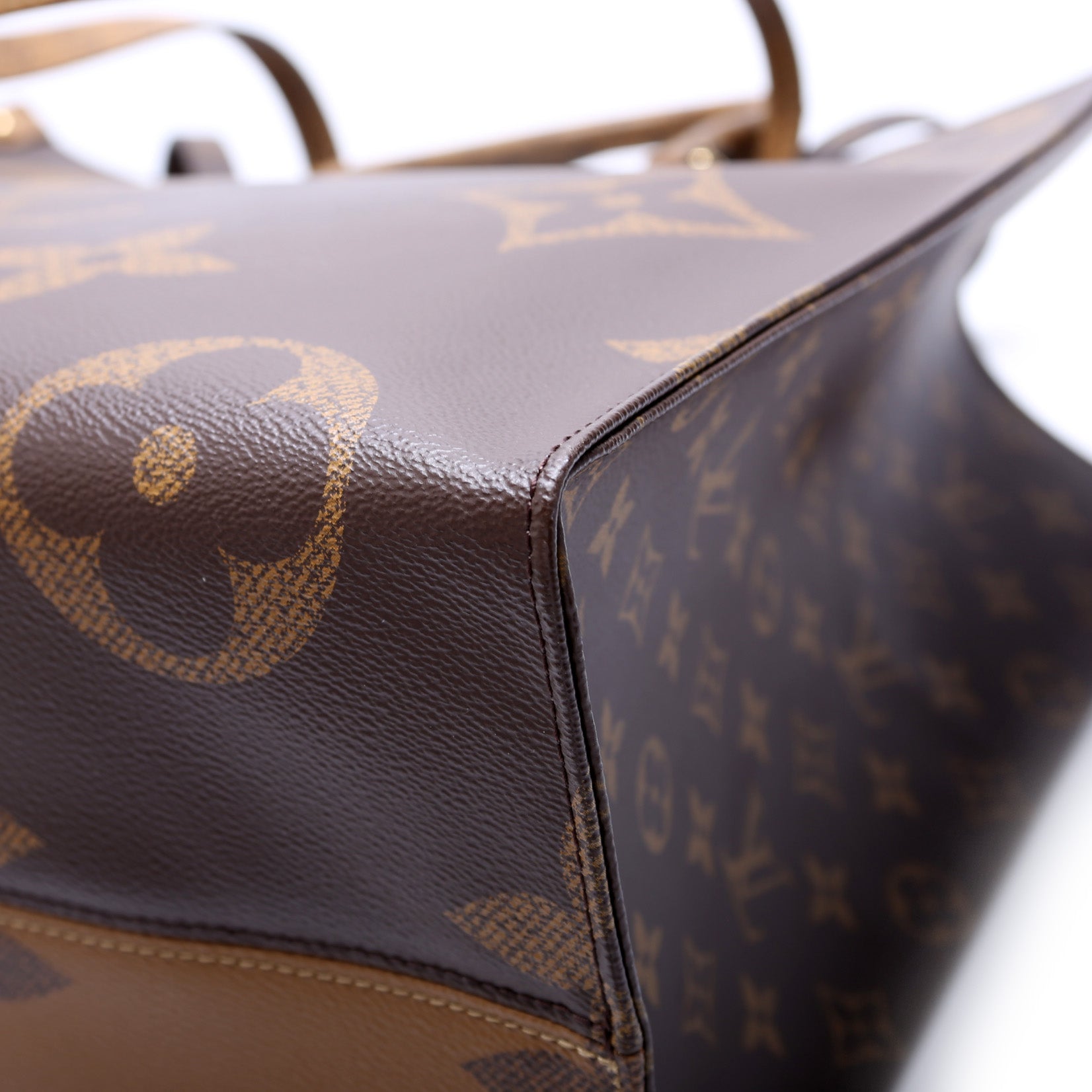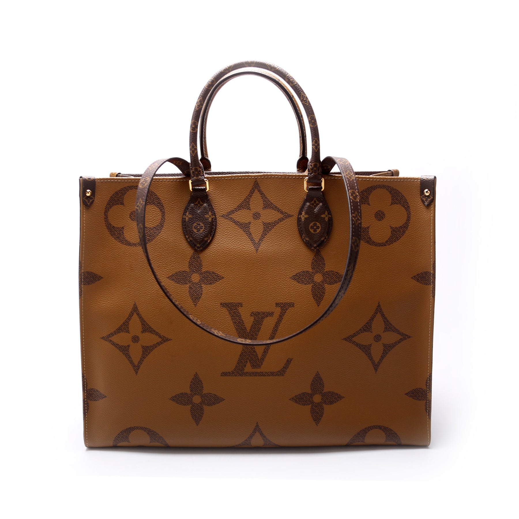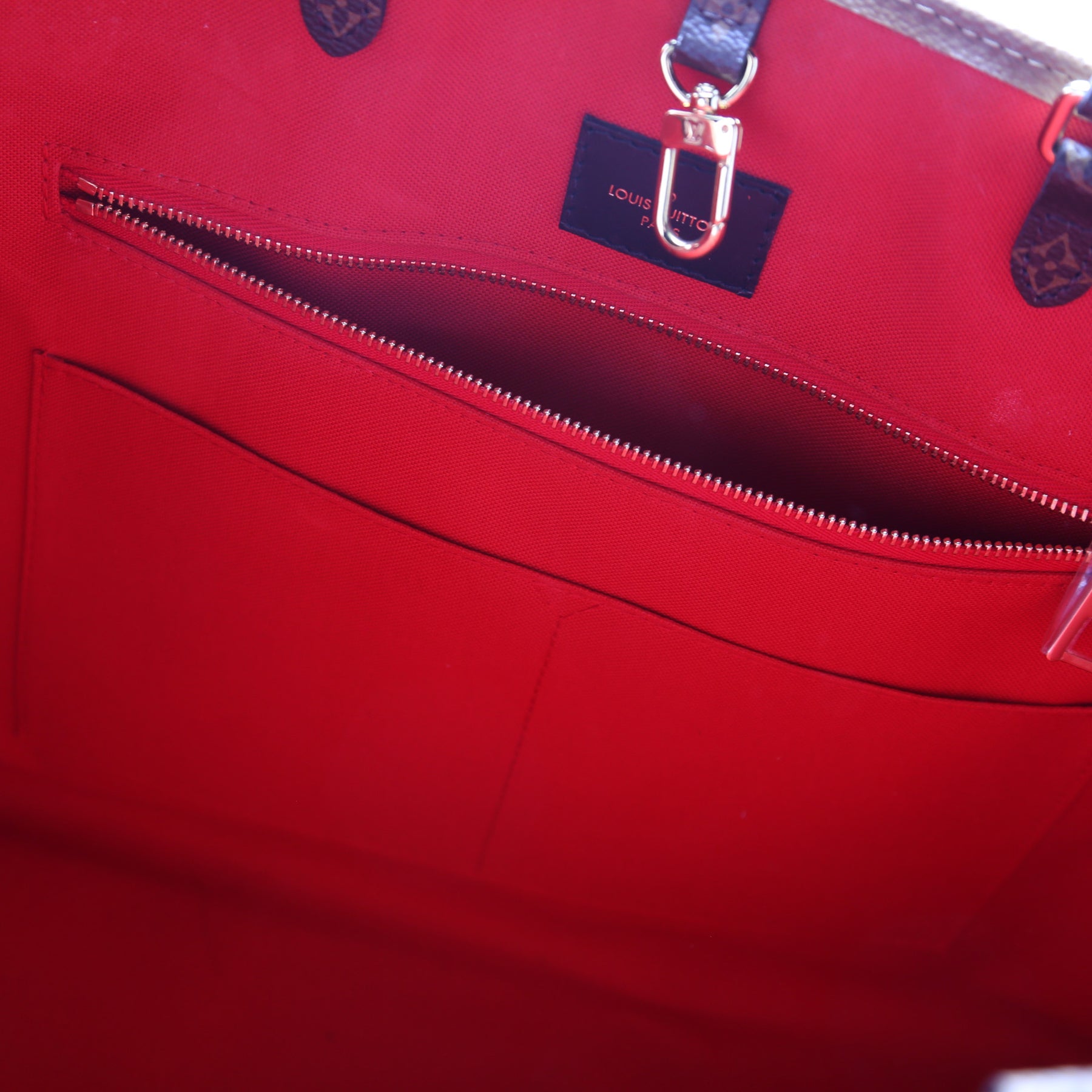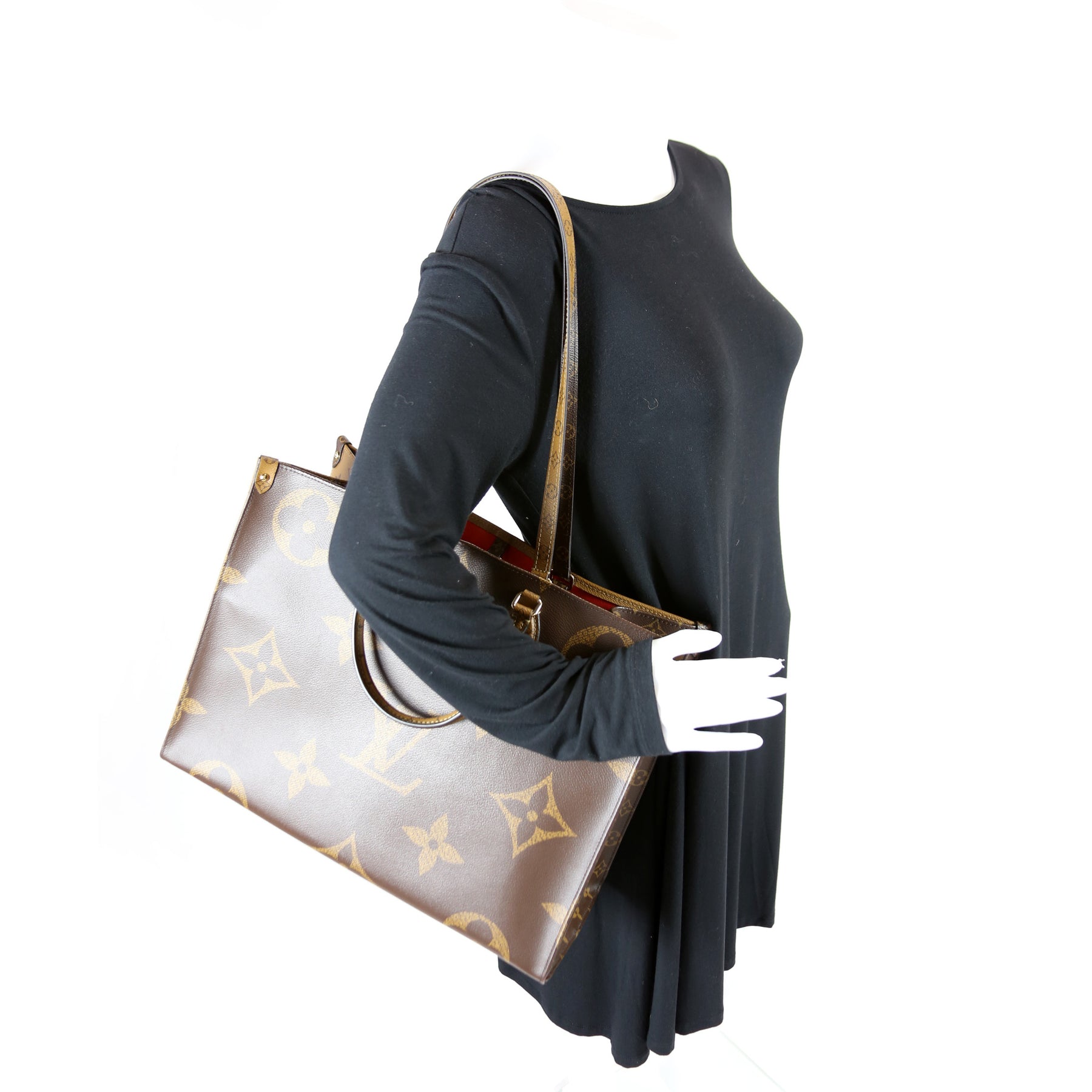 This pre-owned Louis Vuitton ONTHEGO MM is guaranteed 100% authentic. The exterior is in the classic Louis Vuitton Reverse Monogram coated canvas.