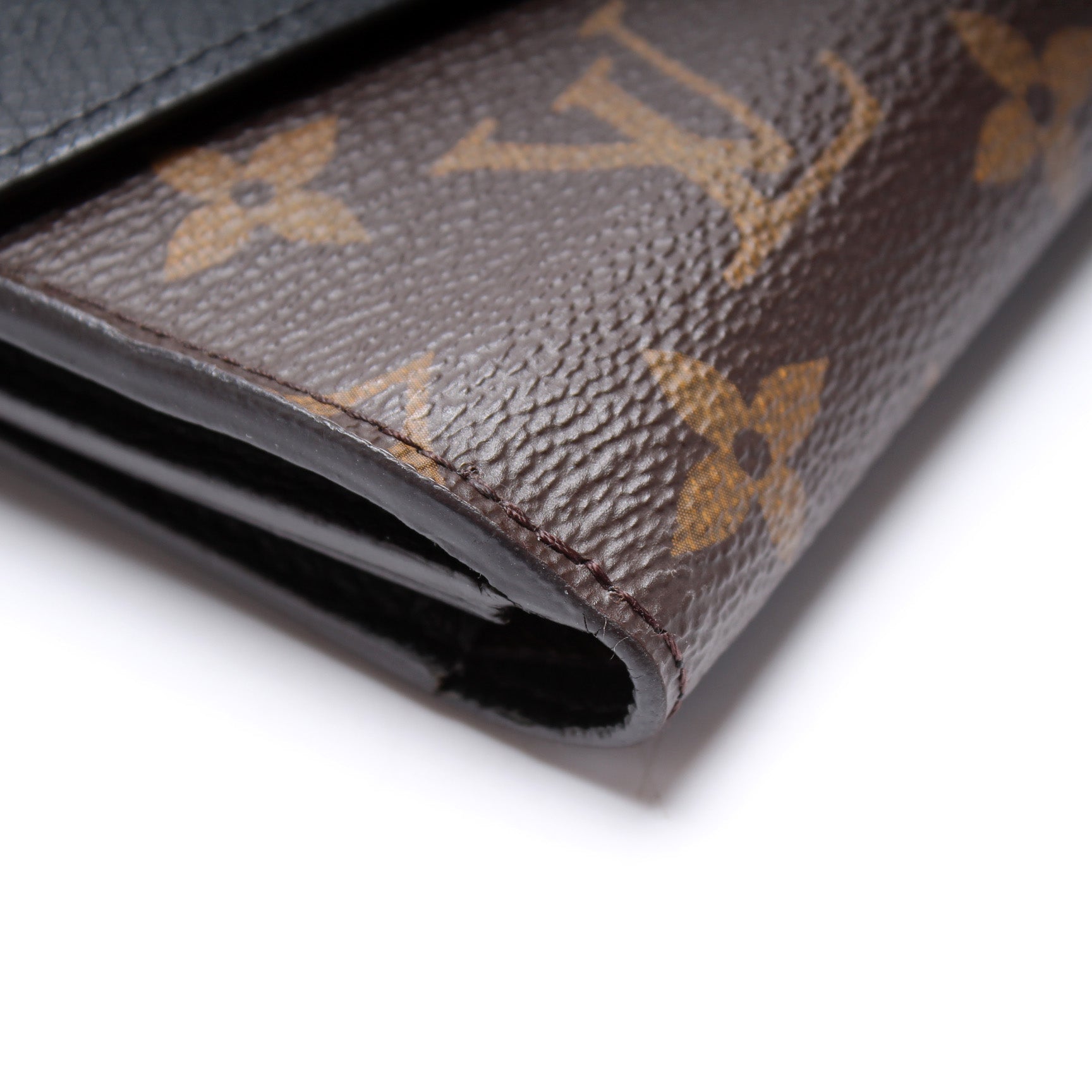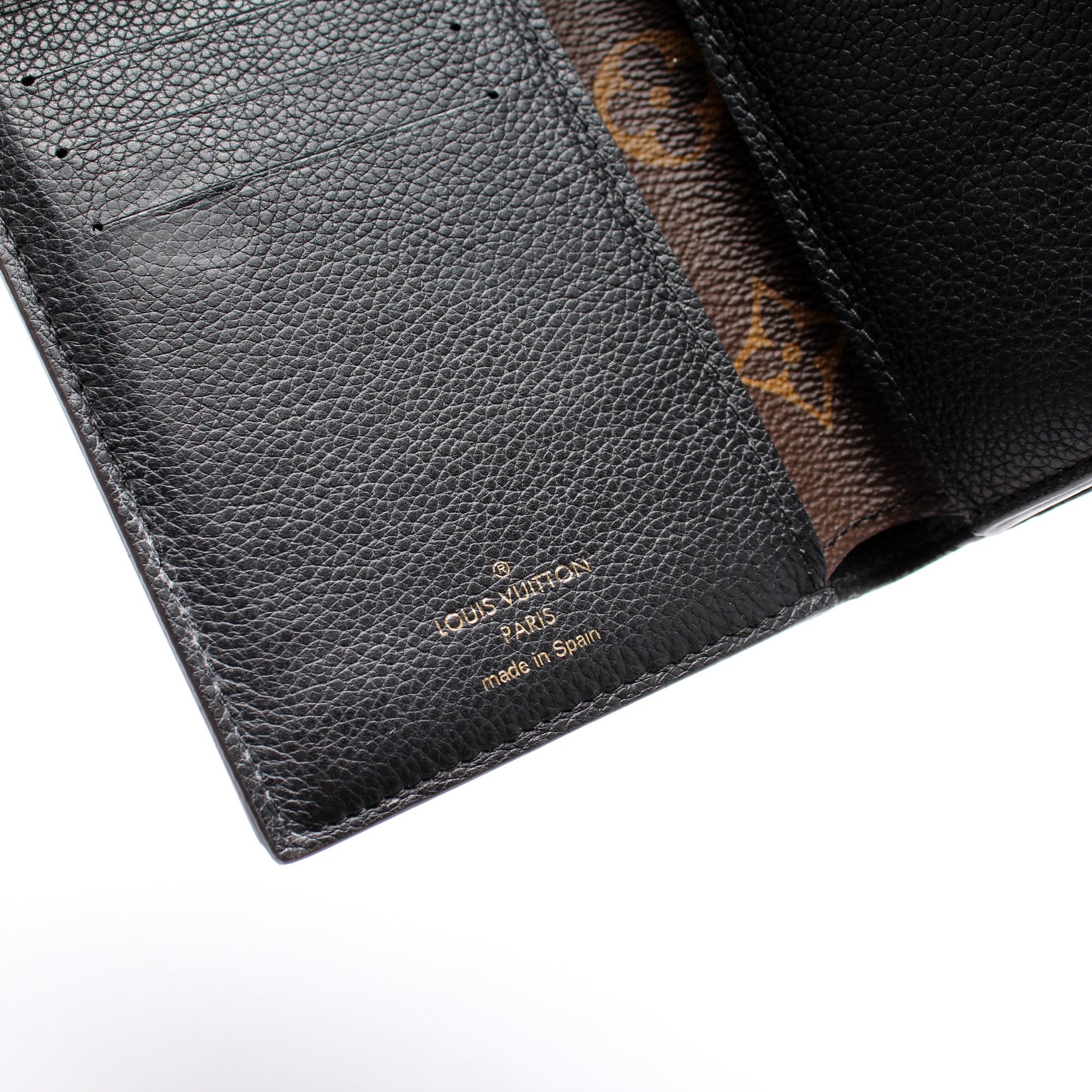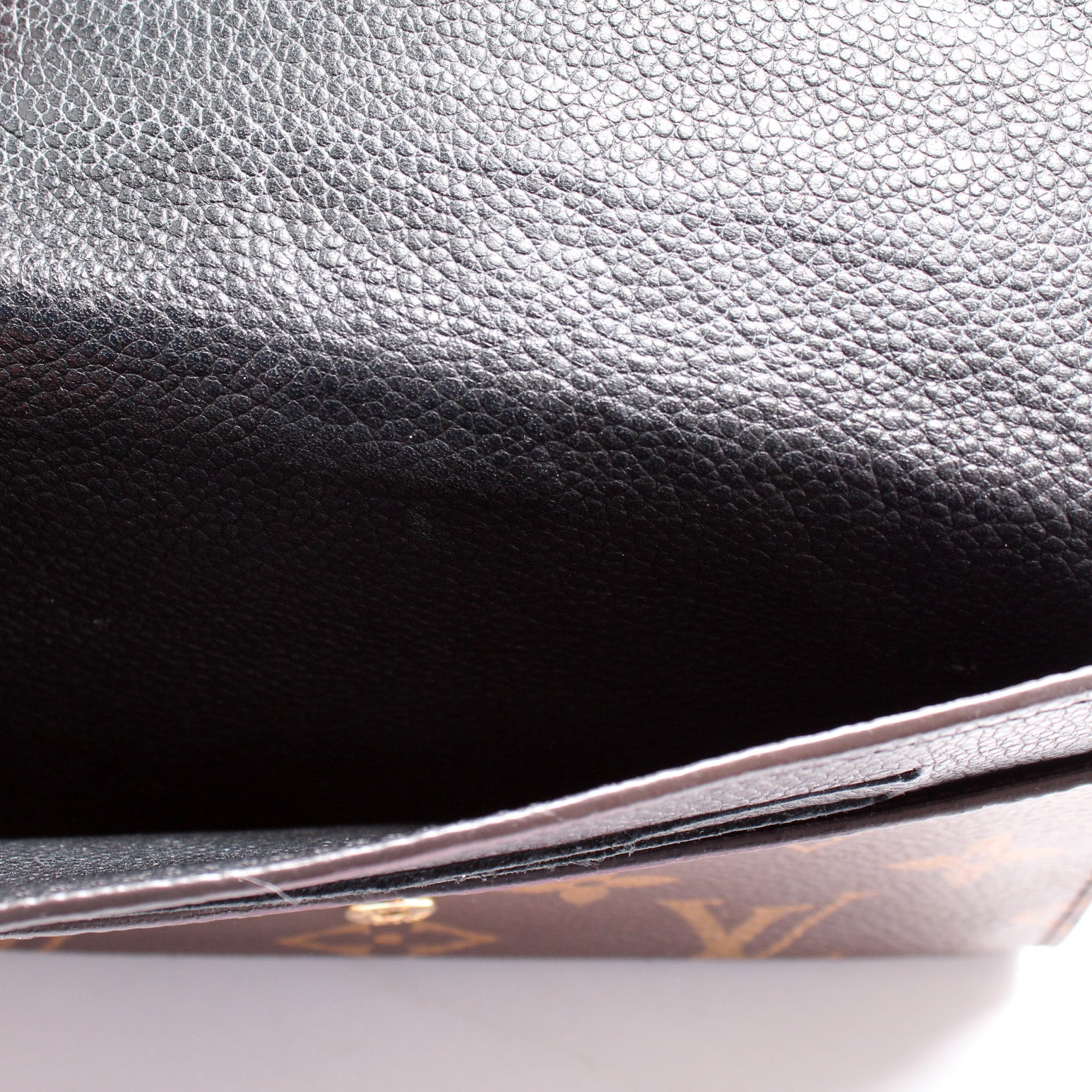 Interior: The interior is clean and free of rips or tears. The interior features fourteen card slots, and five bill slots. The interior leather shows minor discoloration and wear.