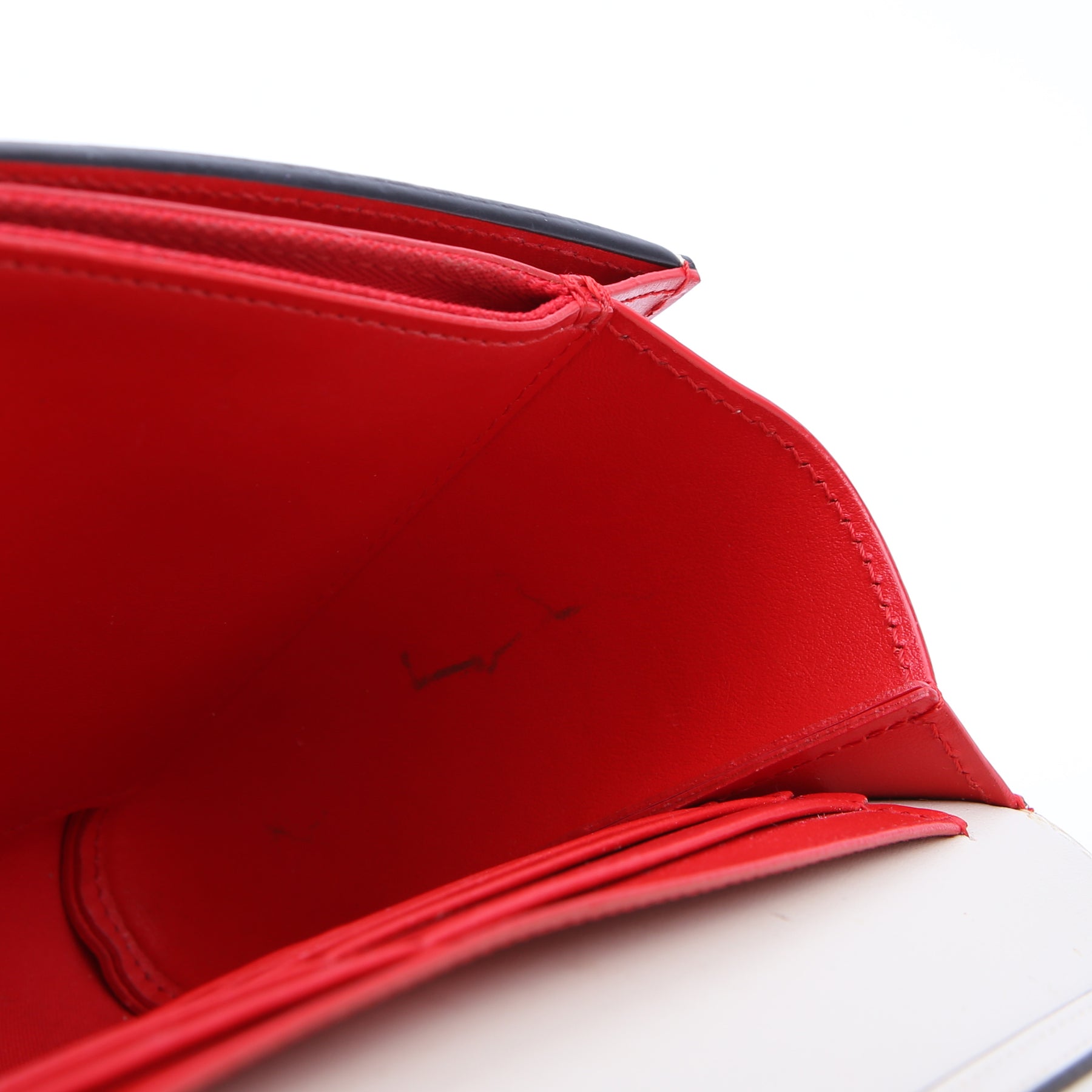 Exterior: The exterior leather has minor discoloration and stains throughout. The corners and pipping show light wear.