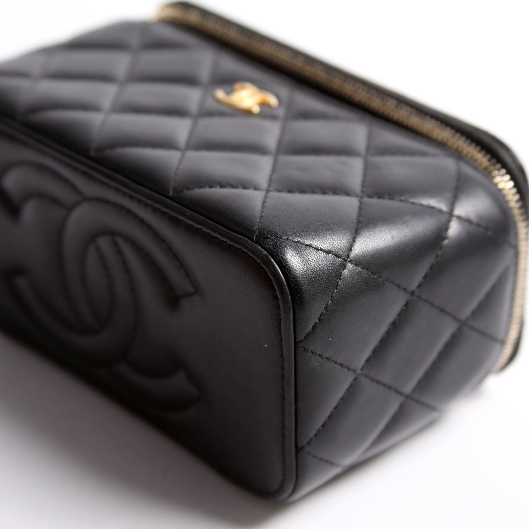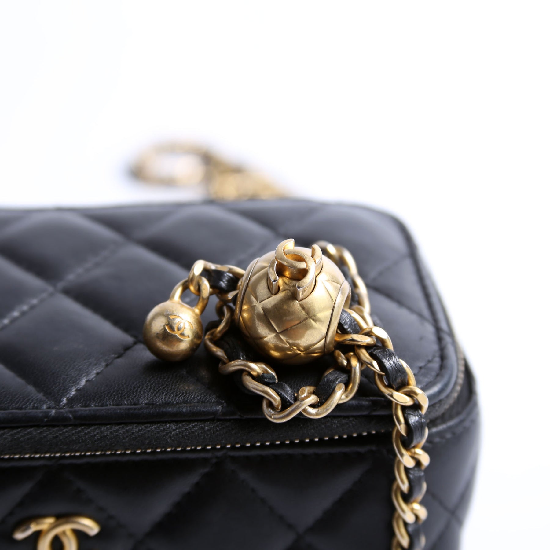 This pre-owned Chanel Pearl Crush Vanity With Chain Small RFID is guaranteed 100% authentic. The exterior is in Lambskin leather.