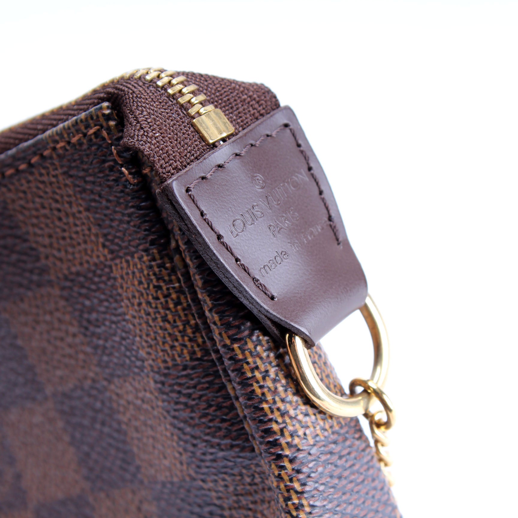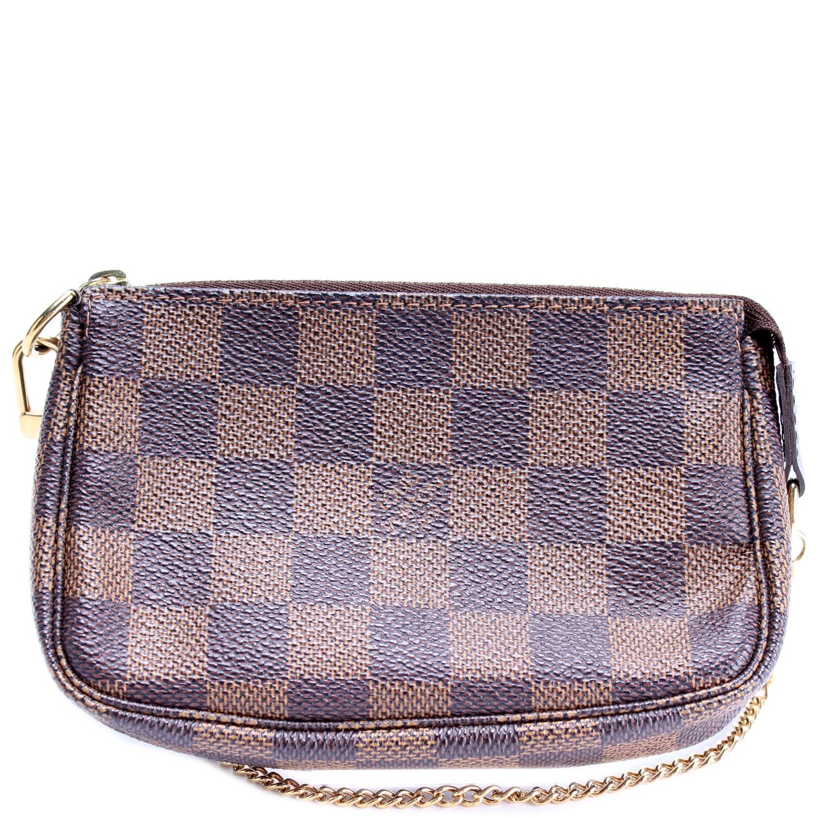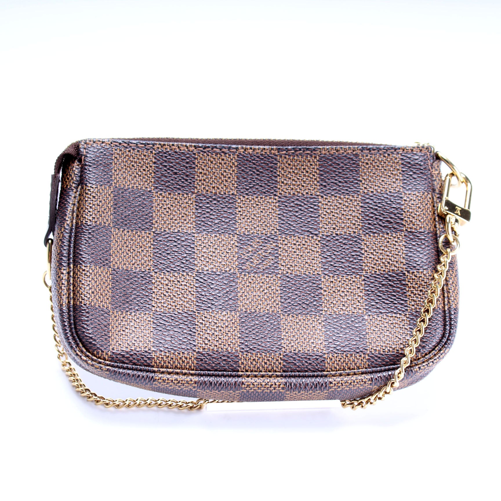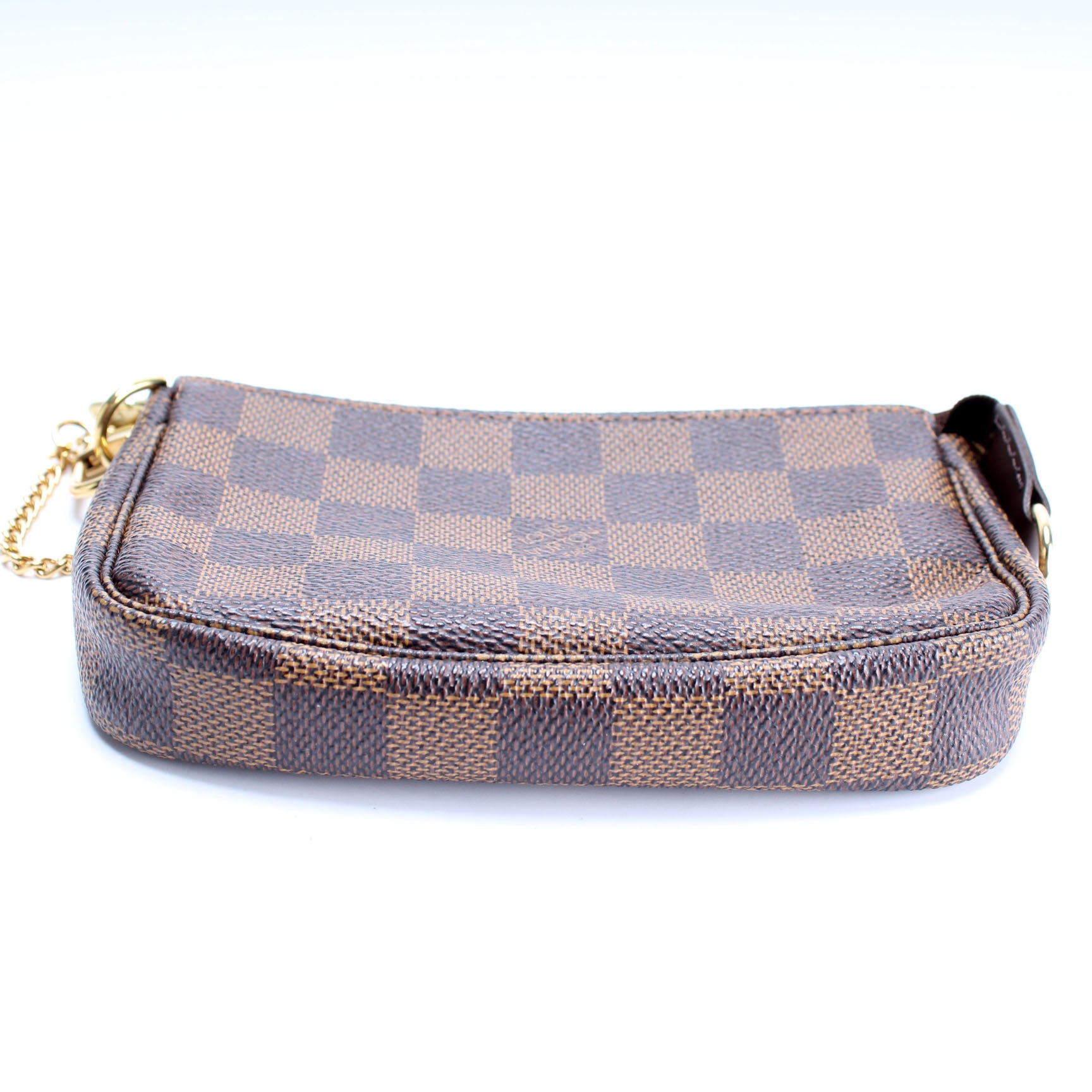 This pre-owned Louis Vuitton Pochette Accessories Mini is guaranteed 100% authentic. The exterior is in the classic Louis Vuitton Damier Ebene coated canvas.