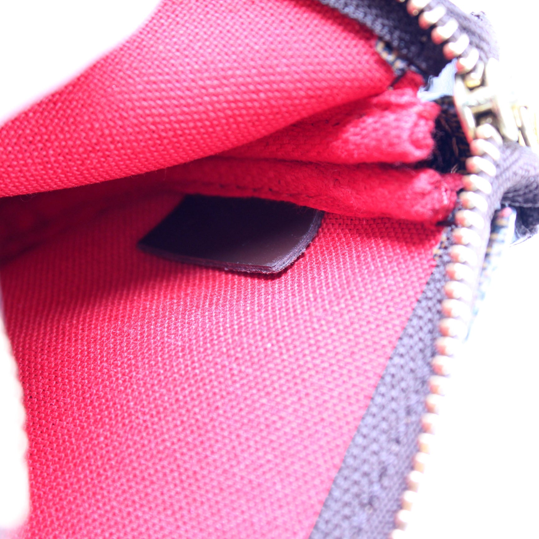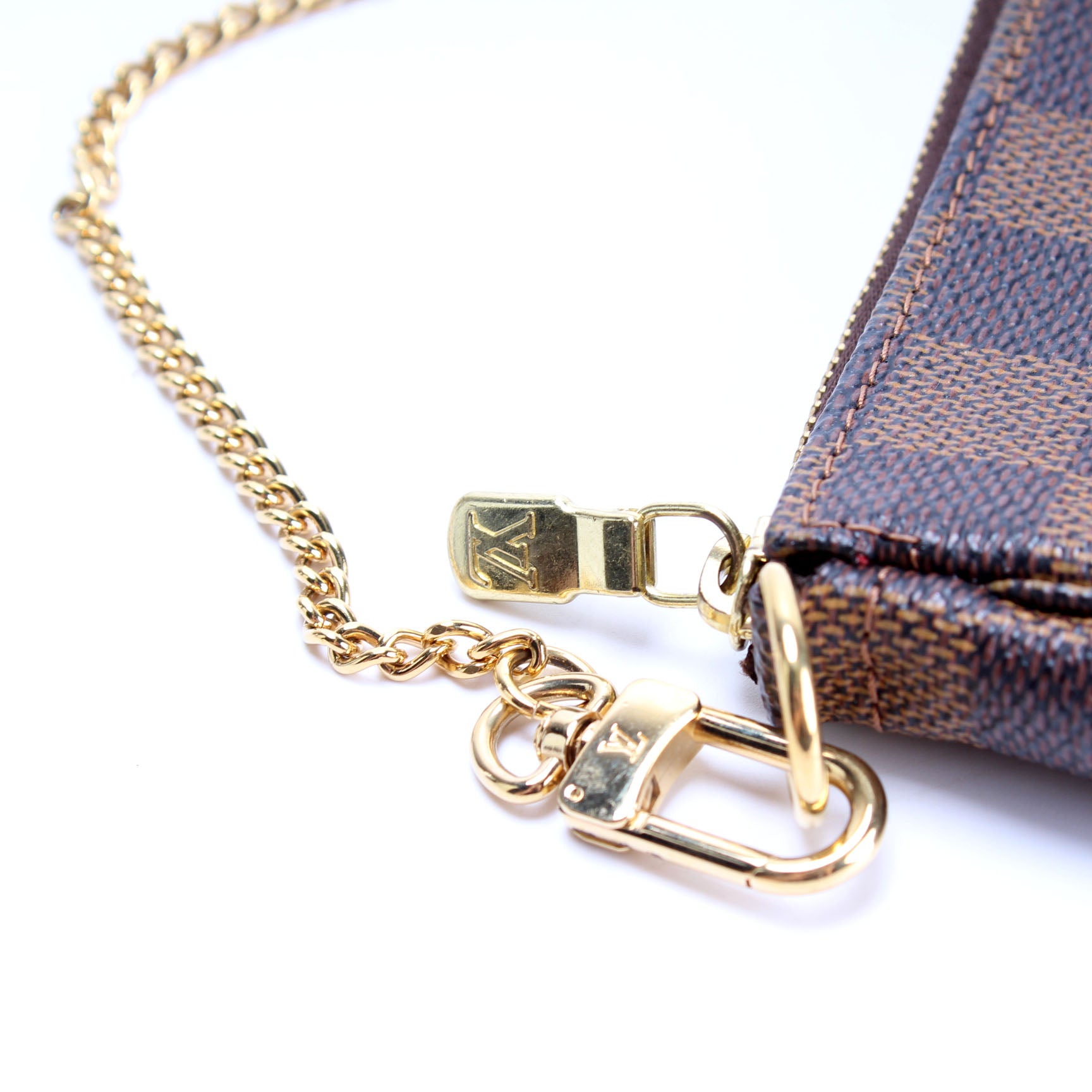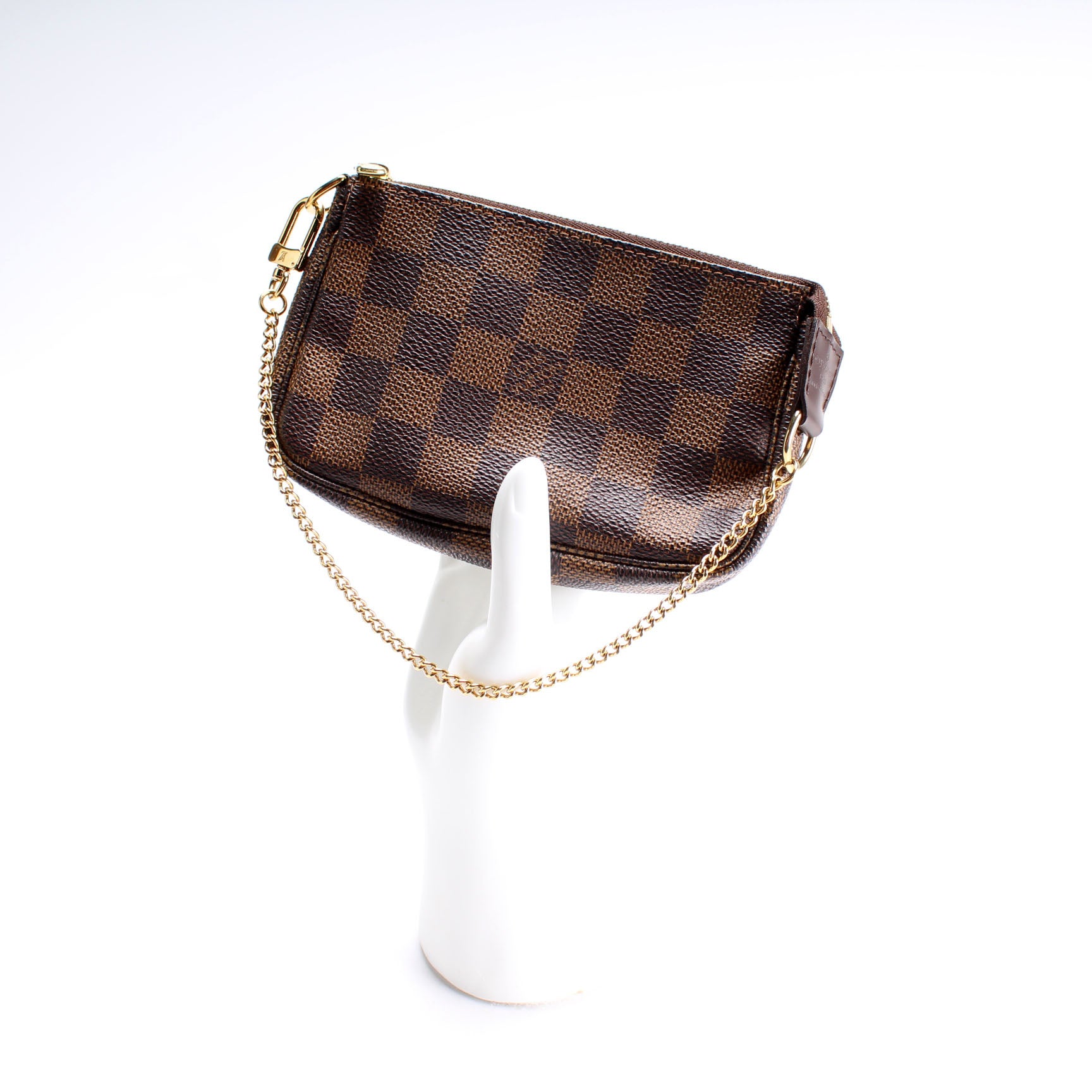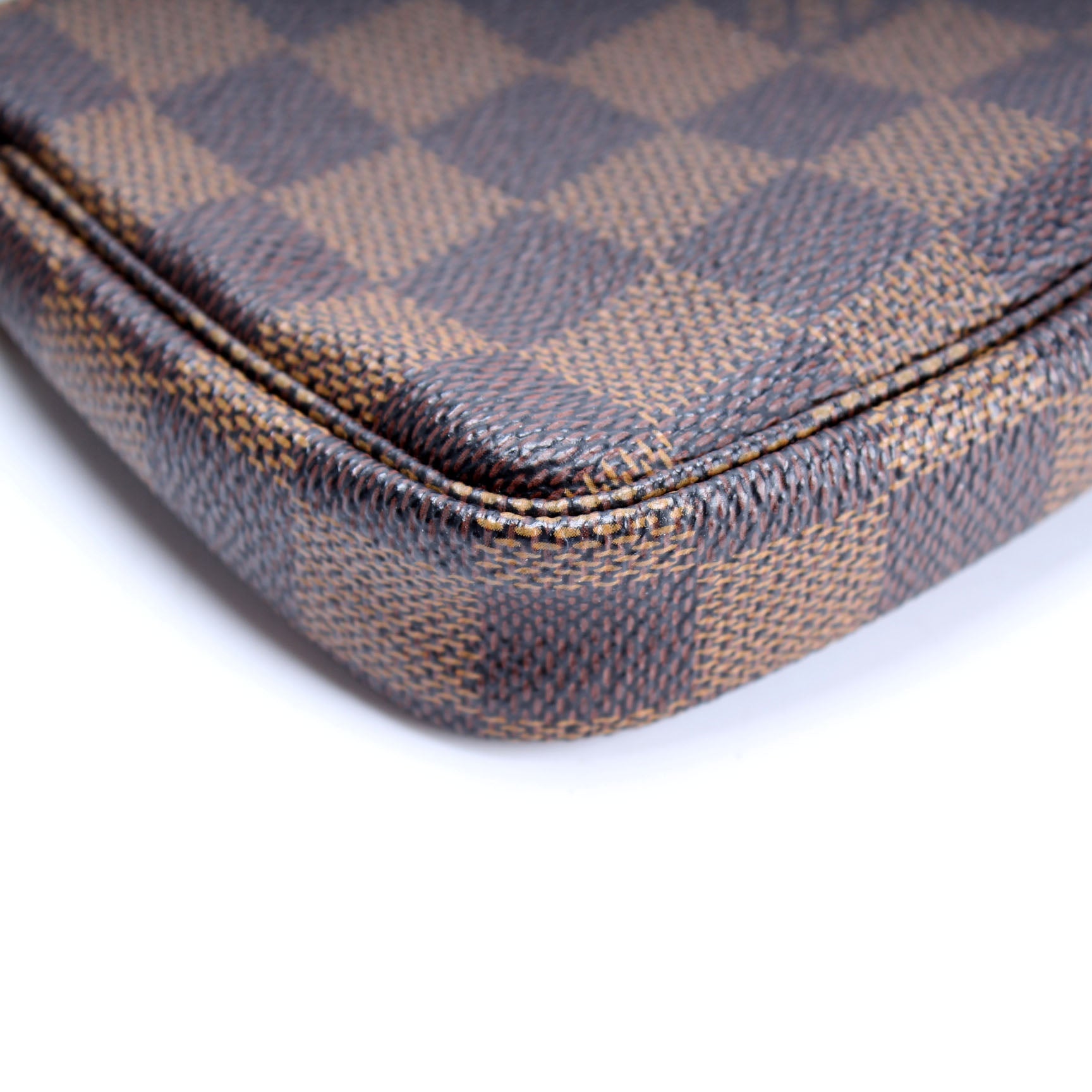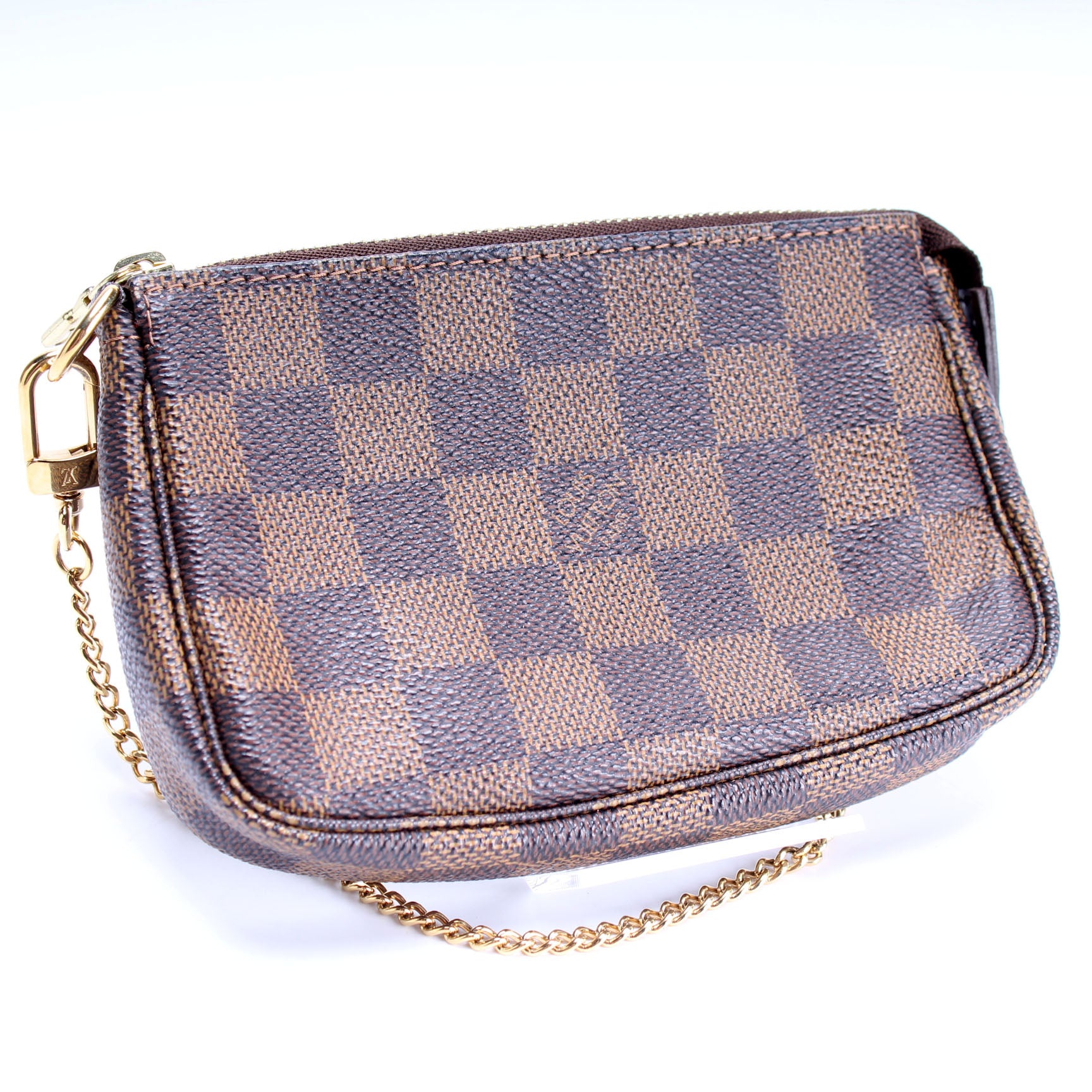 This pre-owned Louis Vuitton Pochette Accessories Mini is guaranteed 100% authentic. The exterior is in the classic Louis Vuitton Damier Ebene coated canvas.