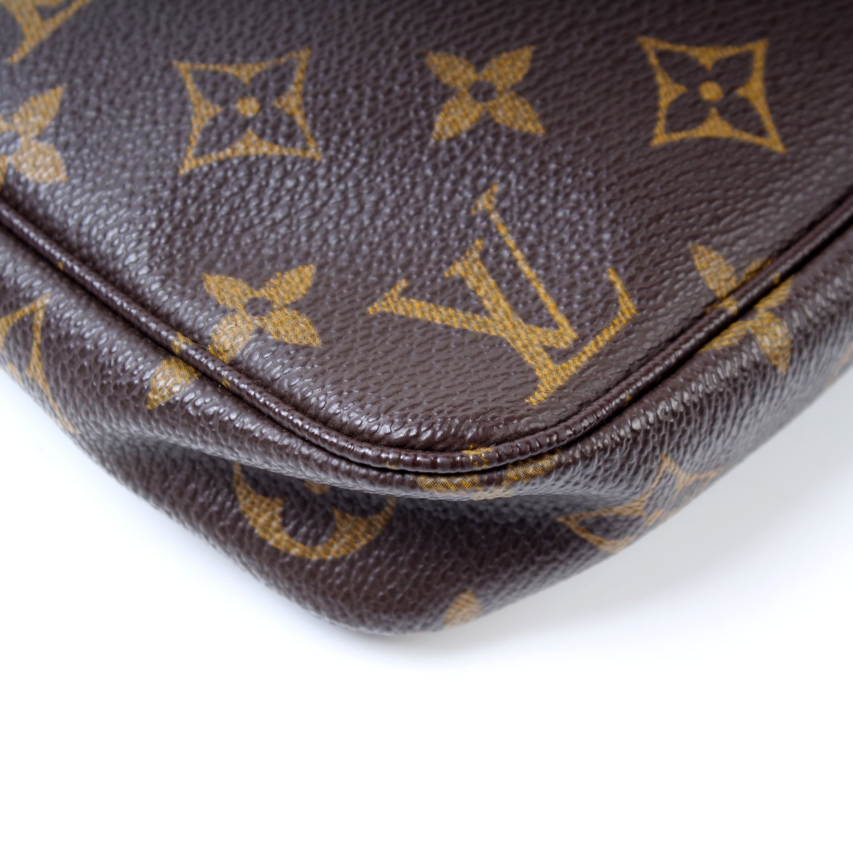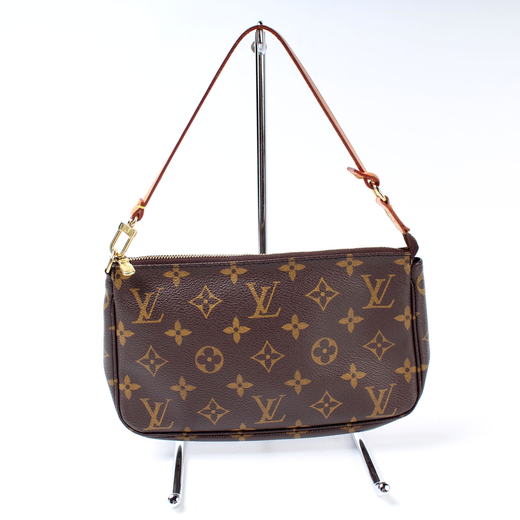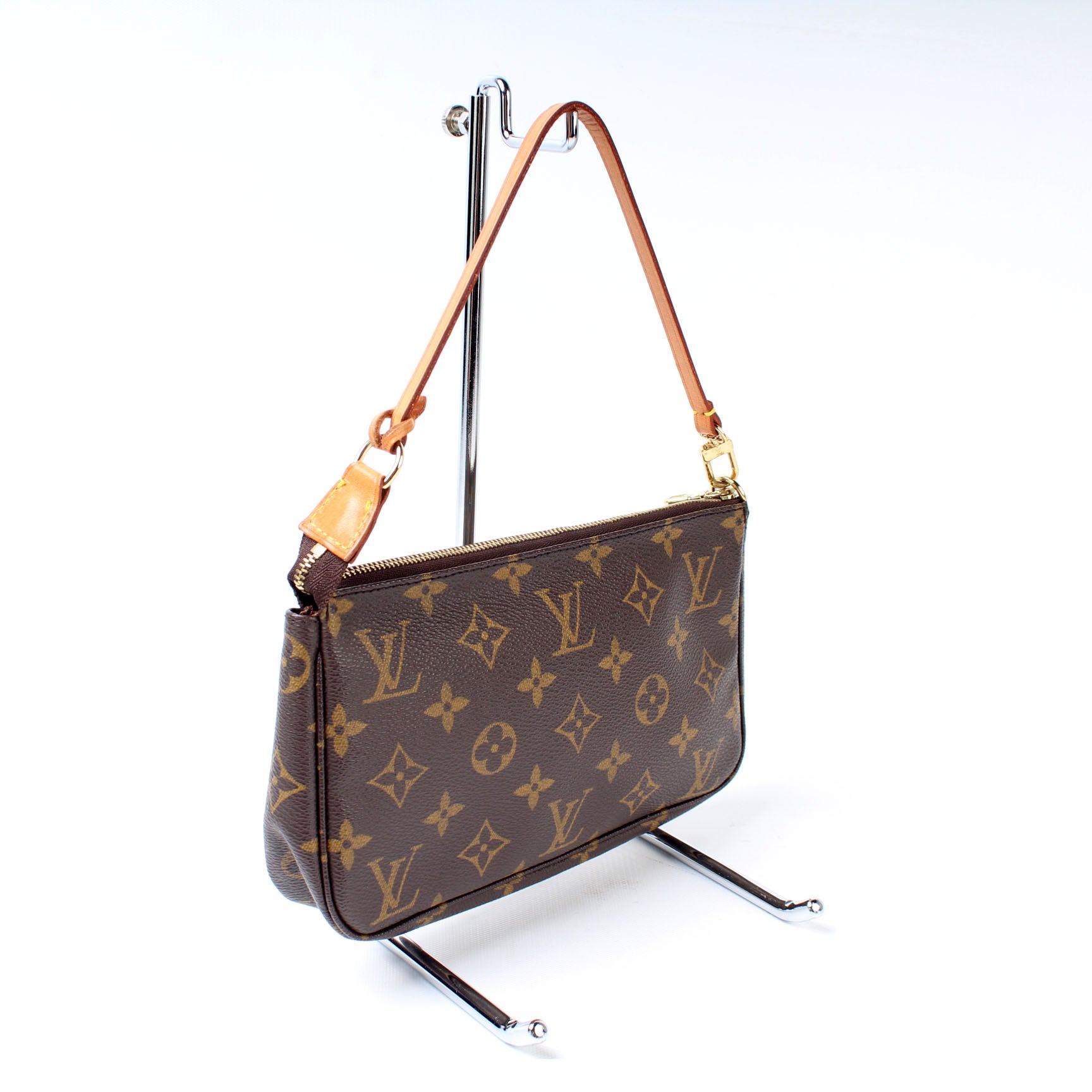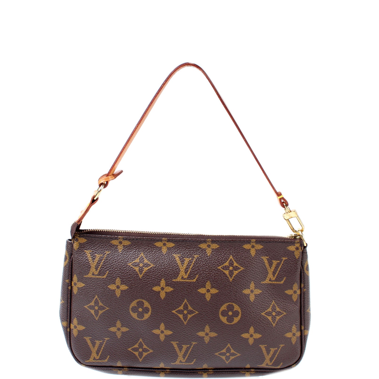 This pre-owned Louis Vuitton Pochette Accessories is guaranteed 100% authentic. The exterior is in the classic Louis Vuitton Monogram coated canvas.