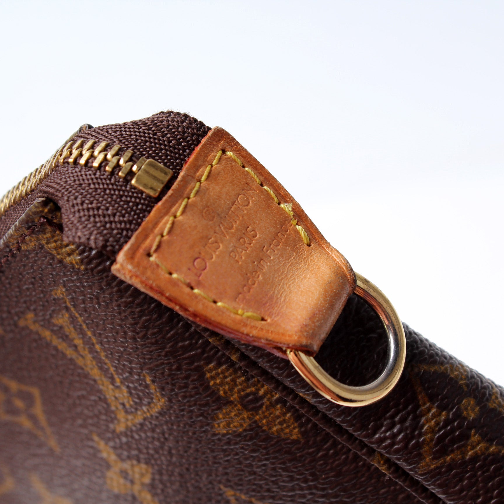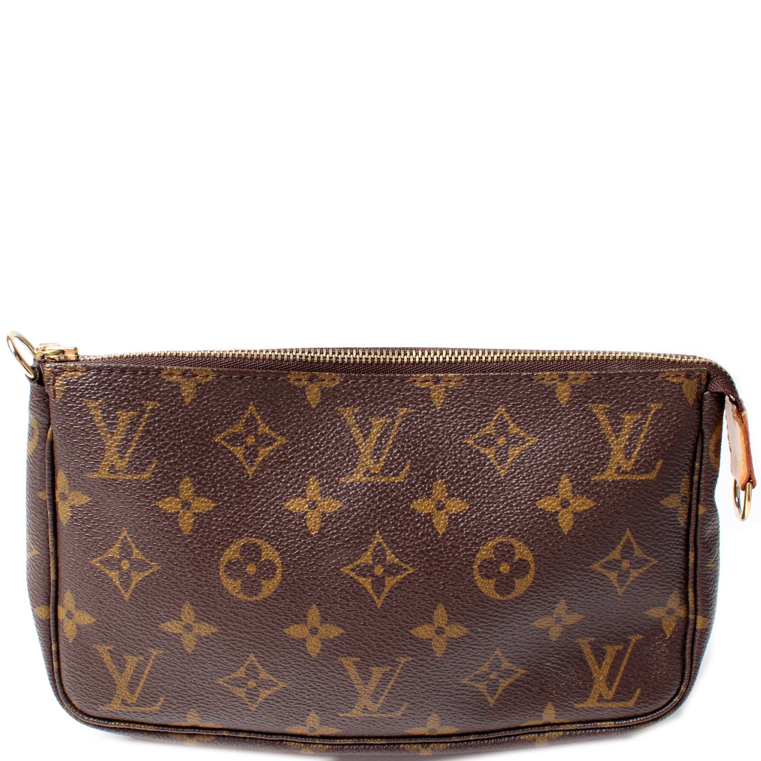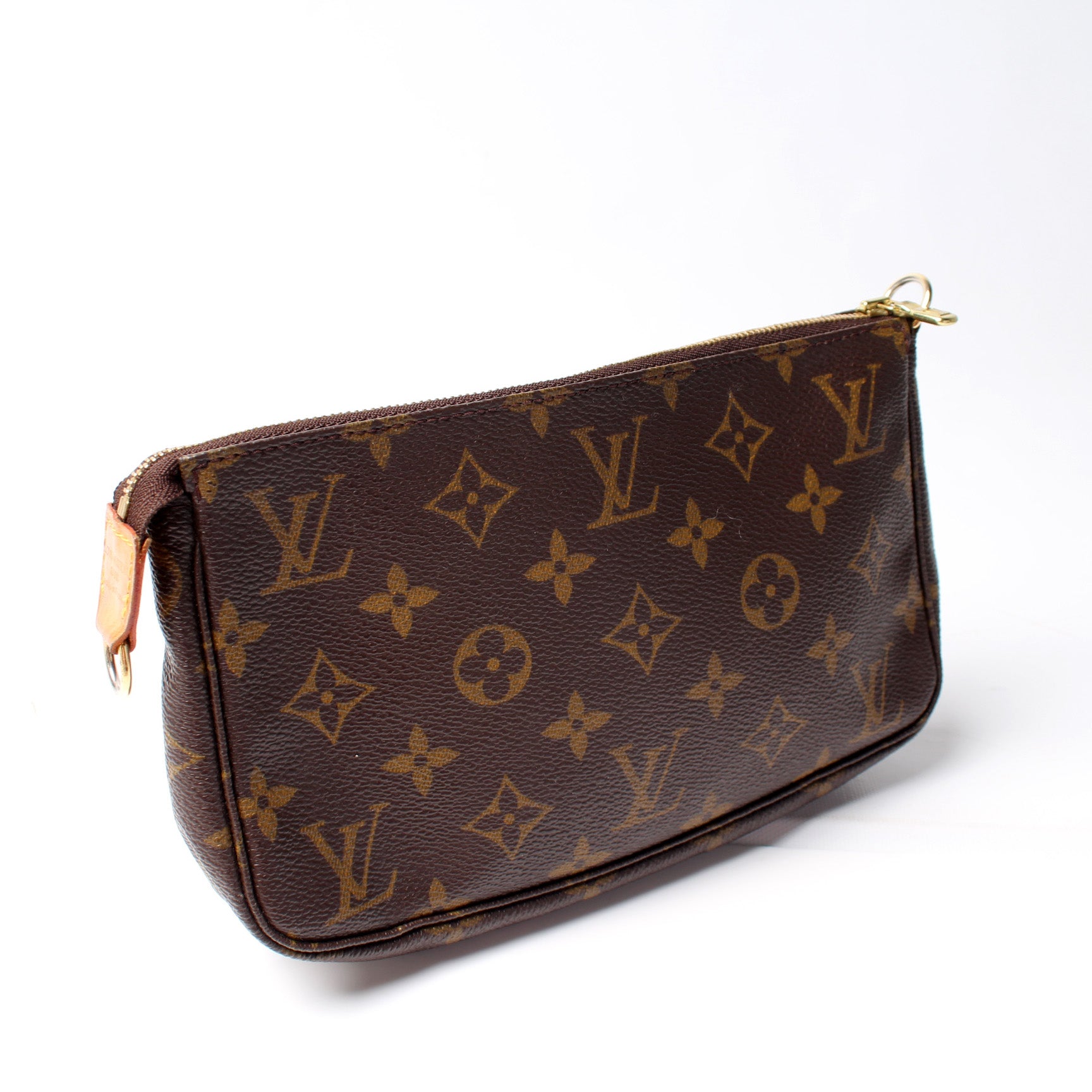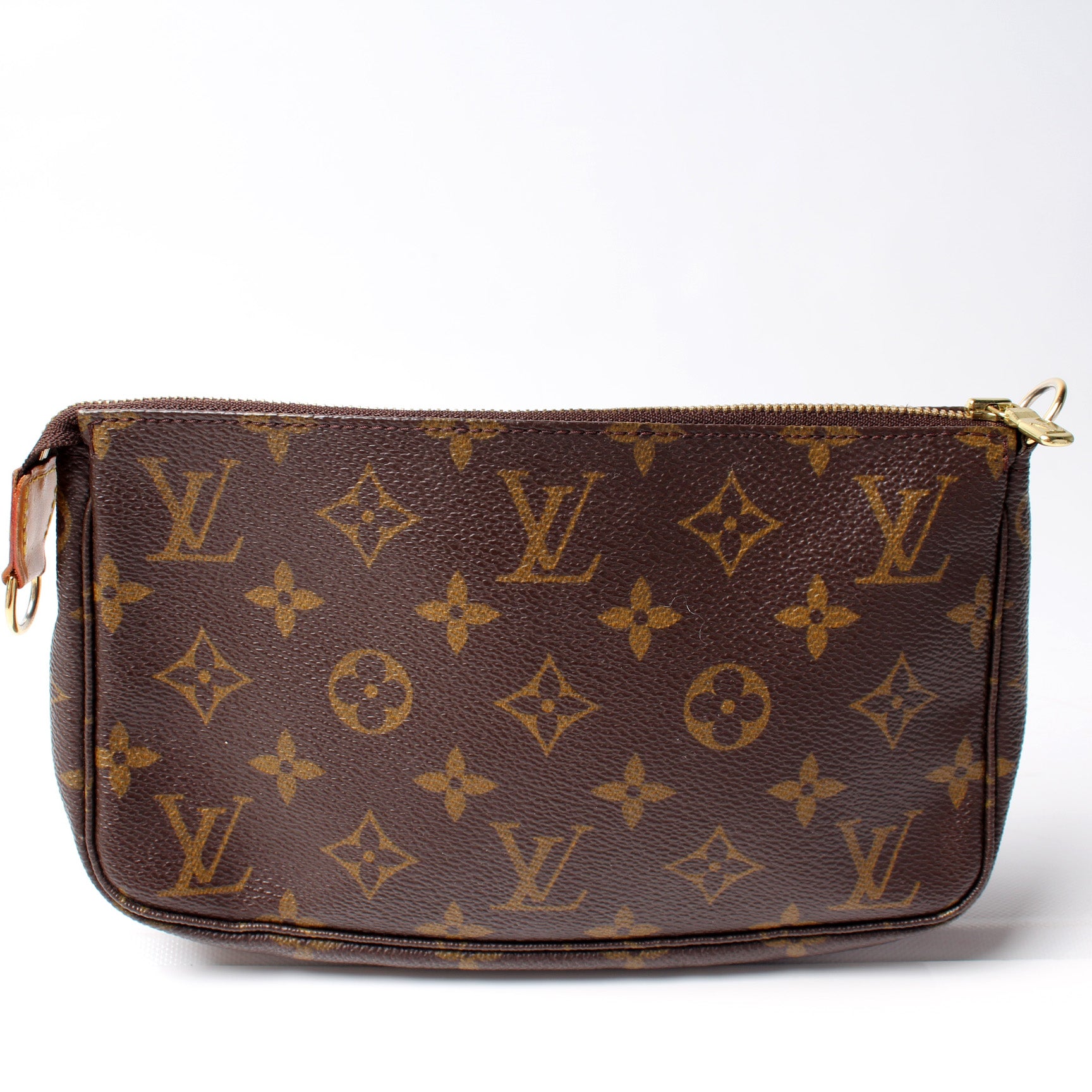 This pre-owned Louis Vuitton Pochette Accessories is guaranteed 100% authentic. The exterior is in the classic Louis Vuitton Monogram coated canvas.