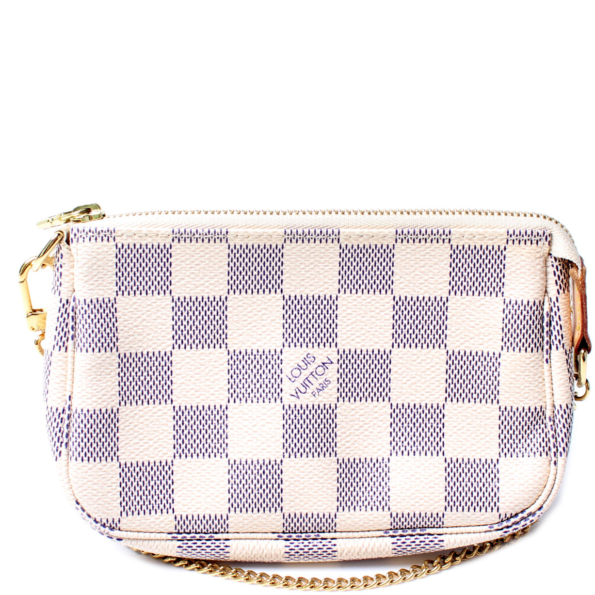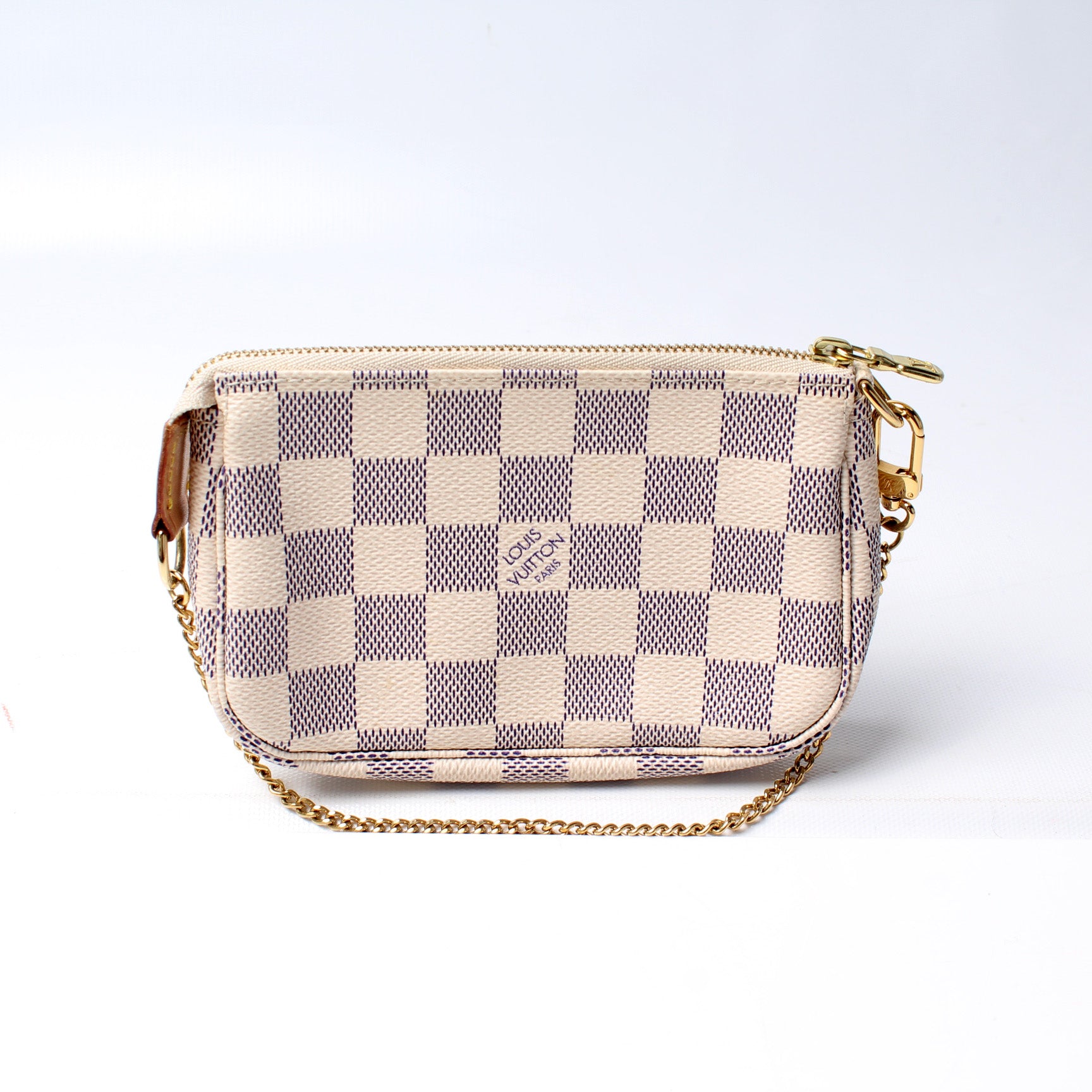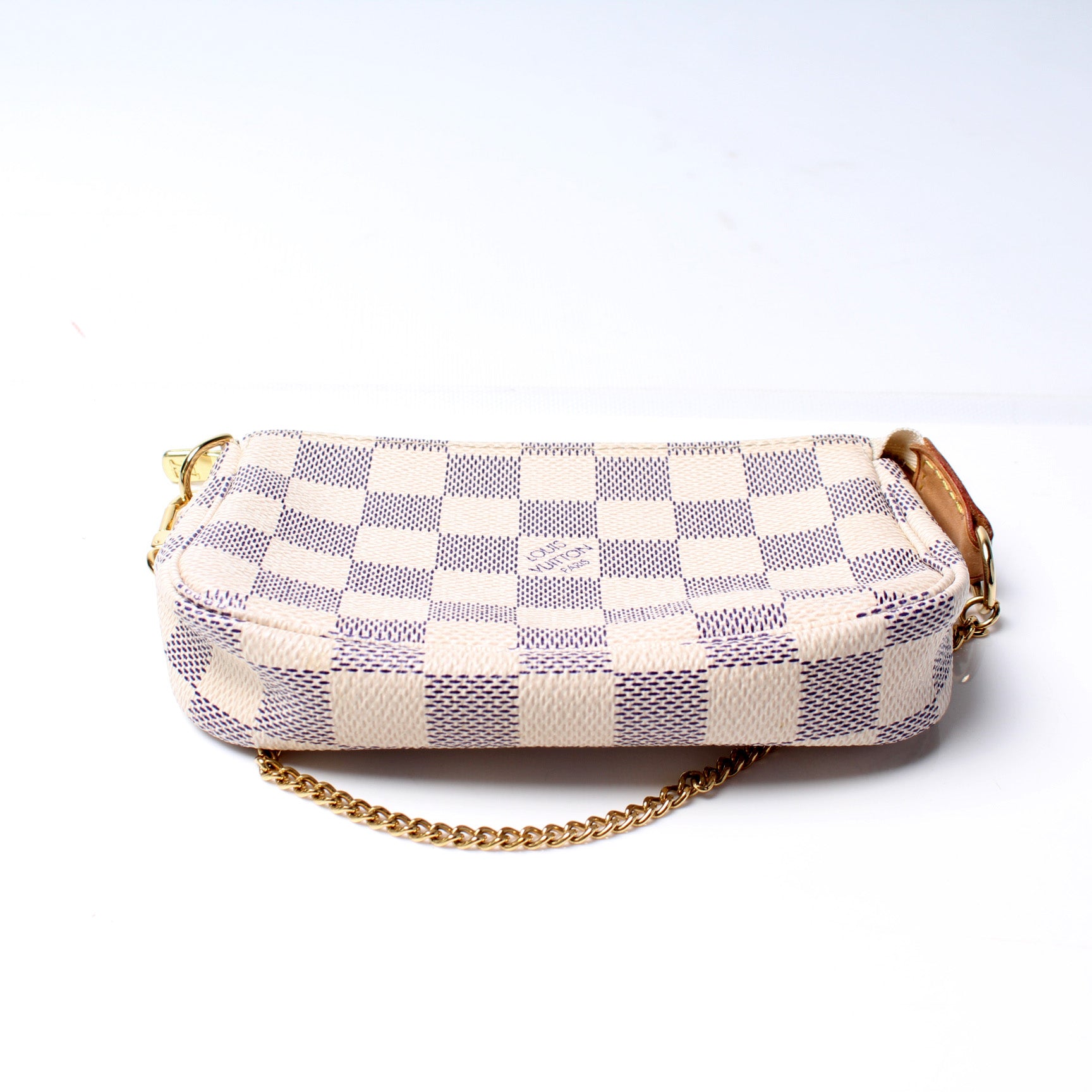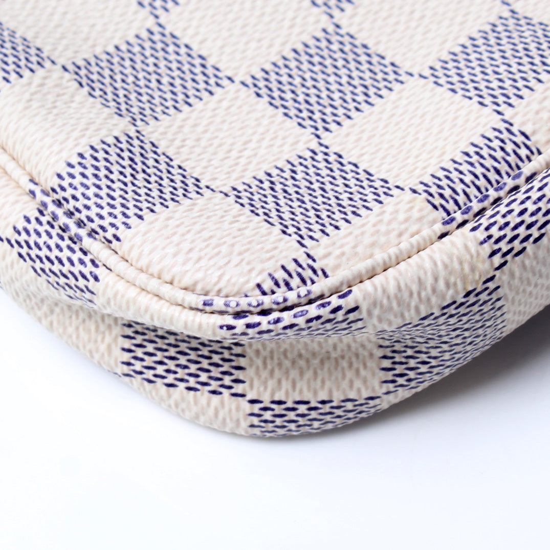 This pre-owned Louis Vuitton Pochette Accessoires Mini is guaranteed 100% authentic. The exterior is in the classic Louis Vuitton Damier Azur coated canvas.