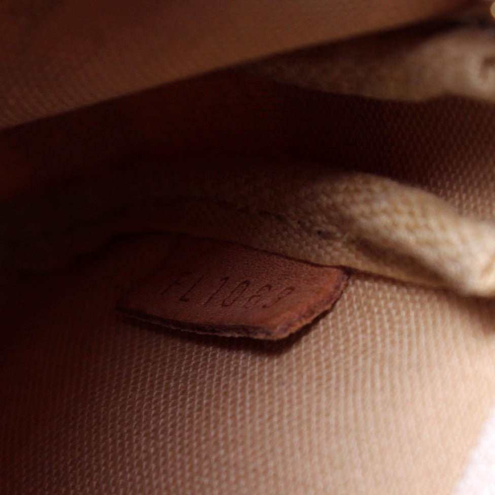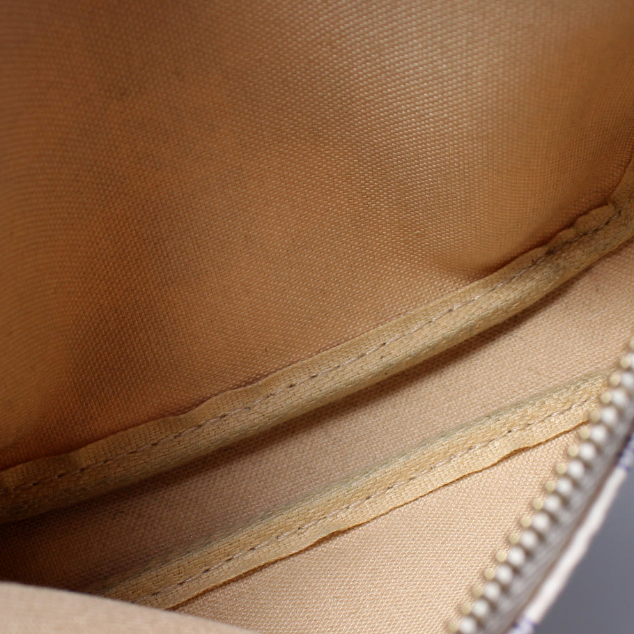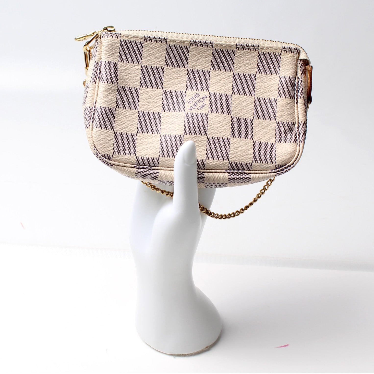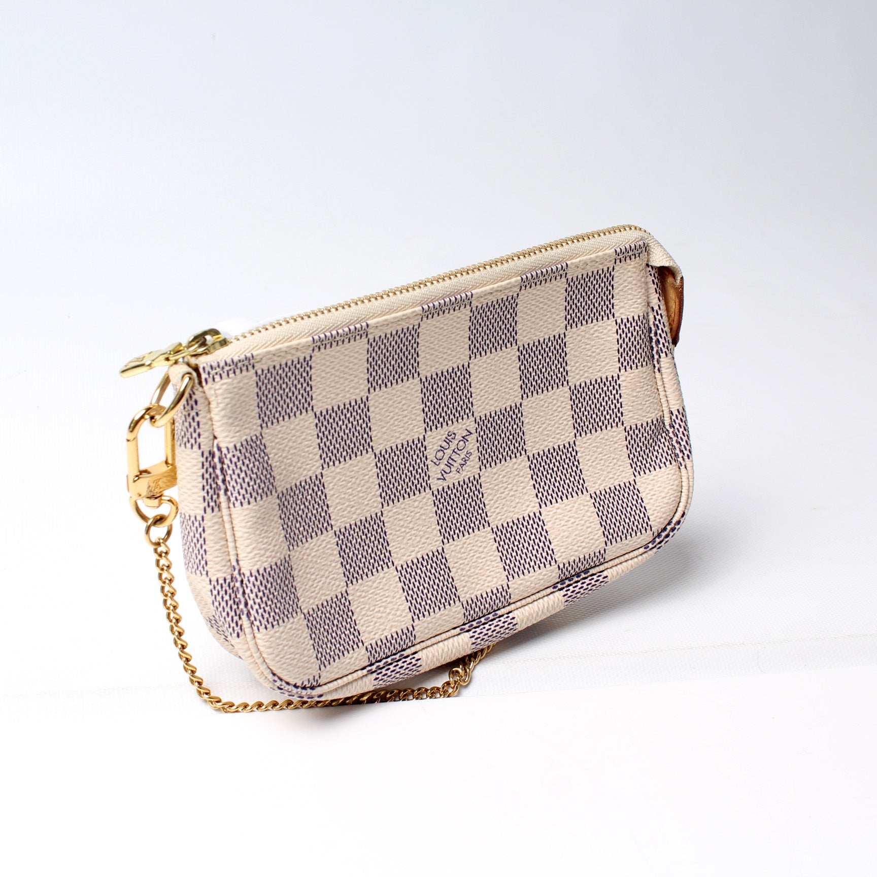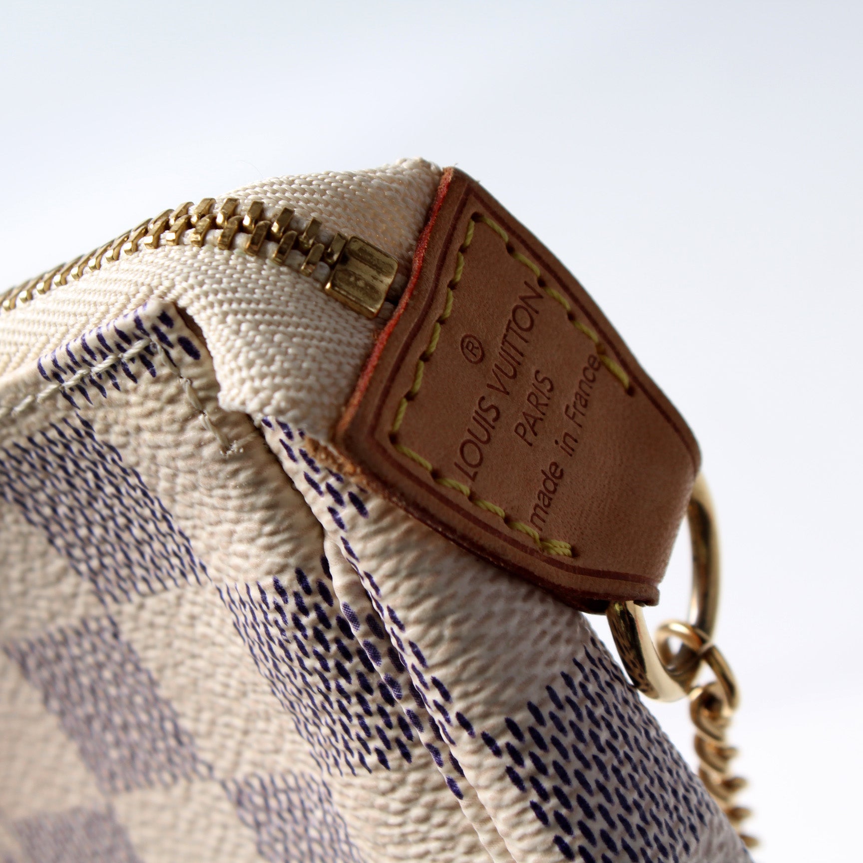This pre-owned Louis Vuitton Pochette Accessoires Mini is guaranteed 100% authentic. The exterior is in the classic Louis Vuitton Damier Azur coated canvas.