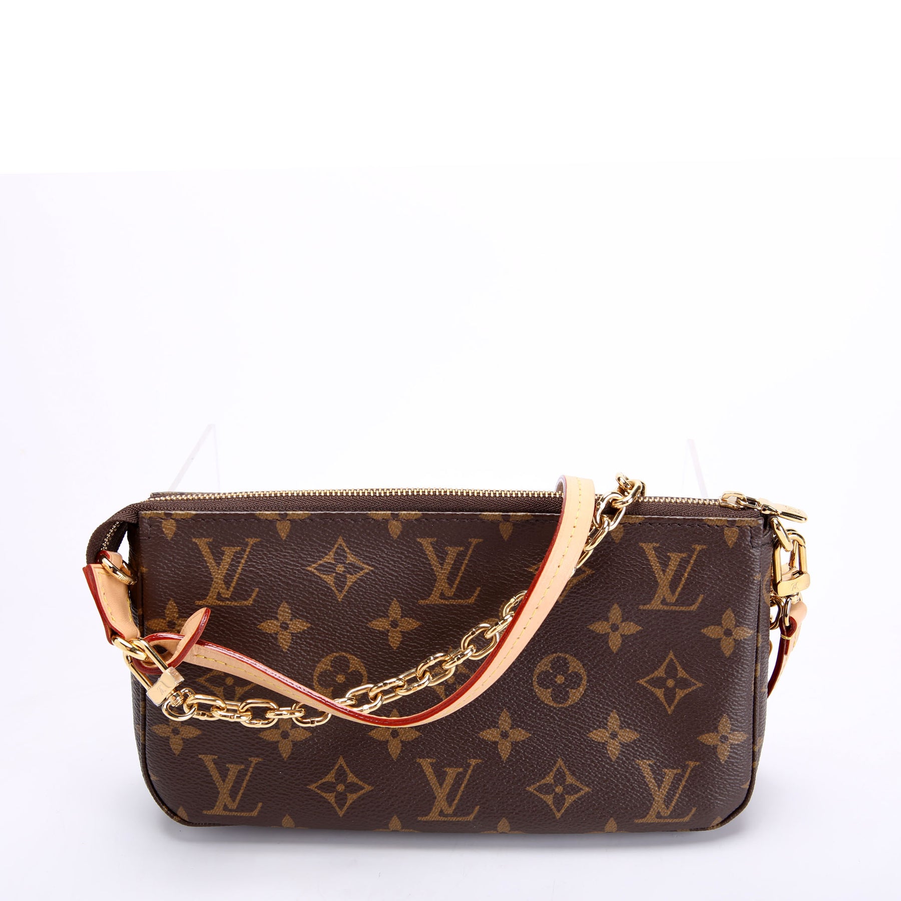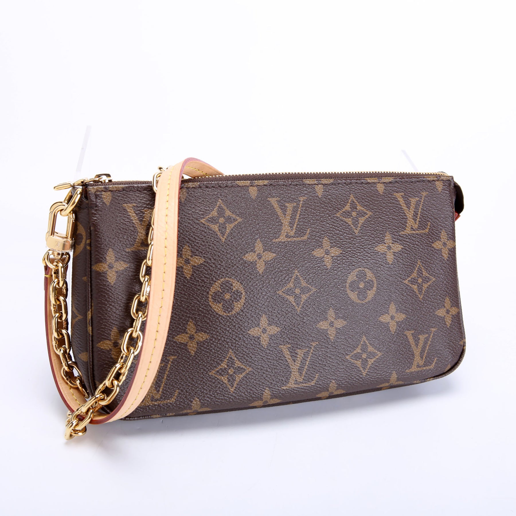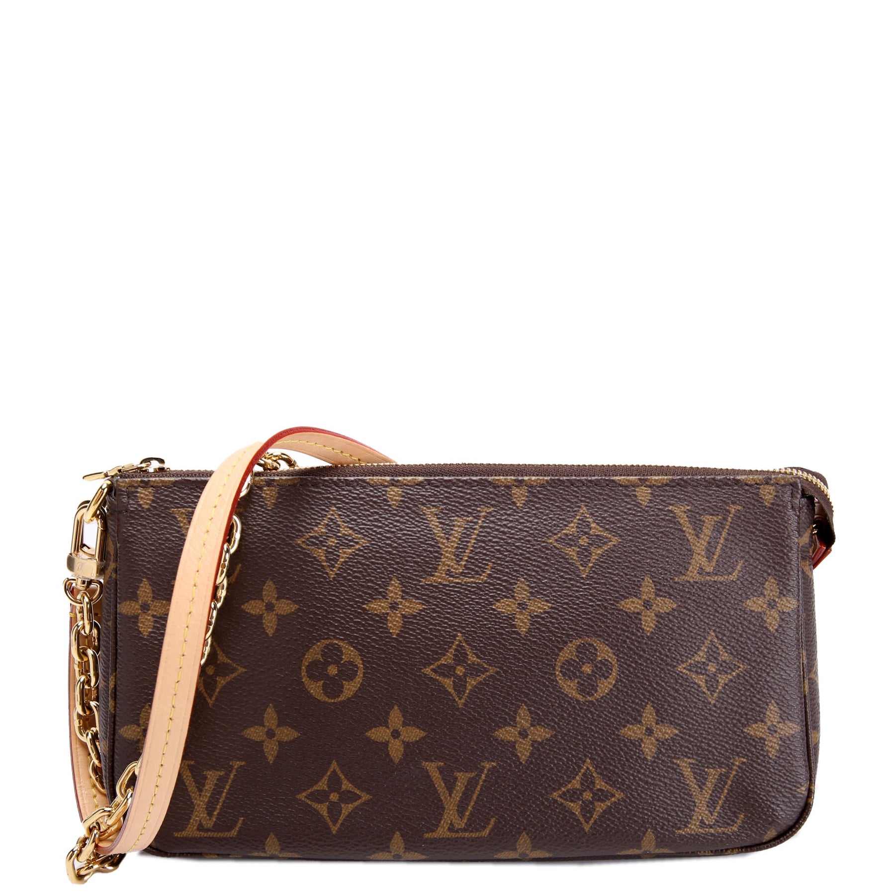 This pre-owned Louis Vuitton Pochette Accessories NV With Chain is guaranteed 100% authentic. The exterior is in the classic Louis Vuitton Monogram coated canvas.