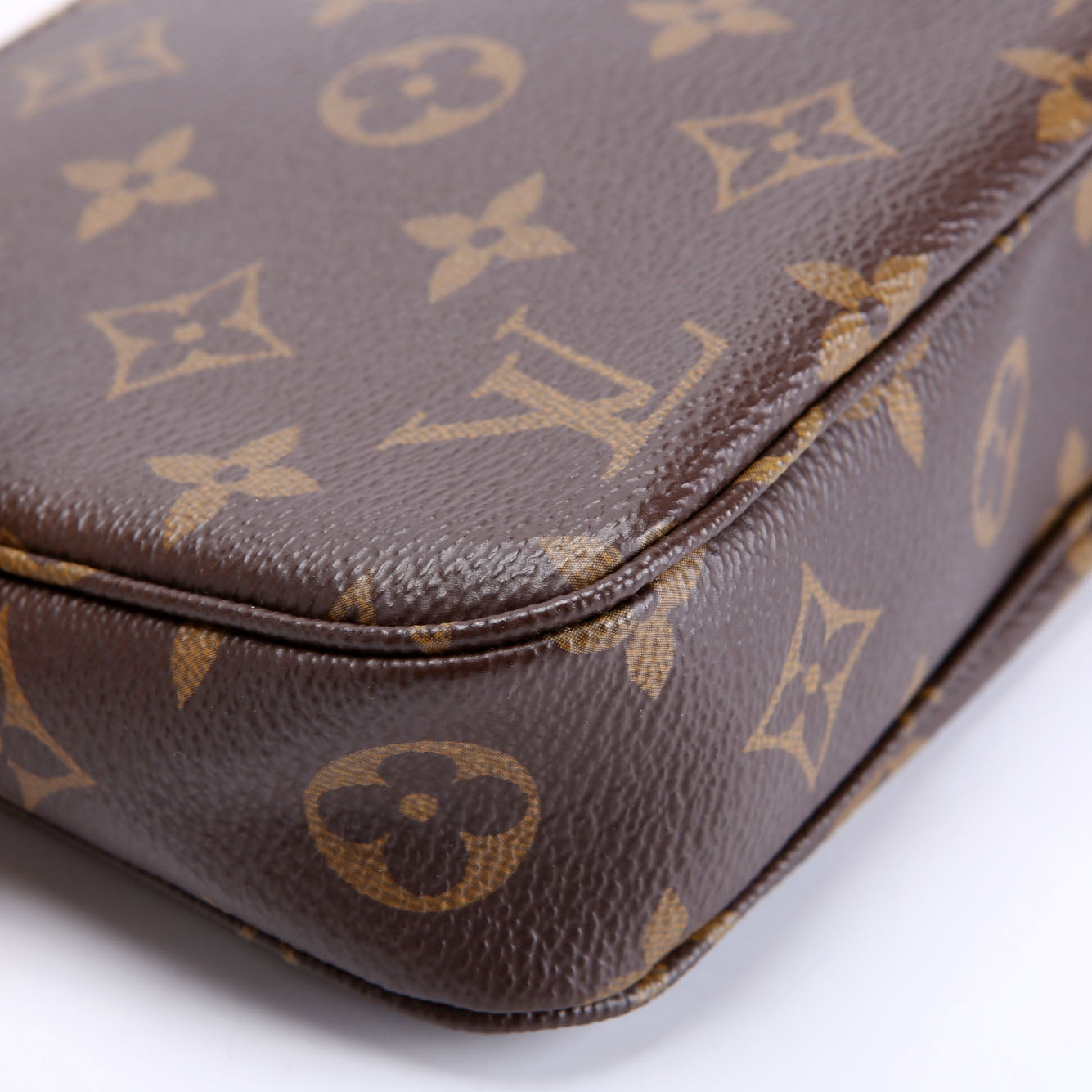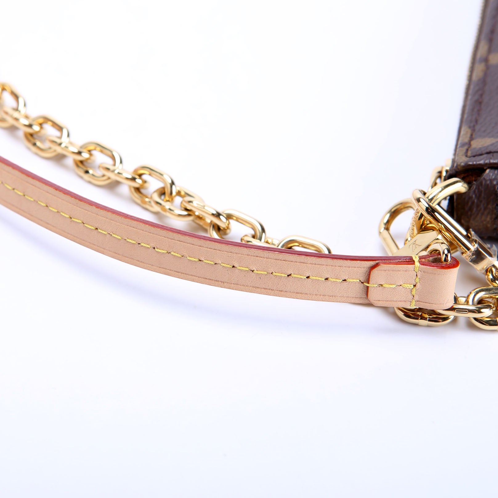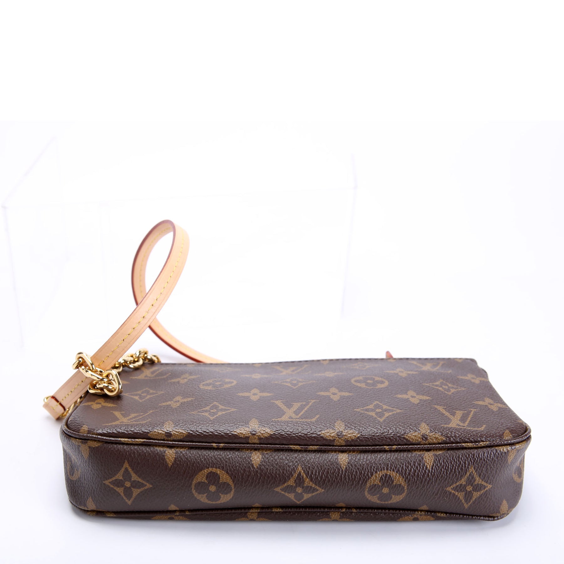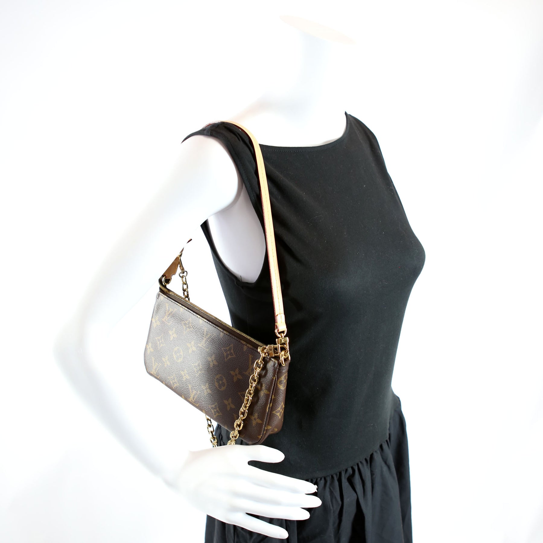This pre-owned Louis Vuitton Pochette Accessories NV With Chain is guaranteed 100% authentic. The exterior is in the classic Louis Vuitton Monogram coated canvas.