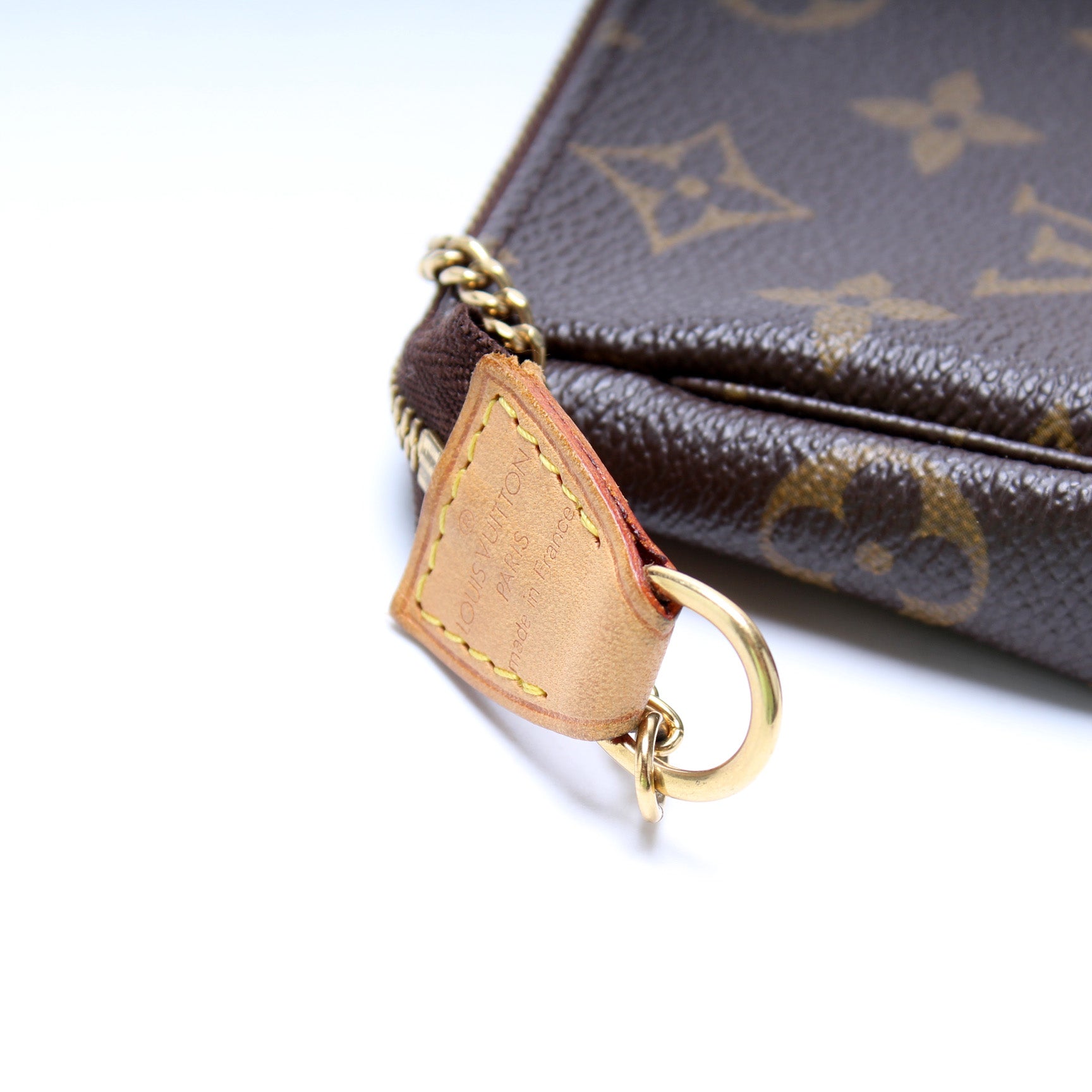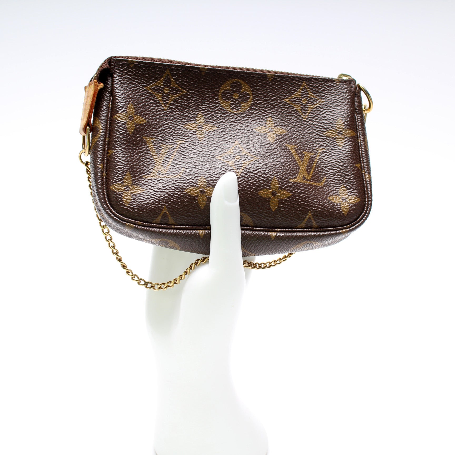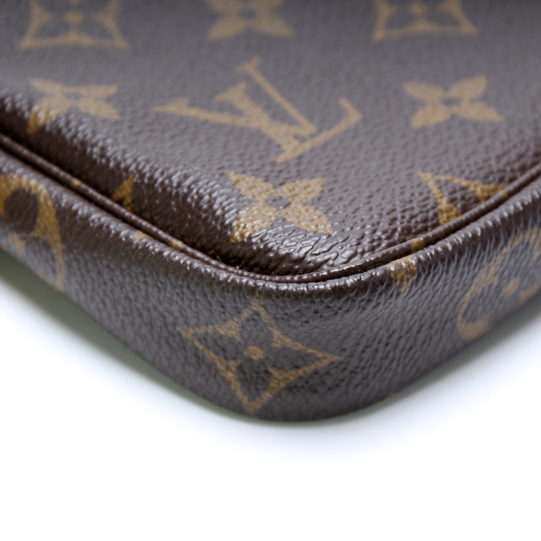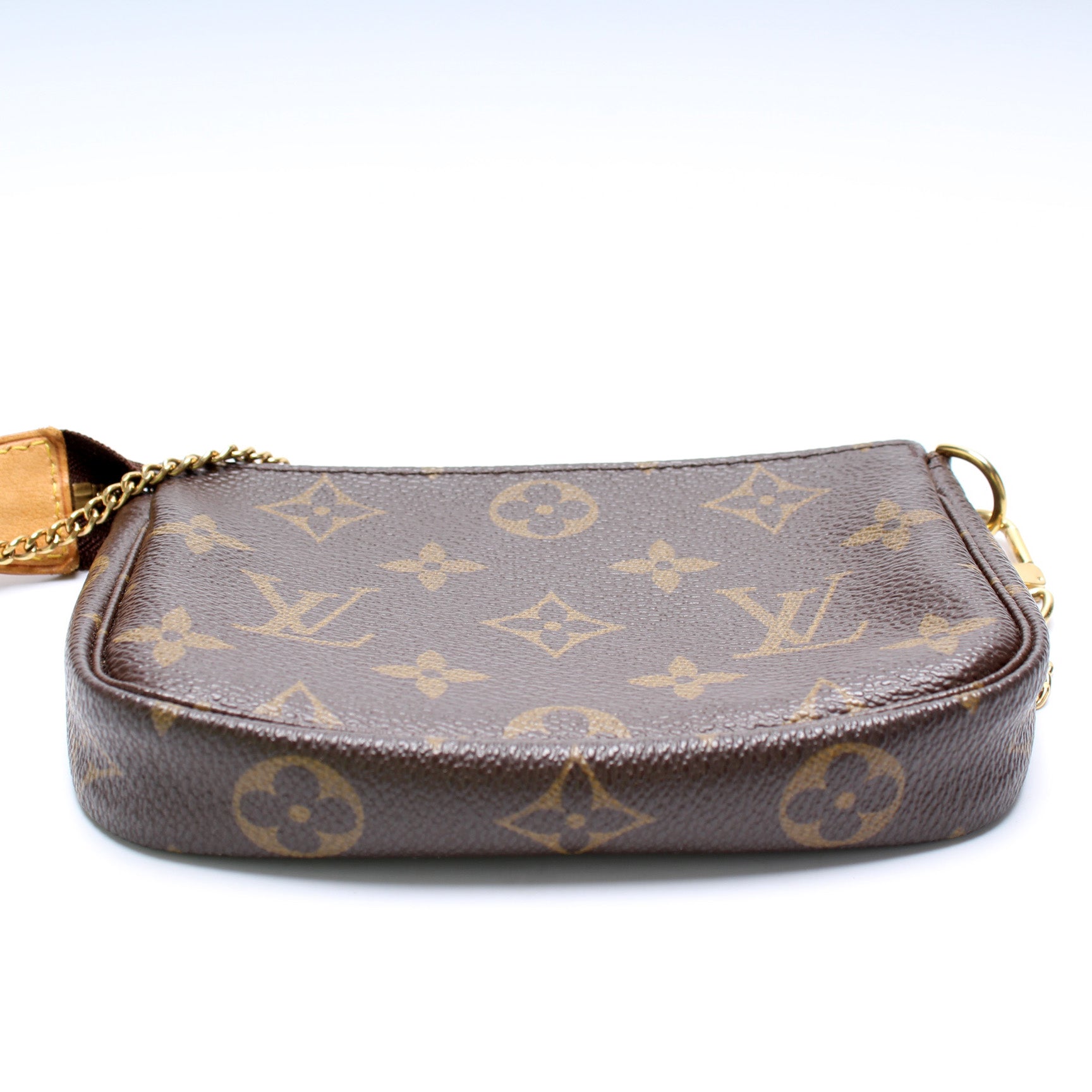 This pre-owned Louis Vuitton Pochette Accessories is guaranteed 100% authentic. The exterior is in the classic Louis Vuitton Monogram coated canvas.