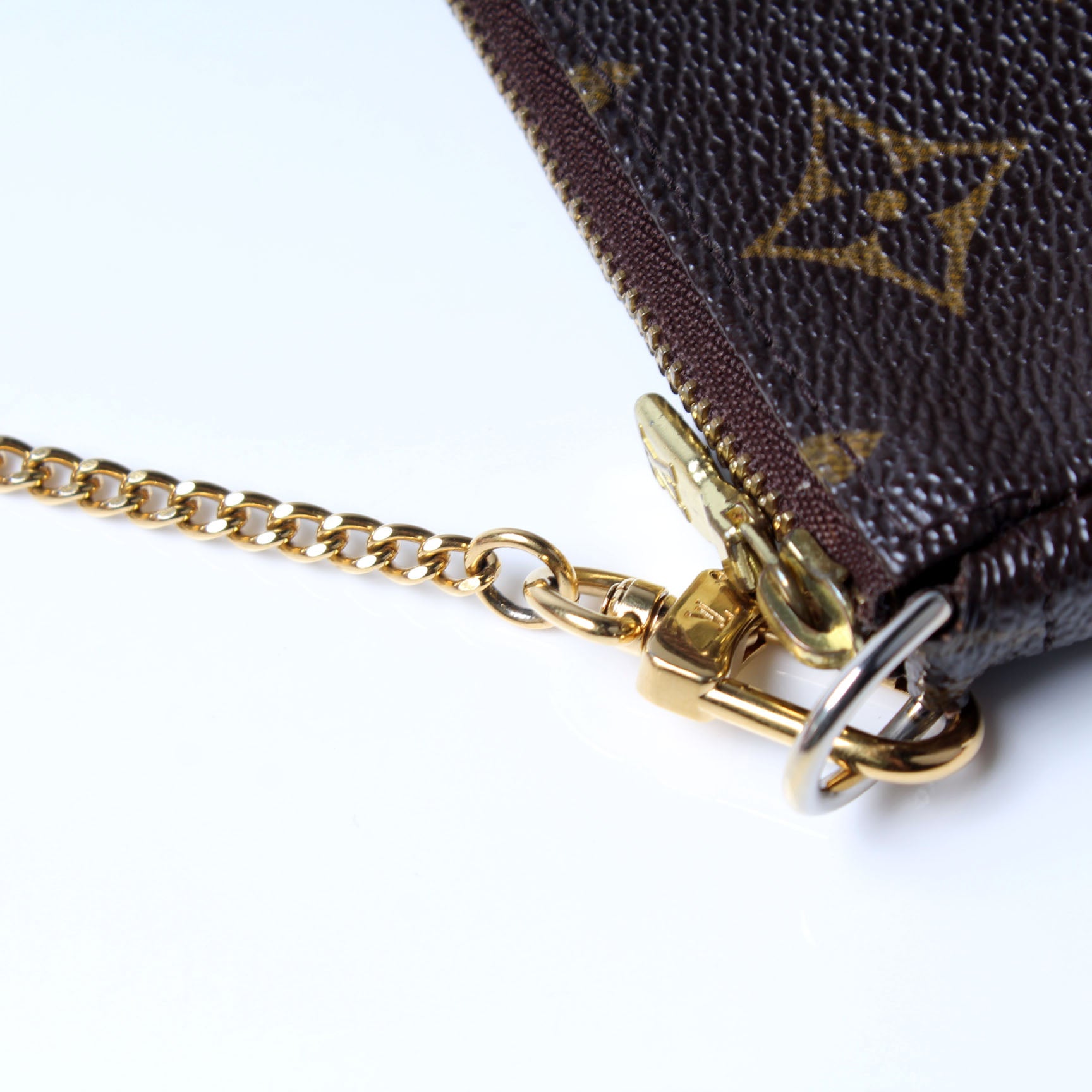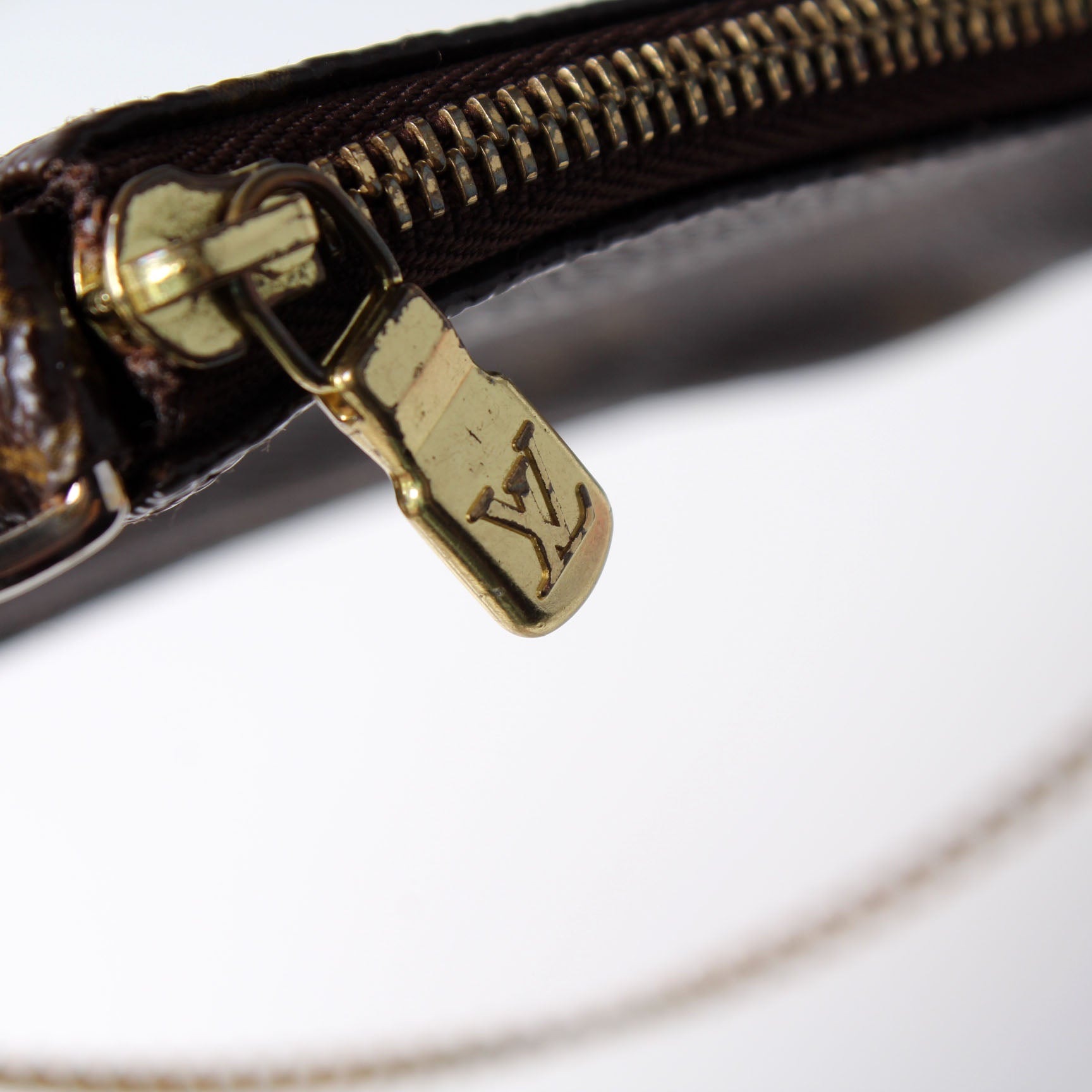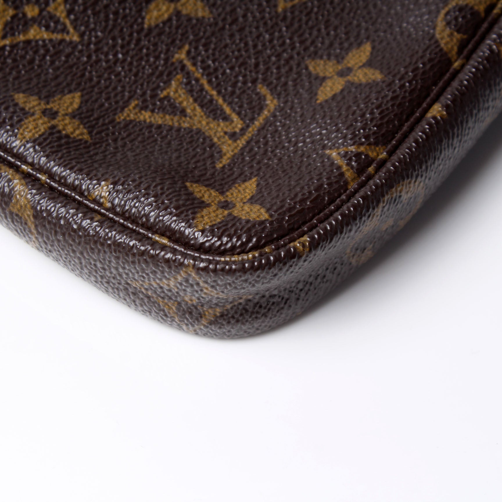 This pre-owned Louis Vuitton Pochette Accessories is guaranteed 100% authentic. The exterior is in the classic Louis Vuitton Monogram coated canvas.